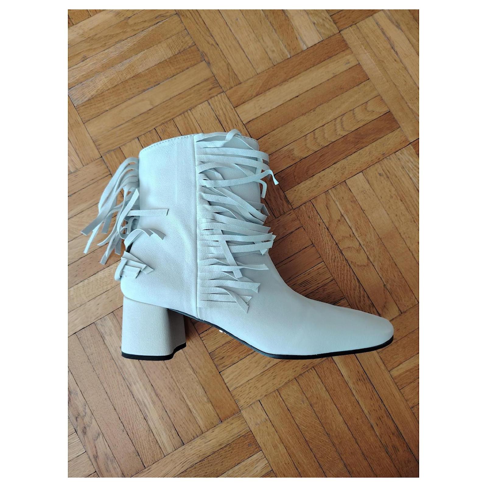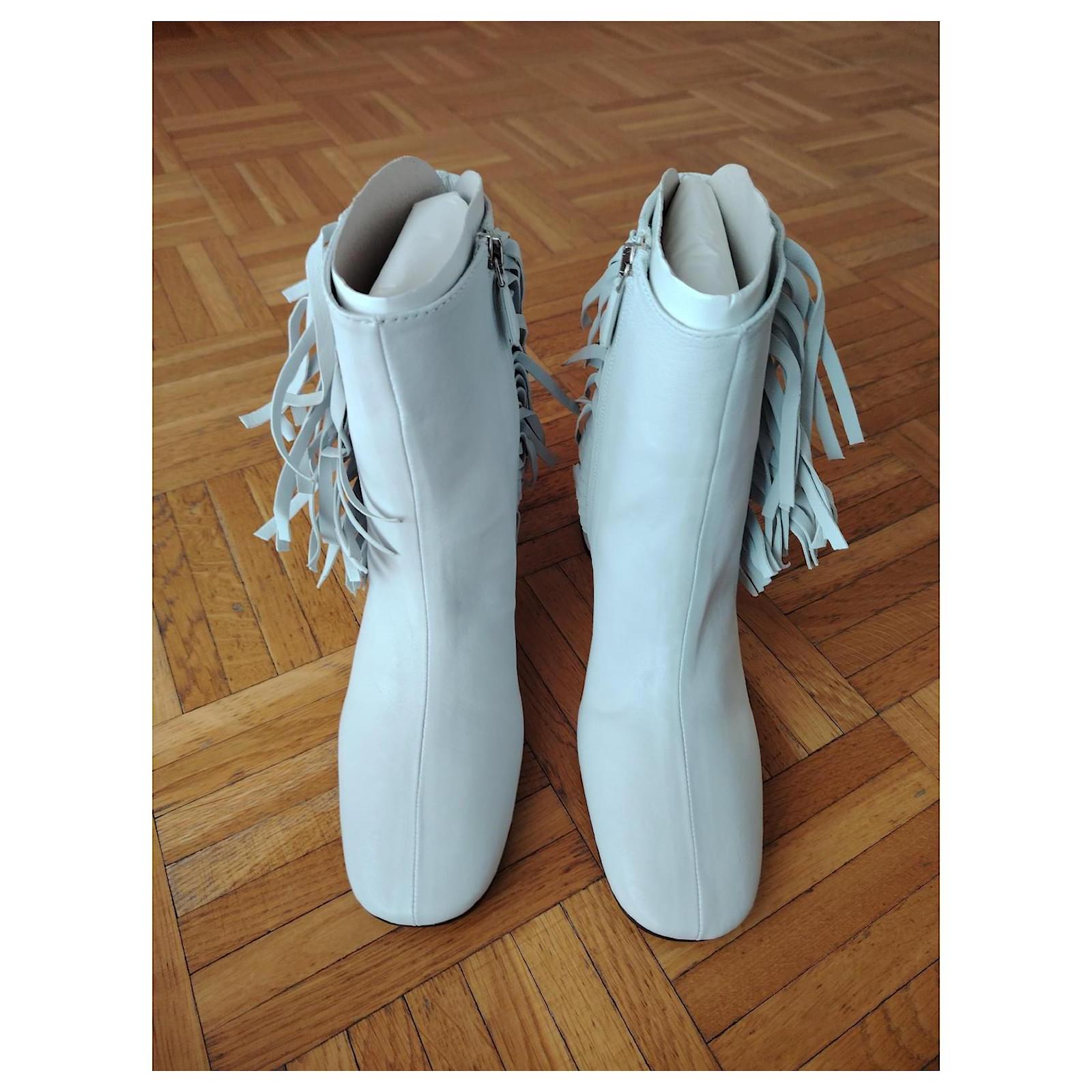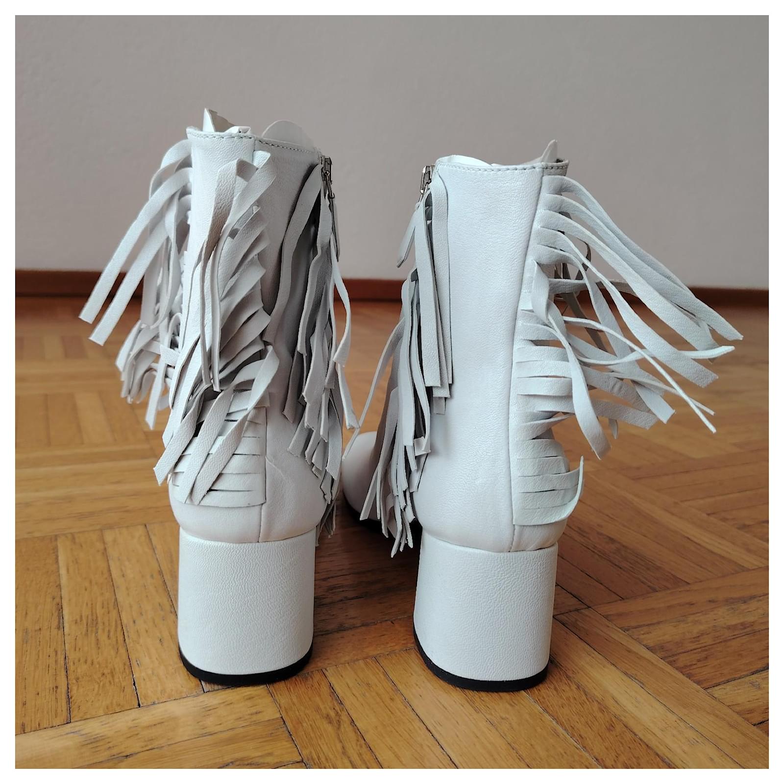 Beautiful Prada ankle boots made of white leather featuring a simple and refined design with a versatile character.\nDetails: Nappa, solid basic color, fringes, zip, leather interior, leather sole, covered geometric heel. The leather sole is enhanced by the iconic silver lettering logo.\nColor: White,\nSize: 38.5 (IT),\nDimensions:\nSole length: 25 cm,\nHeel height: 5.5 cm,\nUpper height: 14.5 cm,\nCalf diameter: 14 cm,\nMade in Italy.\nPackaging: Dustbag and original box\nCondition: NEW, never used (tried on only in store)