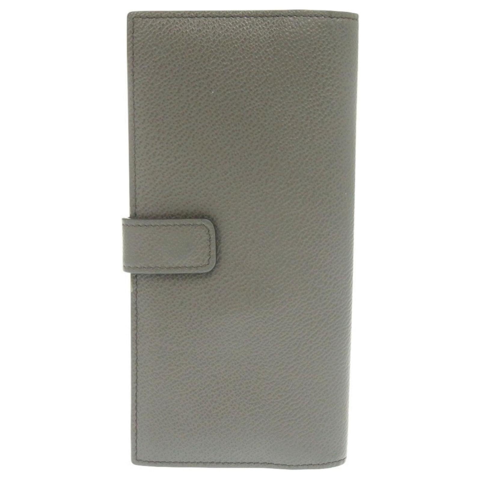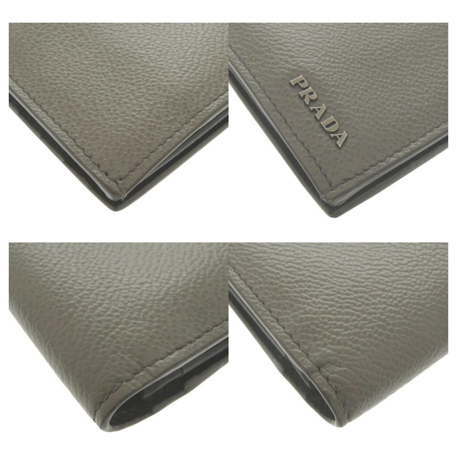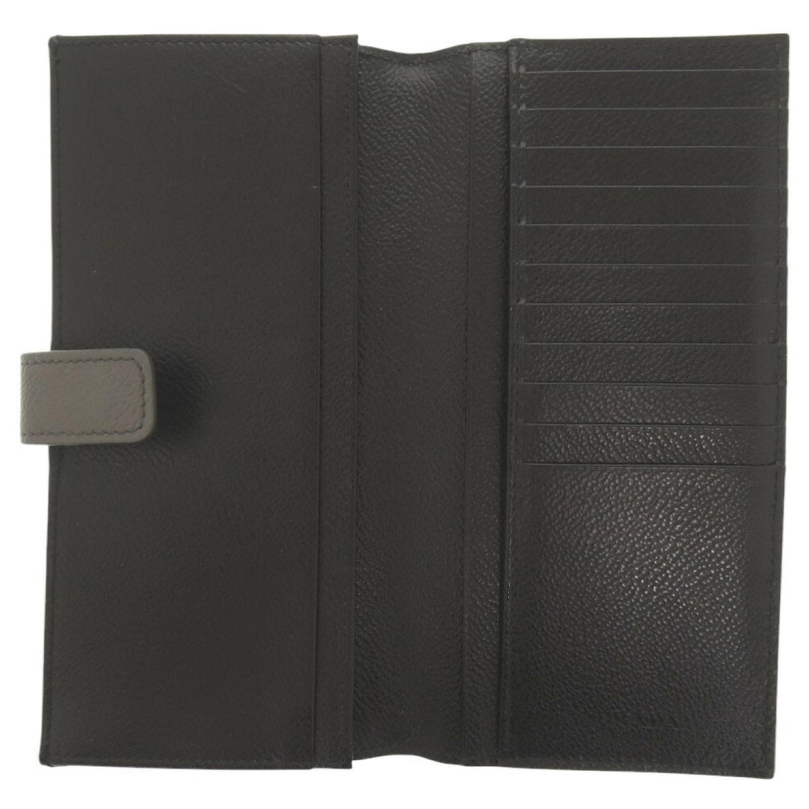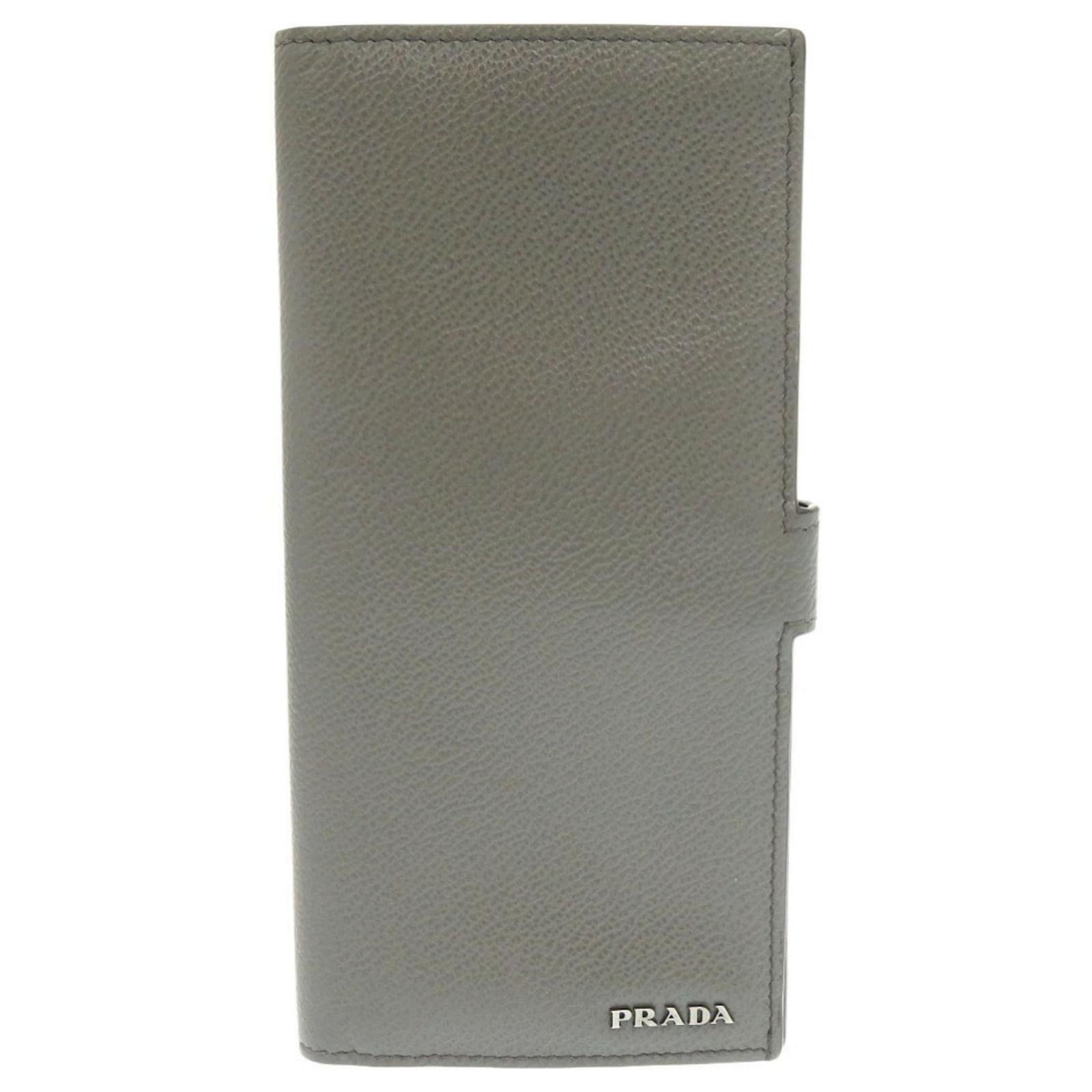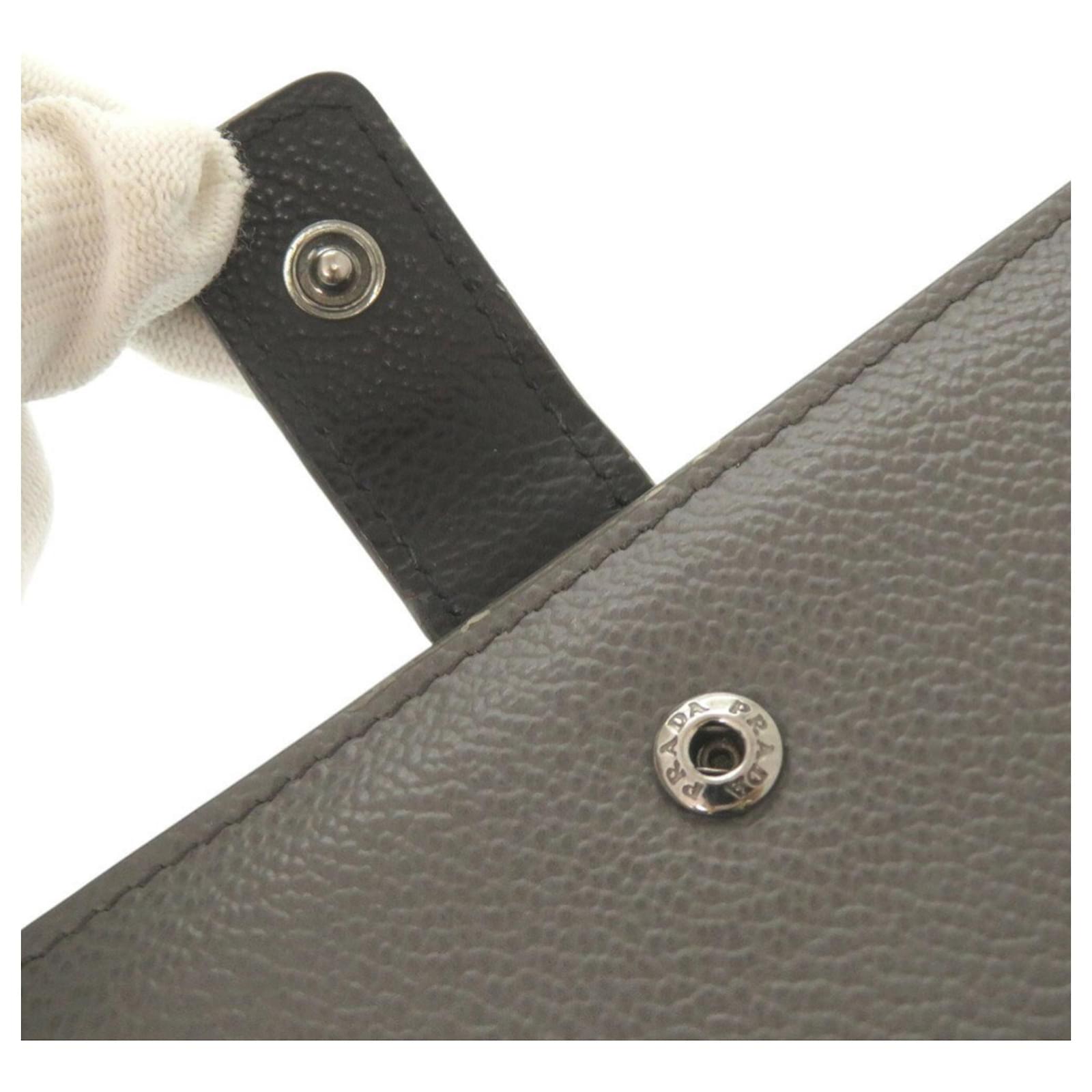 This Prada long wallet features a bi-fold design crafted from leather in a gray color. Measuring 19cm x 9.5cm (7.48” x 3.74”), it is designed for practicality and style. The wallet is classified as used but is in good condition, showing slight traces of use, including minor scratches and dirt. It is important to review the provided images for a clear understanding of its condition. No additional accessories are included with this item.