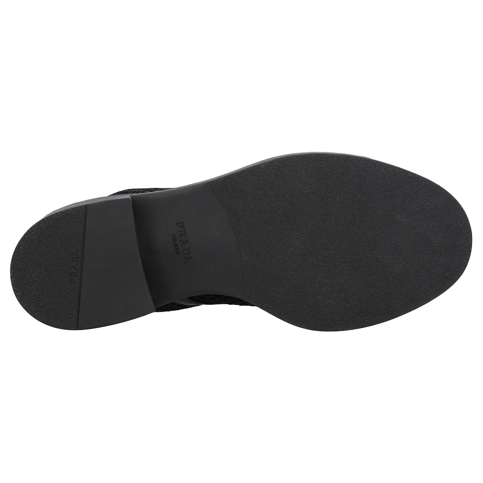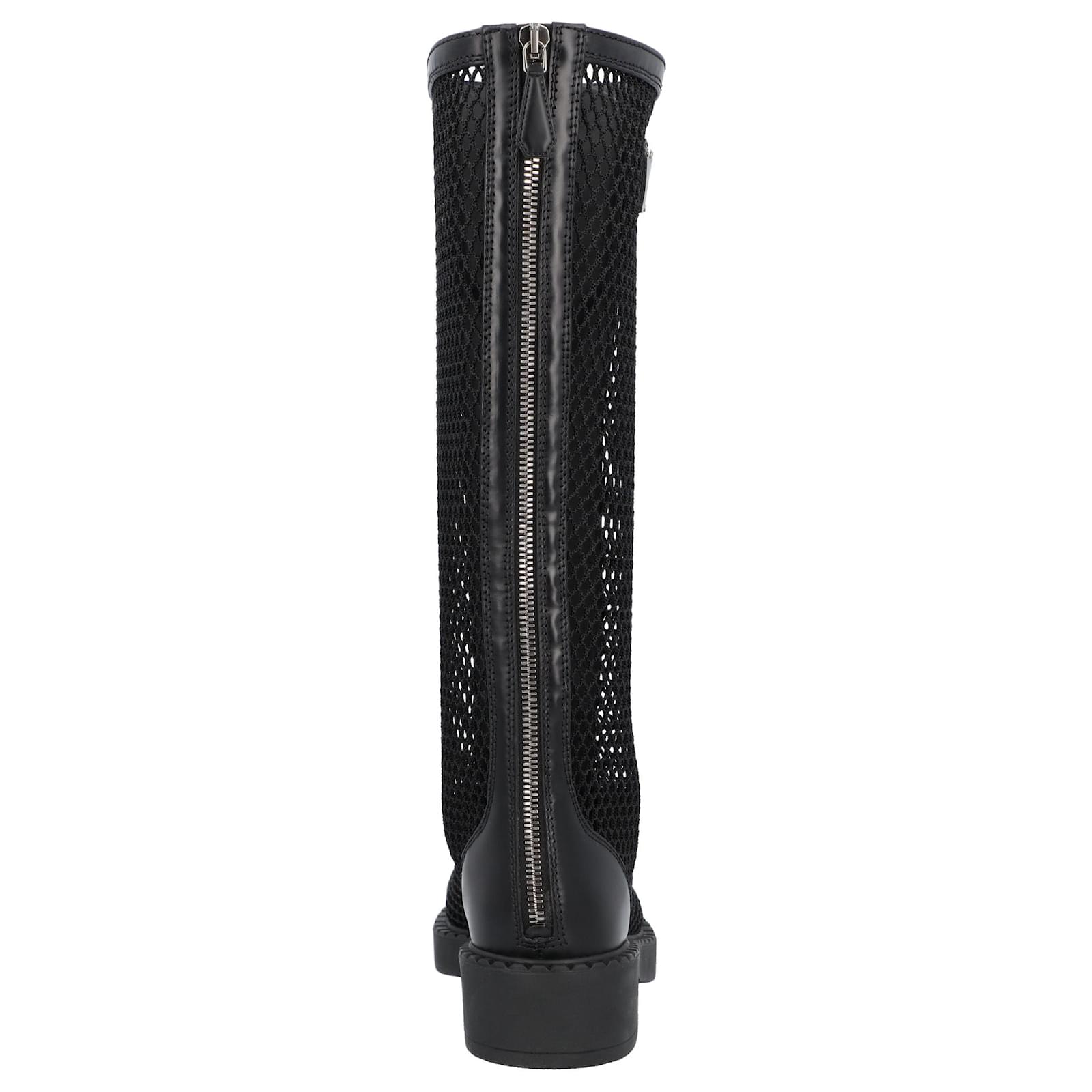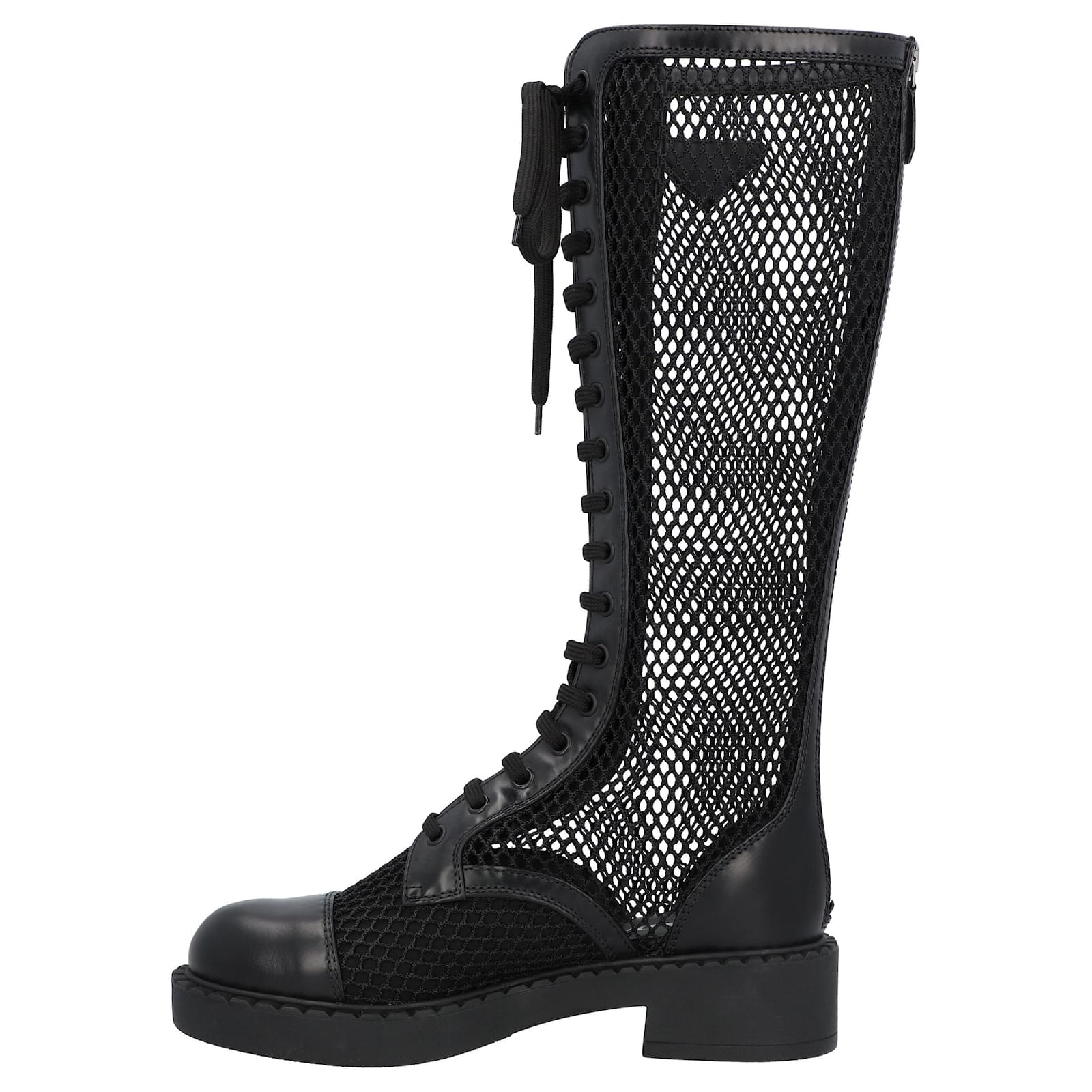 Prada boots made of brushed leather and mesh. Sole in gpmma. Closure with zip and laces on the front. Triangle logo in enameled metal applied on the leg. \n Product Id: 460402 \n