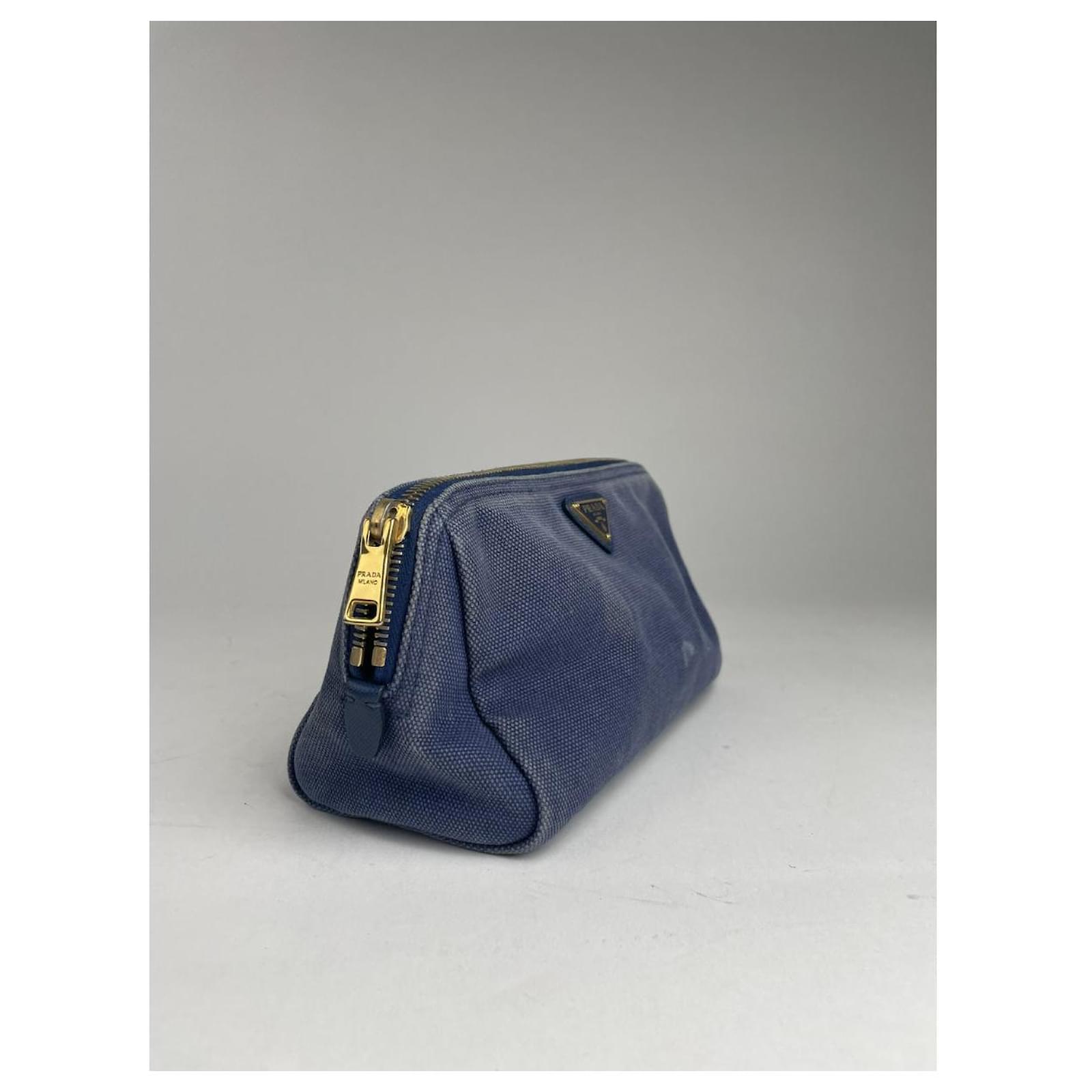 PRADA Vintage Denim Cosmetic Bag. This stylish cosmetic bag is crafted from navy\nblue denim, featuring the iconic Prada triangle logo on the front. The interior\nis lined with blue Prada monogram canvas, offering a luxurious and practical\ndesign. Made in Italy, this piece is both functional and timeless.\nBrand: PRADA\nModel: Vintage Cosmetic Bag\nCondition: Good\nCondition Details: The exterior denim shows some stains but remains in good\noverall condition. The gold-tone steel hardware is well-preserved with slight\nsigns of use. The interior is clean with normal wear.\nMain Colour: Navy Blue\nInterior Colour: Blue (Prada Monogram)\nHardware Colour: Gold\nMaterial: Denim, Canvas\nWidth: 21 cm\nHeight: 12 cm\nDepth: 9 cm\nMade in: Italy\nGender: women\nVC Condition: Good condition\nVC Category: bags\nVC Subcategory: handbags\nVC Subsubcategory: Handbags\nPattern: Plain