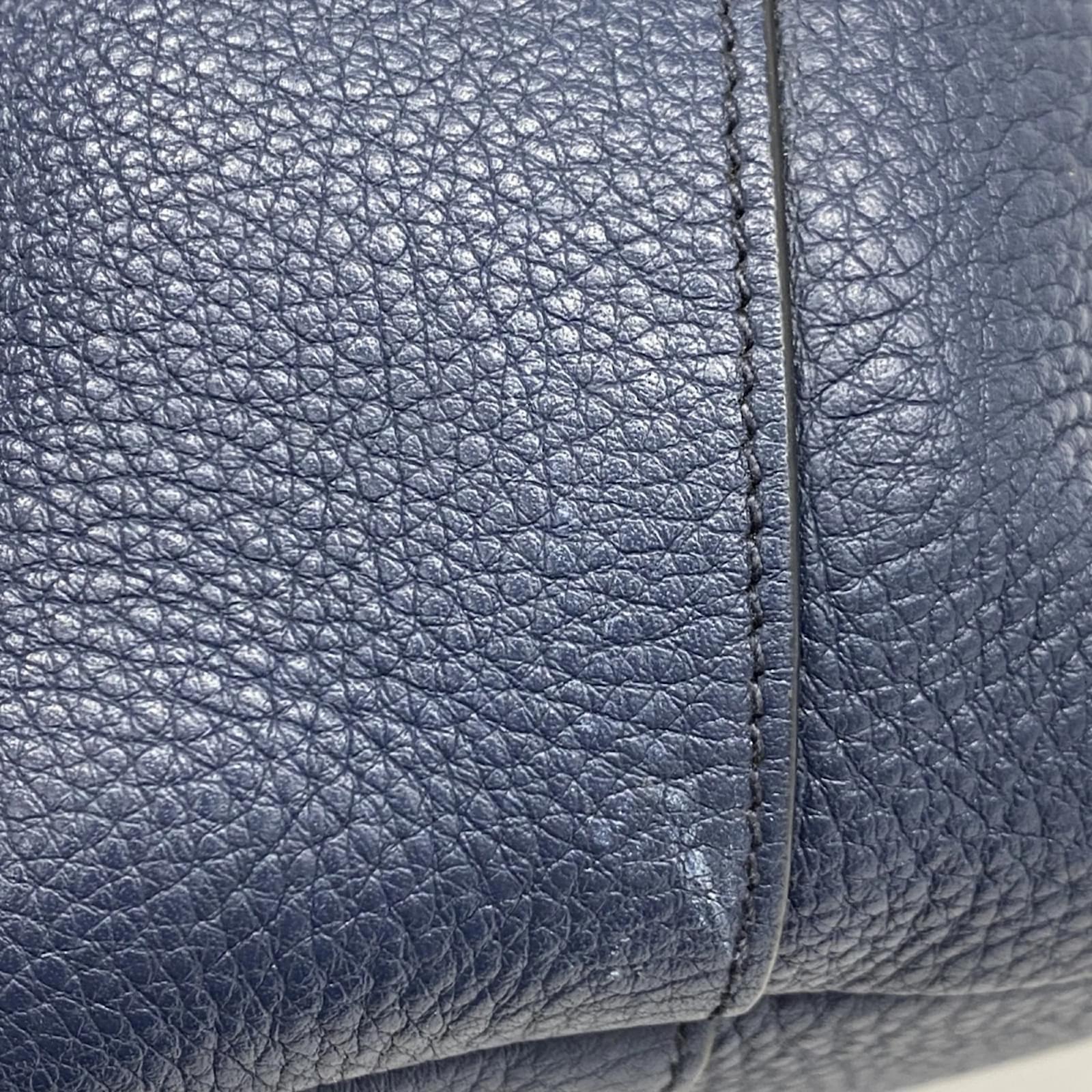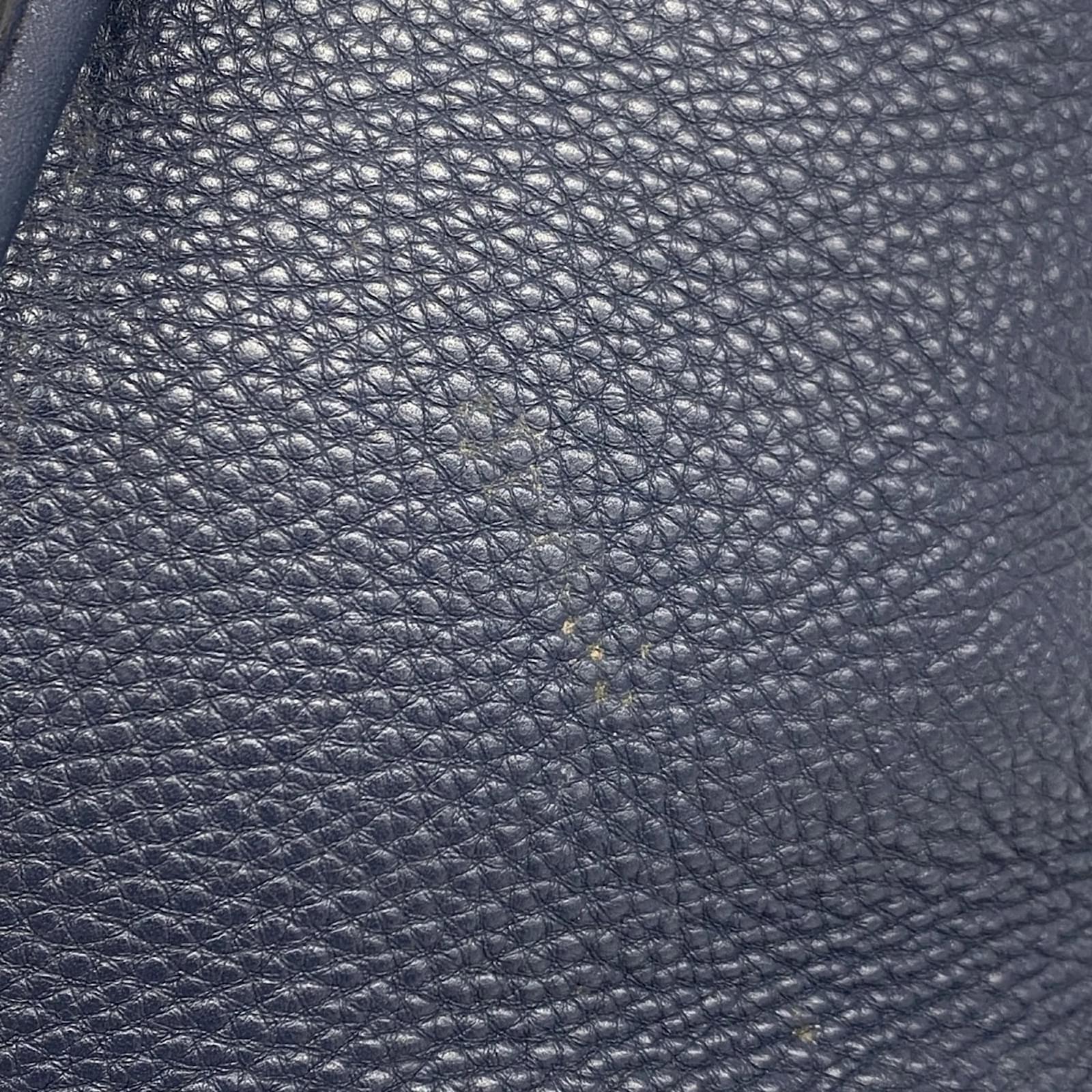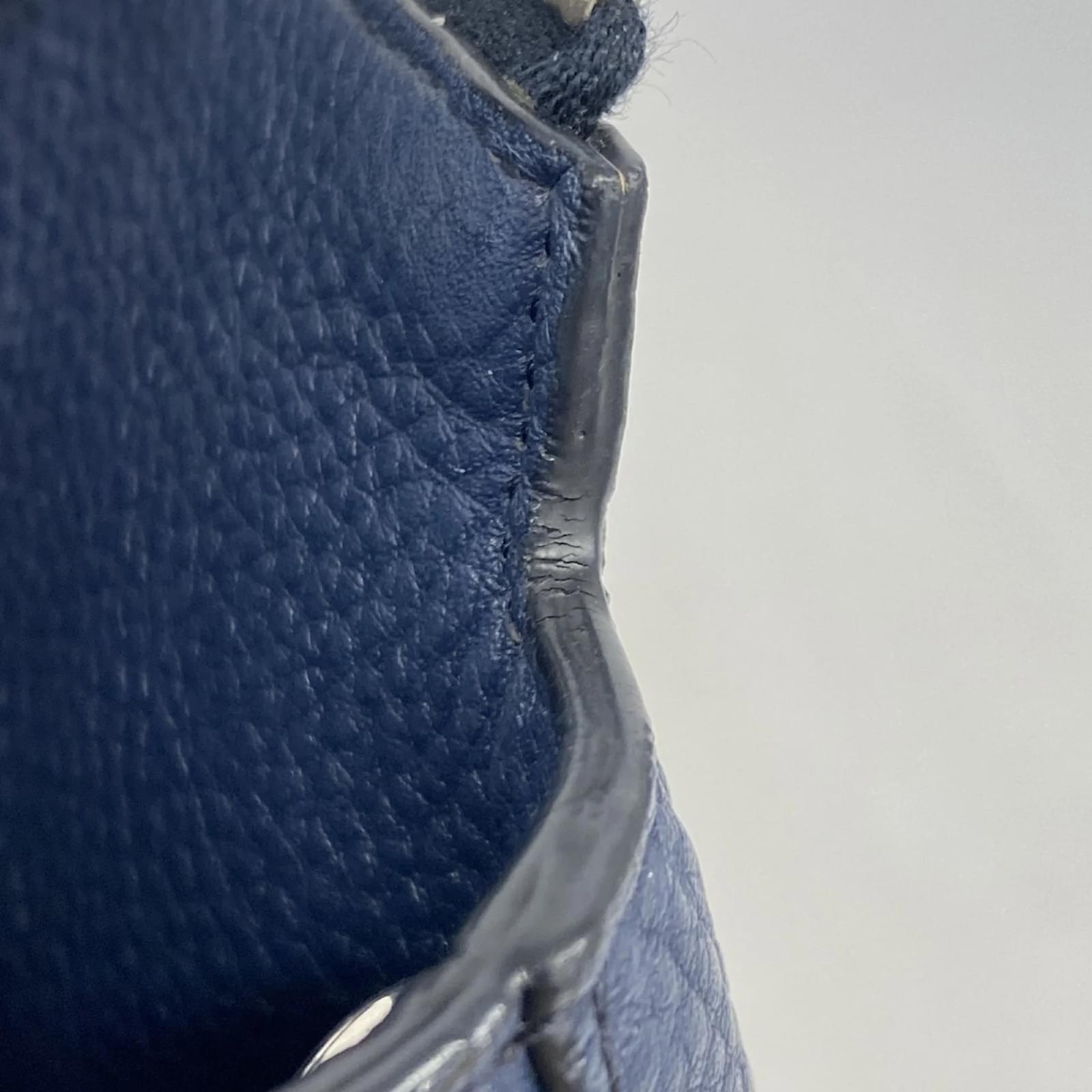 This Prada handbag is crafted from leather in a navy color, featuring silver hardware. It measures 24cm in height, 30cm in width, and 14cm in depth, making it a practical accessory for daily use. The handbag is classified as used but is in good condition, showing slight traces of usage, including minor scratches and dirt. Notably, there is slight deterioration of the zipper and a missing part of the strap. Included with the handbag is a keyring. Potential buyers are encouraged to review the images for a detailed view of the item’s condition and included accessories.