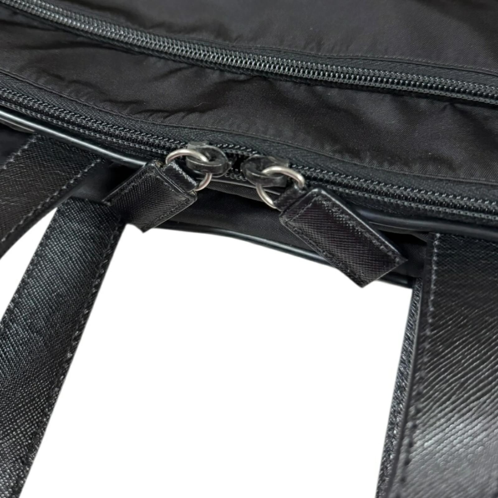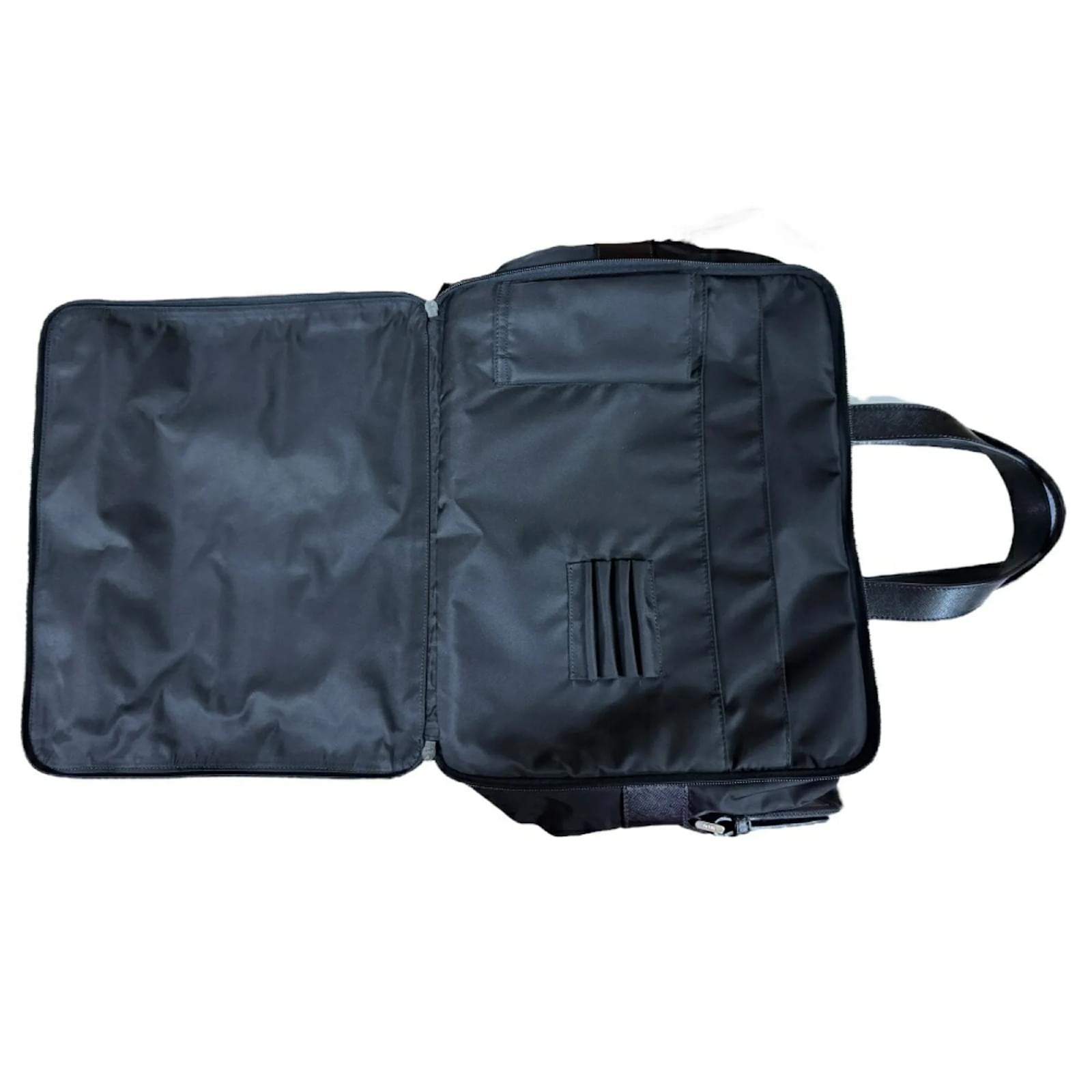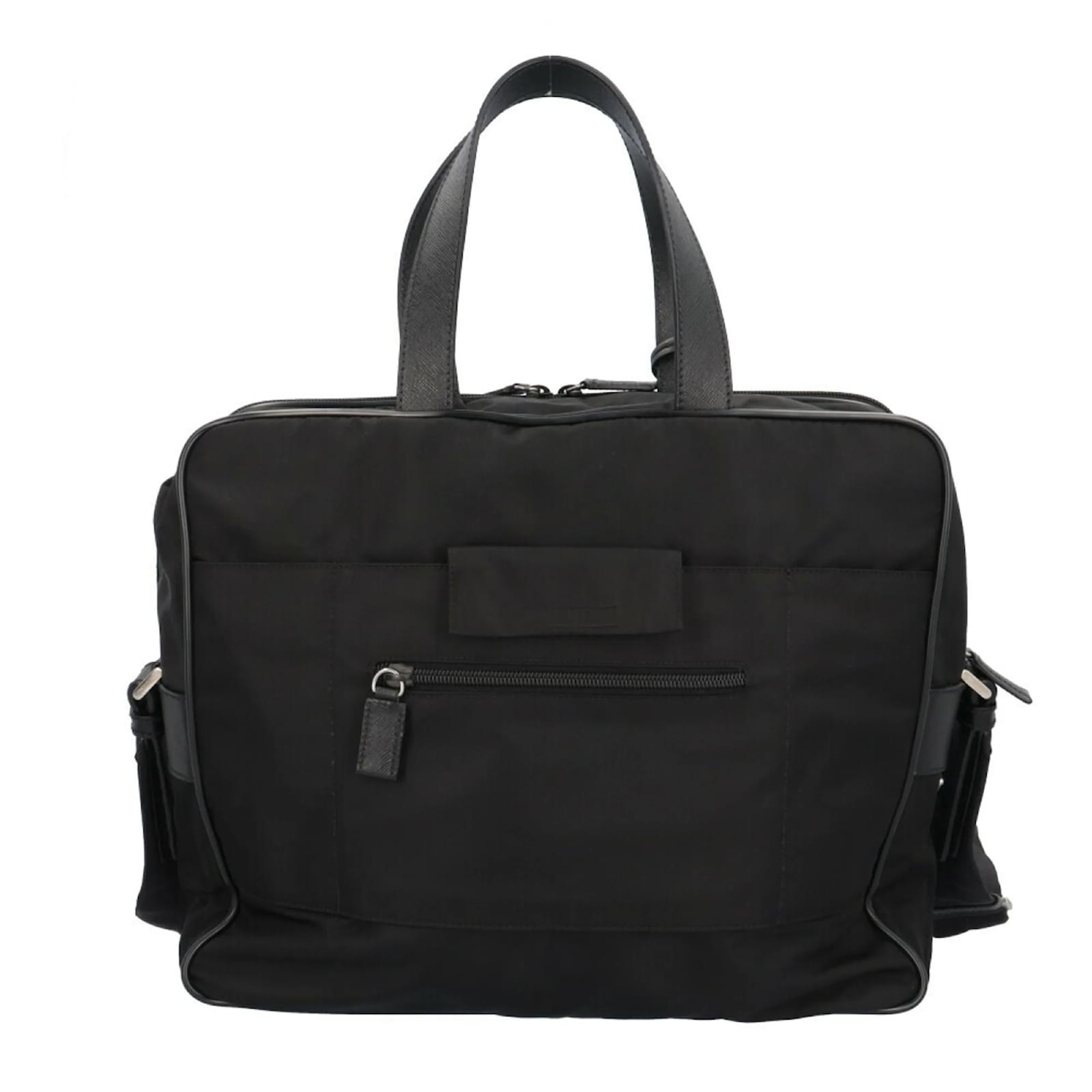 This Prada briefcase is crafted from a combination of nylon and leather, featuring a sleek black design. It includes a zipper closure and multiple pockets for organization, with two outer pockets (one zipper and one open) and one inner zipper pocket. The bag measures 30cm in height, 35cm in width, and 11cm in depth, with a handle length of 38cm and a strap length of 137cm for versatile carrying options. \n\nThe item is classified as used and is in acceptable condition, showing noticeable traces of use, including scuffs and creases. There is slight overall dirt, and the bag has an old, insignificant smell. It comes with a name tag and is recommended to be reviewed through provided images for a better understanding of its condition. \n\nThis briefcase is suitable for those seeking a practical yet stylish accessory for daily use.