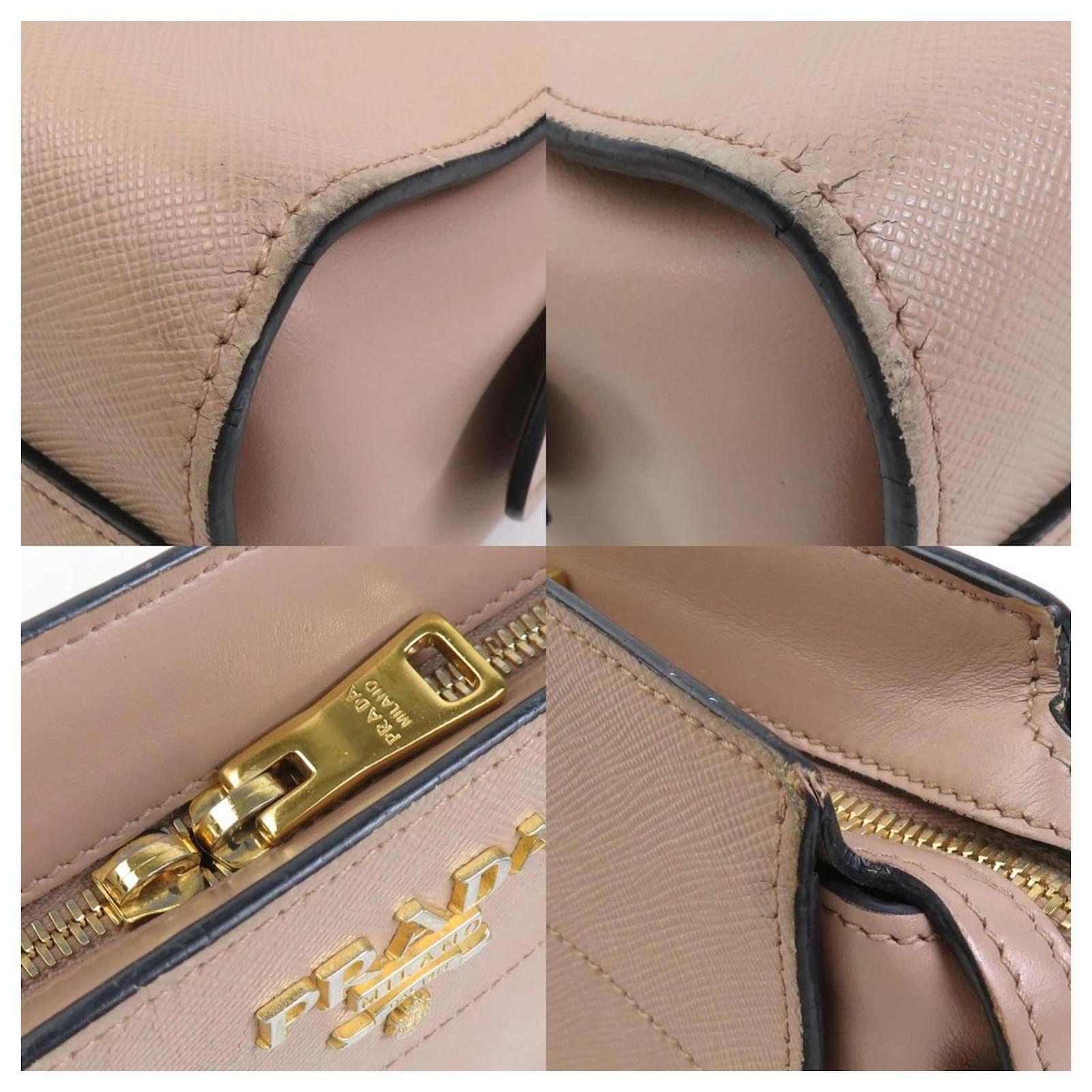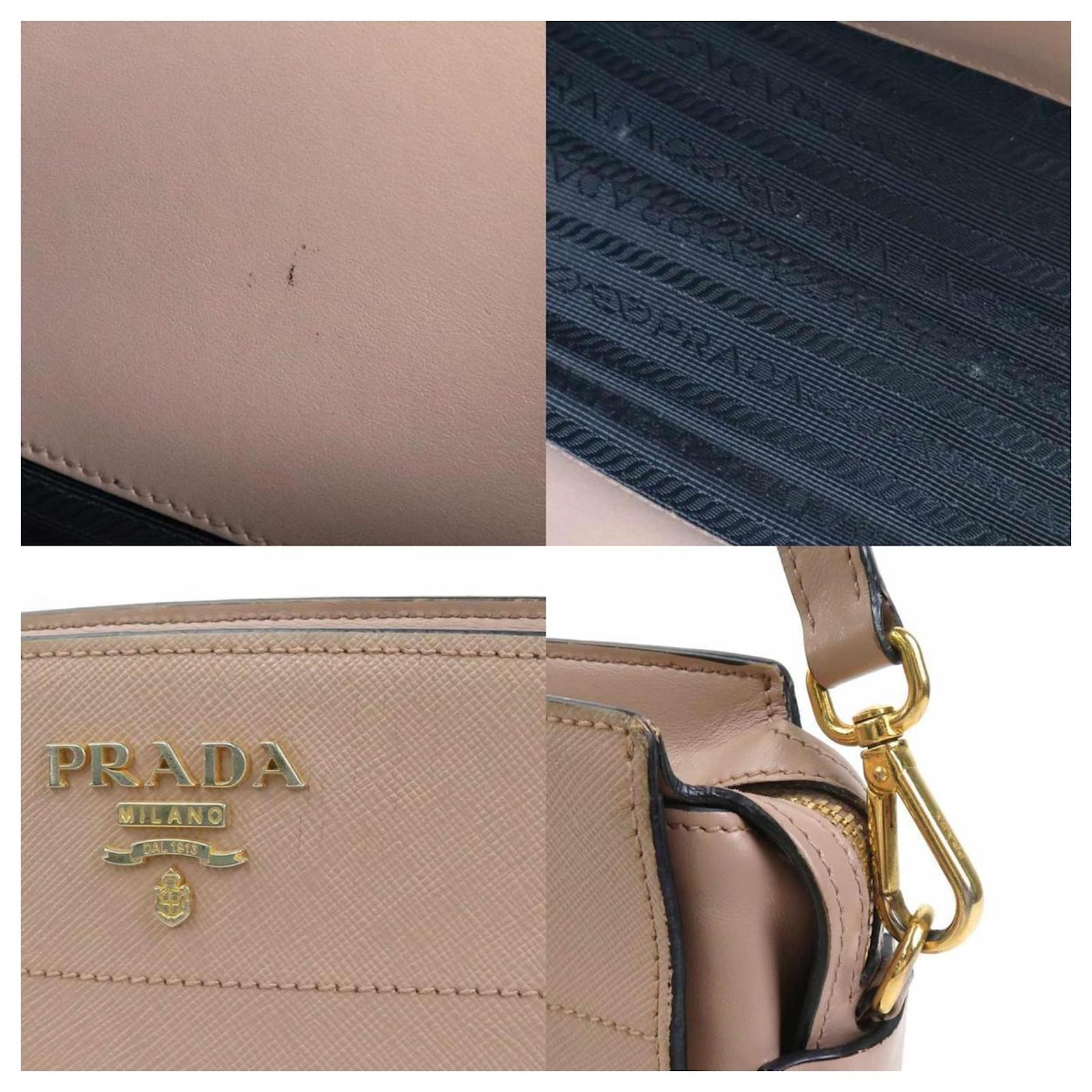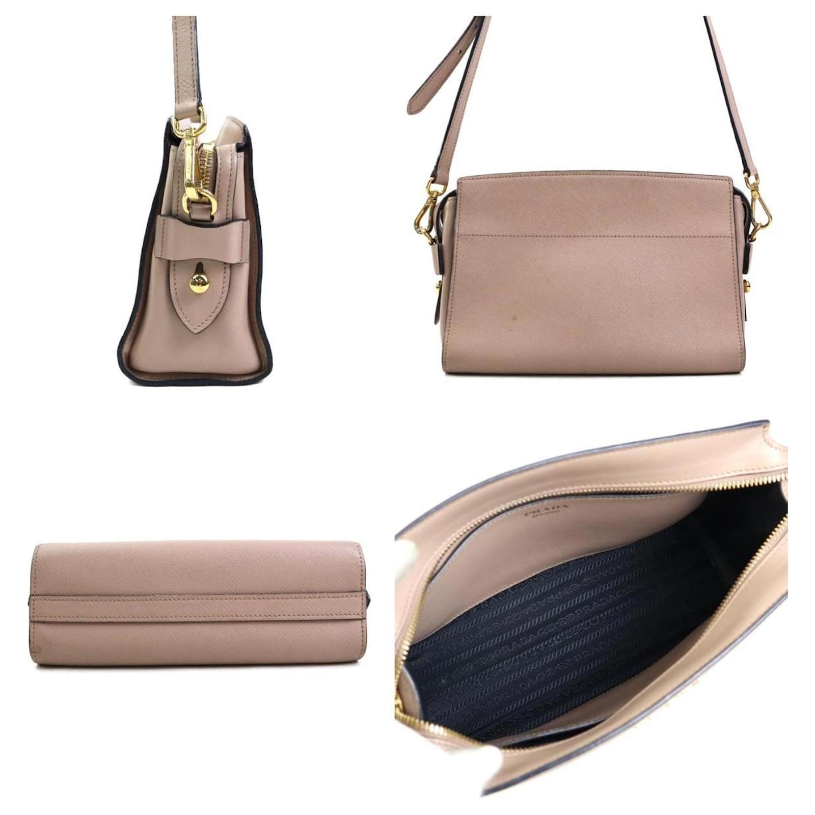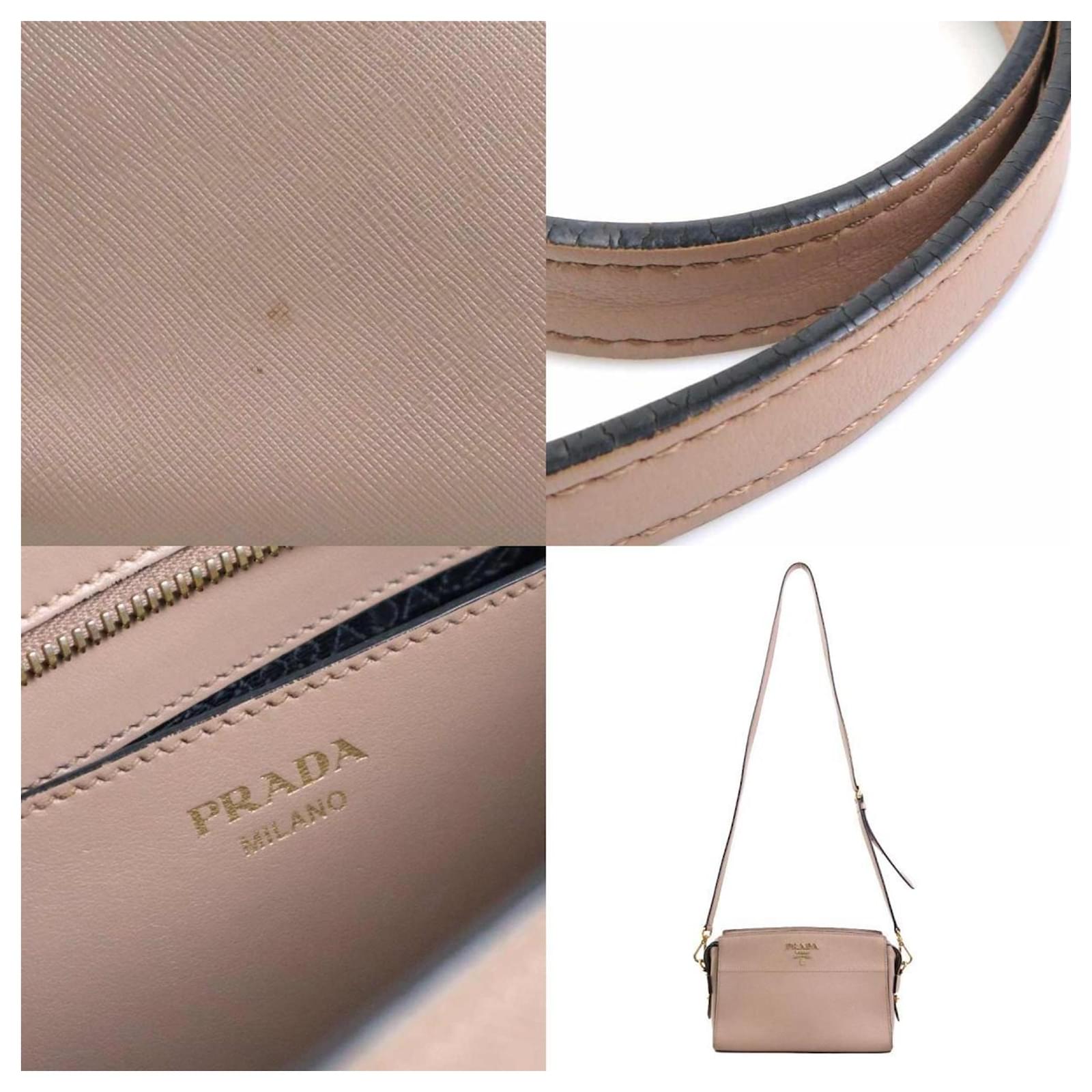 This Prada shoulder bag is crafted from leather in a pink beige hue, designed for women. It measures 16cm in height, 23.5cm in width, and 8cm in depth, with a strap length of 132cm. The bag is classified as used but is in good condition, showing slight traces of use, including minor scratches and dirt. It is important to review the provided images for a clear understanding of its condition and any included accessories.
