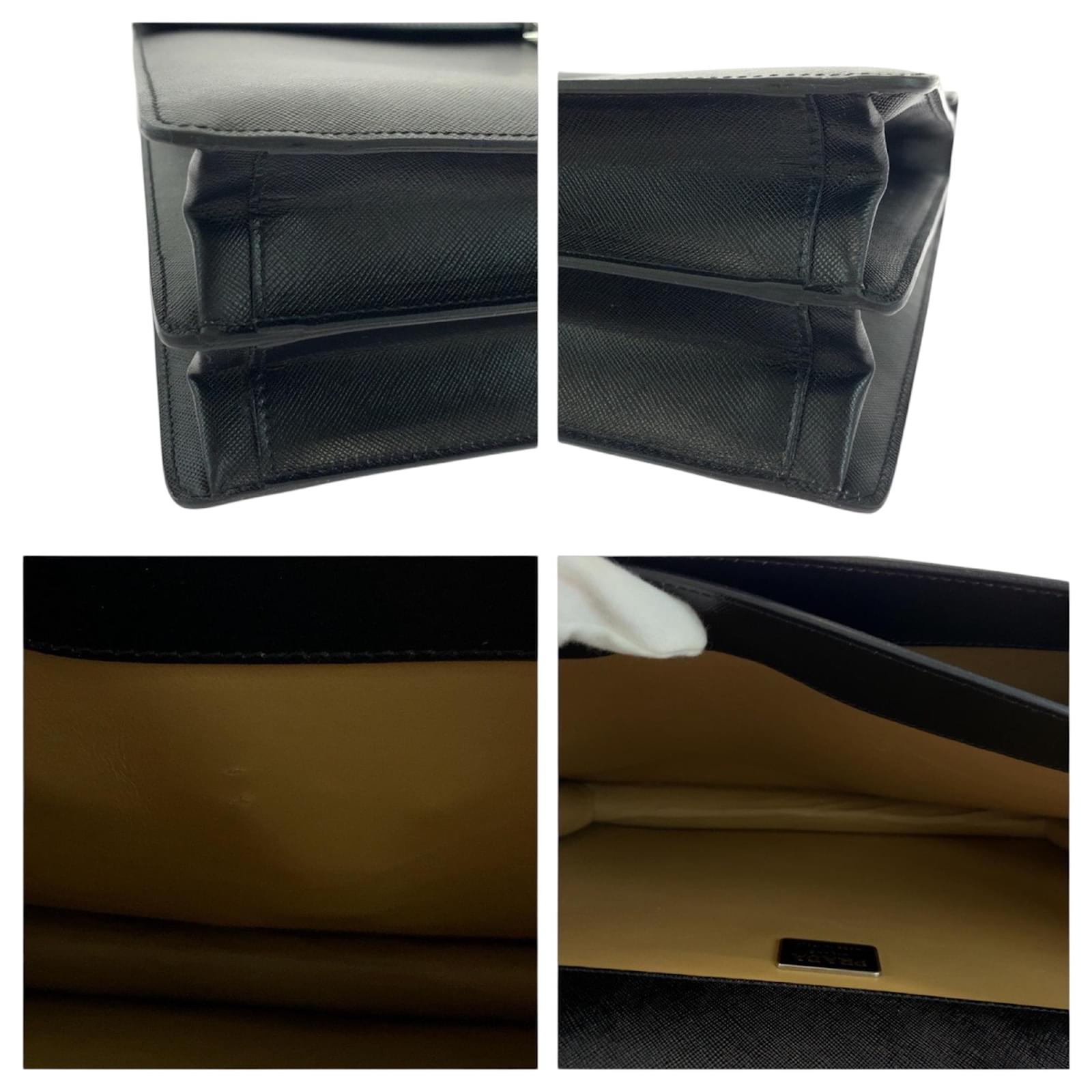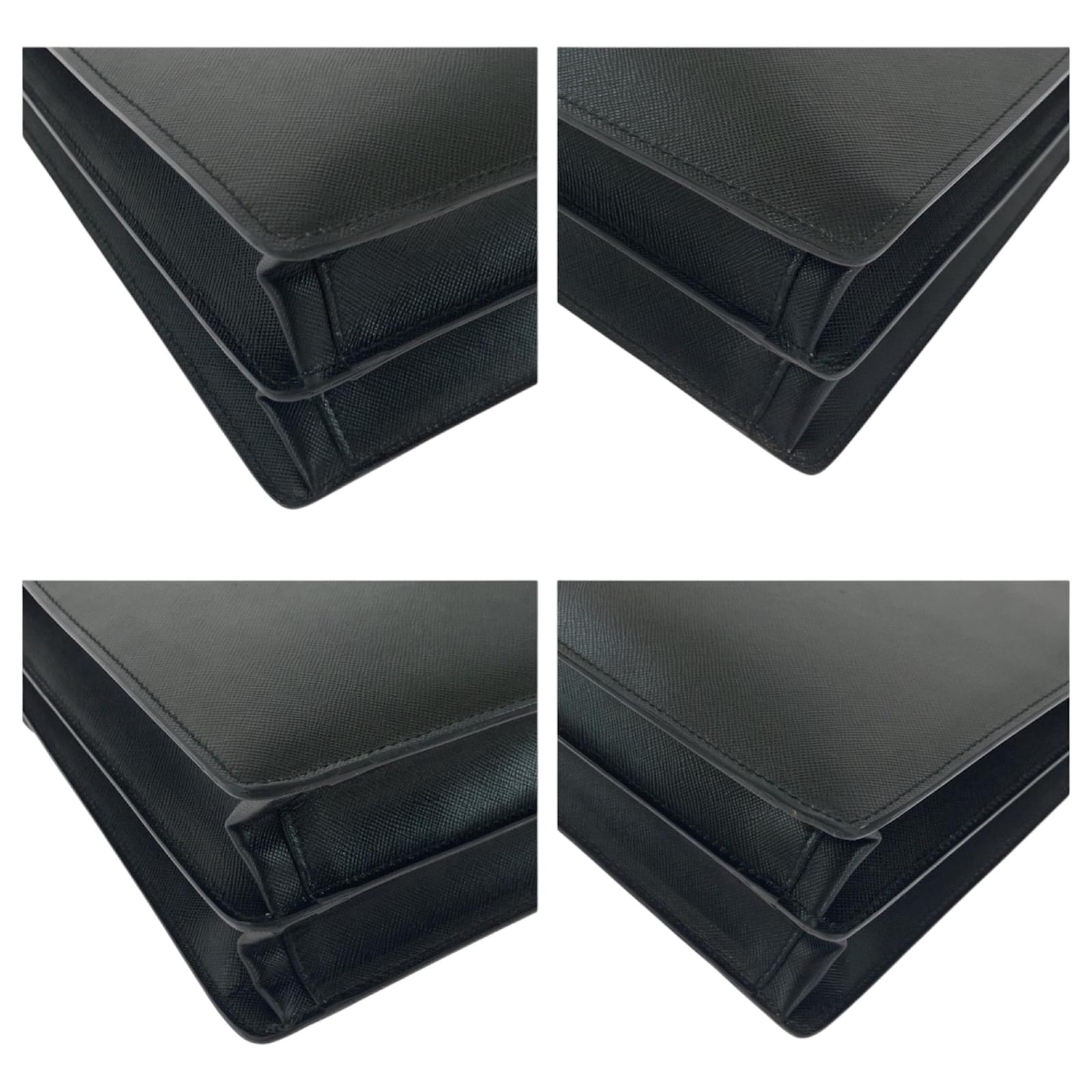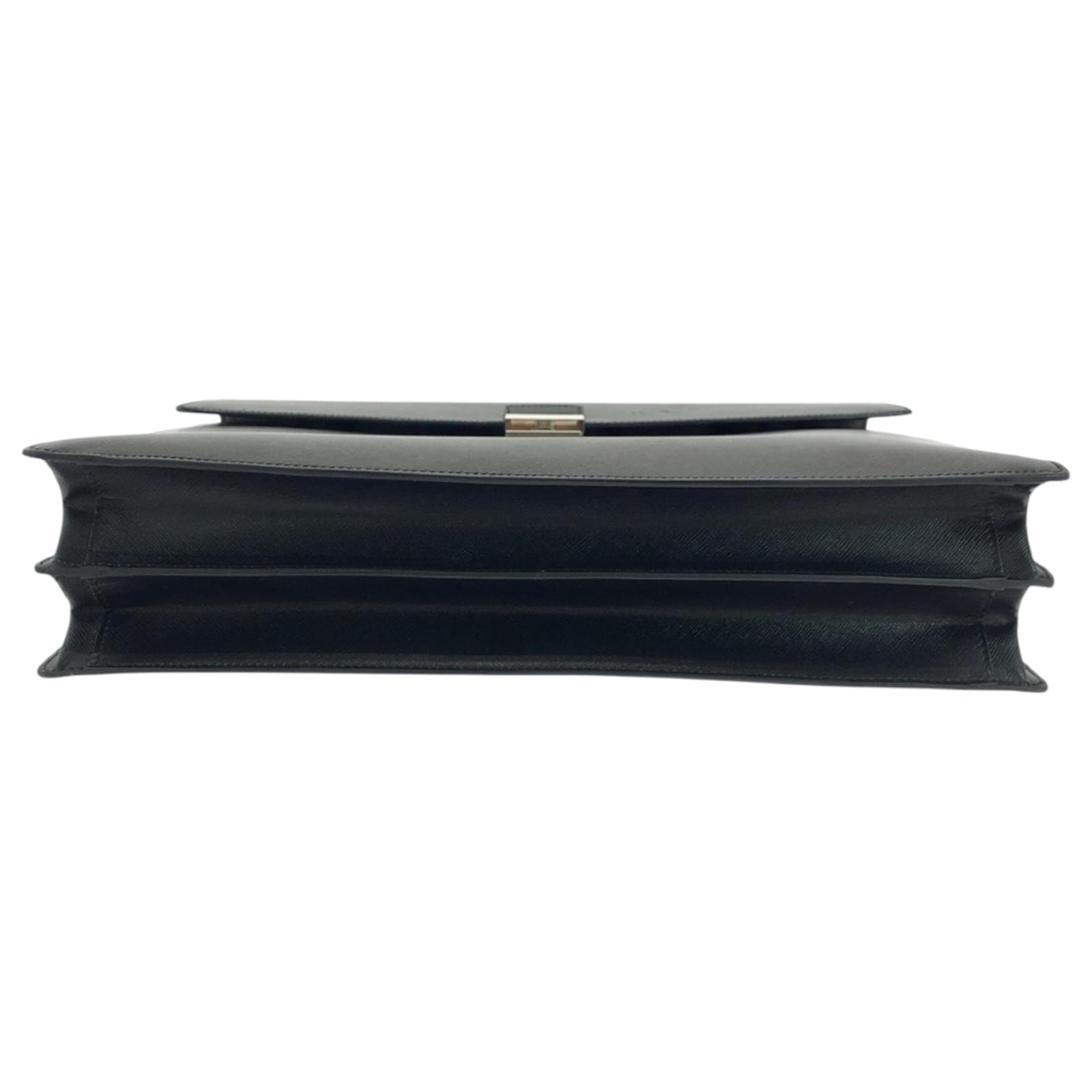 This Prada Saffiano handbag is crafted from black leather and features a push lock closure with silver hardware. Designed for practicality, it measures 28cm in height, 38cm in width, and 7.5cm in depth, with a handle length of 21cm. \n\nOriginating from Italy, this bag is part of the Prada brand and is categorized under the Saffiano line. It is in used condition, classified as Rank AB, showing slight traces of usage, including minor scratches and dirt. Potential buyers are encouraged to review the provided images for a detailed view of the item’s condition and included accessories.