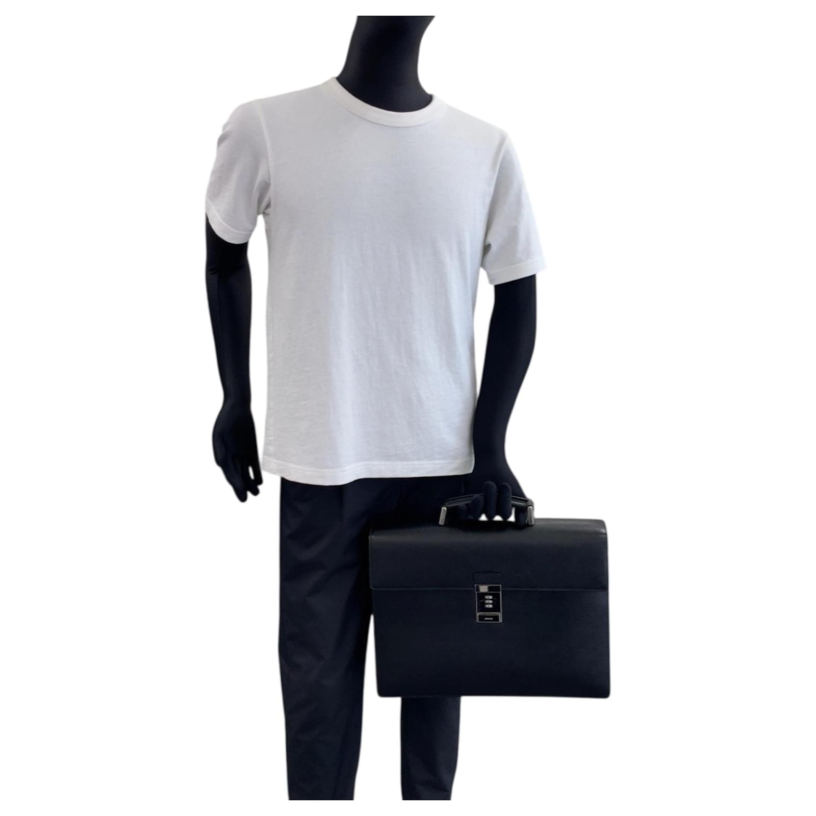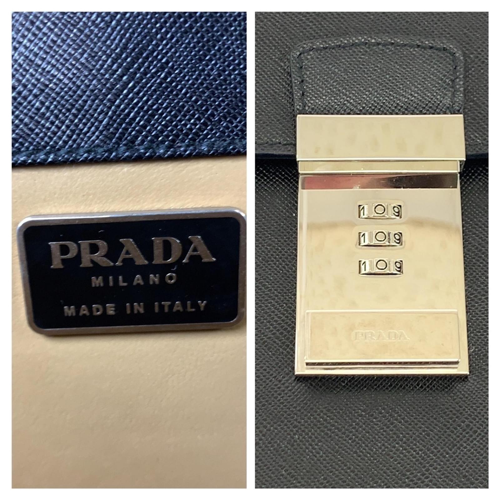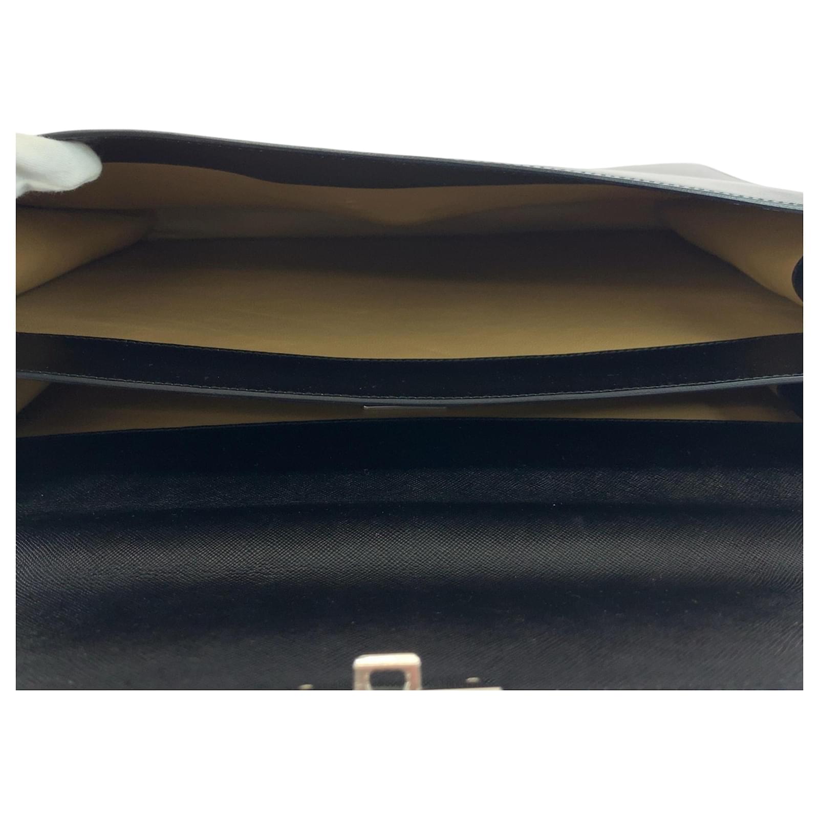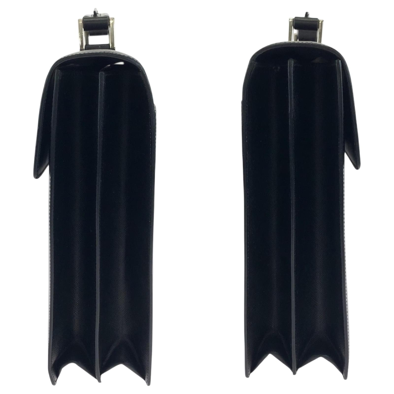 This Prada Saffiano handbag is crafted from black leather and features a push lock closure with silver hardware. Designed for practicality, it measures 28cm in height, 38cm in width, and 7.5cm in depth, with a handle length of 21cm. \n\nOriginating from Italy, this bag is part of the Prada brand and is categorized under the Saffiano line. It is in used condition, classified as Rank AB, showing slight traces of usage, including minor scratches and dirt. Potential buyers are encouraged to review the provided images for a detailed view of the item’s condition and included accessories.