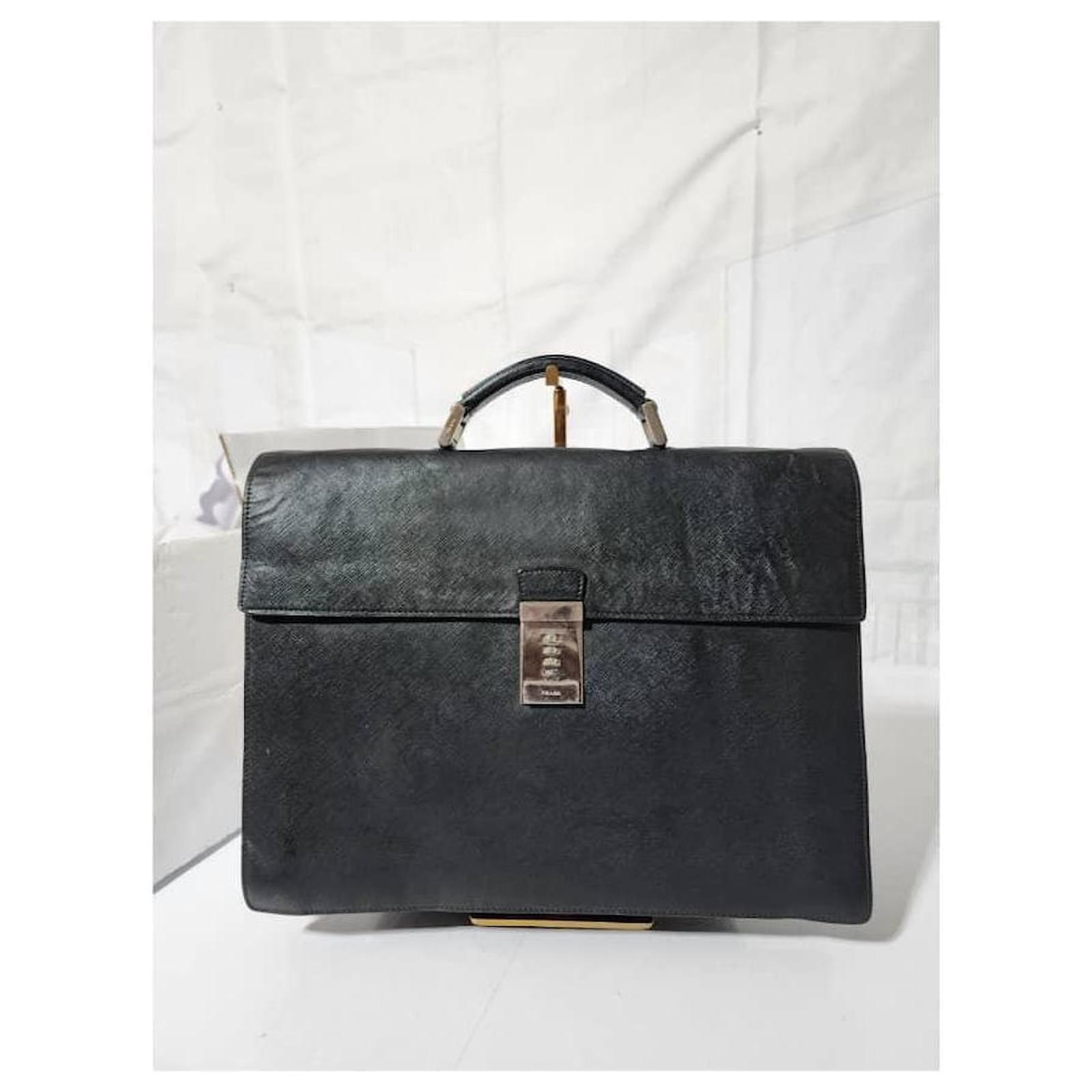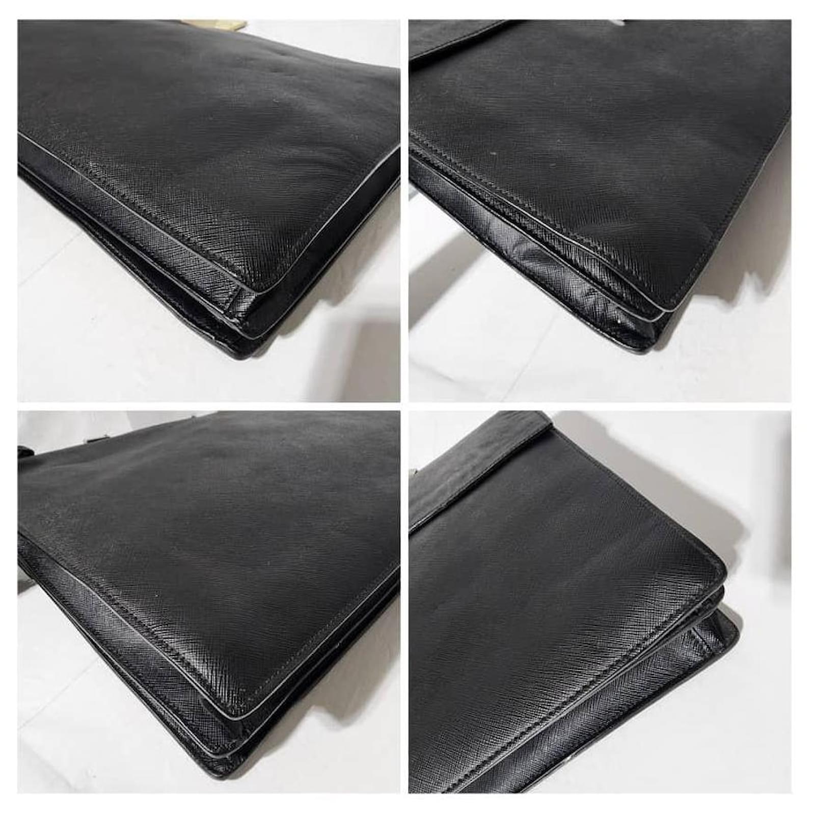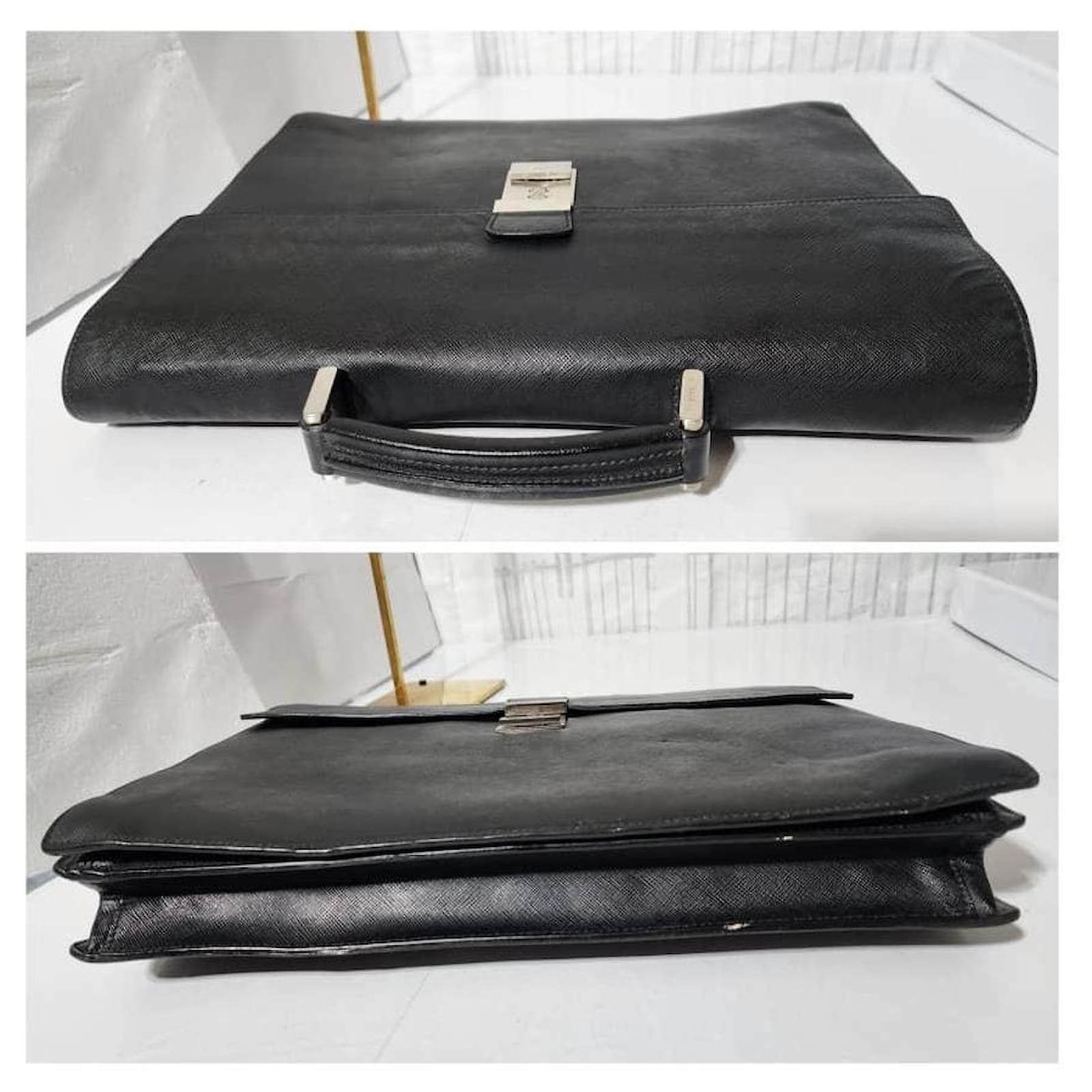 This authentic Prada Saffiano Leather Top Handle Briefcase Black is in it’s good pre-owned condition. The exterior is clean and beautiful. The interior is clean. Silver hardware. \r\n\r\nKindly note that picture on mannequin is not ours but for size reference and fit.\r\n\r\nDimensions \r\nHeight: 11.5\”\r\nWidth: 15.5\”\r\nDepth: 2.75\”