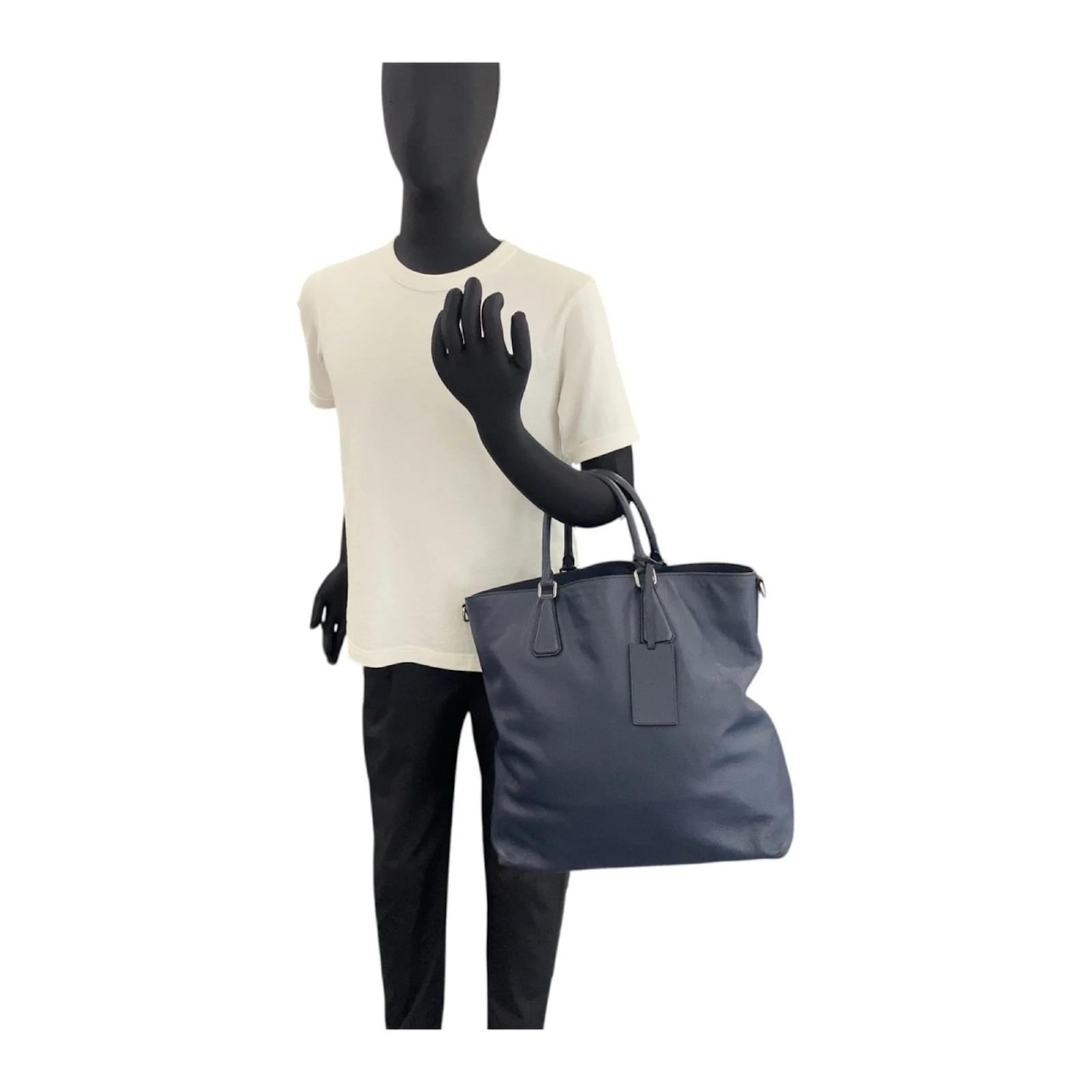 This Prada Saffiano tote bag features a navy leather exterior complemented by silver hardware. Designed for versatility, it measures 38cm in height, 42cm in width, and 16cm in depth, with a handle length of 40cm. The bag is part of the Saffiano line and is made in Italy. \n\nThe item is classified as used but remains in good condition, showing slight traces of usage, including minor scratches and dirt. It comes with a name tag and is ranked as AB, indicating it has been well-maintained. Potential buyers are encouraged to review the provided images for a detailed view of the bag’s condition and included accessories.