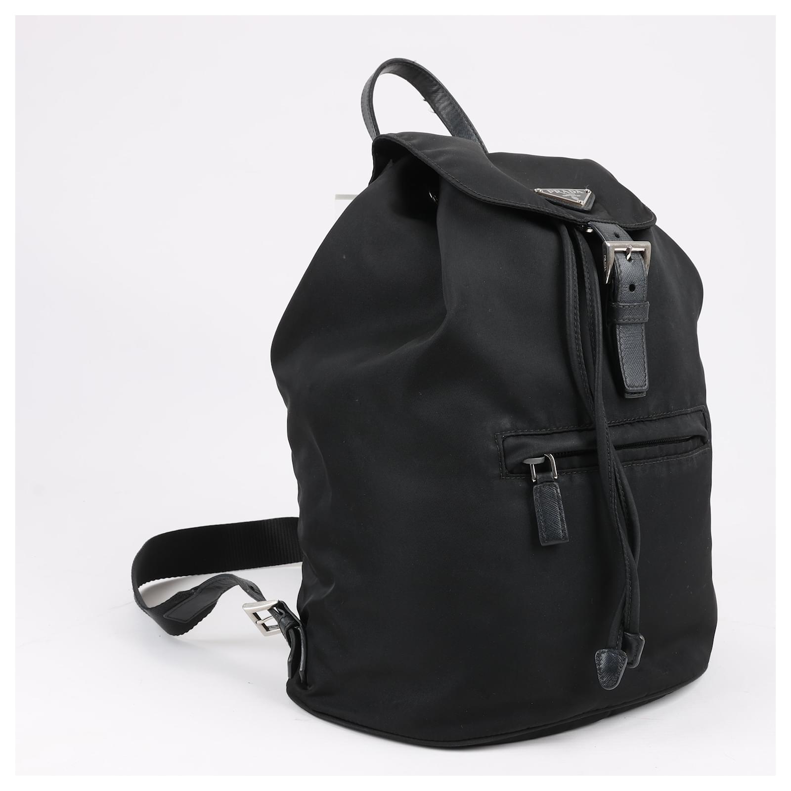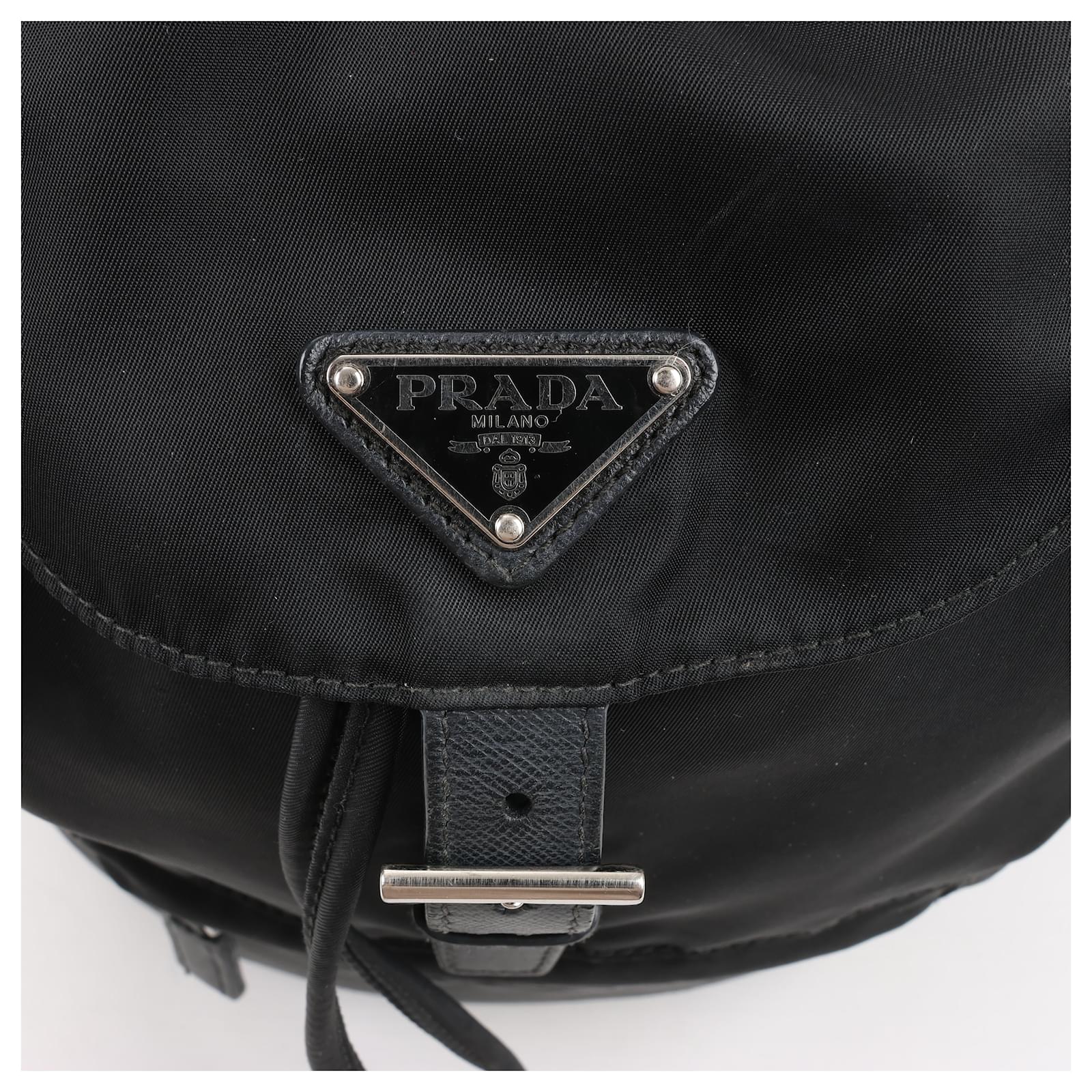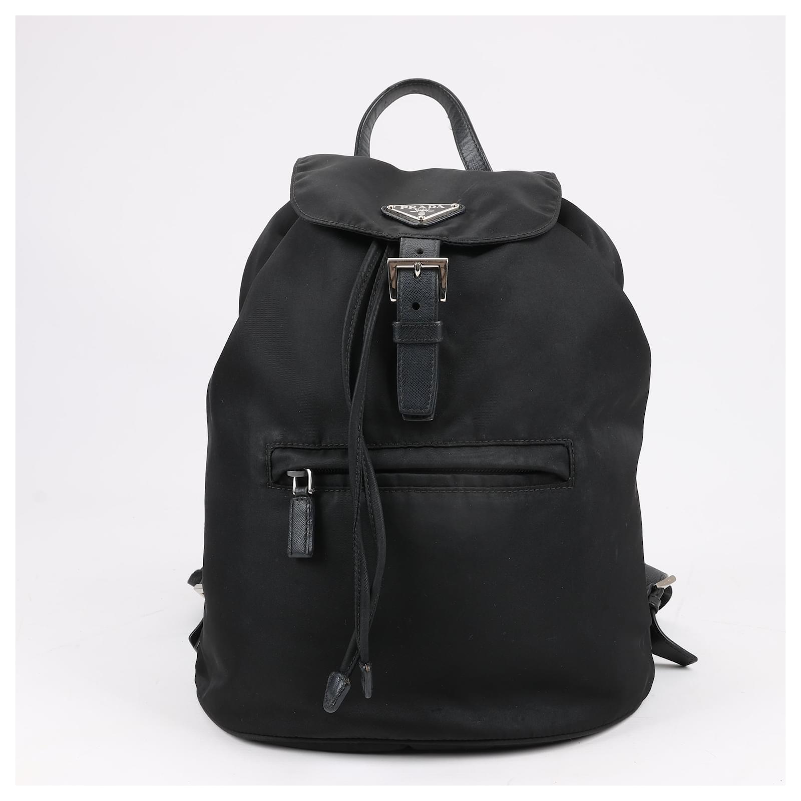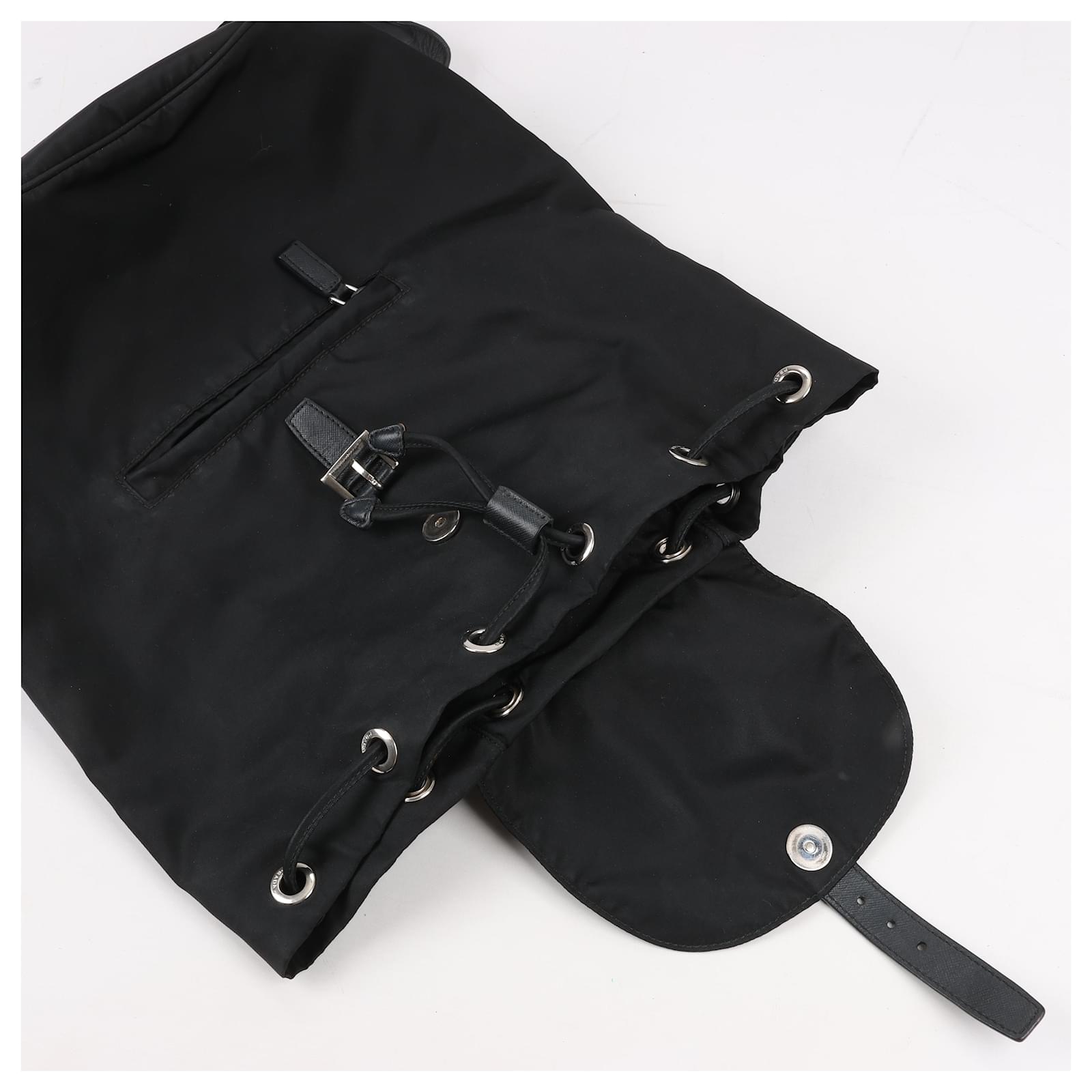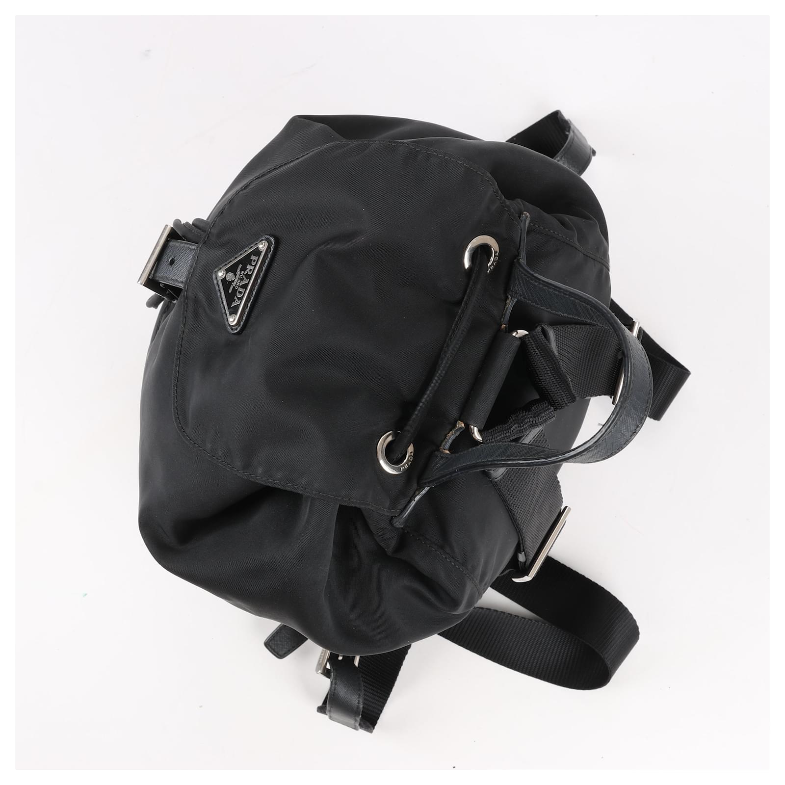 The Prada Tessuto Fabric x Leather Backpack in black is the perfect blend of\nluxury and functionality. Crafted from durable nylon with leather accents, it\nfeatures a drawstring closure, buckle flap, and iconic triangle logo. A stylish\nessential for everyday adventures.\nBrand: Prada\nModel: Tessuto \nSize: -\nWidth: 26 cm\nHeight: 36 cm\nExterior Condition: Excellent\nInterior Condition: Very good\nCondition Details: The exterior fabric is clean and beautiful. The leather trim\nhas some light crease, cracks. The hardware is bright and crisp with surface\nscratches. The interior is clean and in good condition, except usage rubbings. \nColour: Black\nInterior Colour: Black\nHardware Colour: Silver\nMaterial: Cloth, Leather\nComes With: –