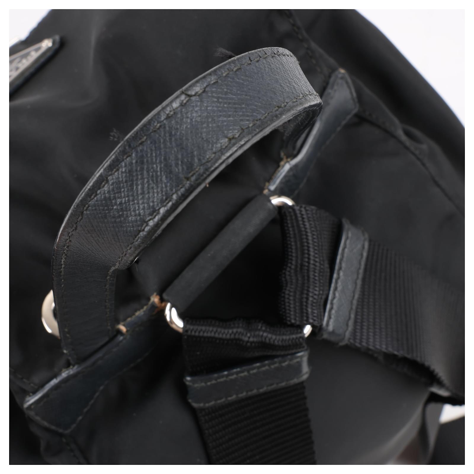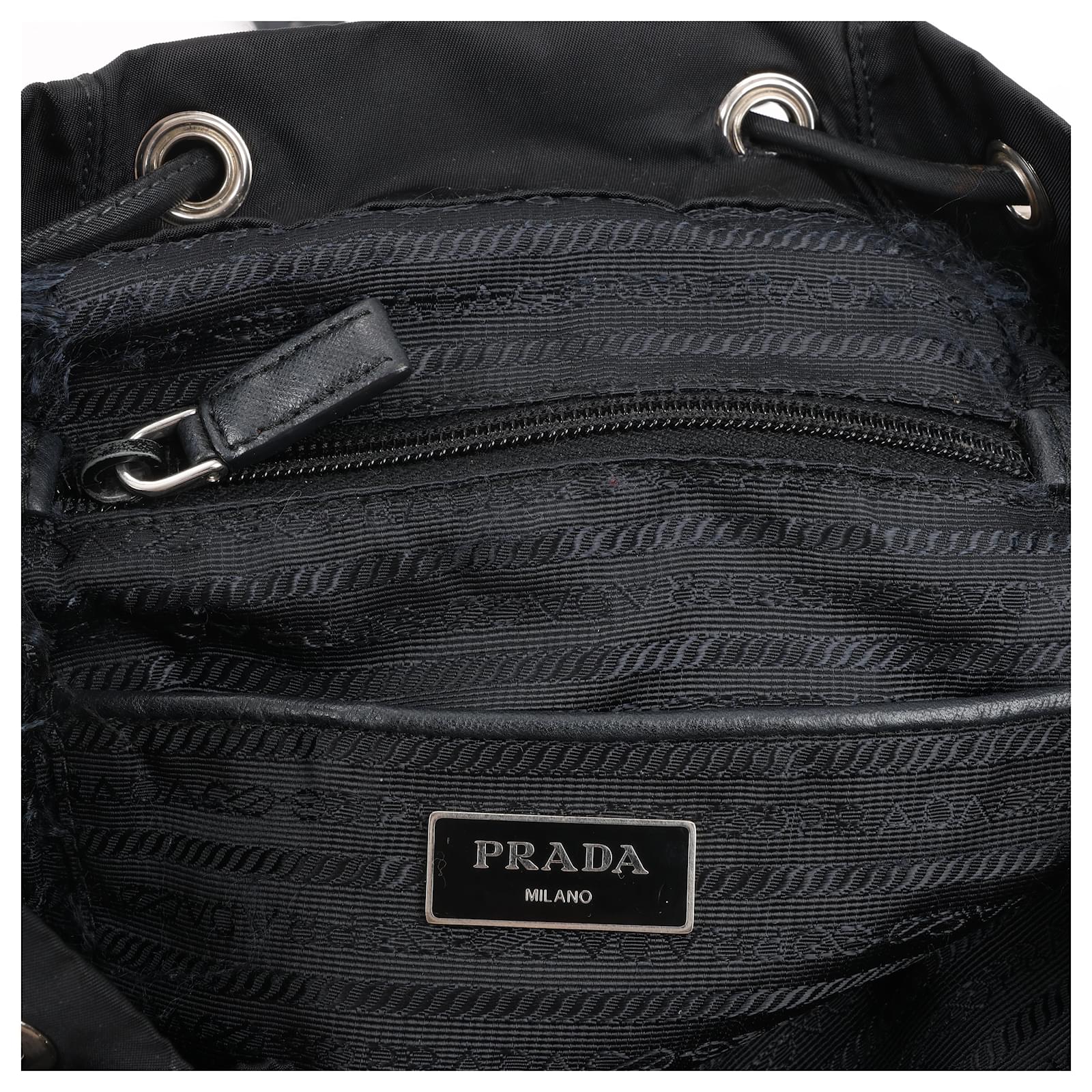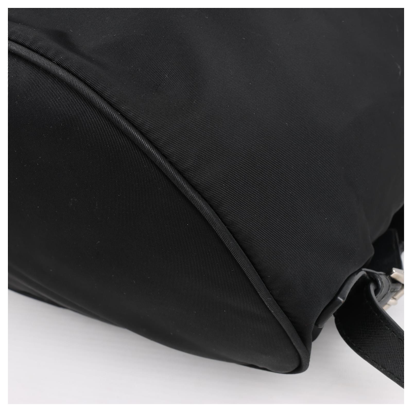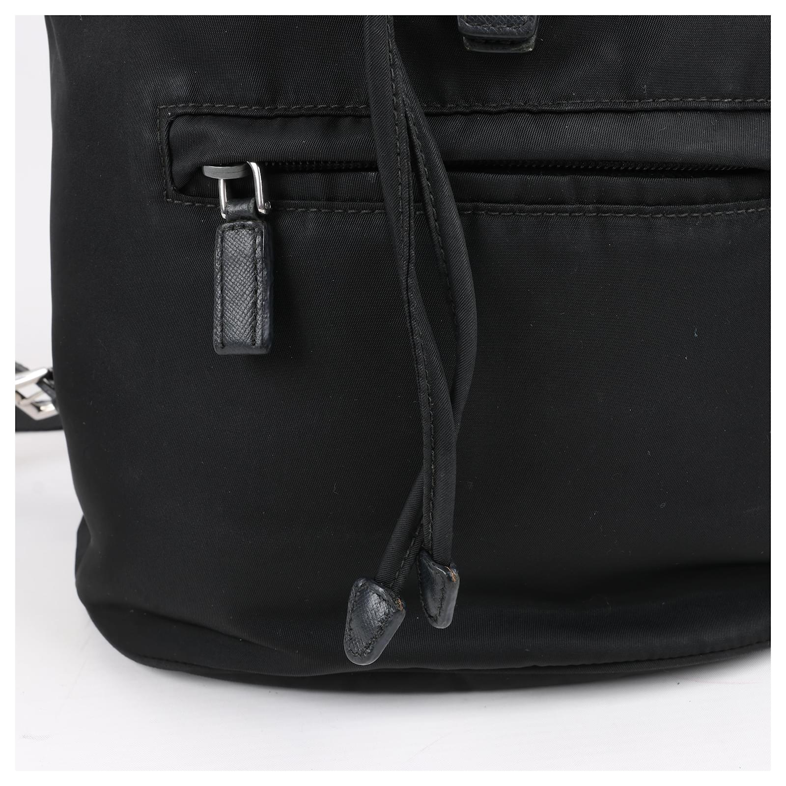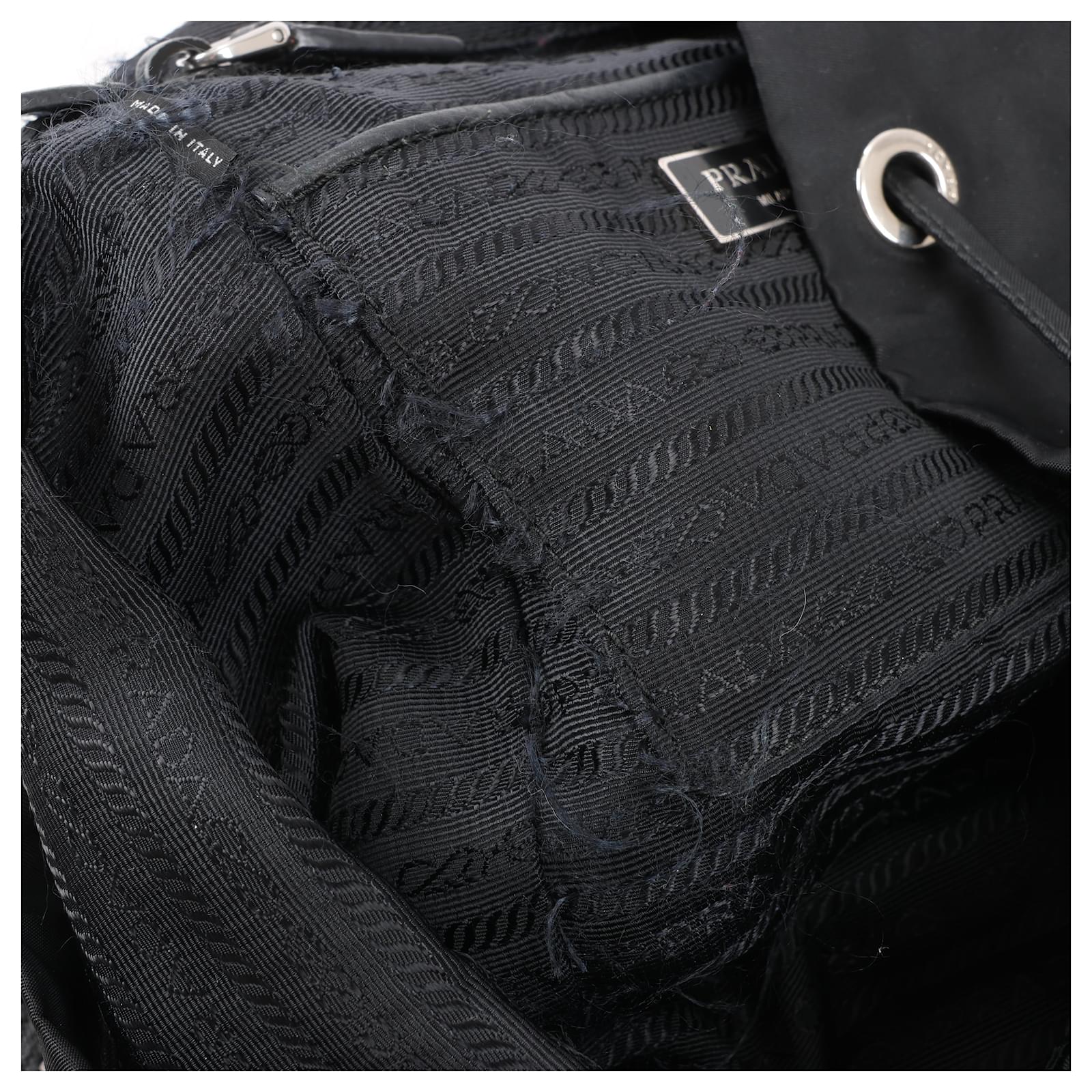 The Prada Tessuto Fabric x Leather Backpack in black is the perfect blend of\nluxury and functionality. Crafted from durable nylon with leather accents, it\nfeatures a drawstring closure, buckle flap, and iconic triangle logo. A stylish\nessential for everyday adventures.\nBrand: Prada\nModel: Tessuto \nSize: -\nWidth: 26 cm\nHeight: 36 cm\nExterior Condition: Excellent\nInterior Condition: Very good\nCondition Details: The exterior fabric is clean and beautiful. The leather trim\nhas some light crease, cracks. The hardware is bright and crisp with surface\nscratches. The interior is clean and in good condition, except usage rubbings. \nColour: Black\nInterior Colour: Black\nHardware Colour: Silver\nMaterial: Cloth, Leather\nComes With: –