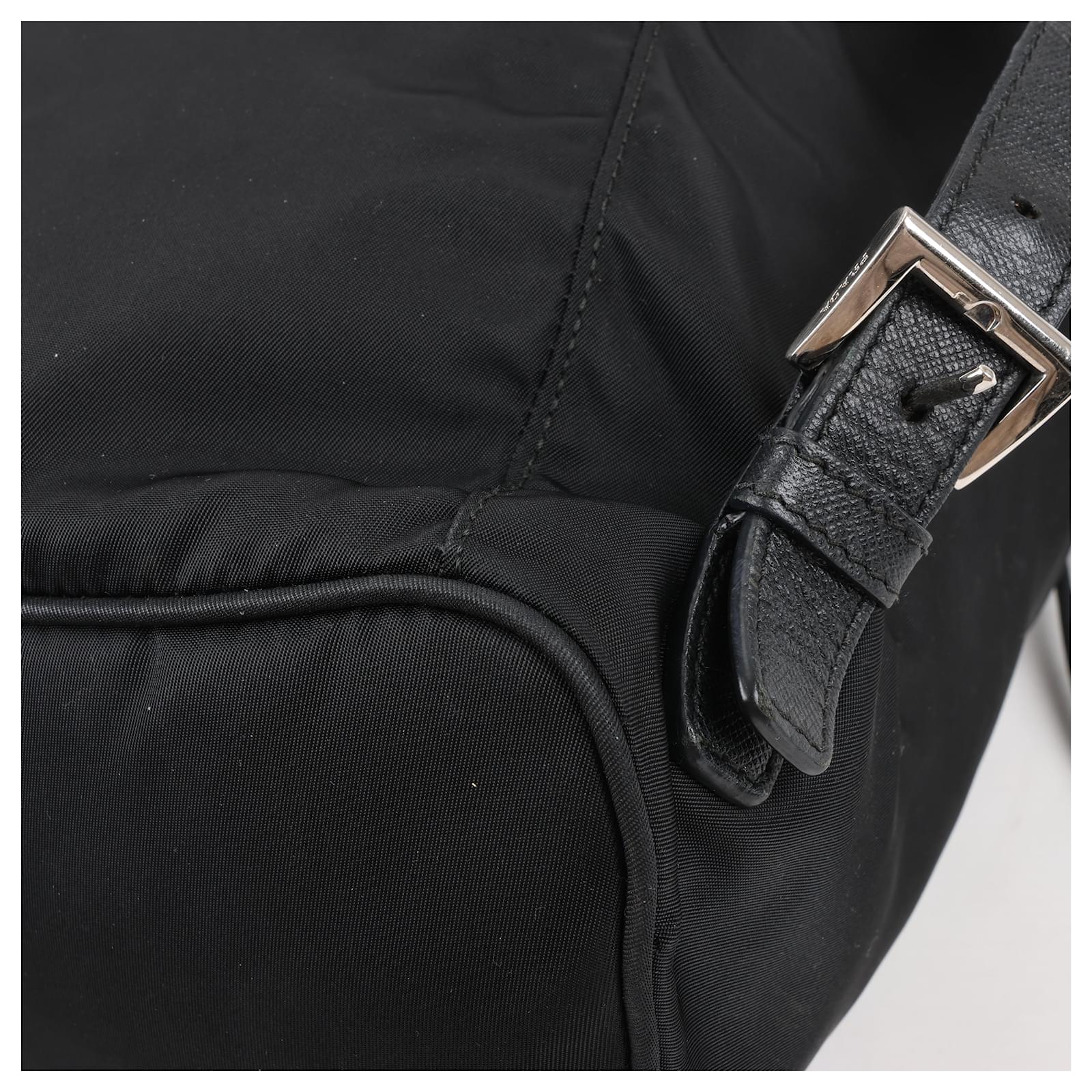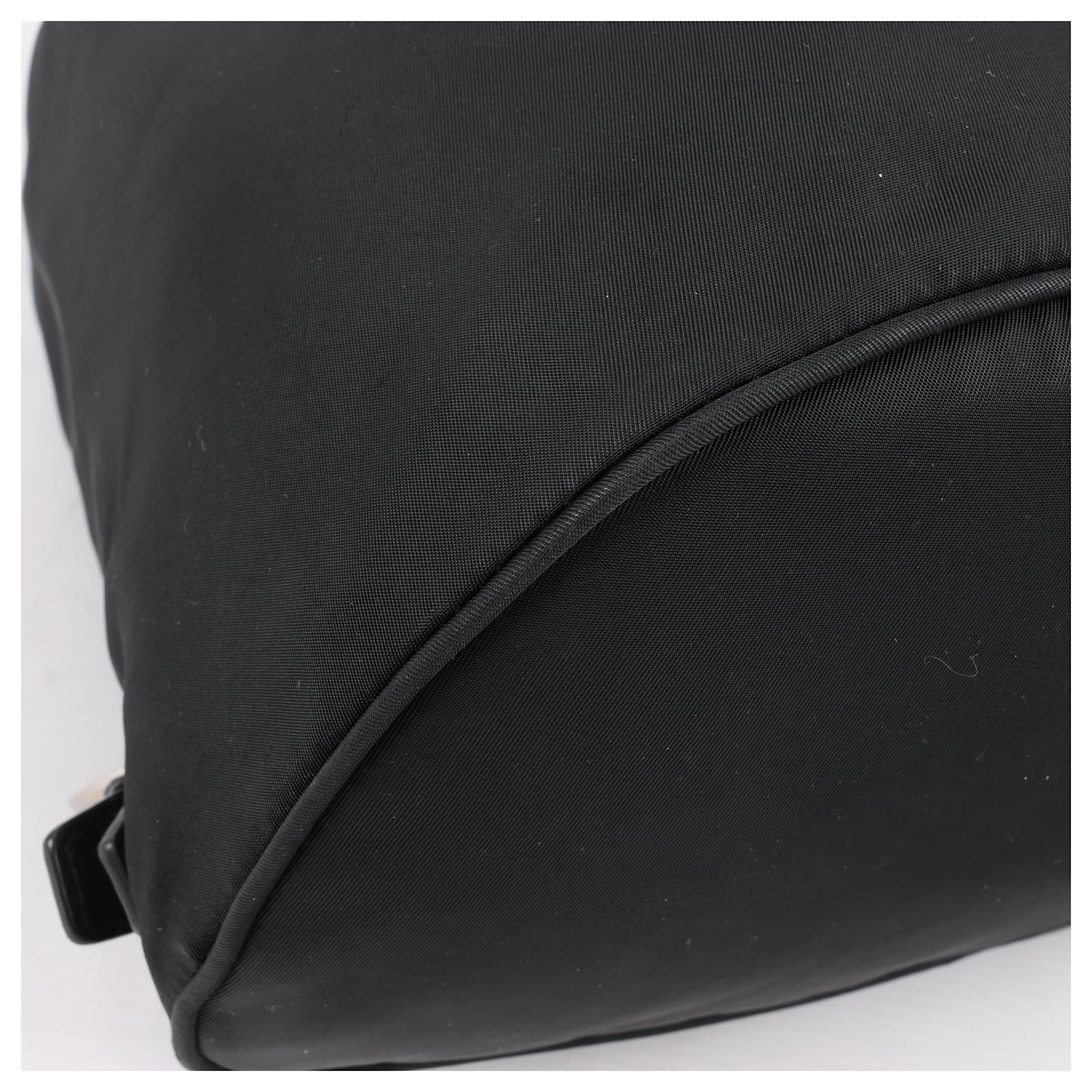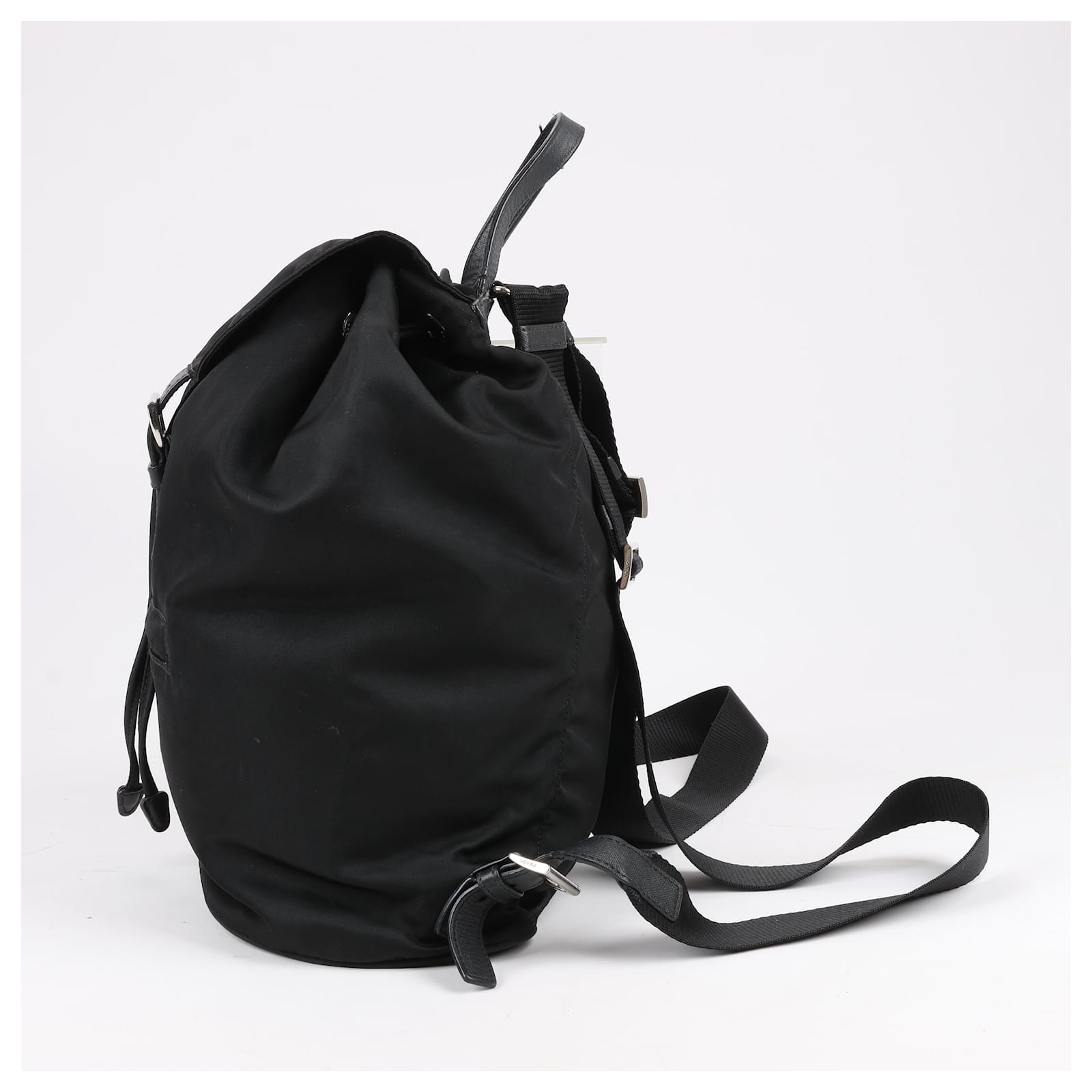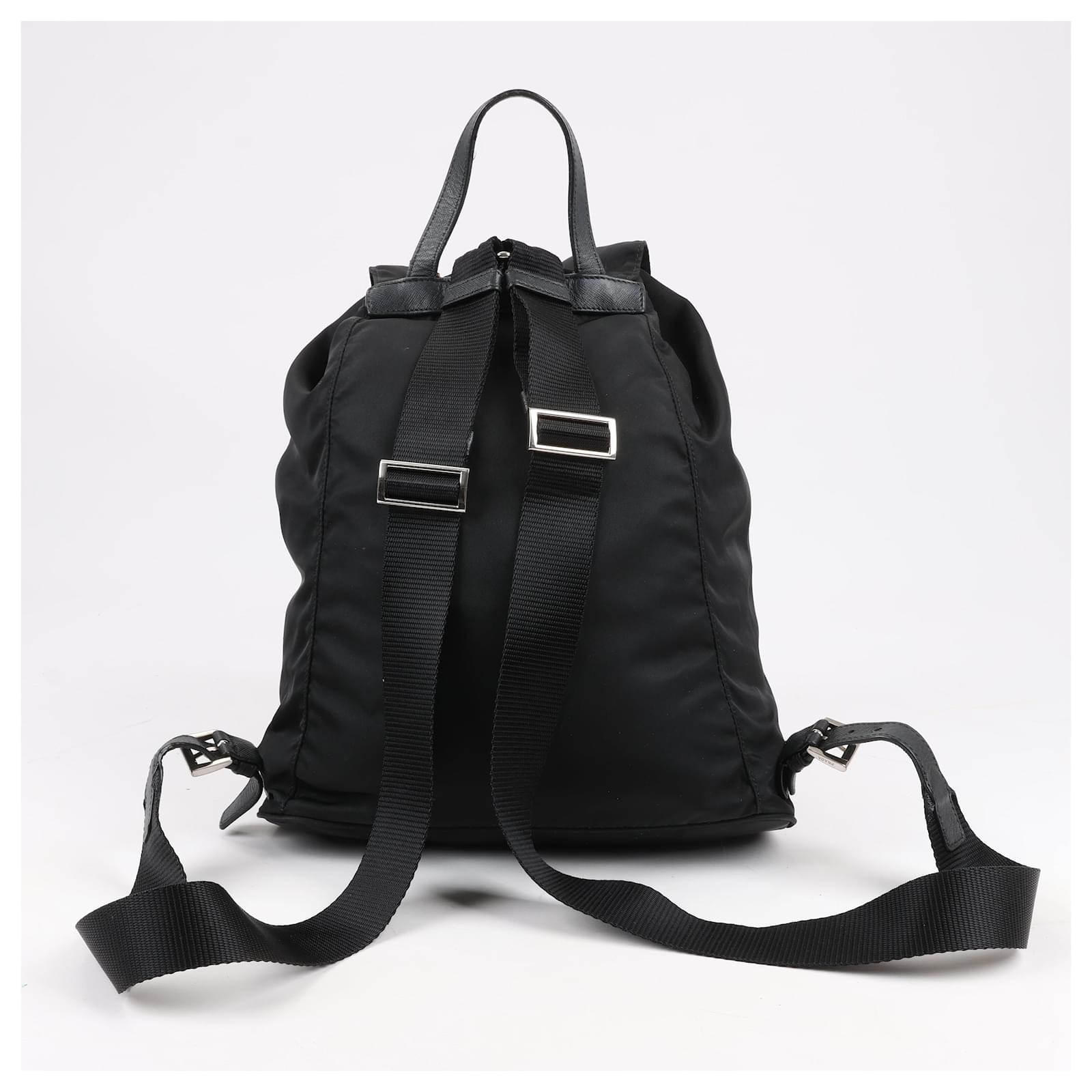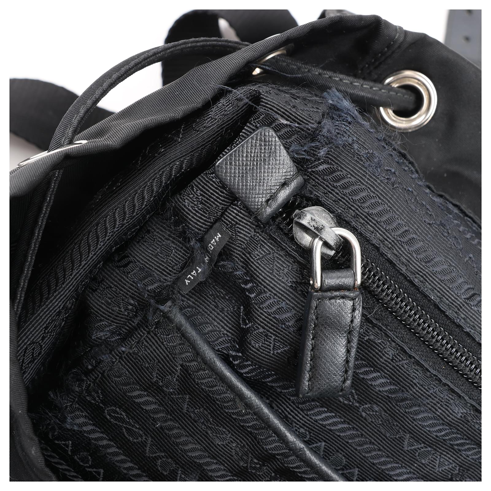 The Prada Tessuto Fabric x Leather Backpack in black is the perfect blend of\nluxury and functionality. Crafted from durable nylon with leather accents, it\nfeatures a drawstring closure, buckle flap, and iconic triangle logo. A stylish\nessential for everyday adventures.\nBrand: Prada\nModel: Tessuto \nSize: -\nWidth: 26 cm\nHeight: 36 cm\nExterior Condition: Excellent\nInterior Condition: Very good\nCondition Details: The exterior fabric is clean and beautiful. The leather trim\nhas some light crease, cracks. The hardware is bright and crisp with surface\nscratches. The interior is clean and in good condition, except usage rubbings. \nColour: Black\nInterior Colour: Black\nHardware Colour: Silver\nMaterial: Cloth, Leather\nComes With: –