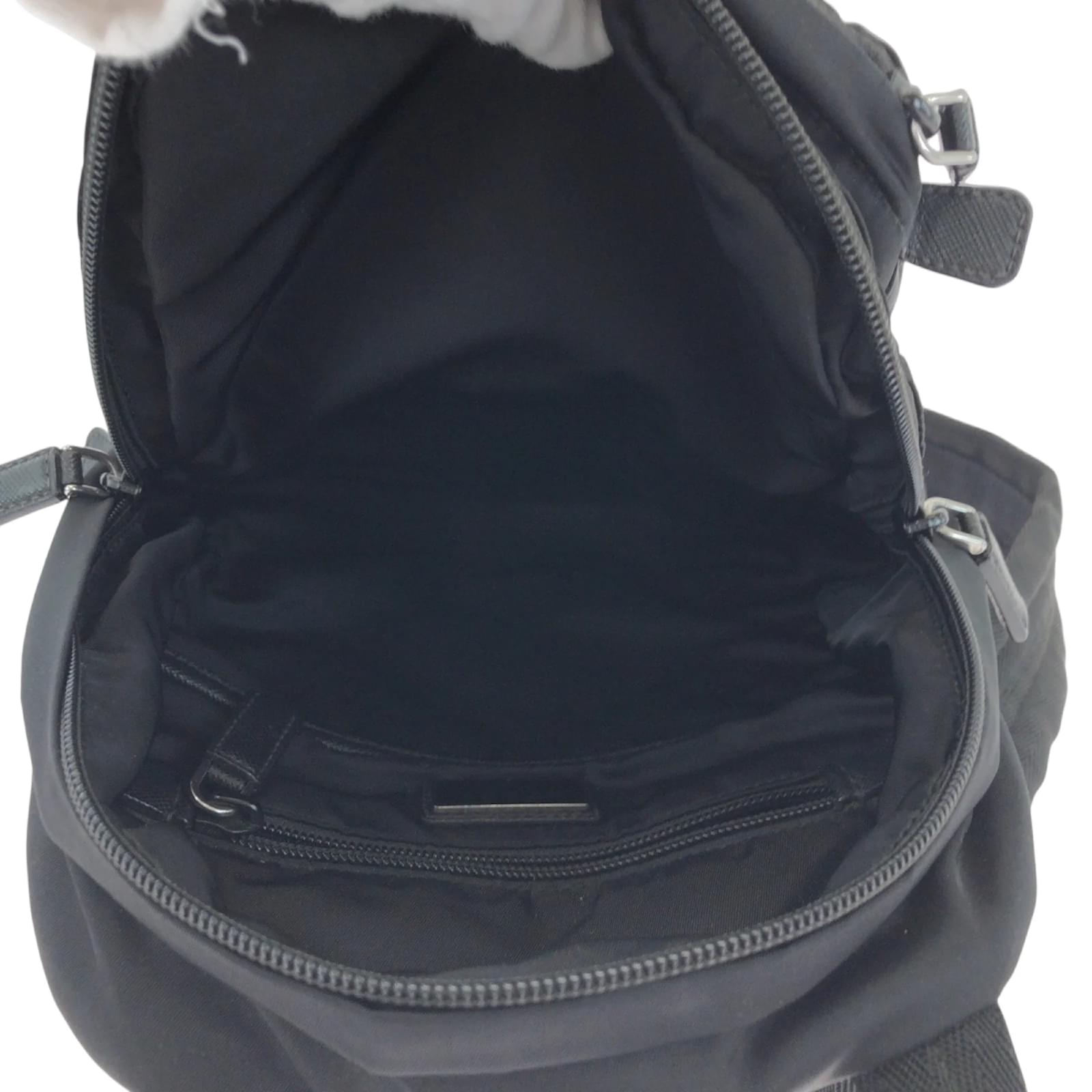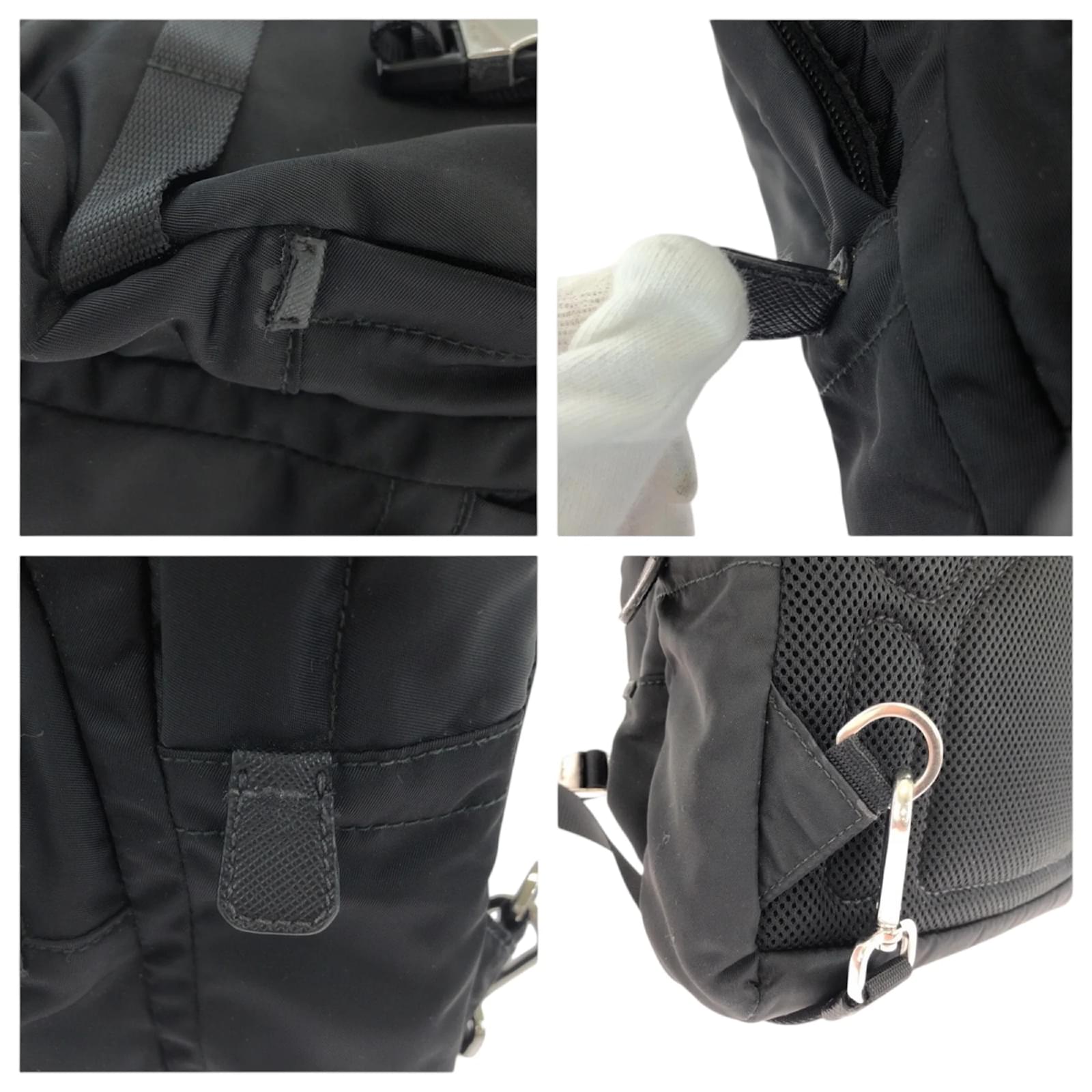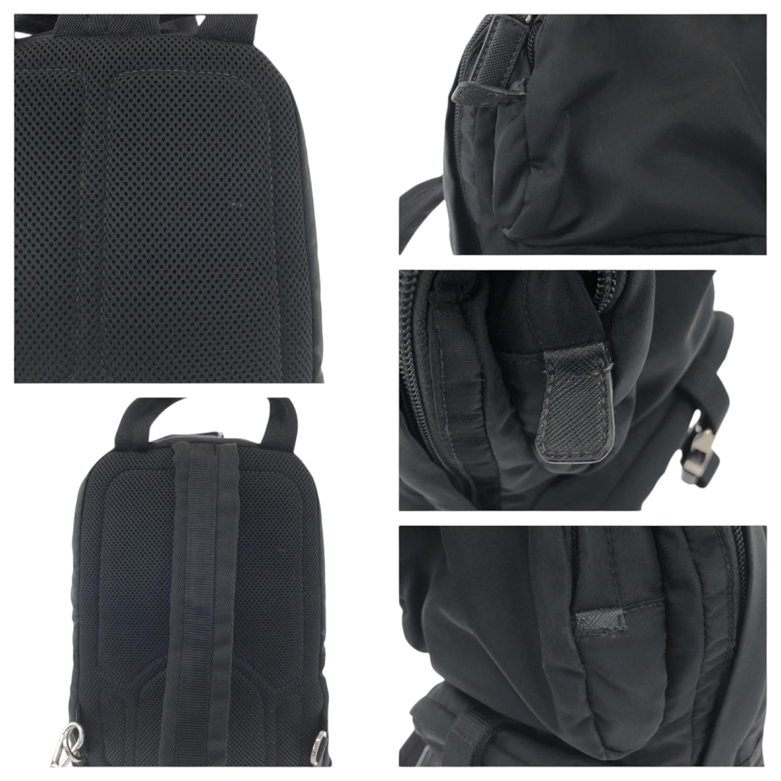 This Prada backpack features a sleek black nylon design complemented by silver hardware. Measuring 31cm x 21cm x 9cm, it is suitable for everyday use. The bag is categorized as used but remains in good condition, showing slight traces of usage, including minor scratches and dirt. The strap has a slight indication of wear. Please refer to the images for a detailed view of the item’s condition, as no additional accessories are included.