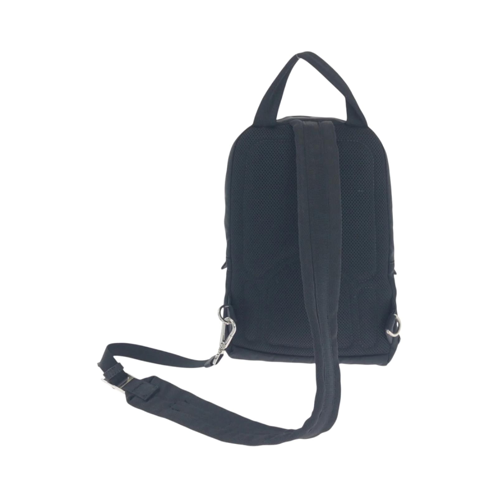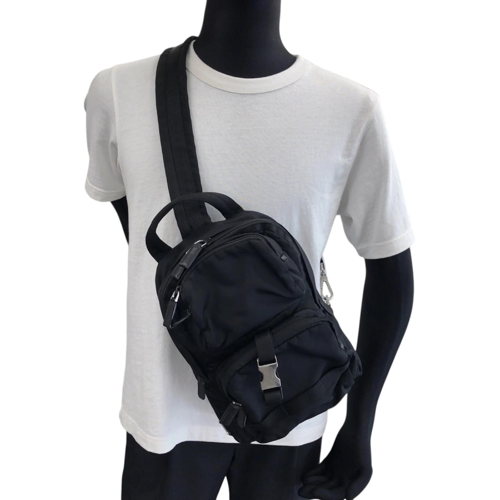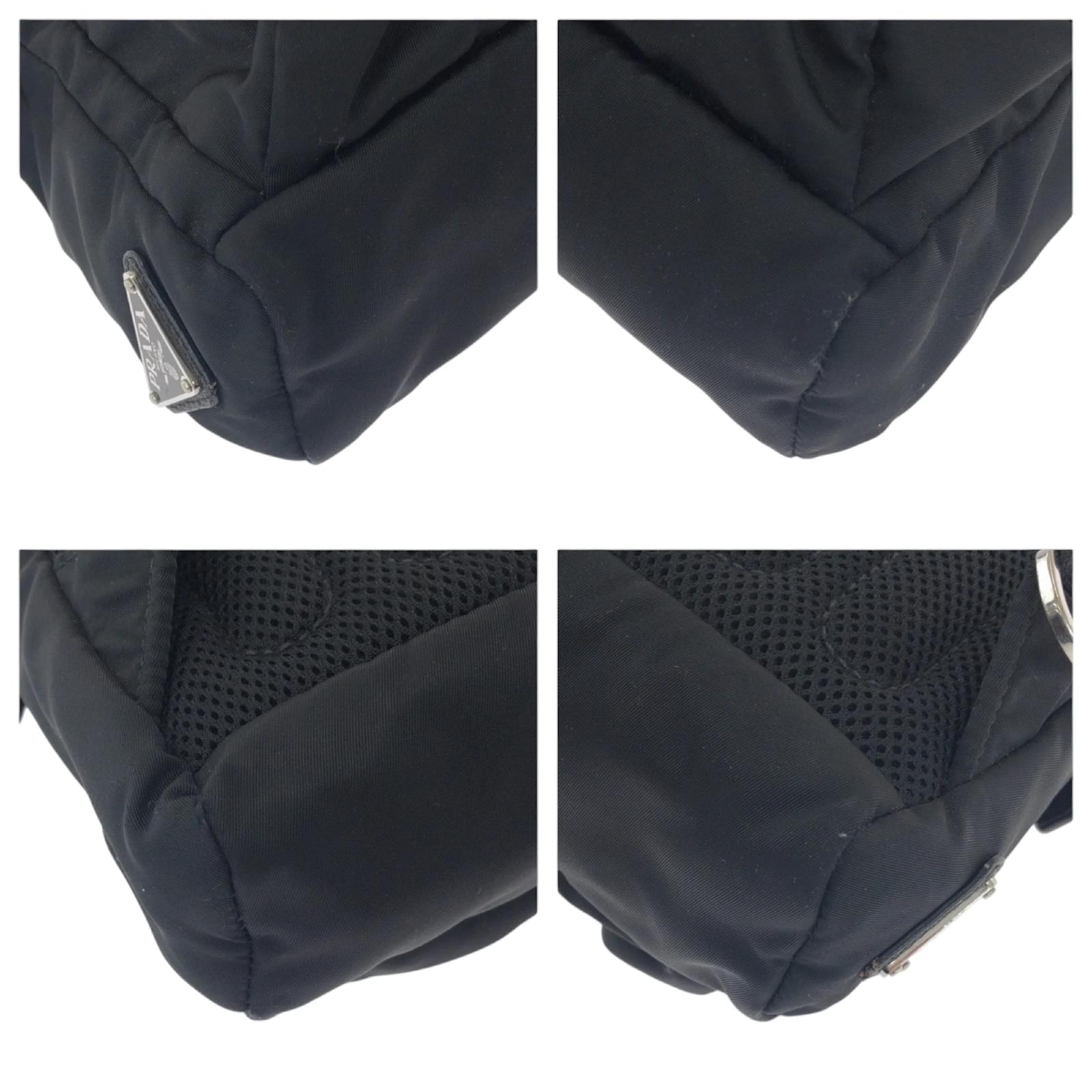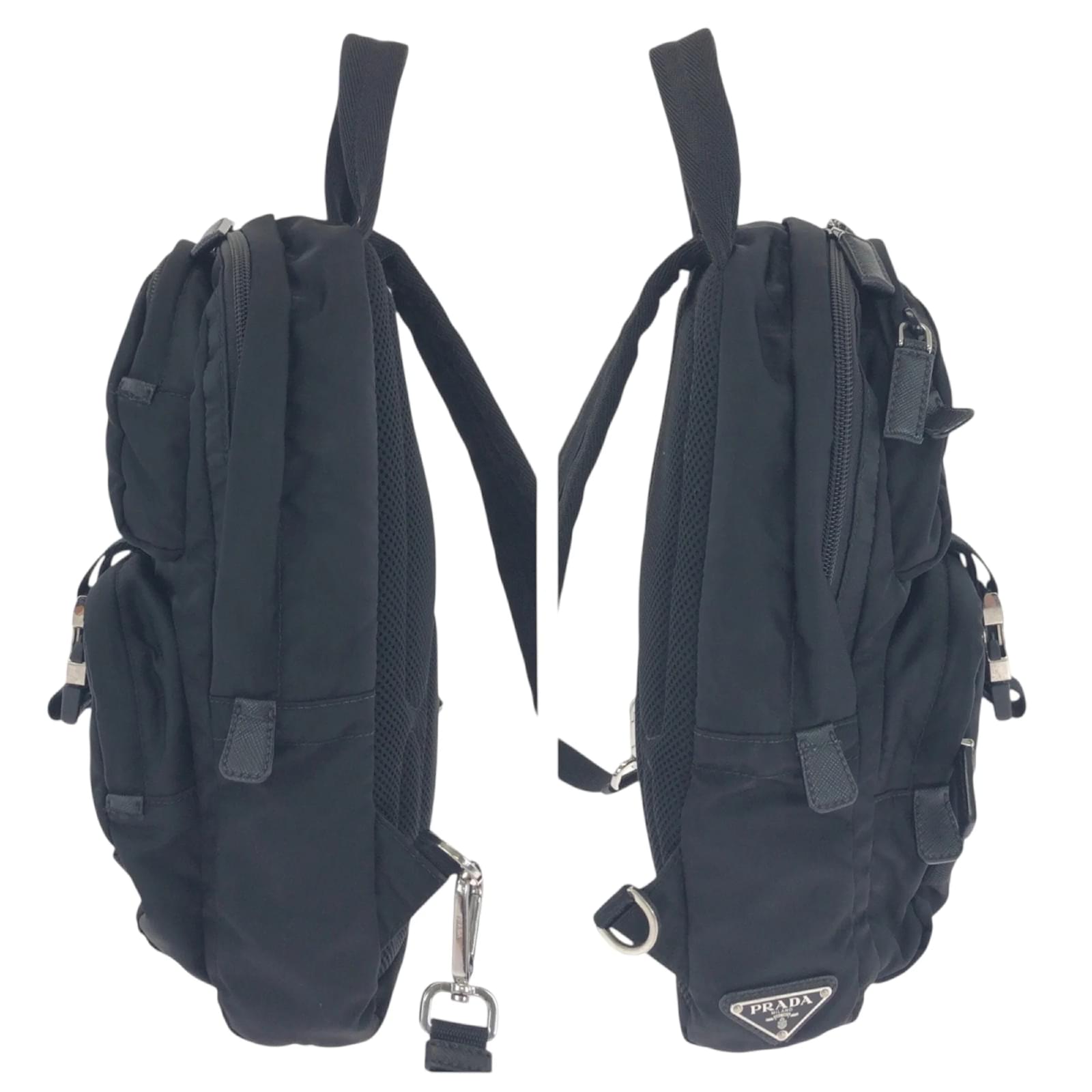 This Prada backpack features a sleek black nylon design complemented by silver hardware. Measuring 31cm x 21cm x 9cm, it is suitable for everyday use. The bag is categorized as used but remains in good condition, showing slight traces of usage, including minor scratches and dirt. The strap has a slight indication of wear. Please refer to the images for a detailed view of the item’s condition, as no additional accessories are included.
