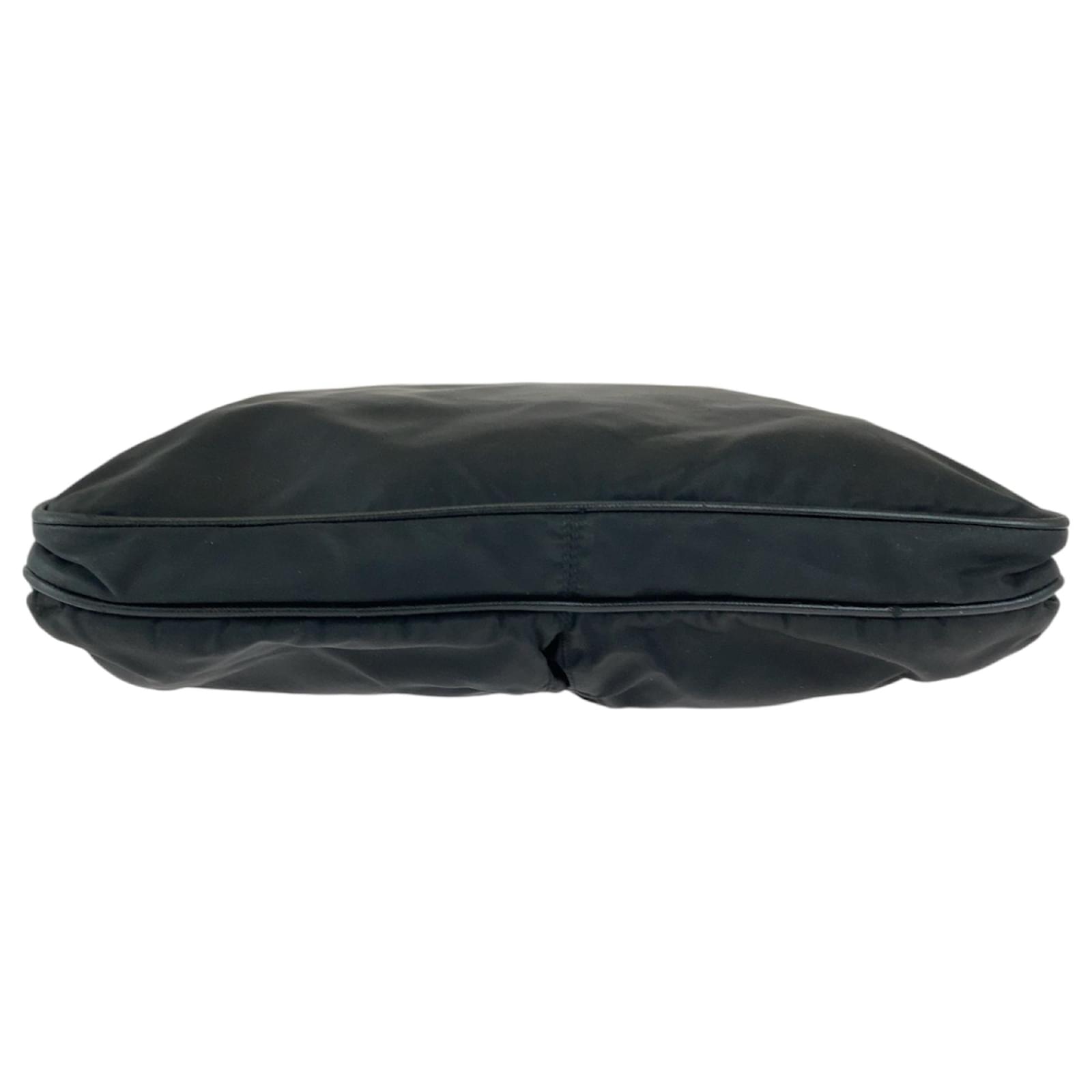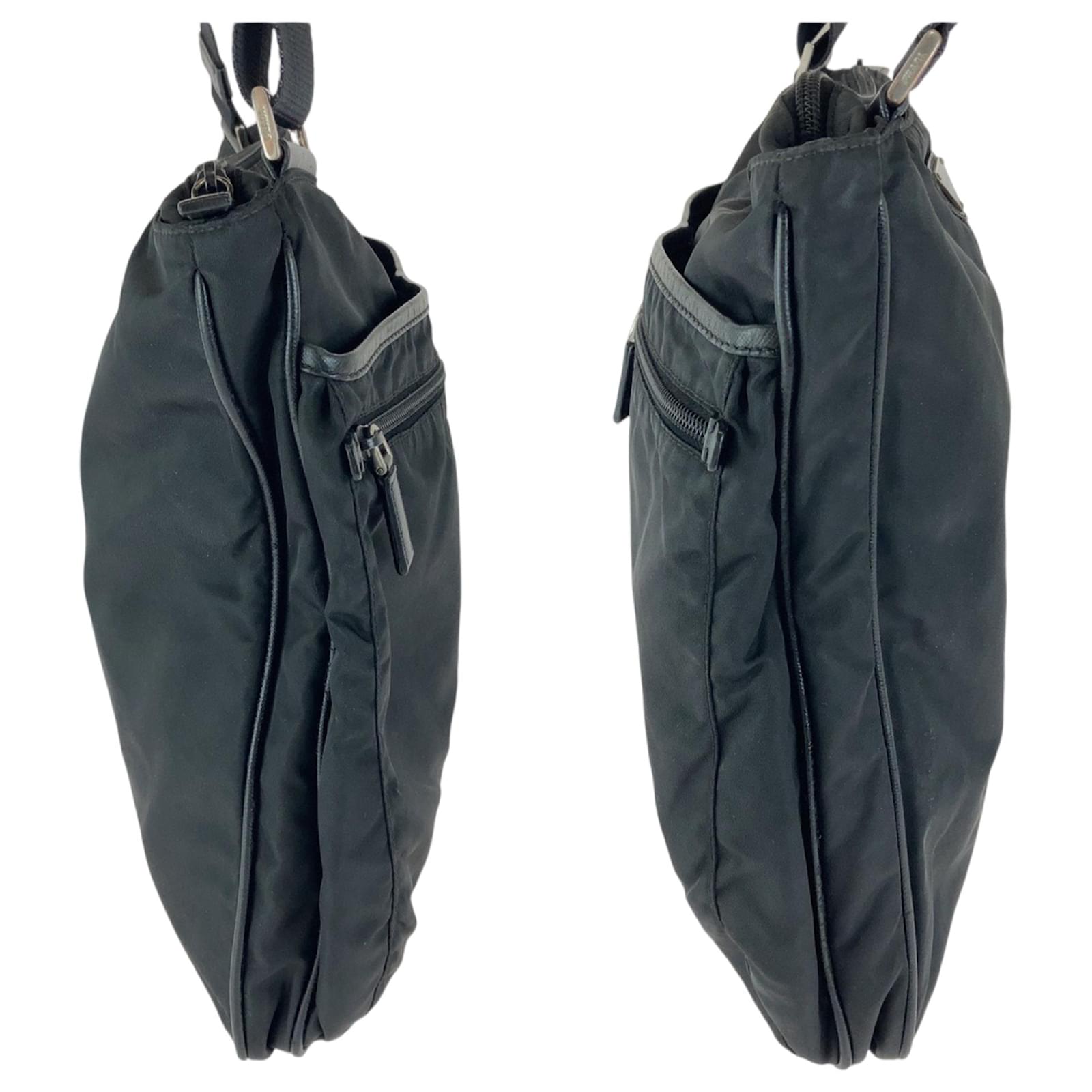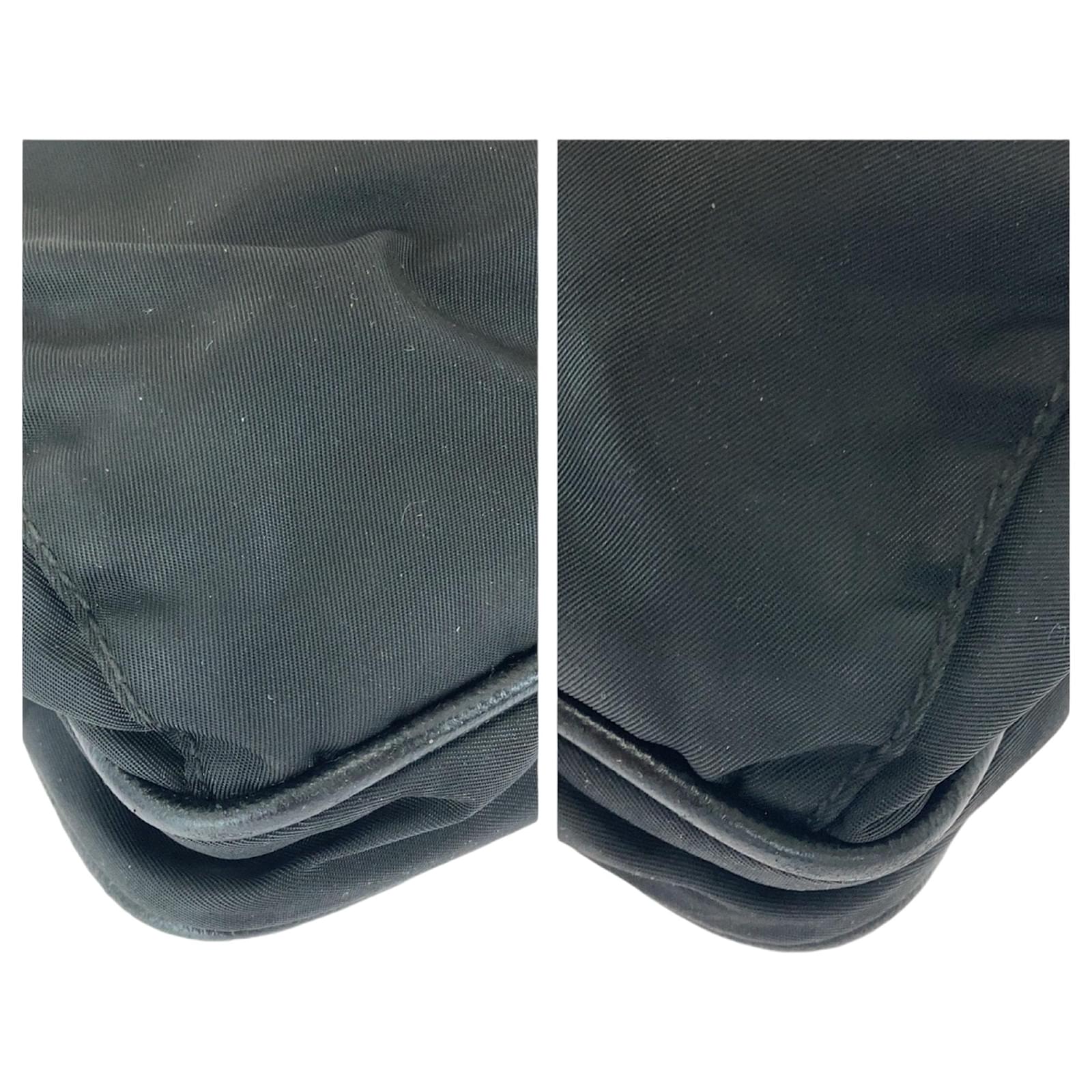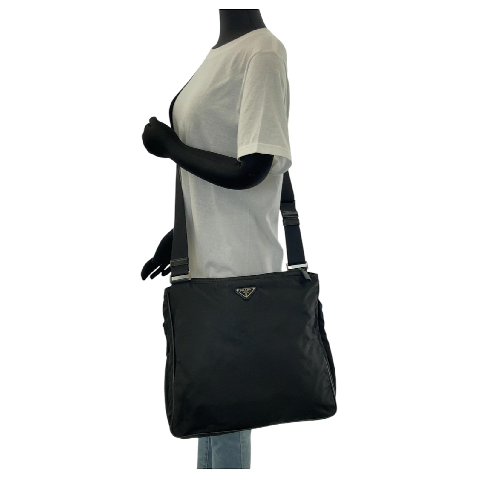 This Prada messenger bag is crafted from durable nylon in a classic black color, featuring silver hardware. It measures 30cm in height, 35cm in width, and 4cm in depth, making it a practical choice for everyday use. The bag is designed for versatility, functioning as both a messenger and shoulder bag. \n\nThe item is pre-owned and classified as being in good condition, with slight traces of use, including minor scratches and dirt. Potential buyers are encouraged to review the provided images for a clear understanding of the bag’s condition. No additional accessories are included with the purchase.