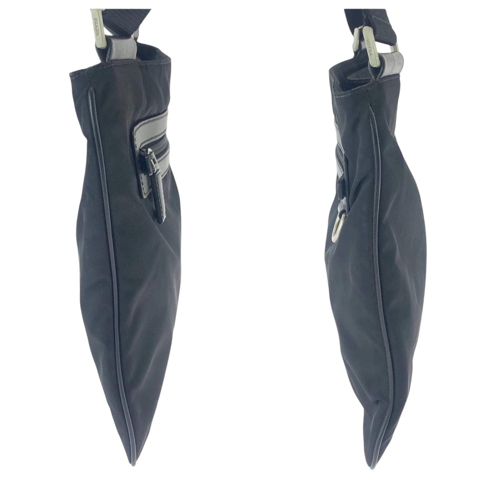 This Prada shoulder bag, crafted from durable nylon, features a sleek black design complemented by silver hardware. The bag measures 27cm x 30cm x 1.5cm, making it a practical choice for everyday use. It is categorized as a pochette and is suitable for men. \n\nThe item is in good used condition, classified as Rank AB, with slight traces of usage, including minor scratches and dirt. There is a slight rust on the hardware. Potential buyers are encouraged to review the provided images for a detailed view of the bag’s condition. No additional accessories are included with the purchase.