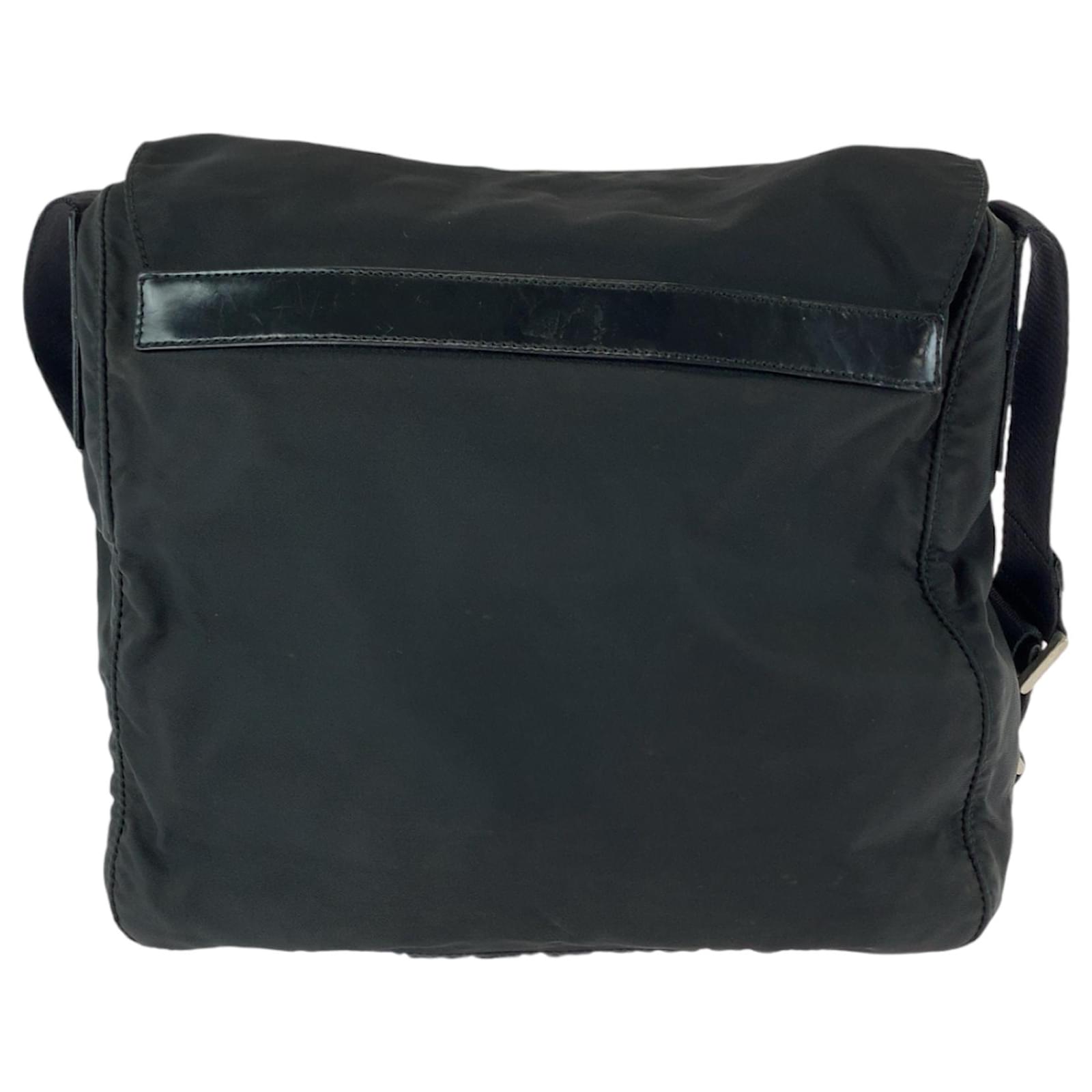 This Prada shoulder bag, known as the Tessuto Triangle Logo Plate, features a sleek black nylon design complemented by silver hardware. Measuring 21cm x 23cm x 9cm, it offers a compact yet functional size suitable for everyday use. The bag is classified as used but remains in good condition, showing slight traces of use, including minor scratches and dirt. It is important to review the provided images for a clear understanding of its condition. No additional accessories are included with this item.
