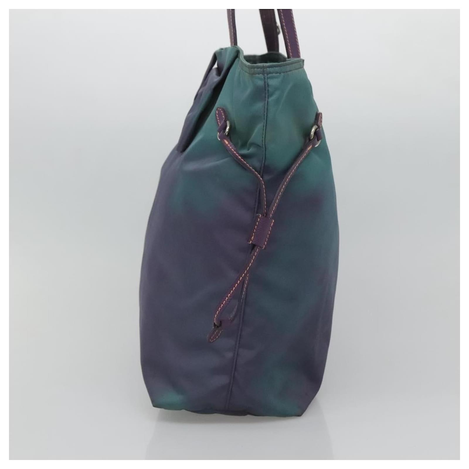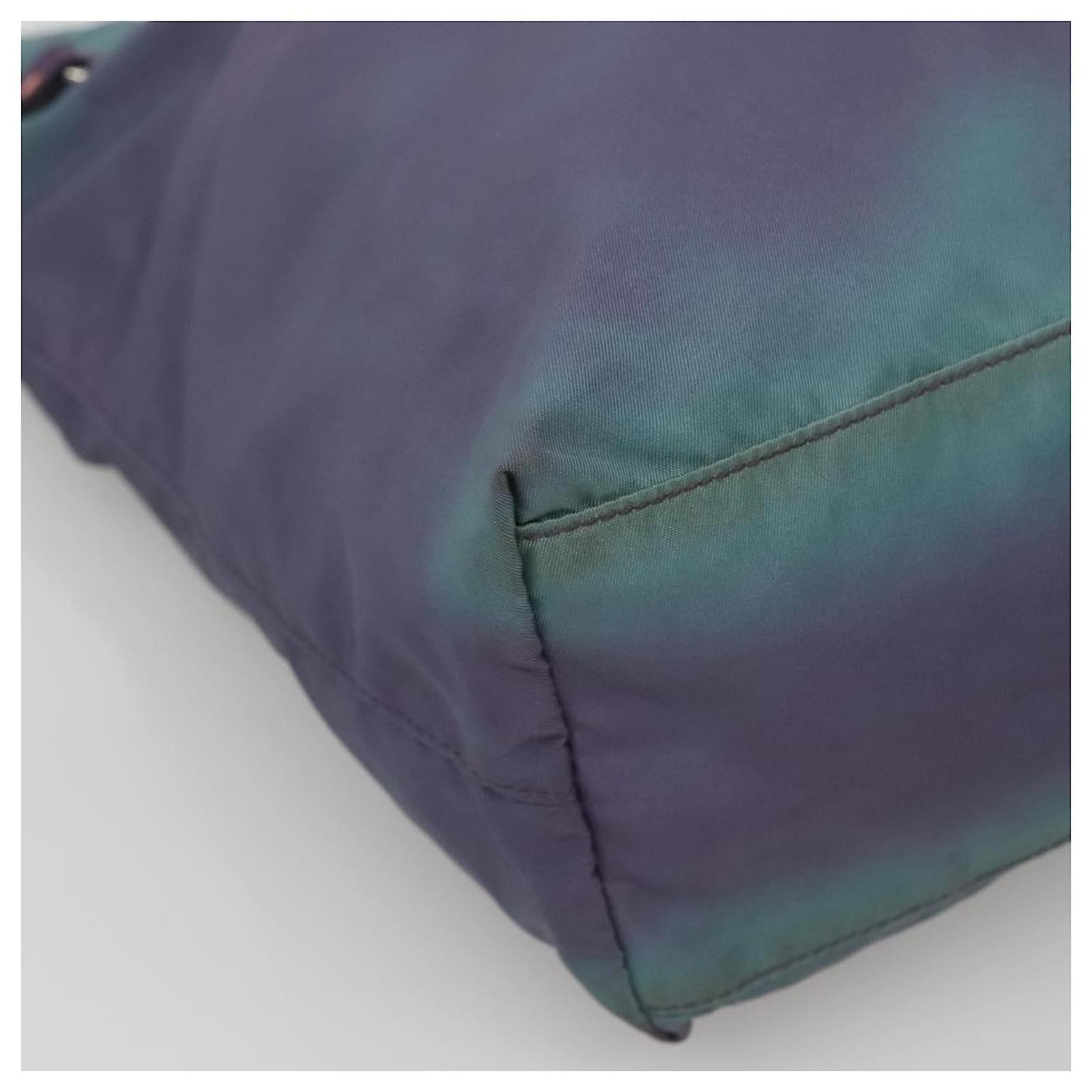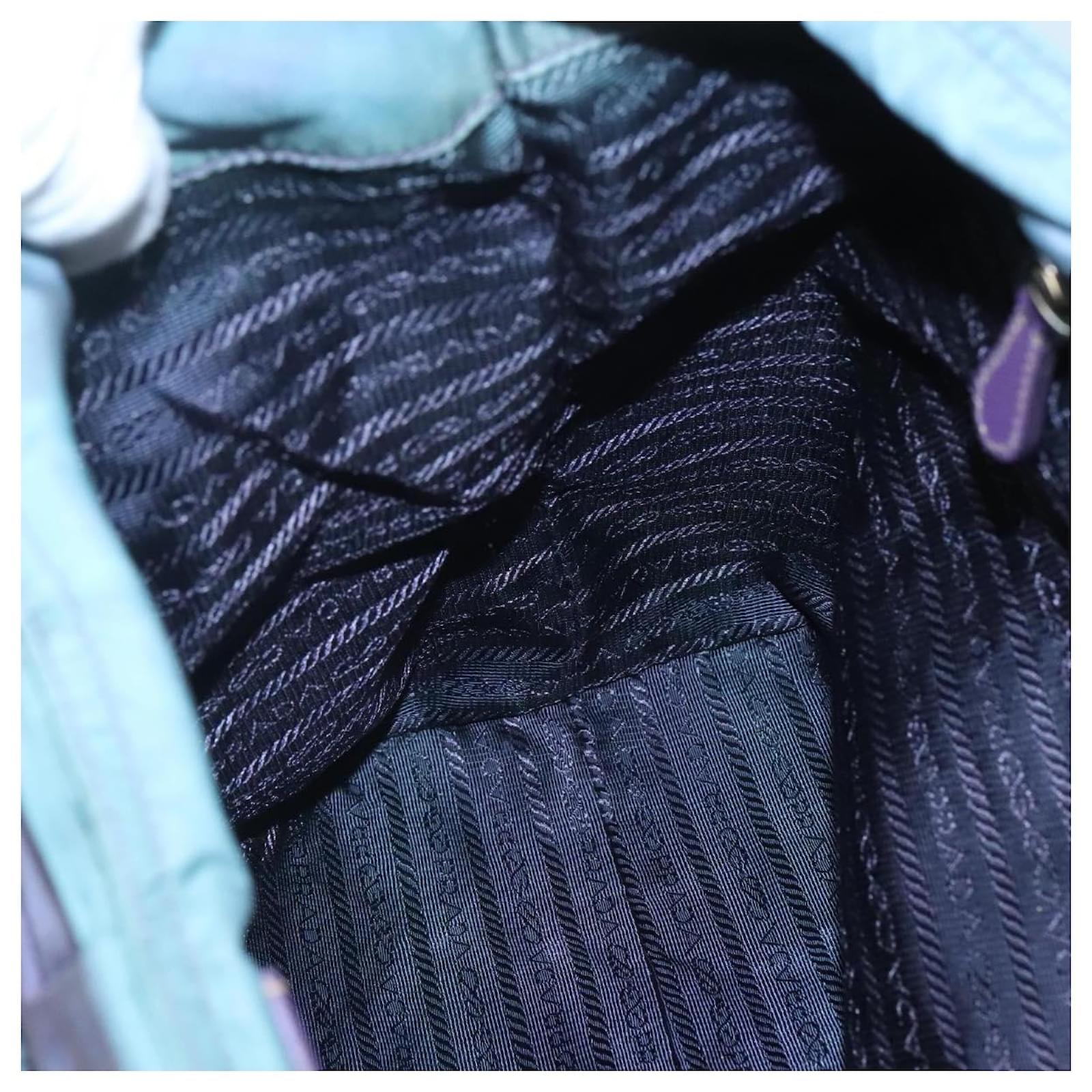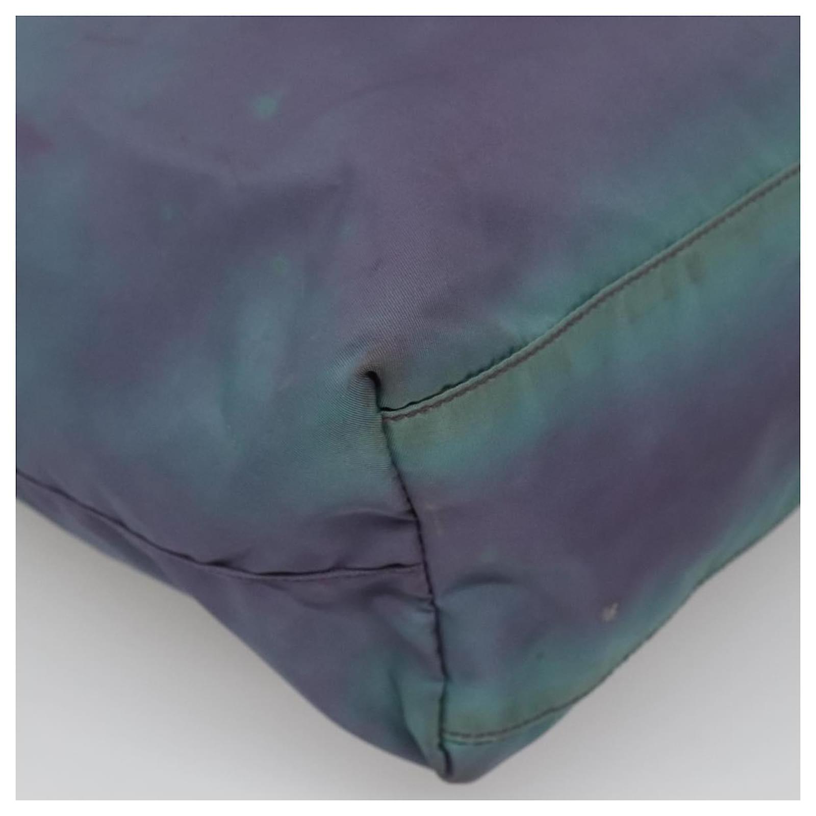 BRAND : PRADA\n Color : Turquoise Blue / Silver\n Material : Nylon \n Size(cm) : W31cm x H31cm x D11cm(Approx) / Handle Drop 21cm(Approx)\n Size(inch) : W12.2 x H12.2 x D4.3inch(Approx) / Handle Drop 8.3inch(Approx)\n Style : Tote Bag\n Accessory : There is no item box and dust bag. We will send only the item which is put in the photo.\n Product No. : -\n Serial No. : 25\n Made in : Italy\n RANK : C\n SKU : bs26897\n Condition : \n Outside : SurfaceFlose shape , rubbing , stain , lose color\n Metal fittingsFscratches\n Inside : rubbing , stain\n Pocket : rubbing , slight stain\n Corners : rubbing\n Odor : There is keeping(storage) smell.\n Other Remarks : –