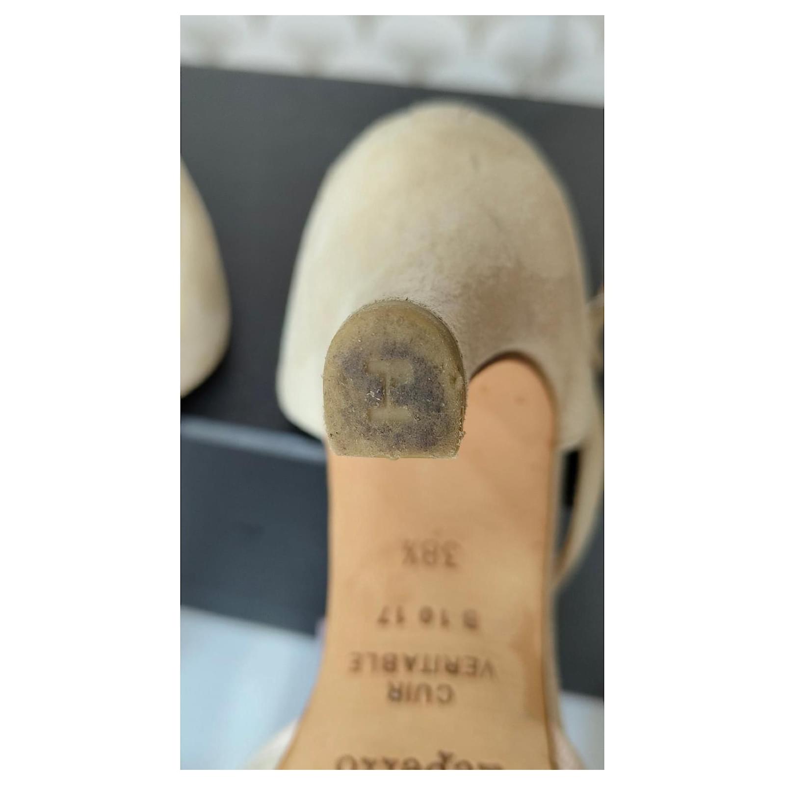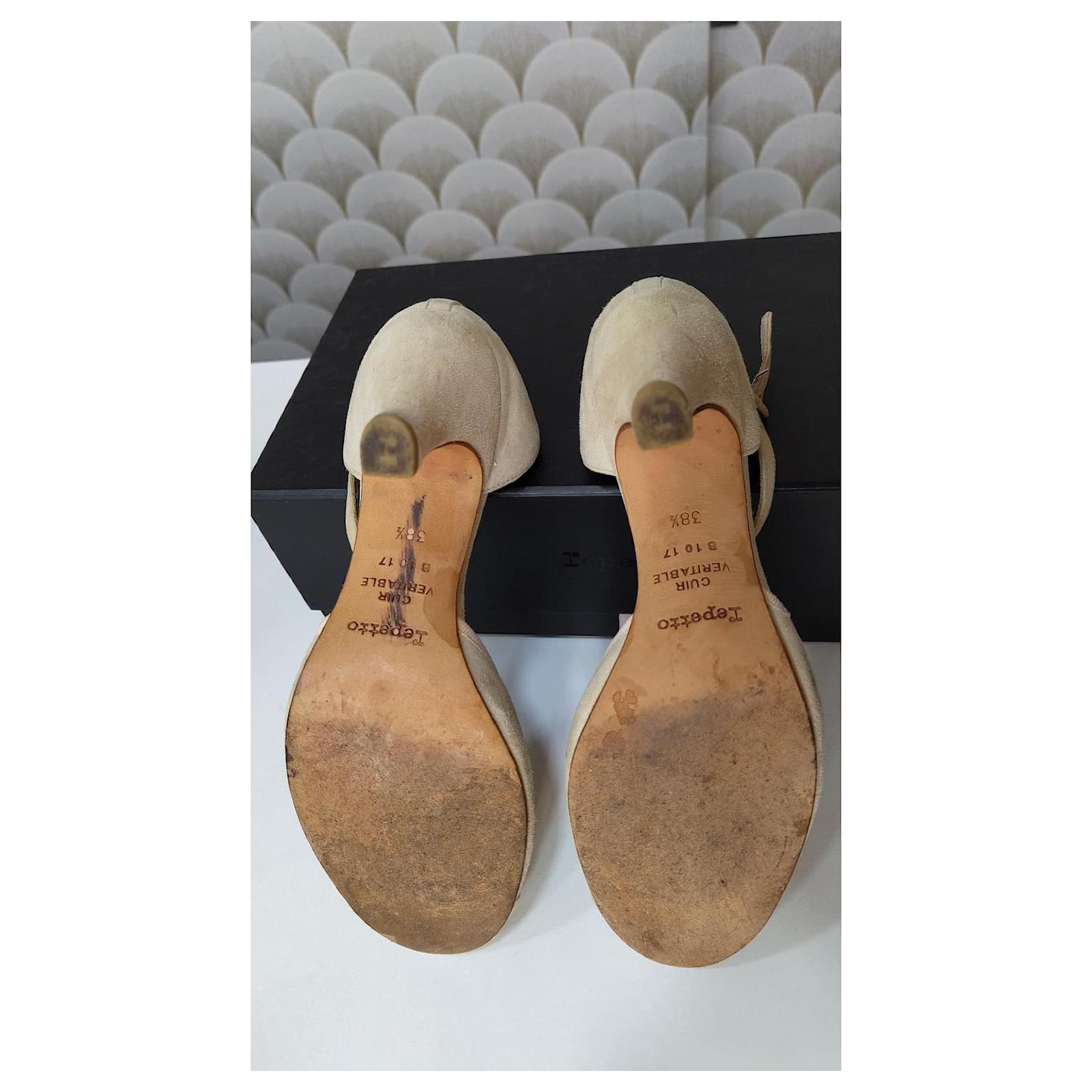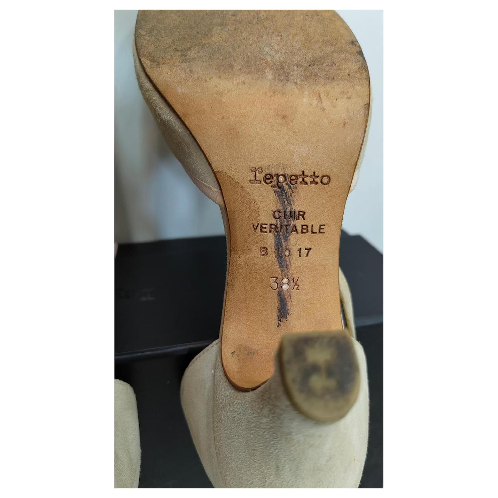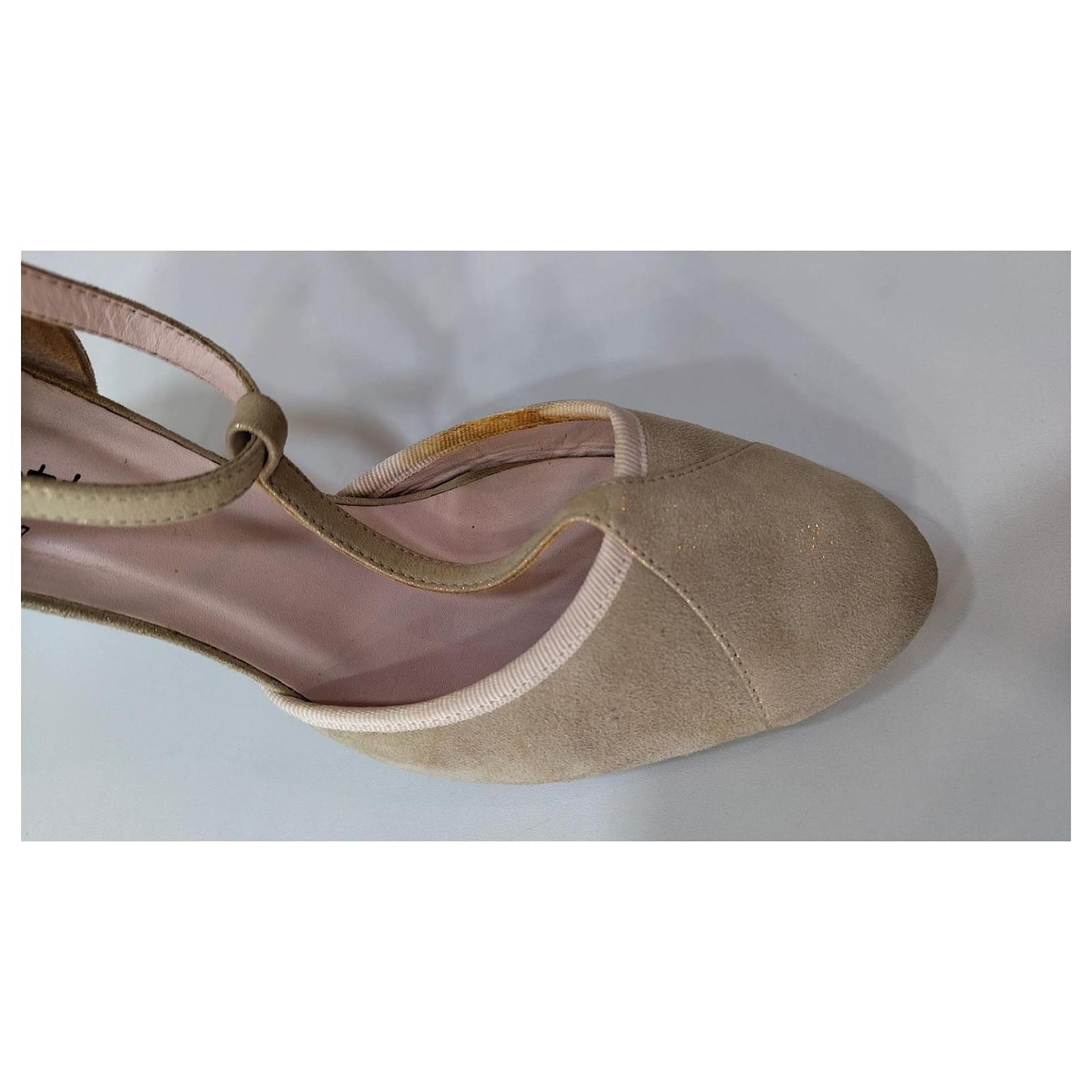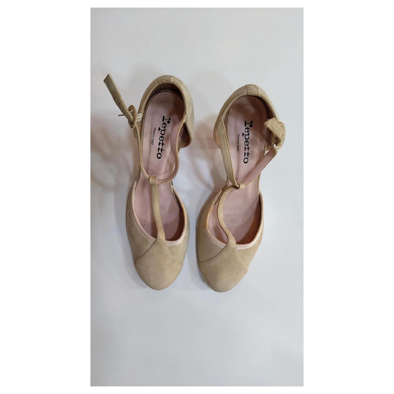 Brand: Repetto\nModel: T-Strap Heels\nColor: Beige Gold / Champagne\nMaterial: Suede with slight iridescent reflections – Leather lining\nHeel height: Approximately 8 cm\nSize: 38.5 EU\n\nCondition: Good condition\n\nSoles in good condition, a few slight visible stains, see photos\n\nNo visible scuffs or stains\n\nSold with the original box\n\nRemarks:\nA chic and feminine model, perfect for formal occasions or dressed-up outfits. The neutral and refined color adapts to many outfits.