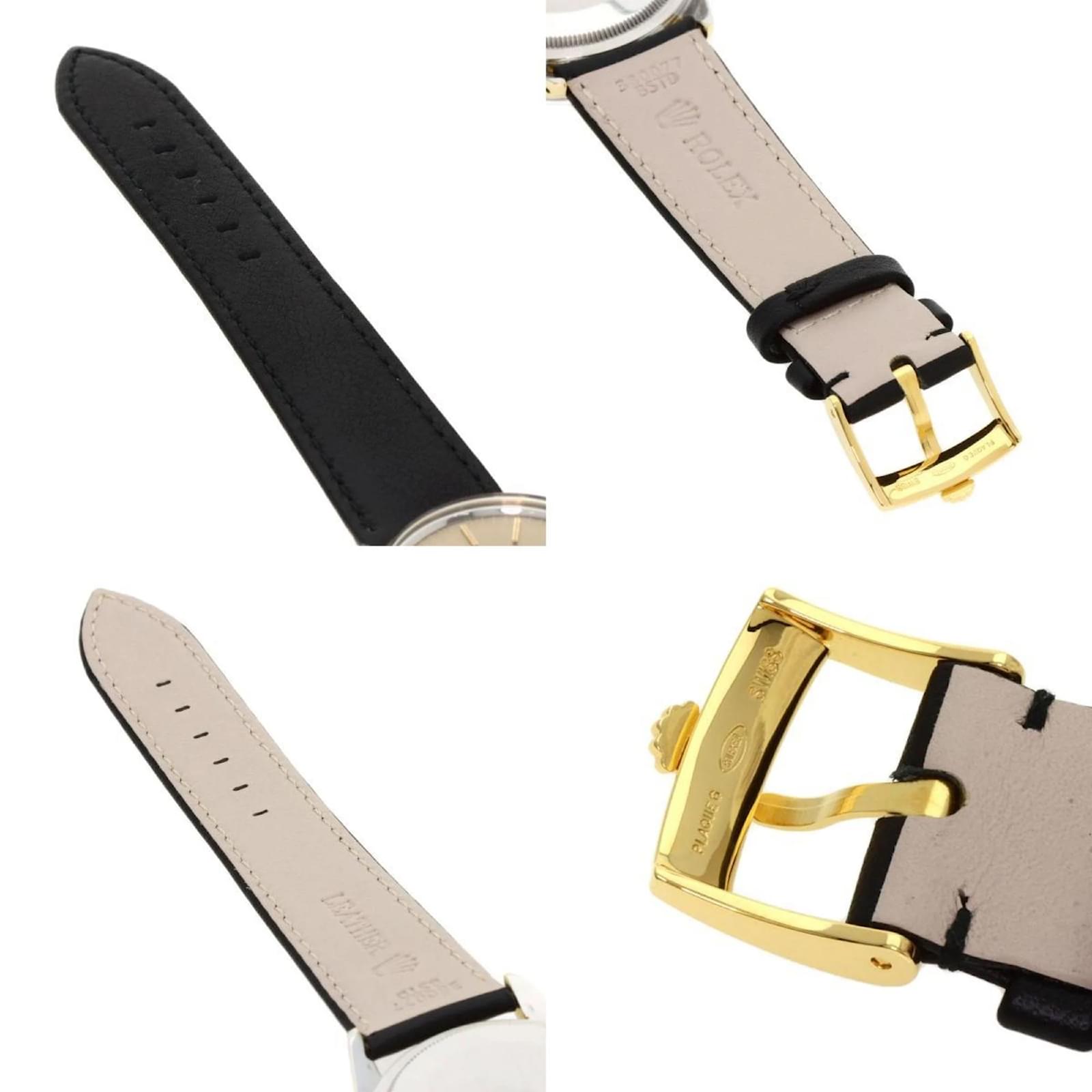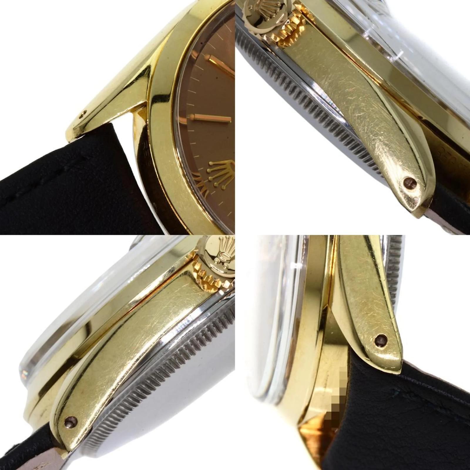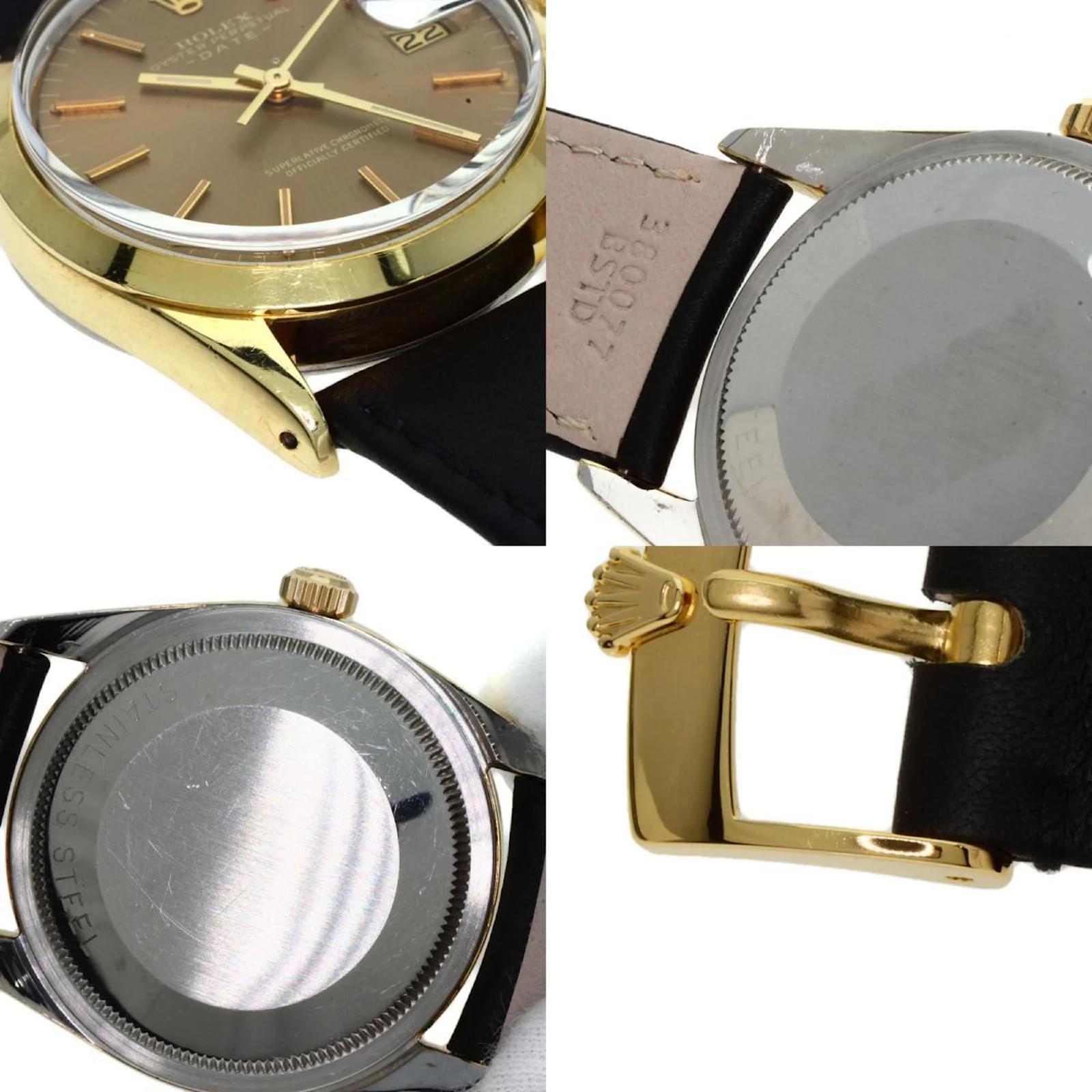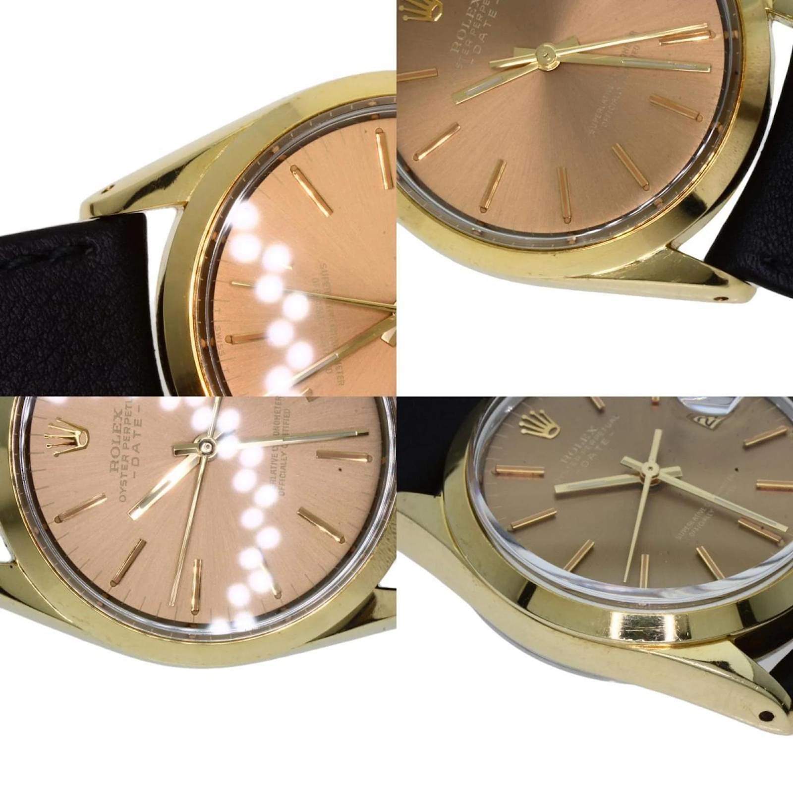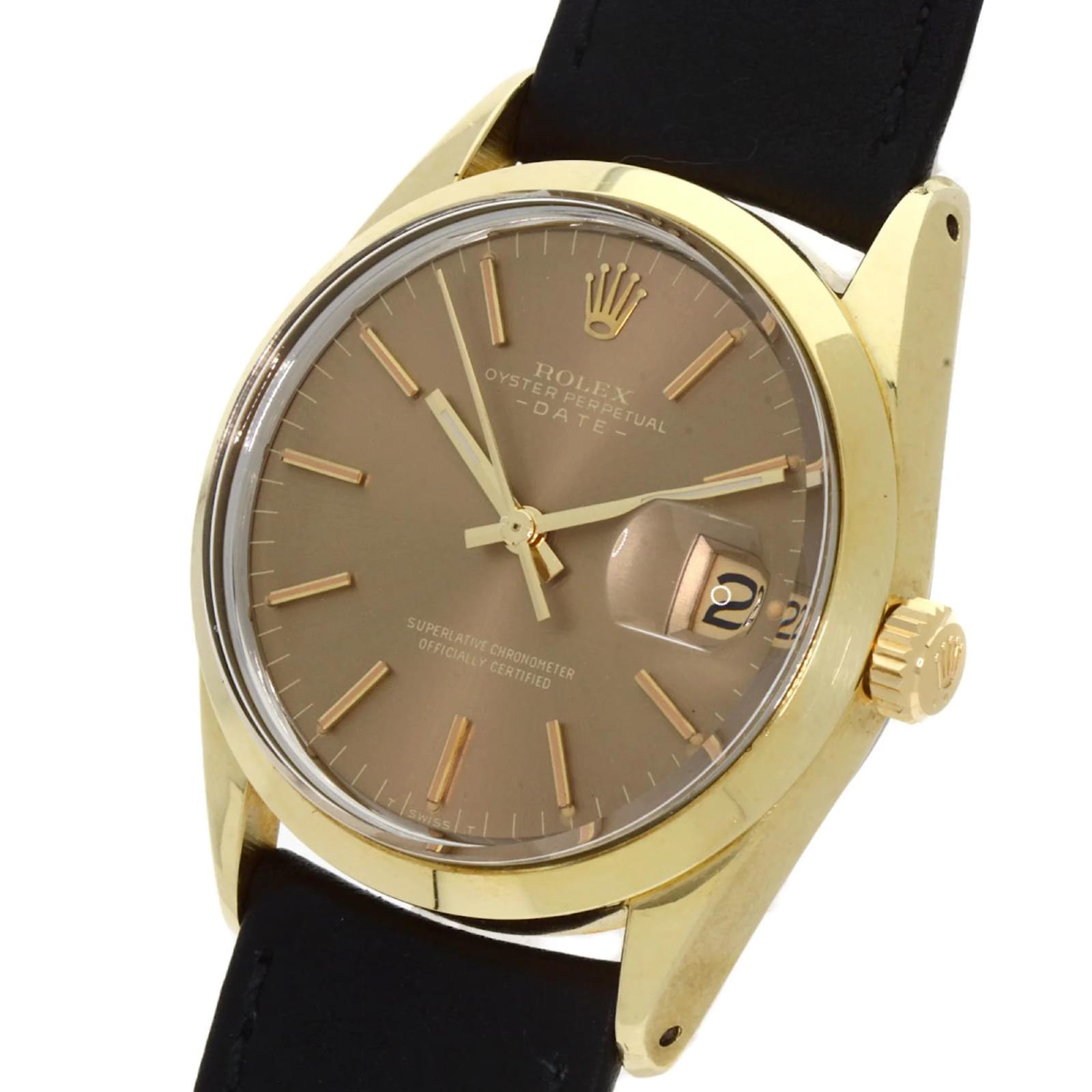 The Rolex 1550 Oyster Perpetual is a men’s wristwatch from 1970, featuring a gold-plated case and a leather band. This self-winding automatic watch has a case diameter of 33mm, suitable for wrist sizes ranging from 14.5cm to 18cm. The watch is classified as used but remains in very good condition, with moderate scratches on the bezel, case, and bracelet, while the glass shows slight scratches. The dial is free from any scratches or deterioration. It is important to review the provided images for a detailed view of the watch’s condition and included accessories.