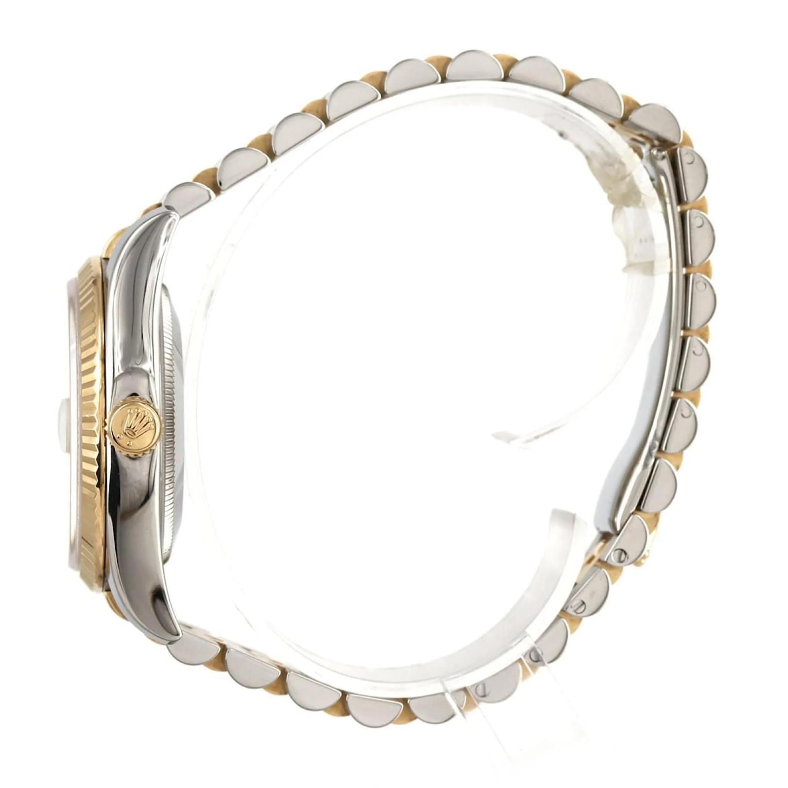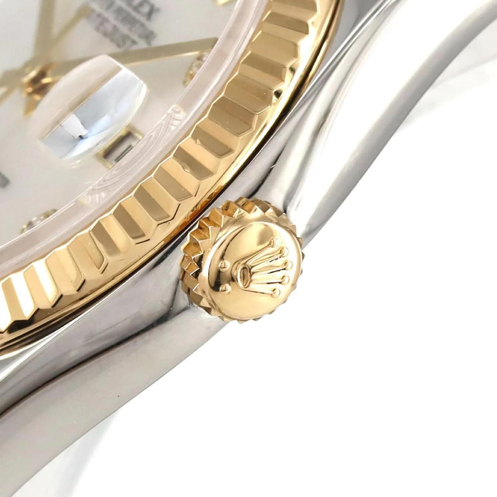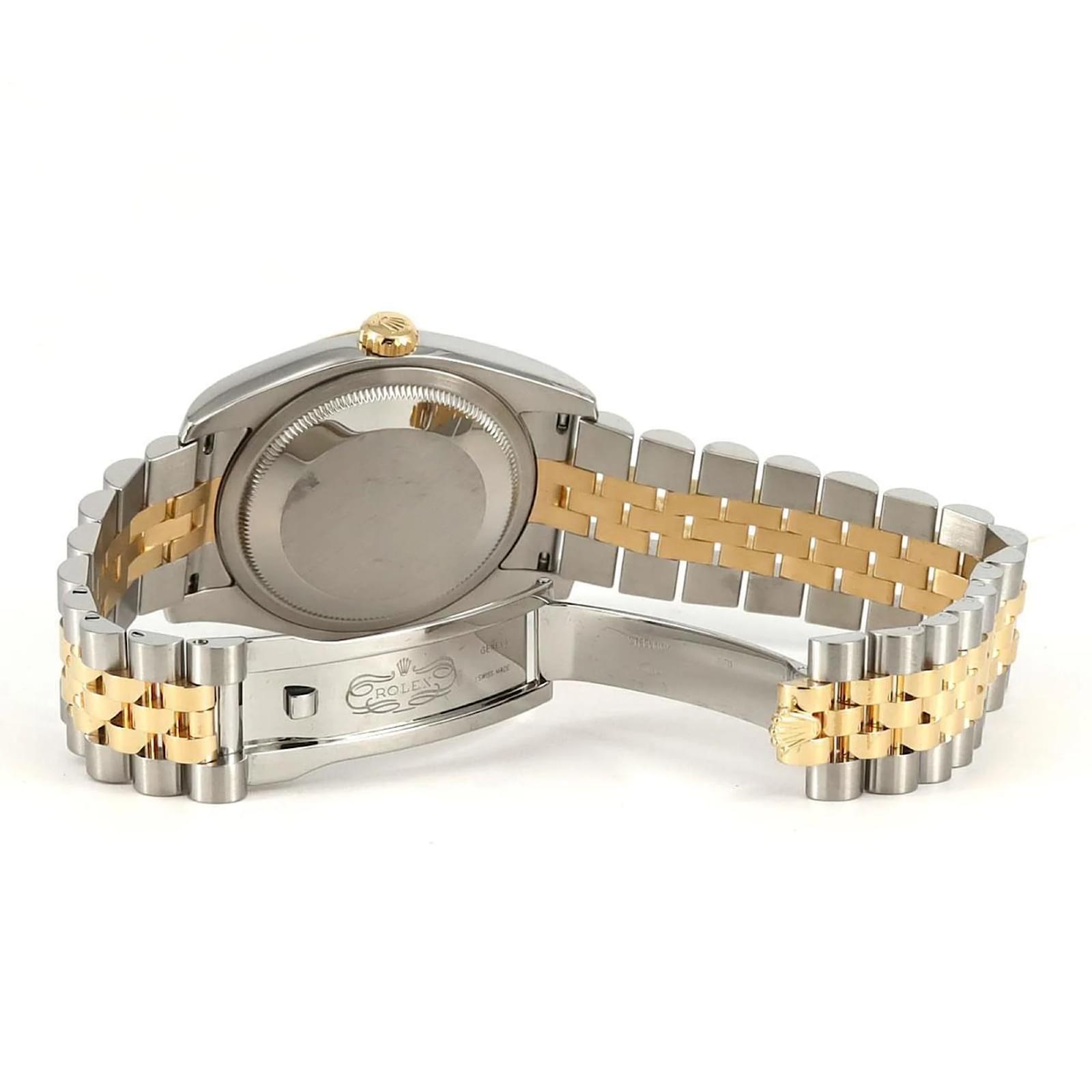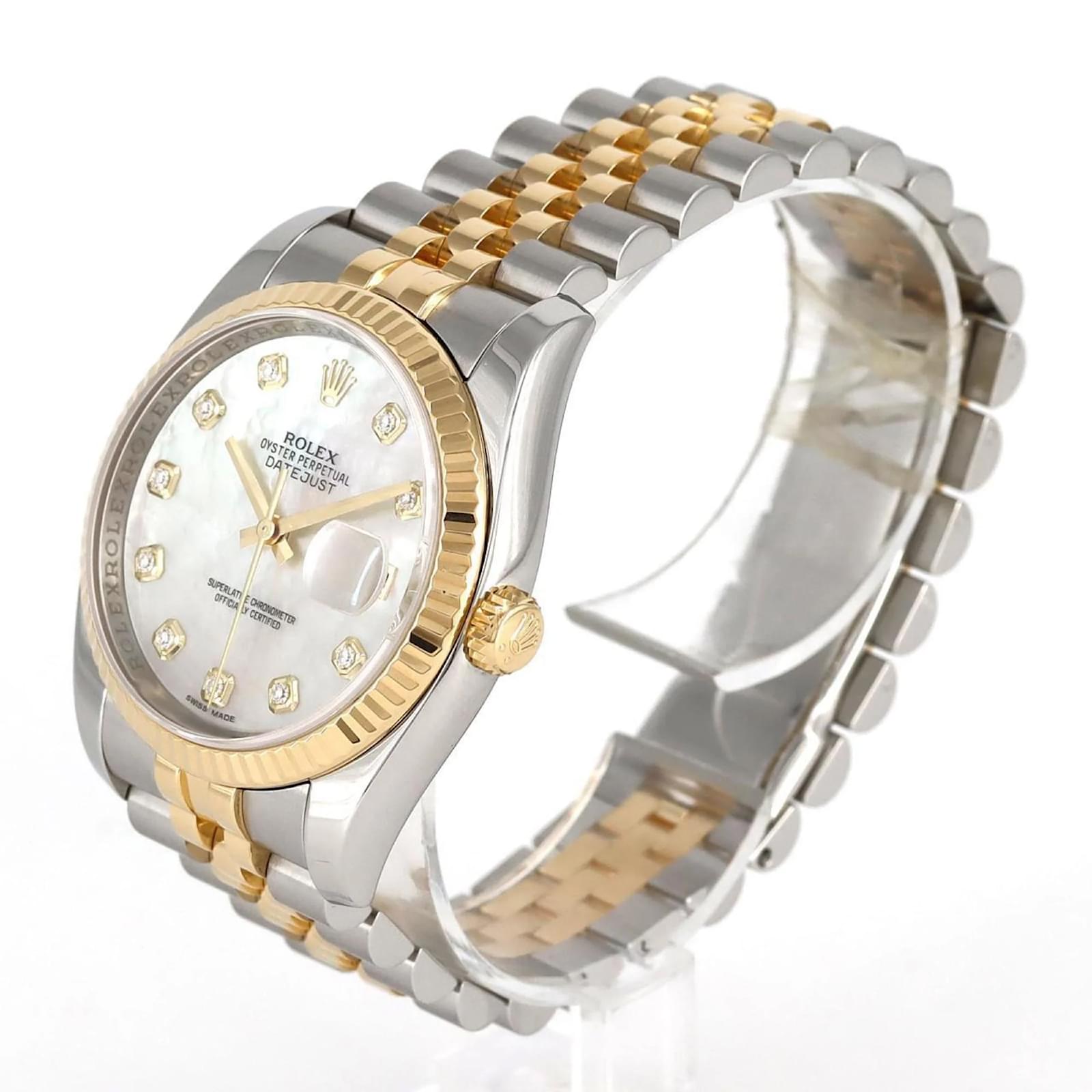 The Rolex Datejust 116233NG is a sophisticated wristwatch that features a mother of pearl dial and is crafted from a combination of stainless steel and yellow gold. This automatic timepiece is designed for an 18.5cm wrist size and has a case diameter of 36mm. It is adorned with diamond accents and showcases an analog display. \n\nThis particular watch is in very good used condition, with slight scratches on the bezel, case, and bracelet, while the glass and dial show insignificant signs of wear. The watch has been polished and maintained, ensuring its functionality and aesthetic appeal. \n\nIncluded with the watch are the inner and outer boxes, along with a warranty. Potential buyers are encouraged to review the images for a detailed view of the watch’s condition and included accessories.