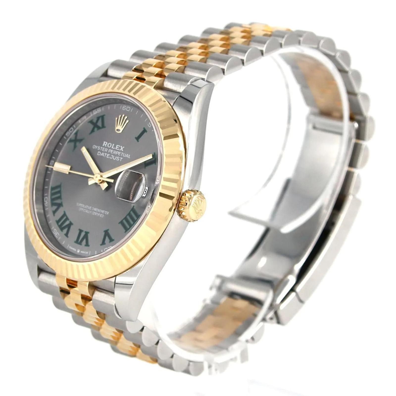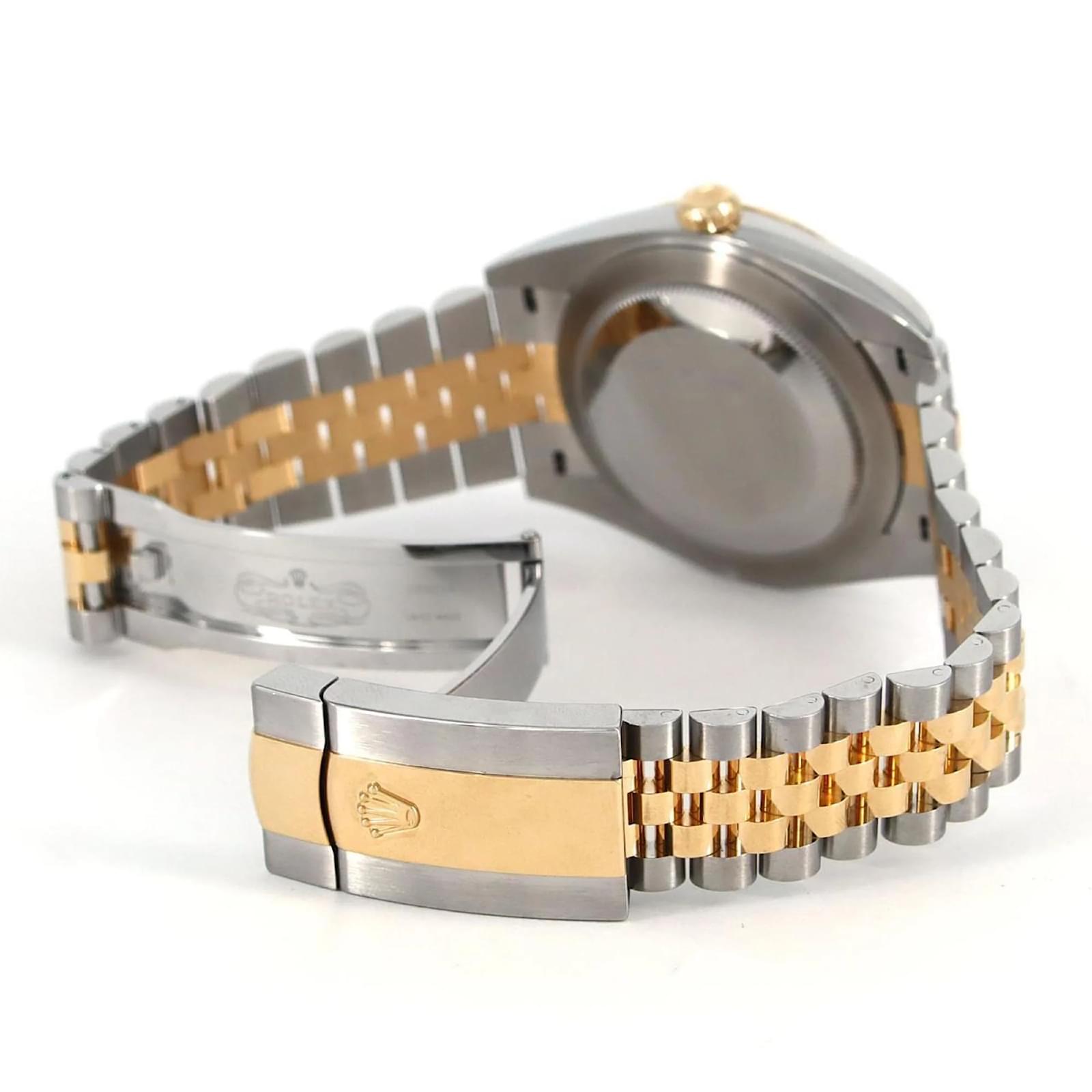 The Rolex Datejust 126333 is a sophisticated wristwatch that features a gray dial and an elegant combination of stainless steel and 18K yellow gold in both its case and band. This automatic self-winding timepiece has a case diameter of 41mm and is designed to fit a wrist size of 19.5cm (7.67 inches). \n\nThis model is part of the renowned Datejust line and includes a date function for added practicality. The watch is classified as used but is in very good condition, showing only minor traces of usage such as some scratches and dirt. It comes with its inner and outer boxes, along with a warranty. Potential buyers are encouraged to review the images for a detailed view of the watch’s condition and included accessories.