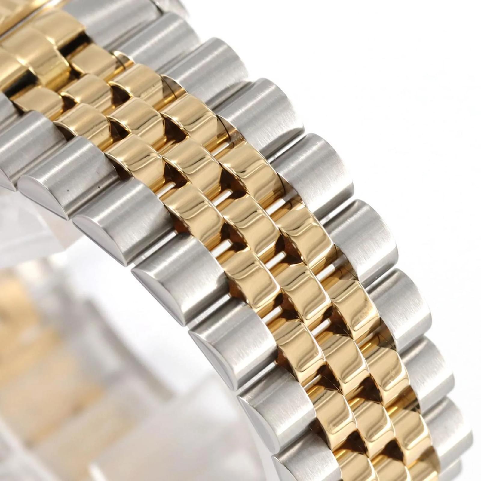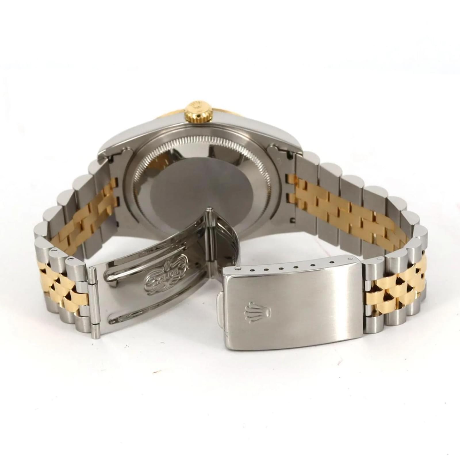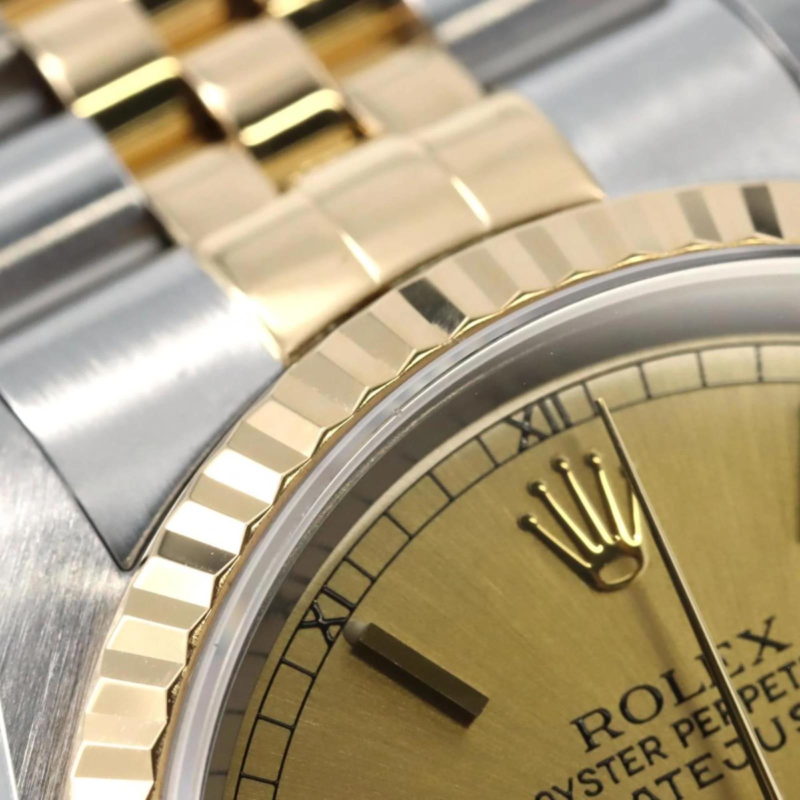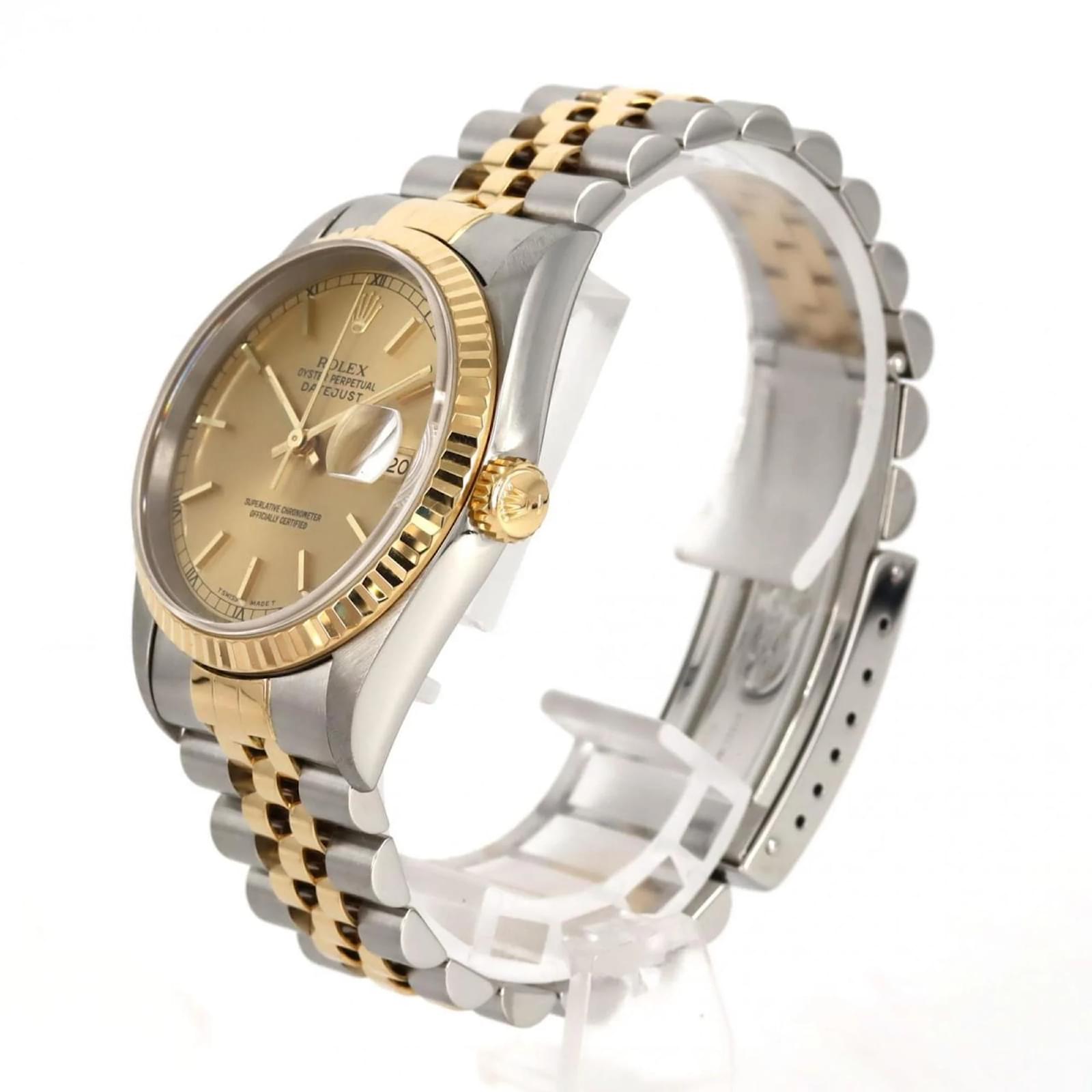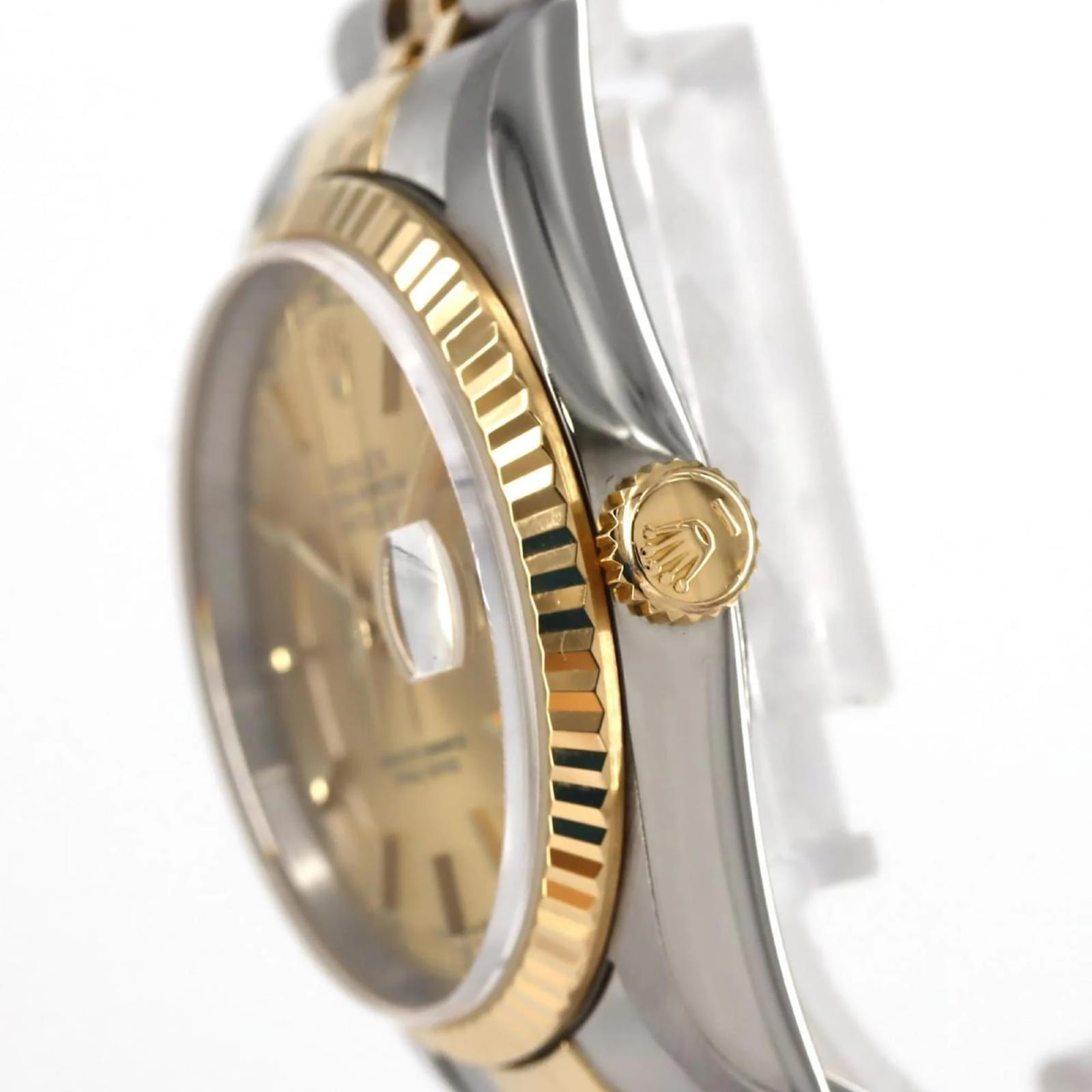 The Rolex Datejust 16233 is a wristwatch that features a gold dial and is crafted from stainless steel and yellow gold. This self-winding automatic timepiece has a case diameter of 36mm and is suitable for a wrist size of 16.5cm (6.49 inches). \n\nThis used watch is in very good condition, showing only insignificant scratches on the bezel, case back, glass, and crown, with no deterioration on the dial or hands. It has been overhauled and polished, ensuring it remains in excellent working order. The watch comes with both inner and outer boxes. \n\nBefore purchasing, potential buyers are encouraged to review the images for a detailed view of the item’s condition and included accessories.