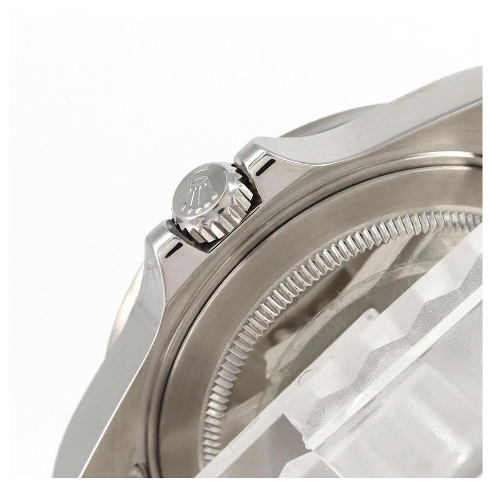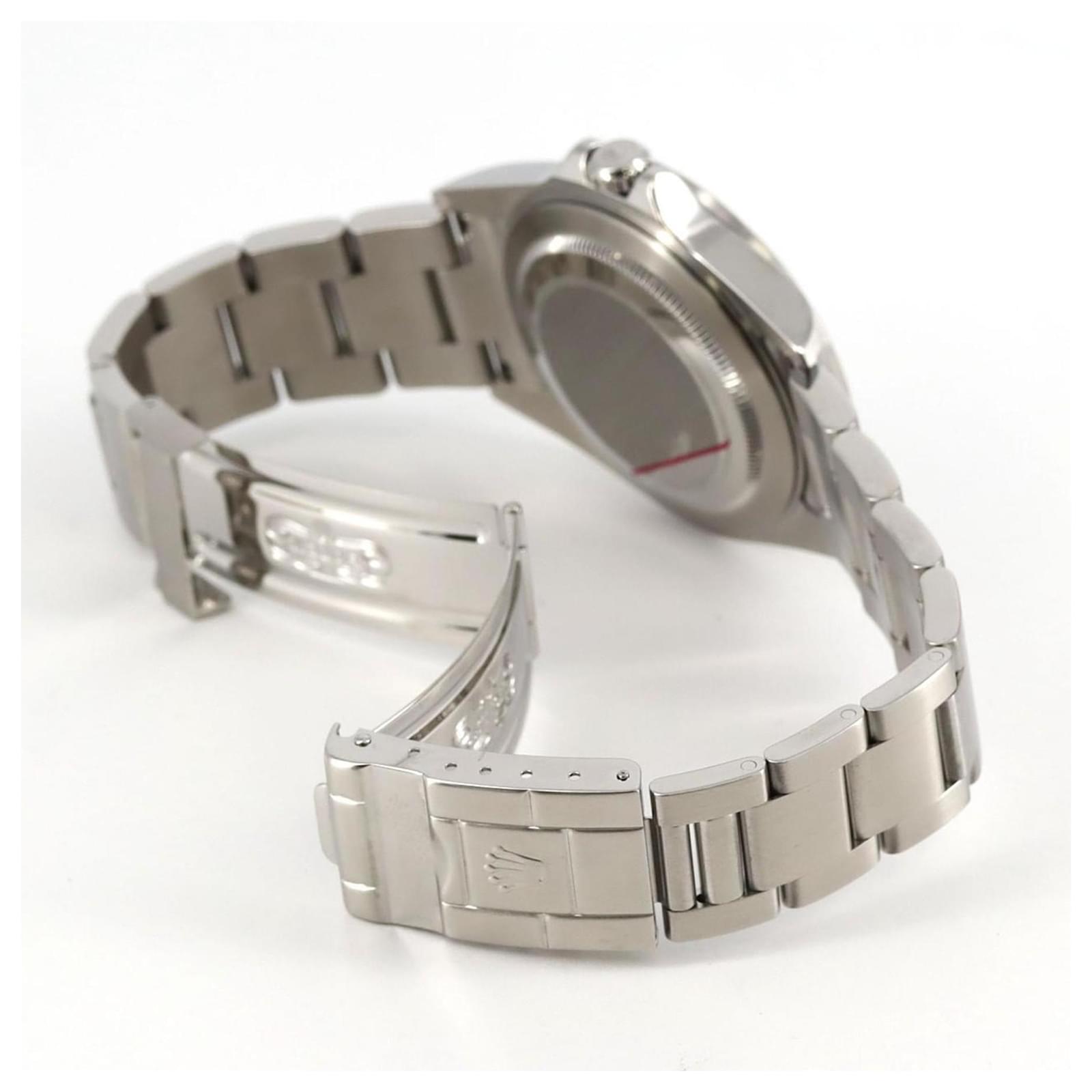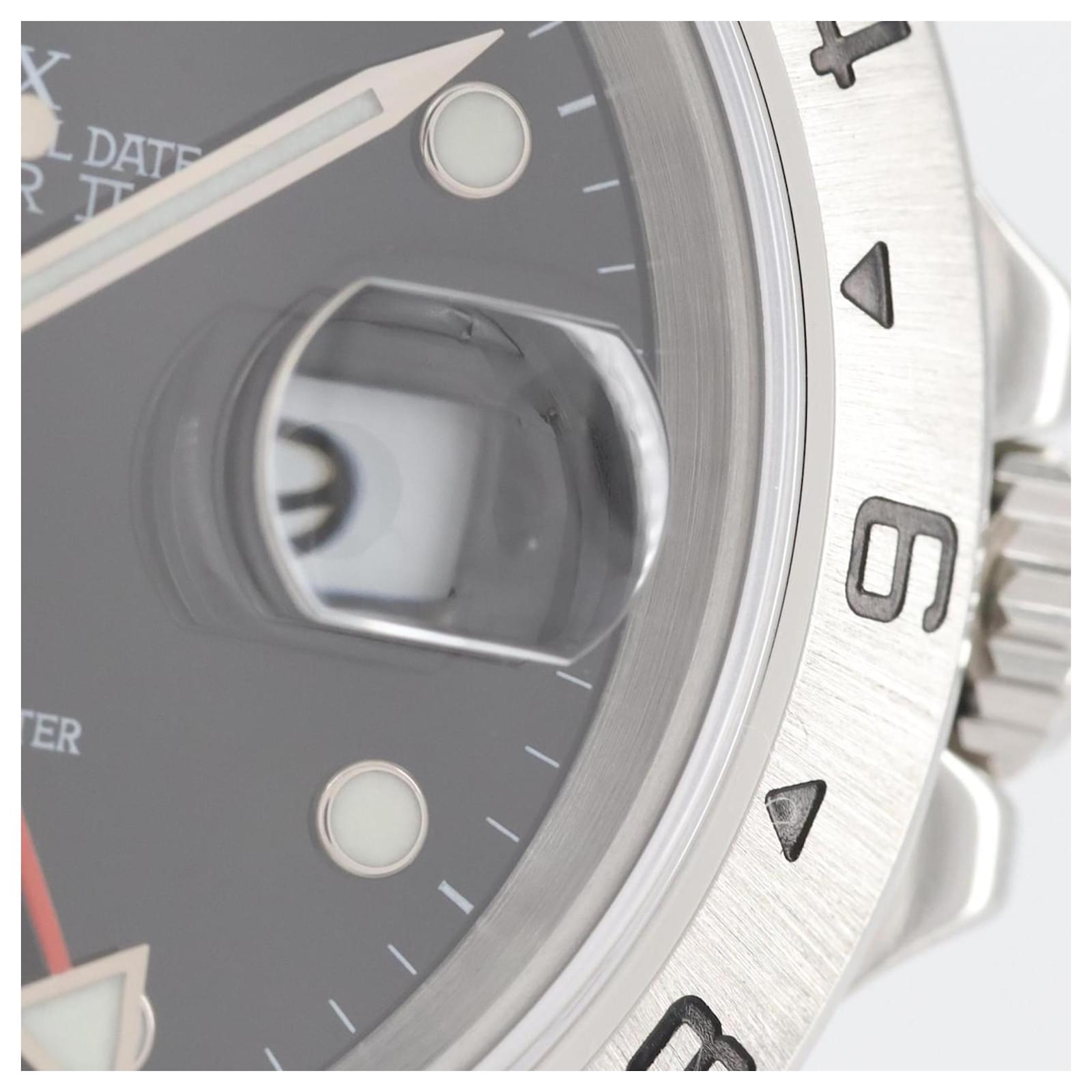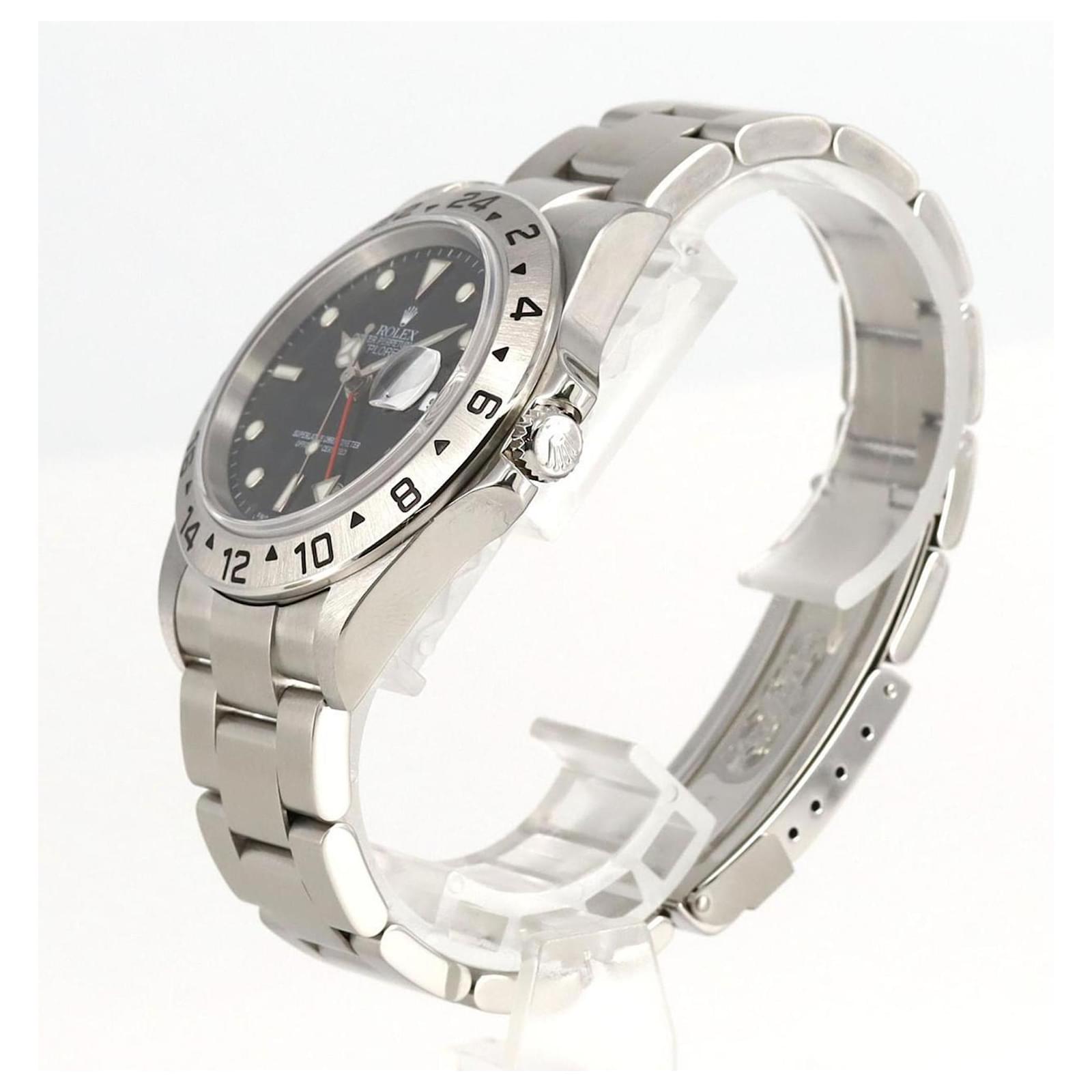 The Rolex Explorer 16570 is a stainless steel wristwatch featuring a black dial and a self-winding automatic movement. With a case diameter of 40mm and designed for a wrist size of 18cm (7.08 inches), this watch combines functionality with a classic aesthetic. It includes a date function and is presented in very good used condition, showing some traces of usage and minor scratches. The watch has been overhauled and polished, ensuring it is well-maintained. Included with the watch are the inner and outer boxes, along with a warranty. Potential buyers are encouraged to review the images for a detailed view of the item’s condition and included accessories.
