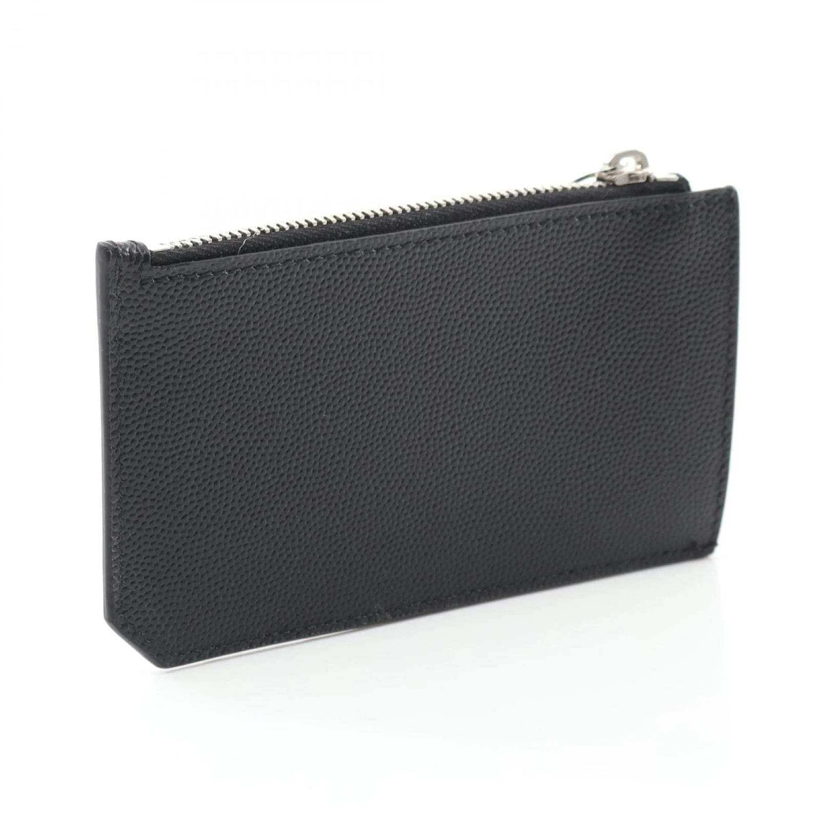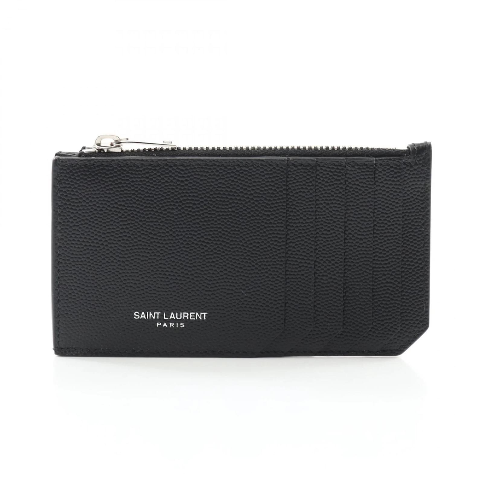 The Saint Laurent Fragment Zip Pouch is a versatile coin purse designed for both men and women. Crafted from black leather, it features a compact size of 7cm x 13cm x 5.00mm, making it easy to carry. This item is in opened but never used condition, with insignificant traces of use, scratches, and dirt. It comes with a box and dust bag for protection. Before purchasing, it is advisable to refer to the images for the exact condition and included accessories.