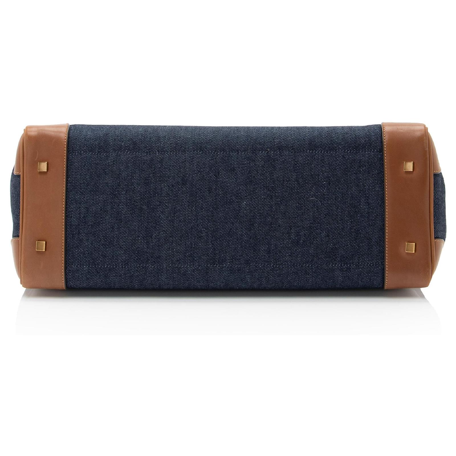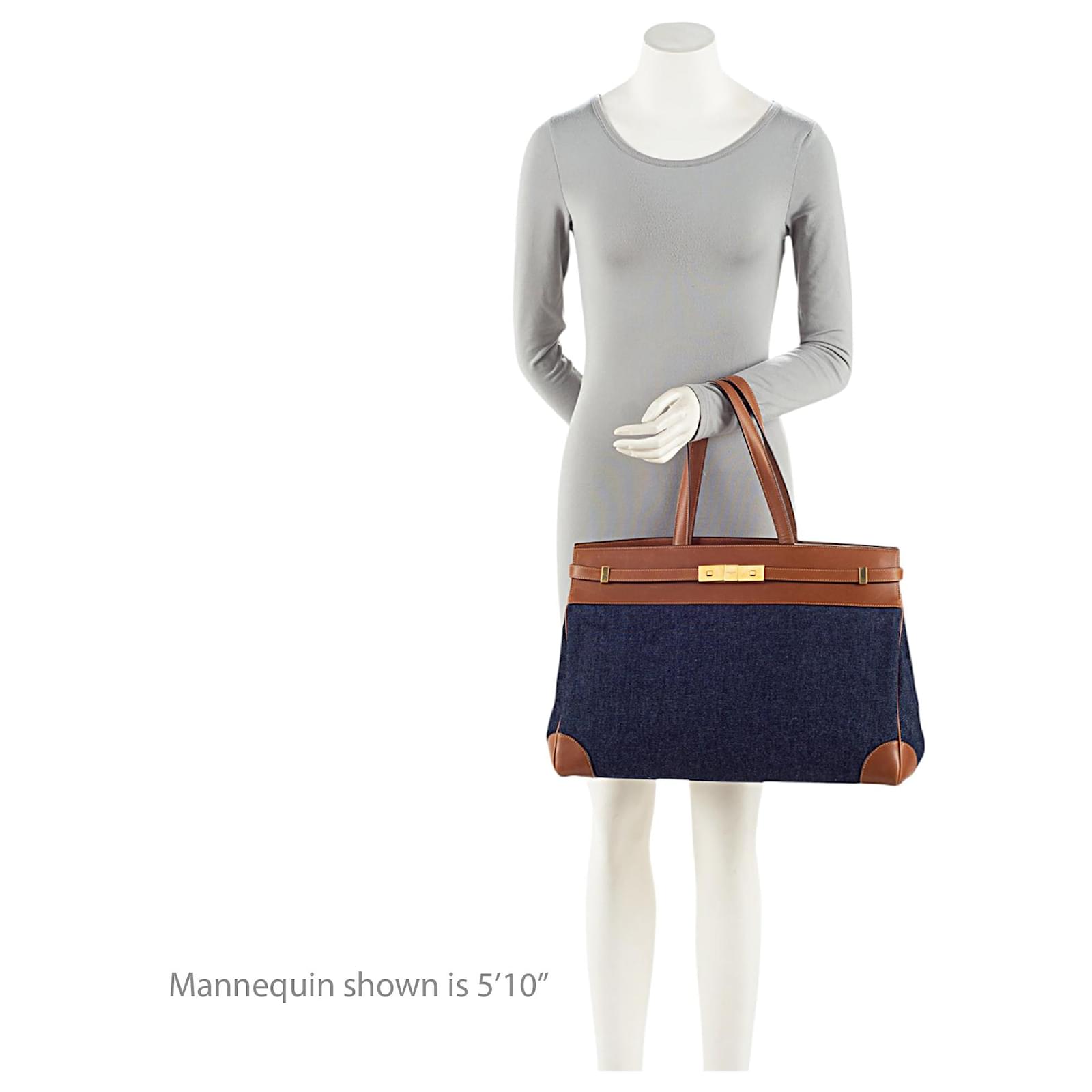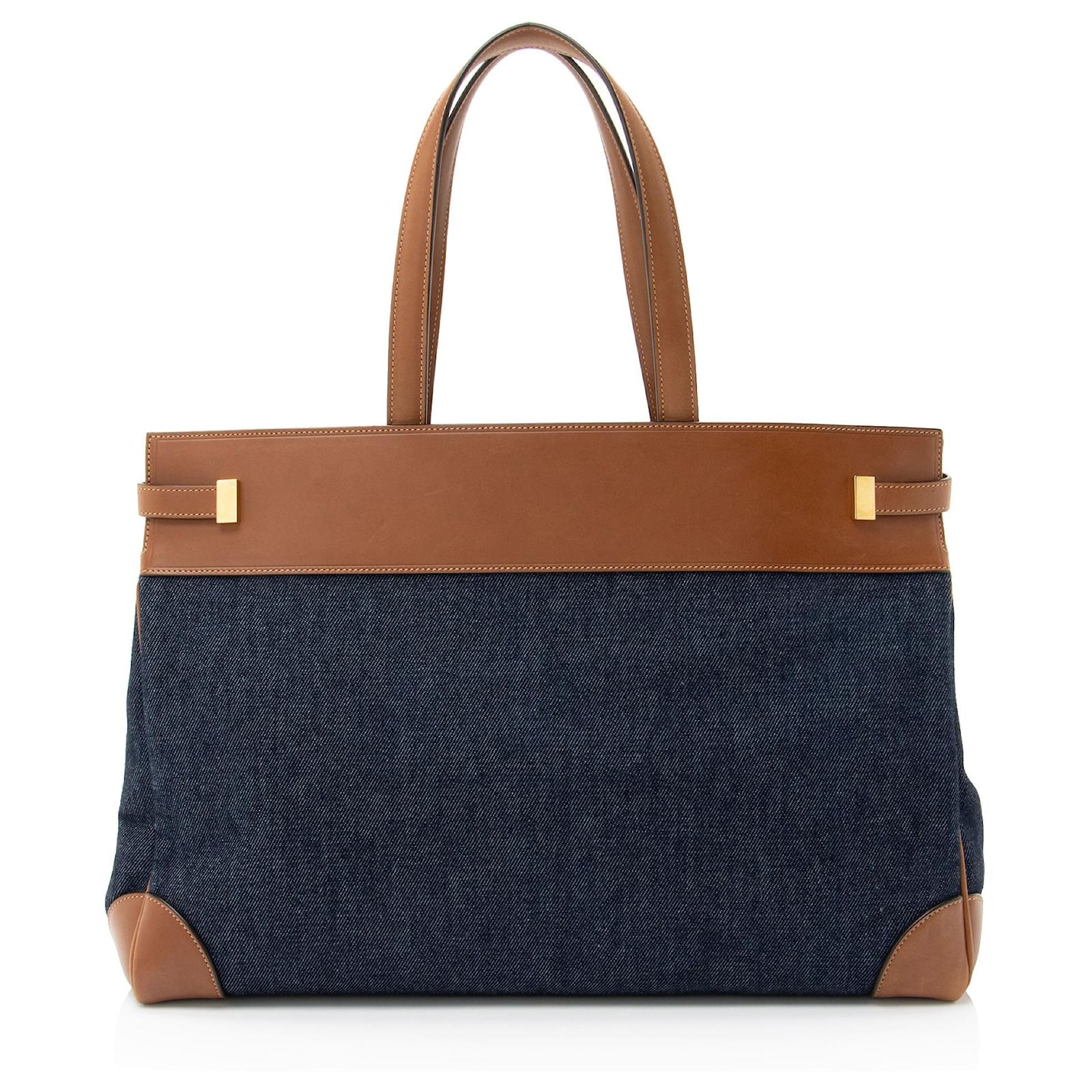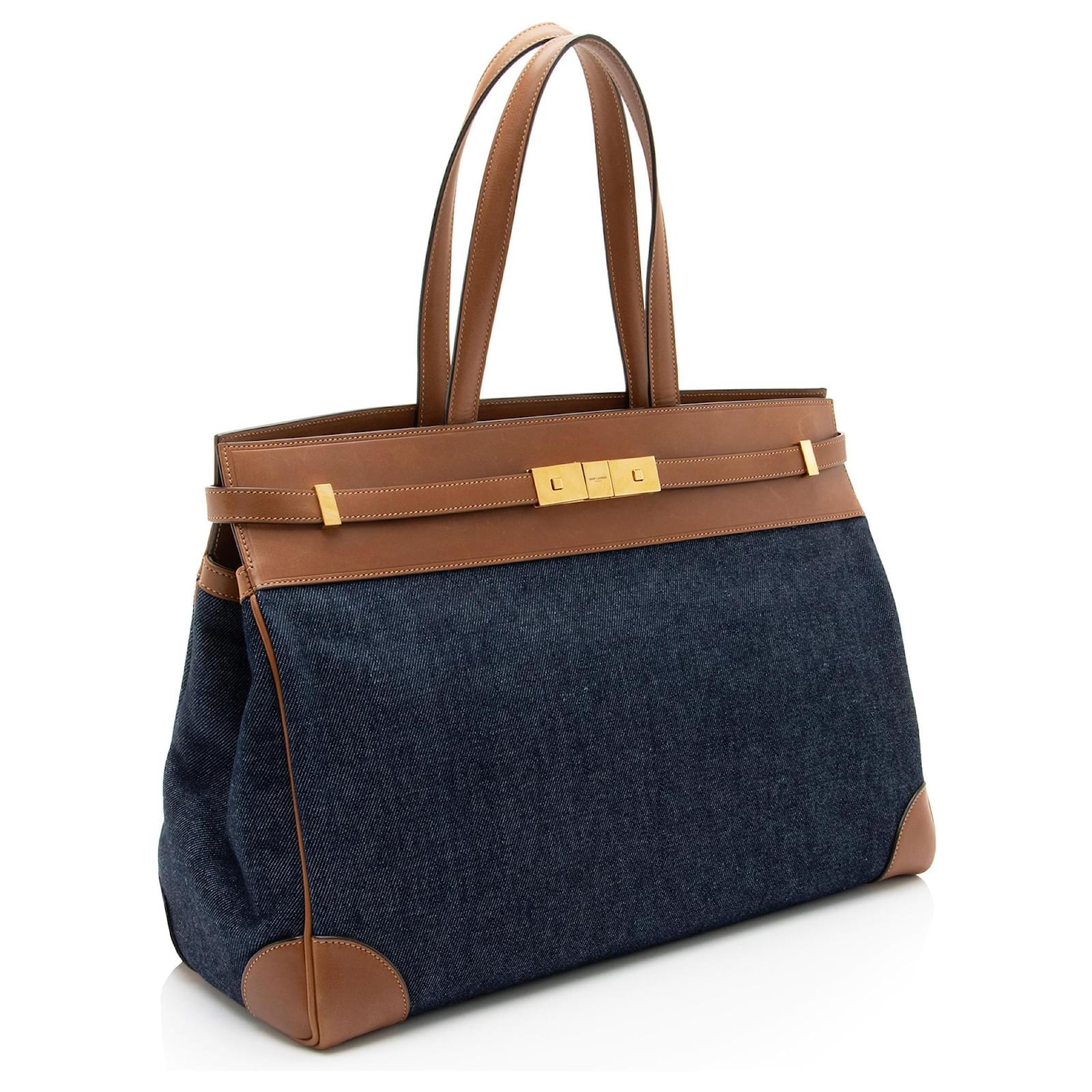 The French fashion house was founded in 1961 by designer Yves Saint Laurent and his partner, Pierre Bergé. Yves Saint Laurent revolutionized the world of women’s fashion. In 1963, the current logos were designed by A. M. Cassandre. In efforts to popularize ready-to-wear collections, the brand launched its highly celebrated Rive Gauche line during 1966. To this day, Saint Laurent is internationally recognized for their decidedly modern and elegant creations.\nCondition Notes: Light scuffs and wear to exterior bottom corners. Moderate scuffs throughout exterior leather trim. Light creasing and scuffs throughout handles. Light surface scratches to hardware. Visible scuffs throughout interior leather.\nWidth (at base): 16.75\”\nHeight: 11.5\”\nDepth: 6.5\”\nHandle Drop: 7.5\”\nCirca: 2023\nType of Material: Leather, Denim\nColor: Brown, Blue\nLining: Black Fine Textile\nPockets: Two Interior\nHardware: Gold Tone\nClosure: Open Top\nOrigin: Italy\nMeasurements: width: 425 mm height: 292 mm handle drop: 190.5 mm\nProduct Id: 510515