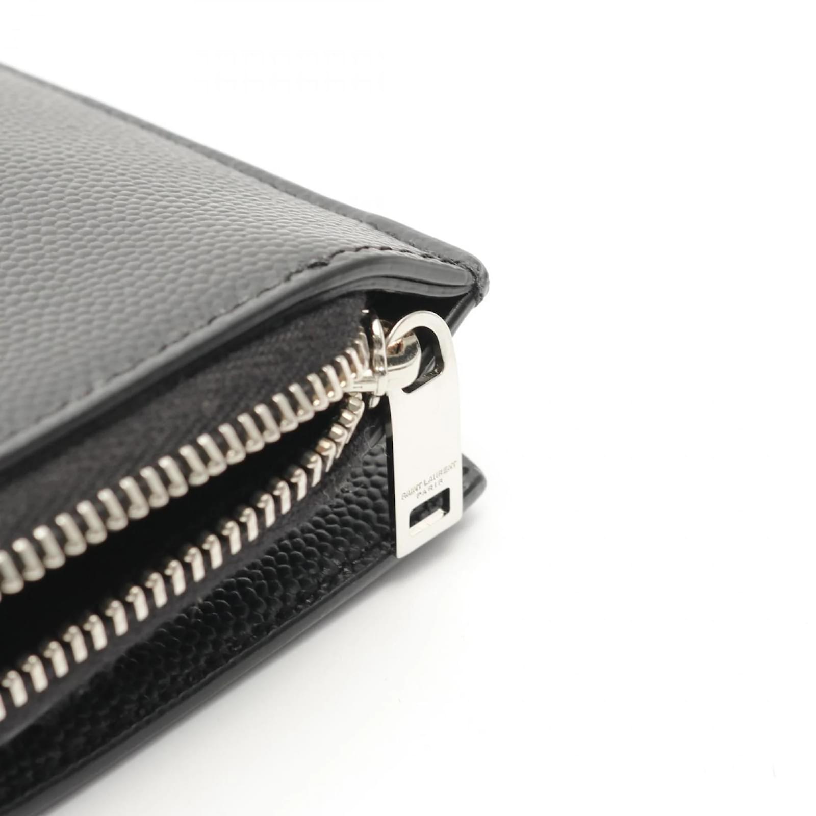 The Saint Laurent East West Zip Wallet is a bi-fold wallet designed for women, crafted from black leather. It measures 9cm in height, 10.5cm in width, and 2cm in depth, making it a compact accessory for everyday use. This wallet is pre-owned and classified as being in good condition, with slight traces of use, including minor scratches and dirt. It is important to review the provided images to assess the exact condition before purchasing. No additional accessories are included with this item.