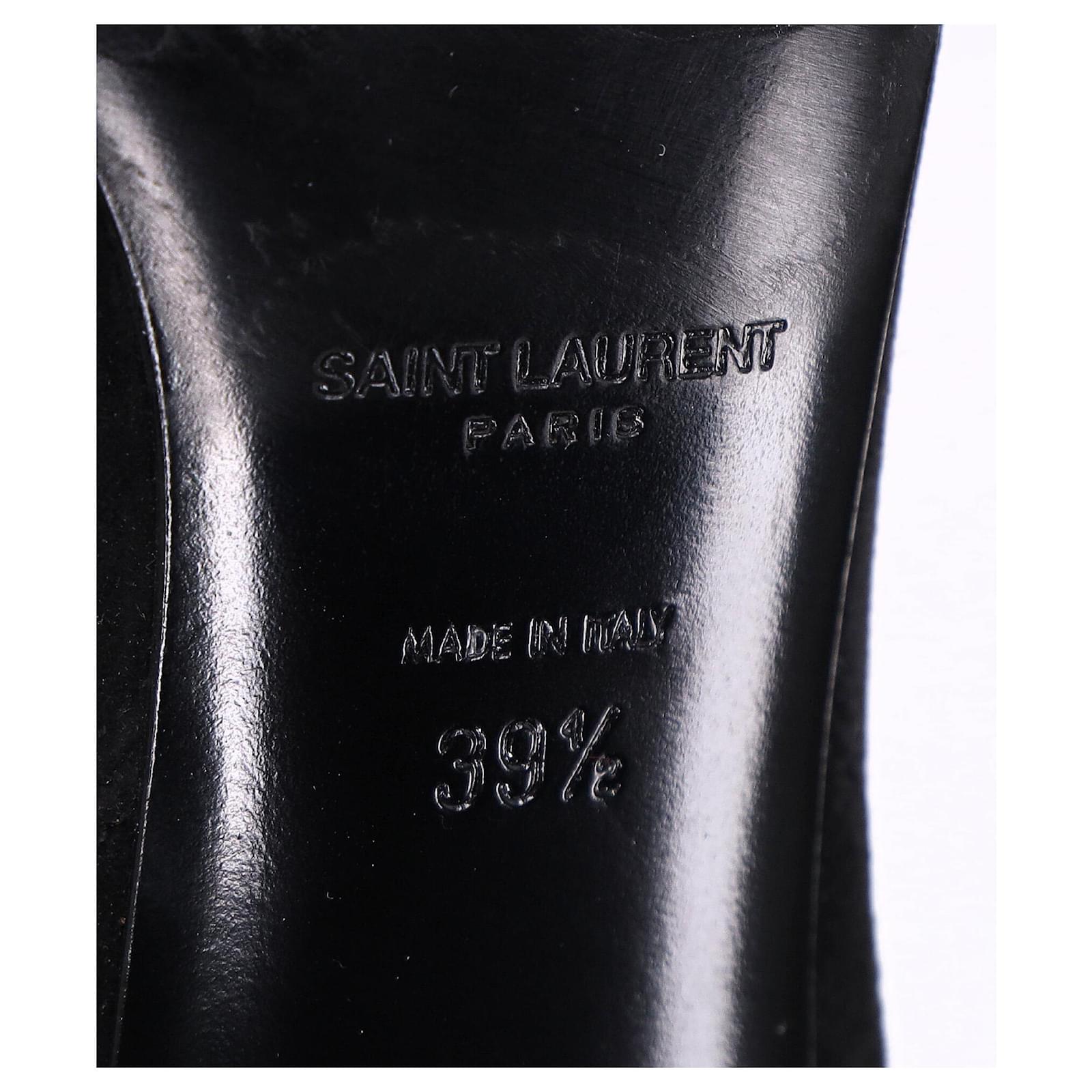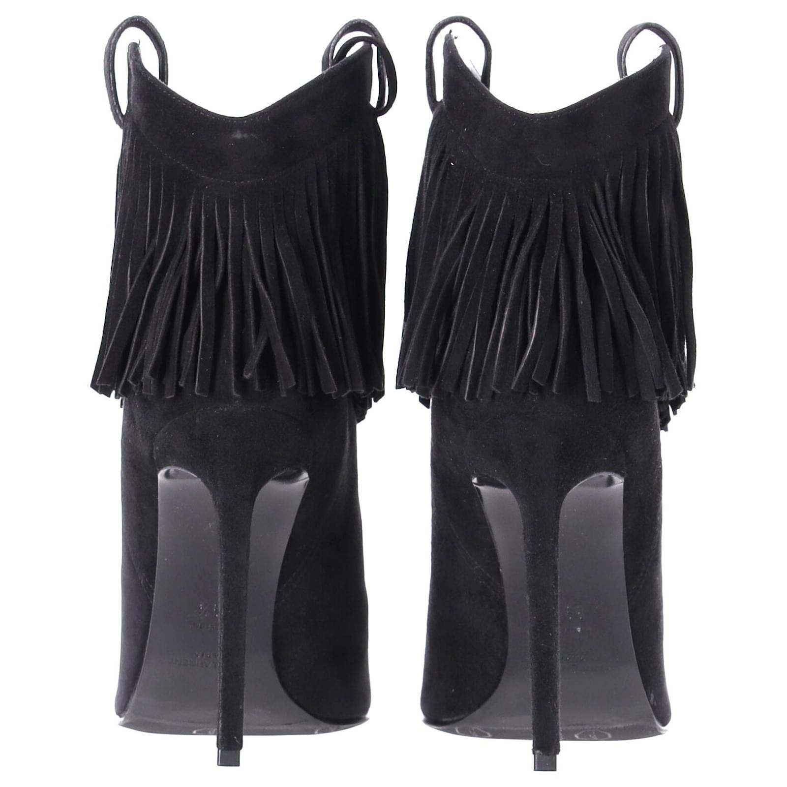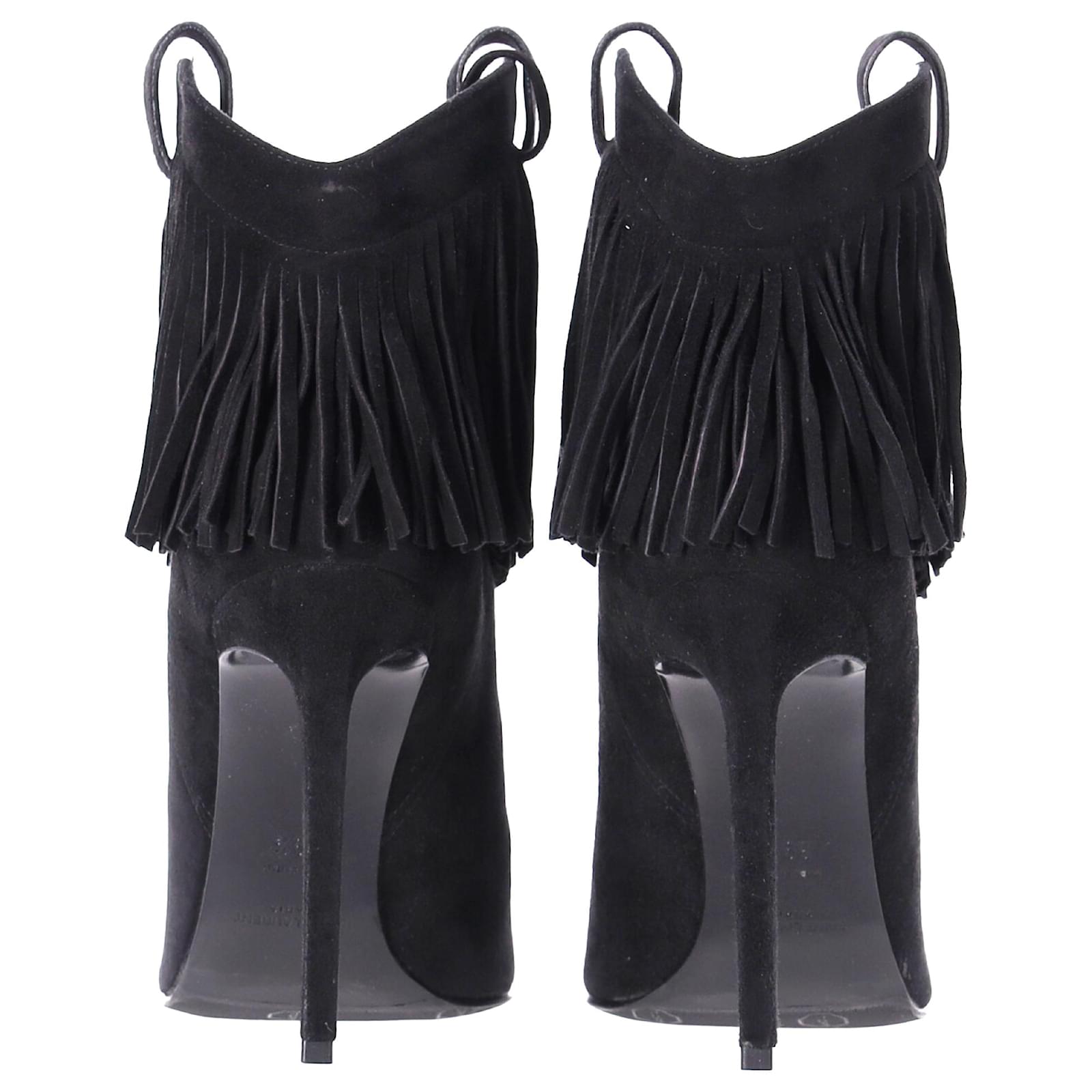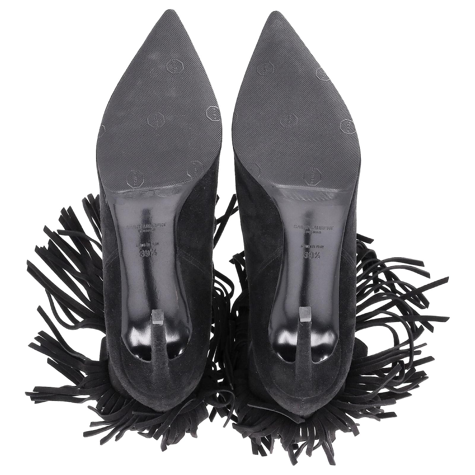 Add a touch of boho chic and modern edge to your wardrobe with the Saint Laurent Fringe Ankle Boots in black suede. These stylish boots feature playful fringe detailing that dances with every step, while the pointed-toe silhouette and 3.5-inch stiletto heel give them a sleek, feminine finish. Inspired by 70’s style, these boots offer a vintage vibe with a contemporary twist. Perfect for both day and night, they bring a bold statement to any outfit.\n\n\nwith Dust bag\n\nSaint Laurent Fringe Ankle Boots in Black Suede\nCondition: very good\nSigns of wear: No visible sign of wear. No Mark at insole., Unused or used once, but as good as new. Very light mark at soles. resoled\nPackaging: Dust bag\nColor: black\nMaterial: Suede | suede\nSize: EU | 39\nMeasurements: Heel height: 110; Insole length: 250\nSKU: TONPUDESH464917W \n Product Id: 464917 \n