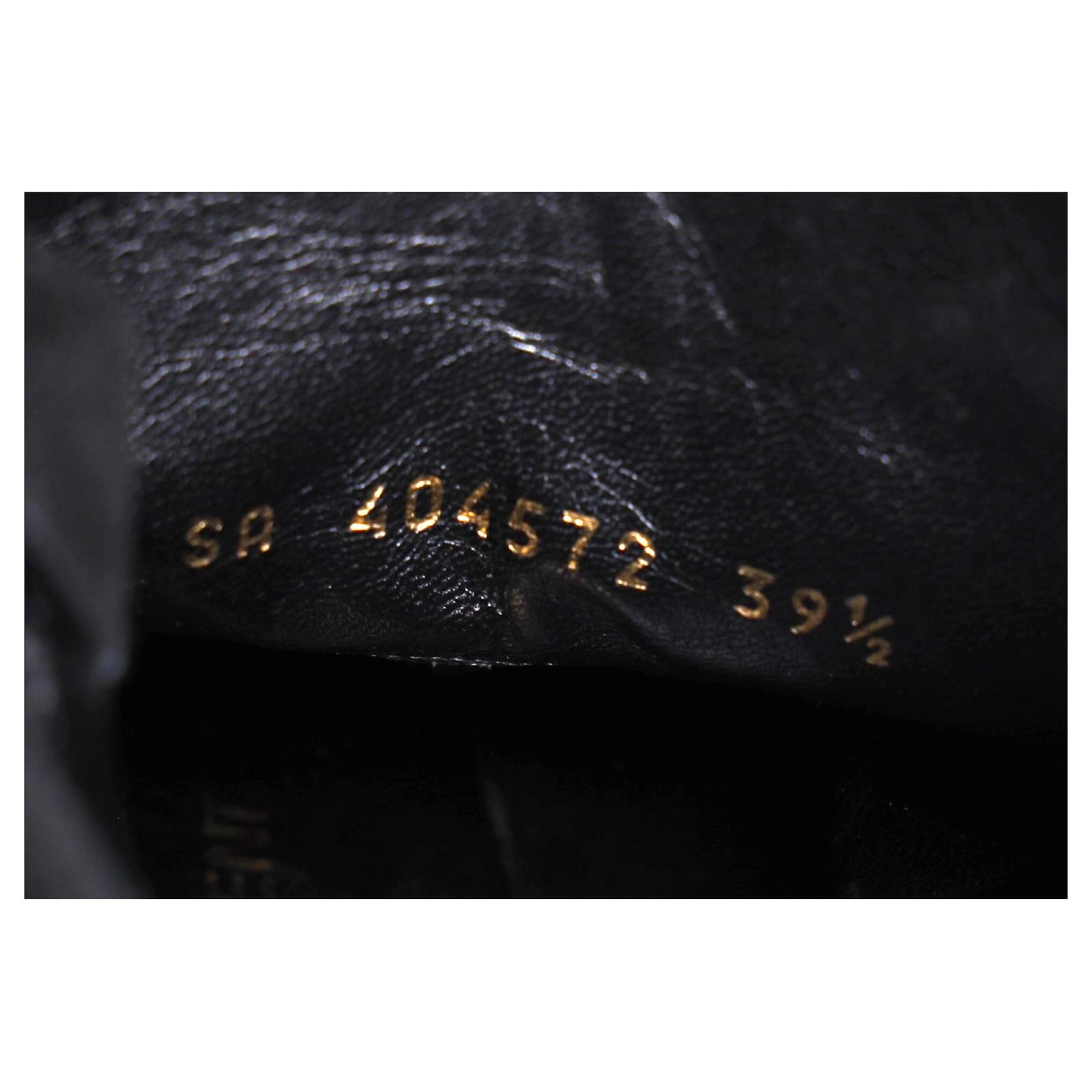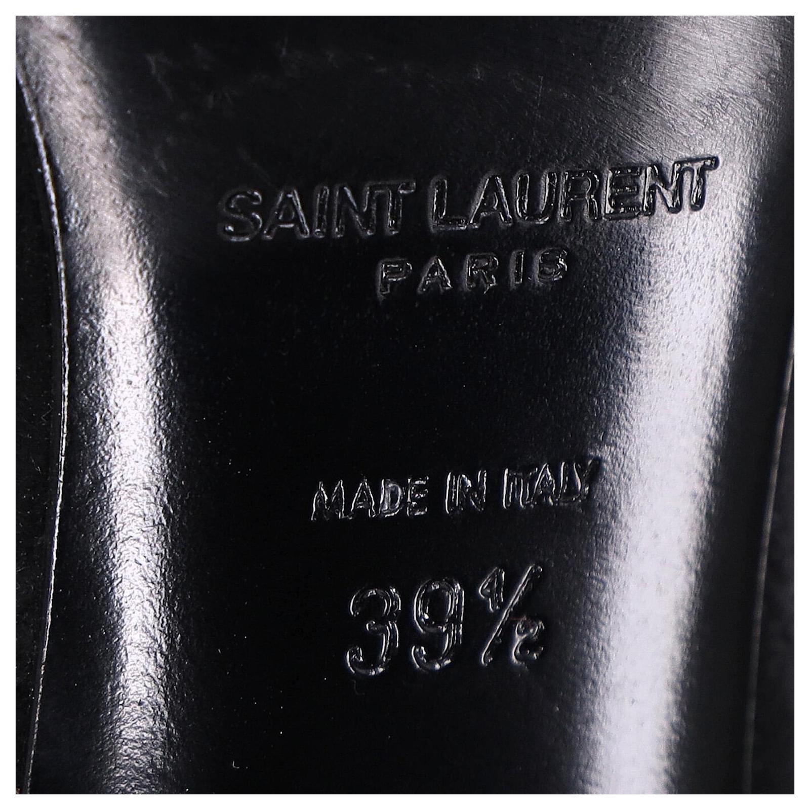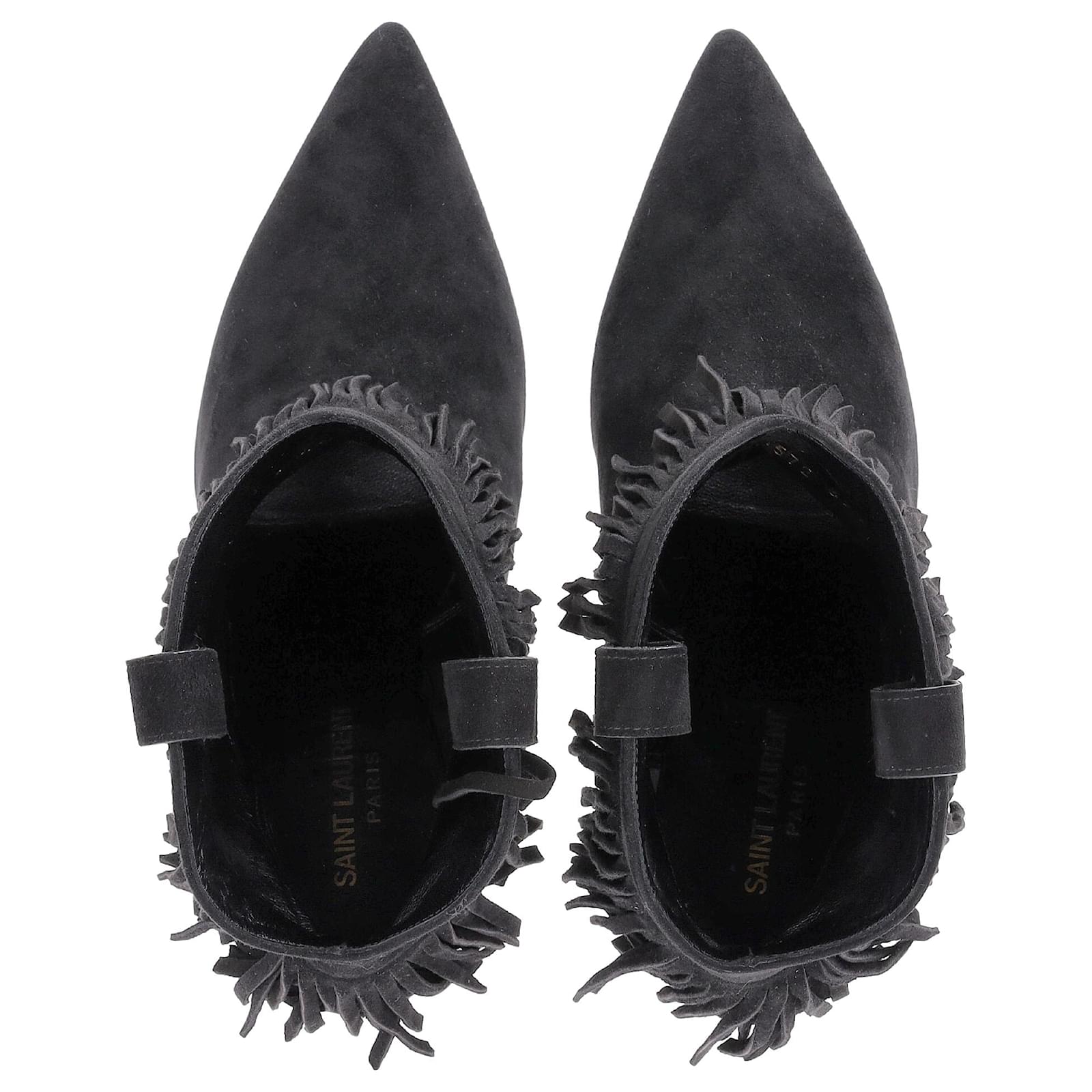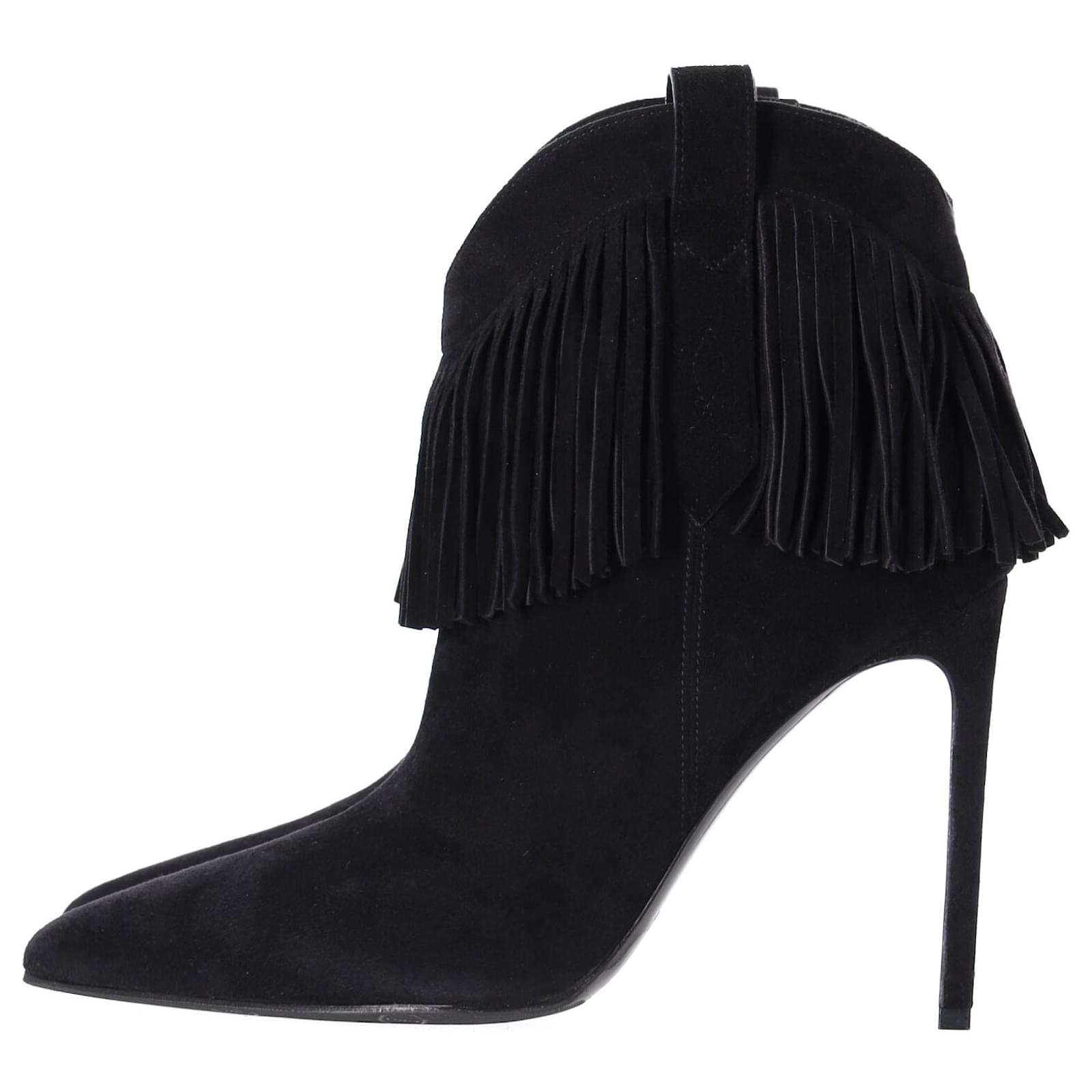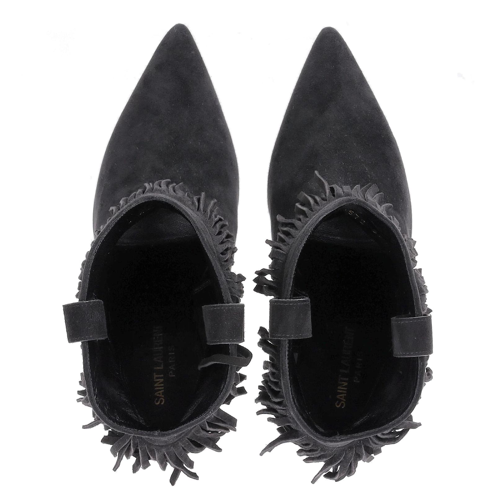 Add a touch of boho chic and modern edge to your wardrobe with the Saint Laurent Fringe Ankle Boots in black suede. These stylish boots feature playful fringe detailing that dances with every step, while the pointed-toe silhouette and 3.5-inch stiletto heel give them a sleek, feminine finish. Inspired by 70’s style, these boots offer a vintage vibe with a contemporary twist. Perfect for both day and night, they bring a bold statement to any outfit.\n\n\nwith Dust bag\n\nSaint Laurent Fringe Ankle Boots in Black Suede\nCondition: very good\nSigns of wear: No visible sign of wear. No Mark at insole., Unused or used once, but as good as new. Very light mark at soles. resoled\nPackaging: Dust bag\nColor: black\nMaterial: Suede | suede\nSize: EU | 39\nMeasurements: Heel height: 110; Insole length: 250\nSKU: TONPUDESH464917W \n Product Id: 464917 \n