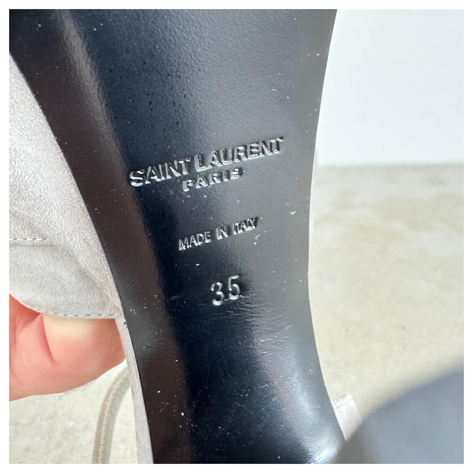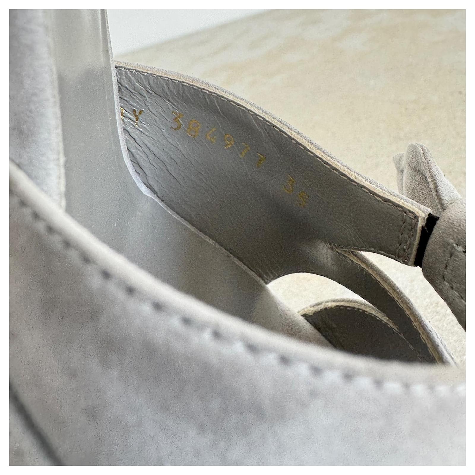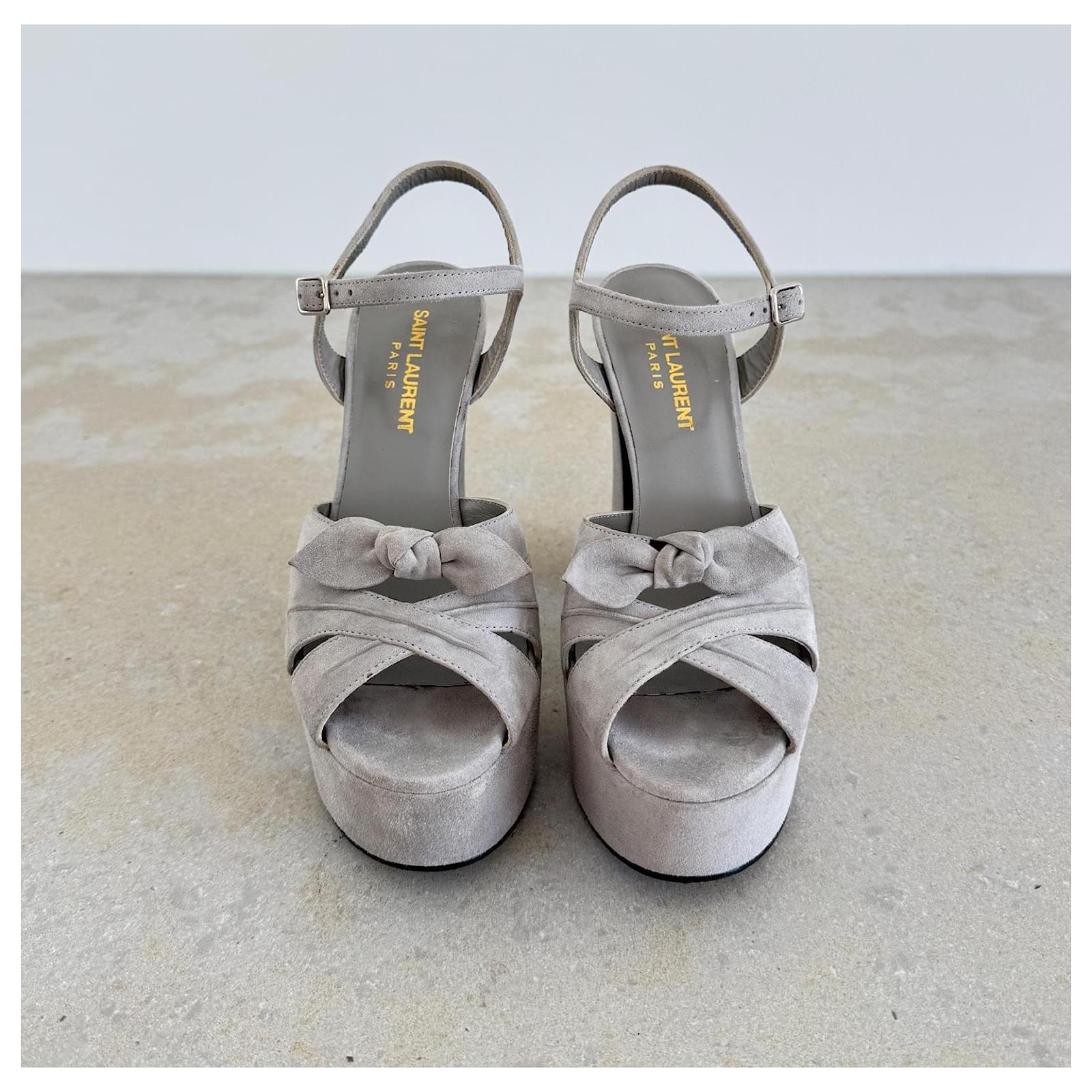 Saint Laurent by Hedi Slimane Candy Bow sandals in very good condition, only used once.\r\nFavorited by celebrities, this comfortable pair is perfect for he summer. It is crafted in easy to match light grey suede and feature an adjustable ankle strap, a stable block heel and a generous platform.\r\n\r\nHeel 12 cm \r\nPlatform 4 cm\r\nInsole 23 cm