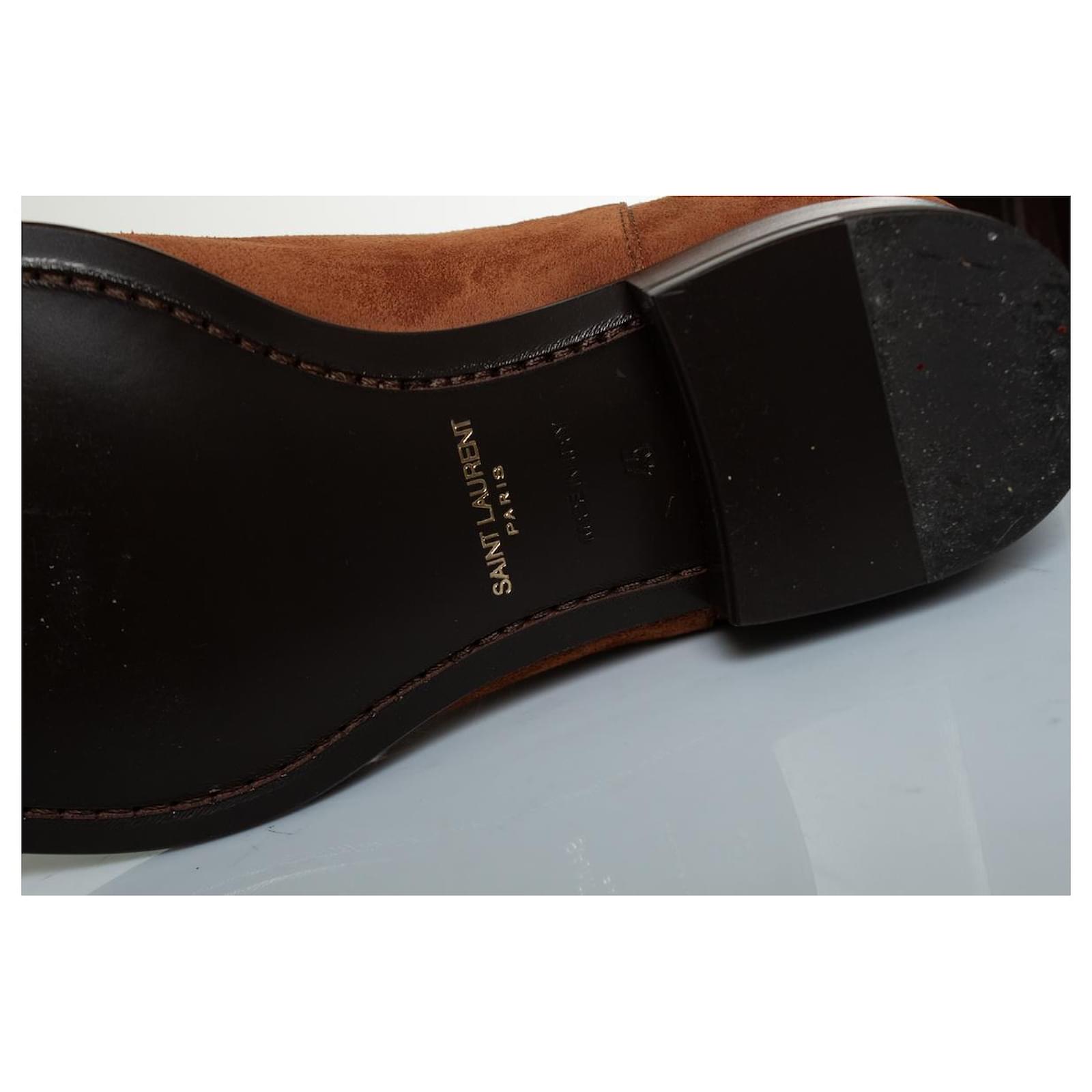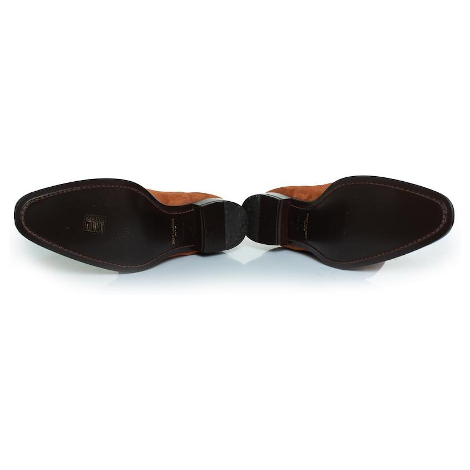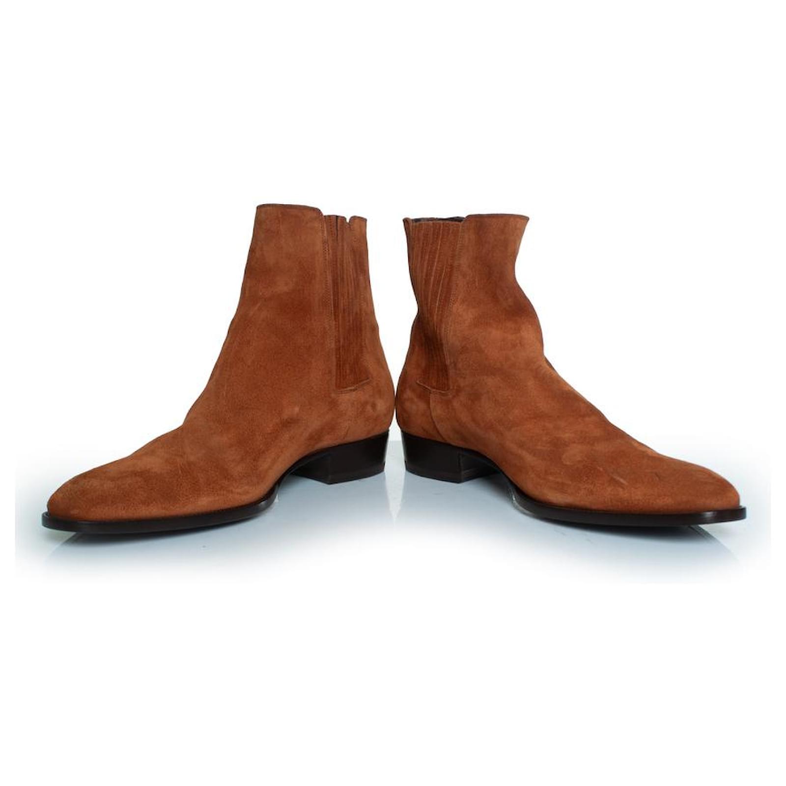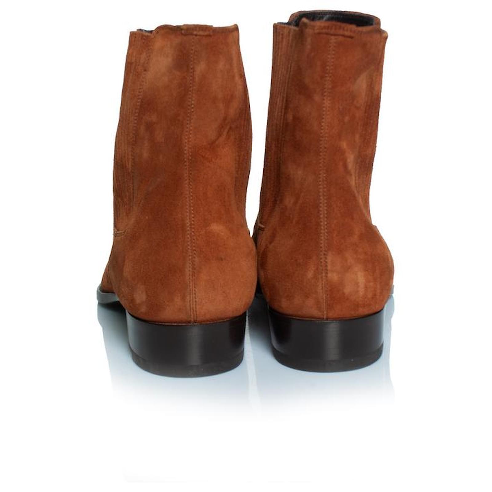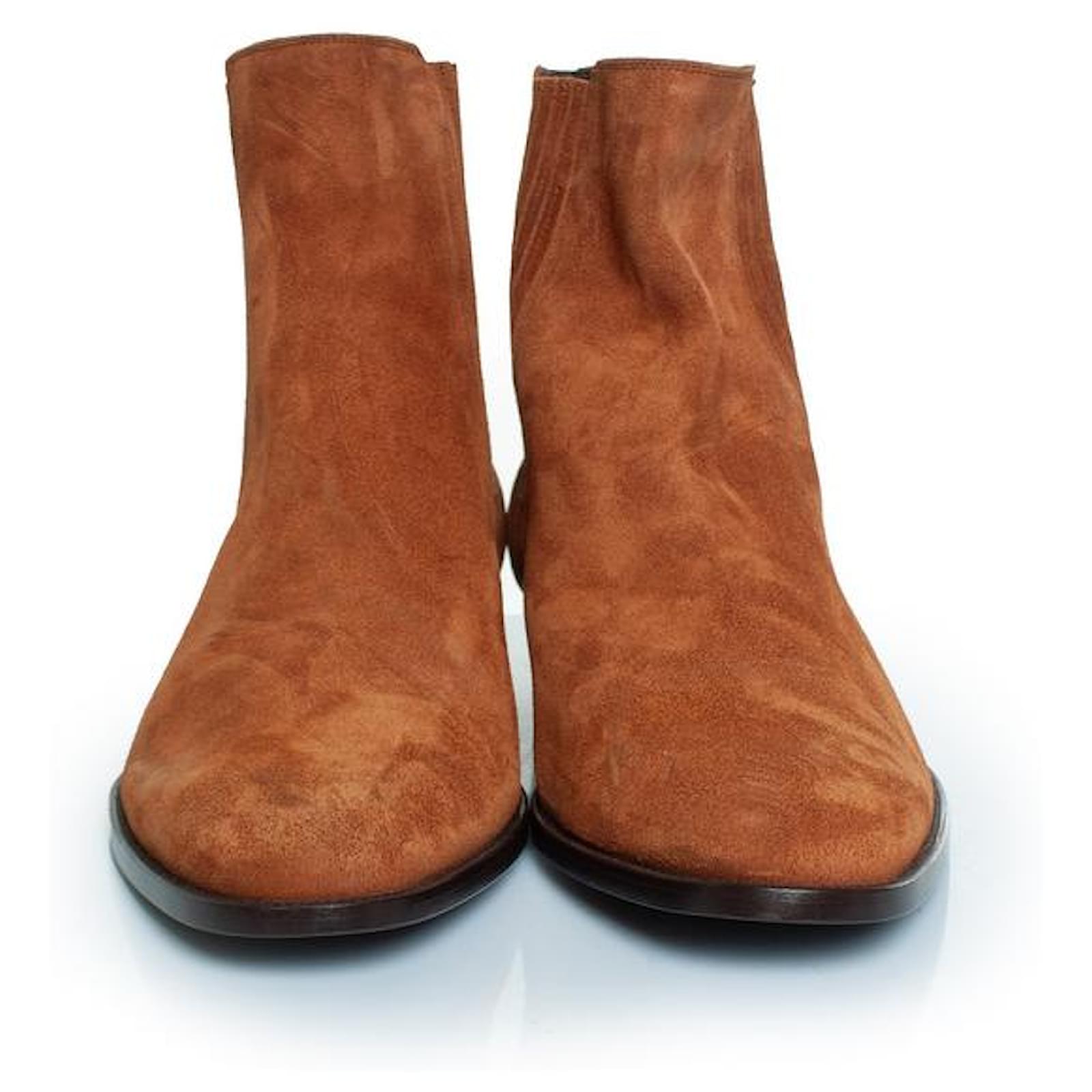 CONDITION: new – unworn\nSIZE: 45\nINSOLE MEASUREMENTS: 30 cm\nHEEL MEASUREMENTS: 3.5 cm PLATFORM: 1 cm\nSHAFT HEIGHT: 17 cm WIDTH TOP: 12 cm\nMATERIAL: suede\nCOLOUR: cognac\nITEM LOCATION: The Netherlands\nITEM NUMBER: 8600\n