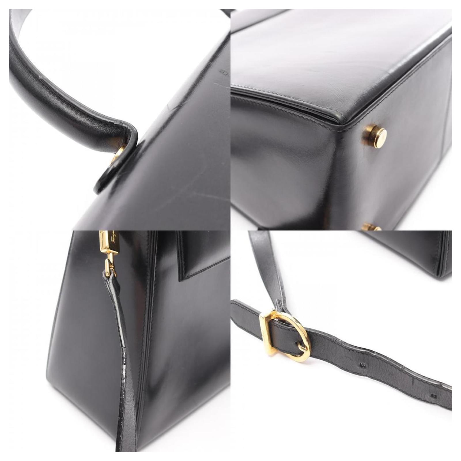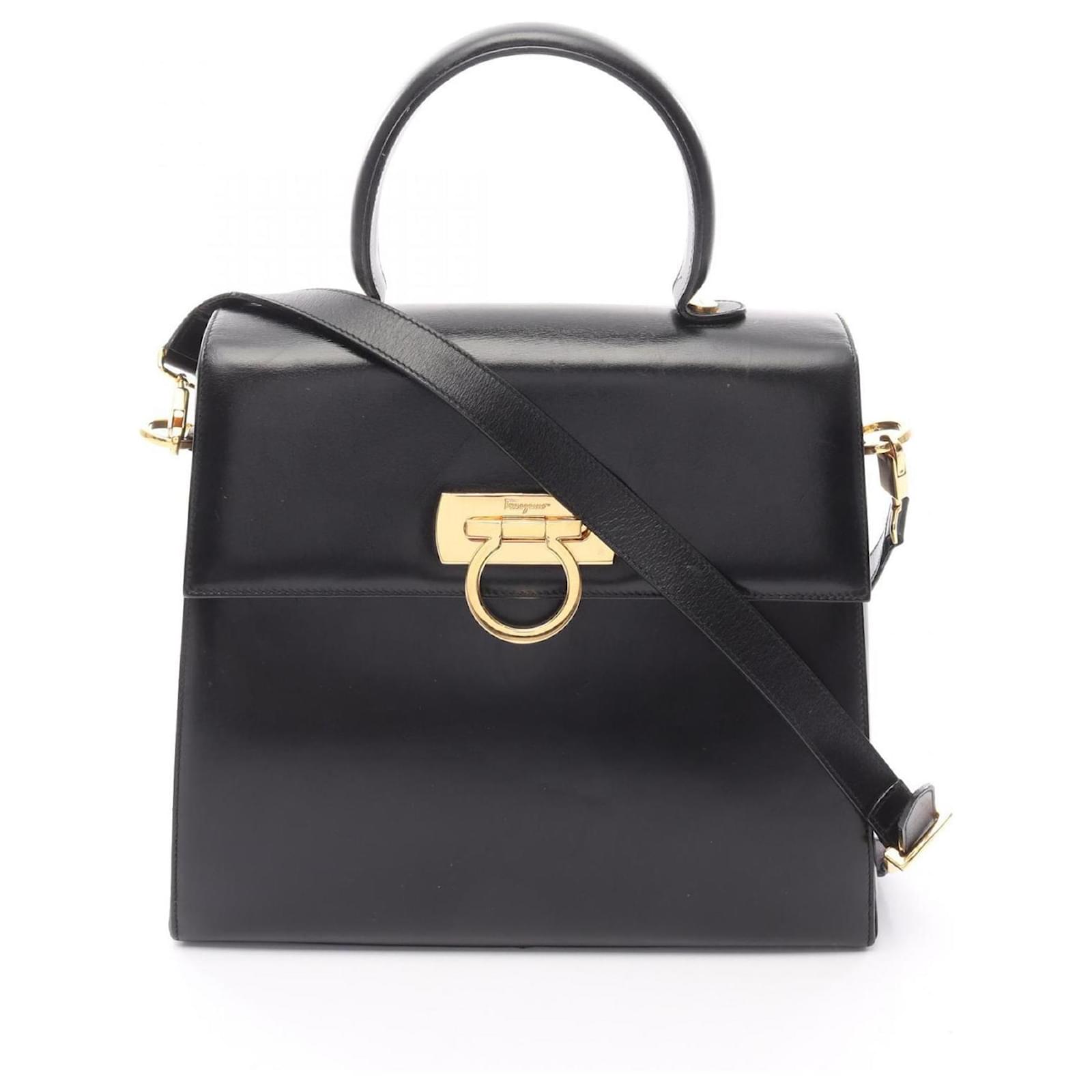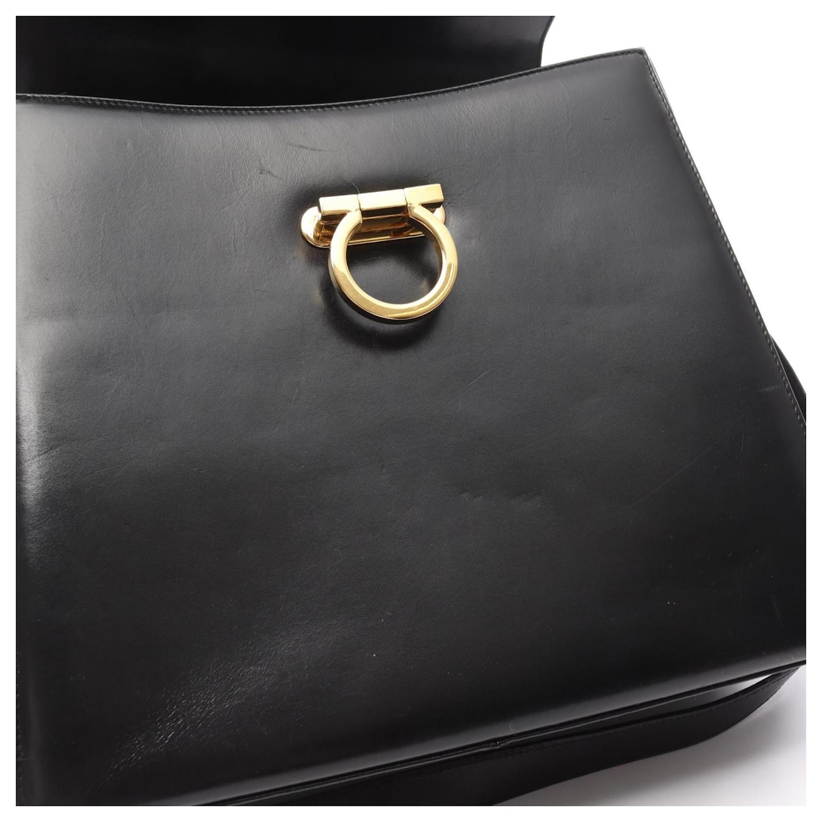 This Salvatore Ferragamo Gancini handbag is crafted from black leather, offering a stylish accessory for various occasions. The handbag measures 23cm in height, 26.5cm in width, and 10cm in depth, with a handle length of 26cm and an adjustable strap length ranging from 103cm to 111cm. \n\nIt is categorized as used but remains in good condition, showing traces of usage, including some visible damages or dirt. Potential buyers are encouraged to review the provided images for a clear understanding of the item’s condition. The handbag comes with a shoulder strap, enhancing its versatility.