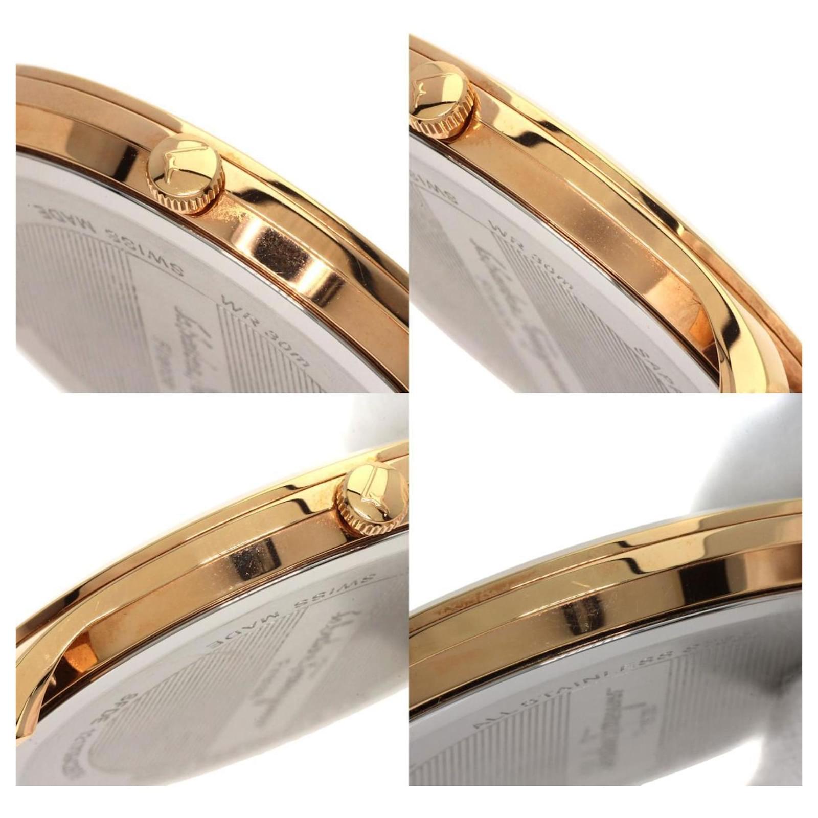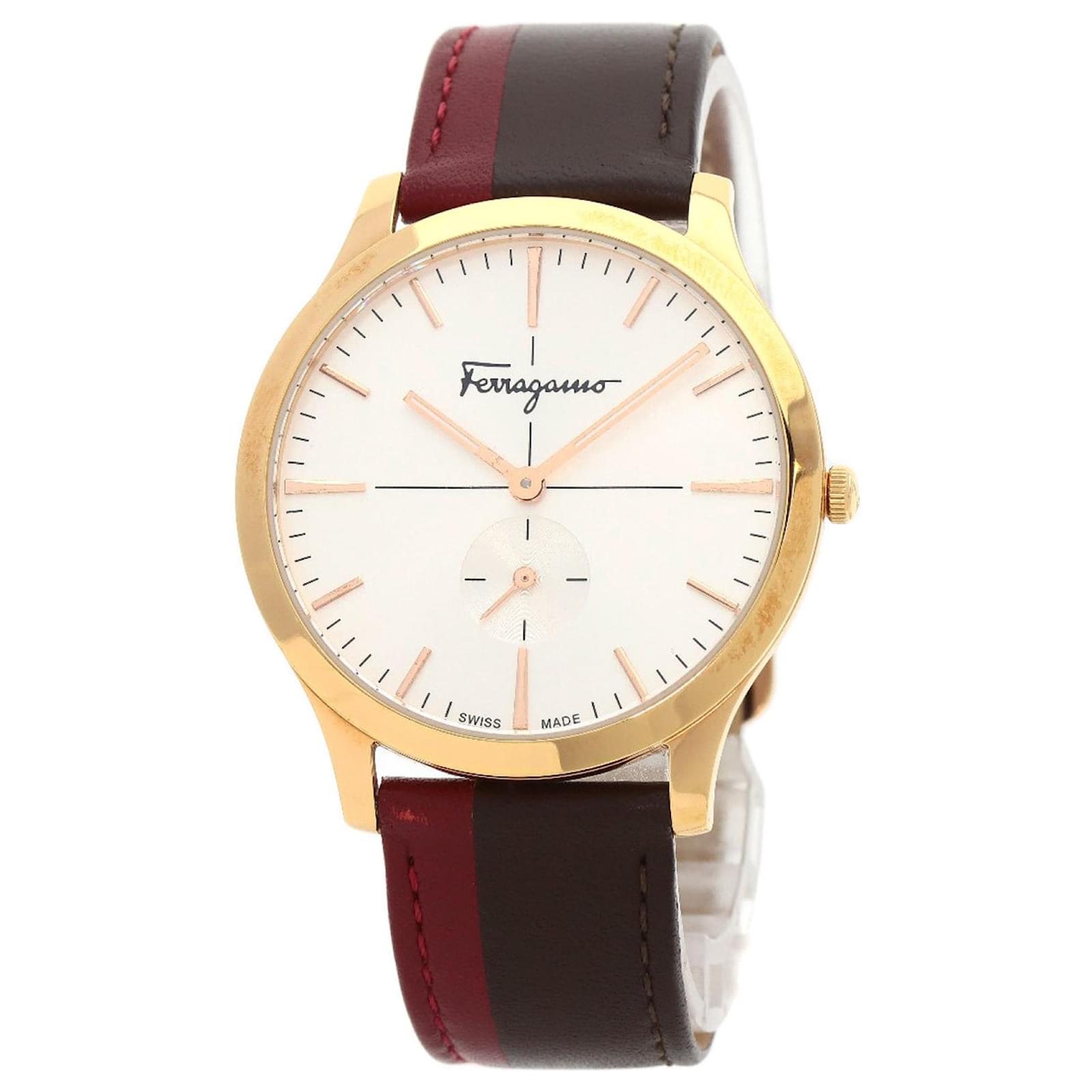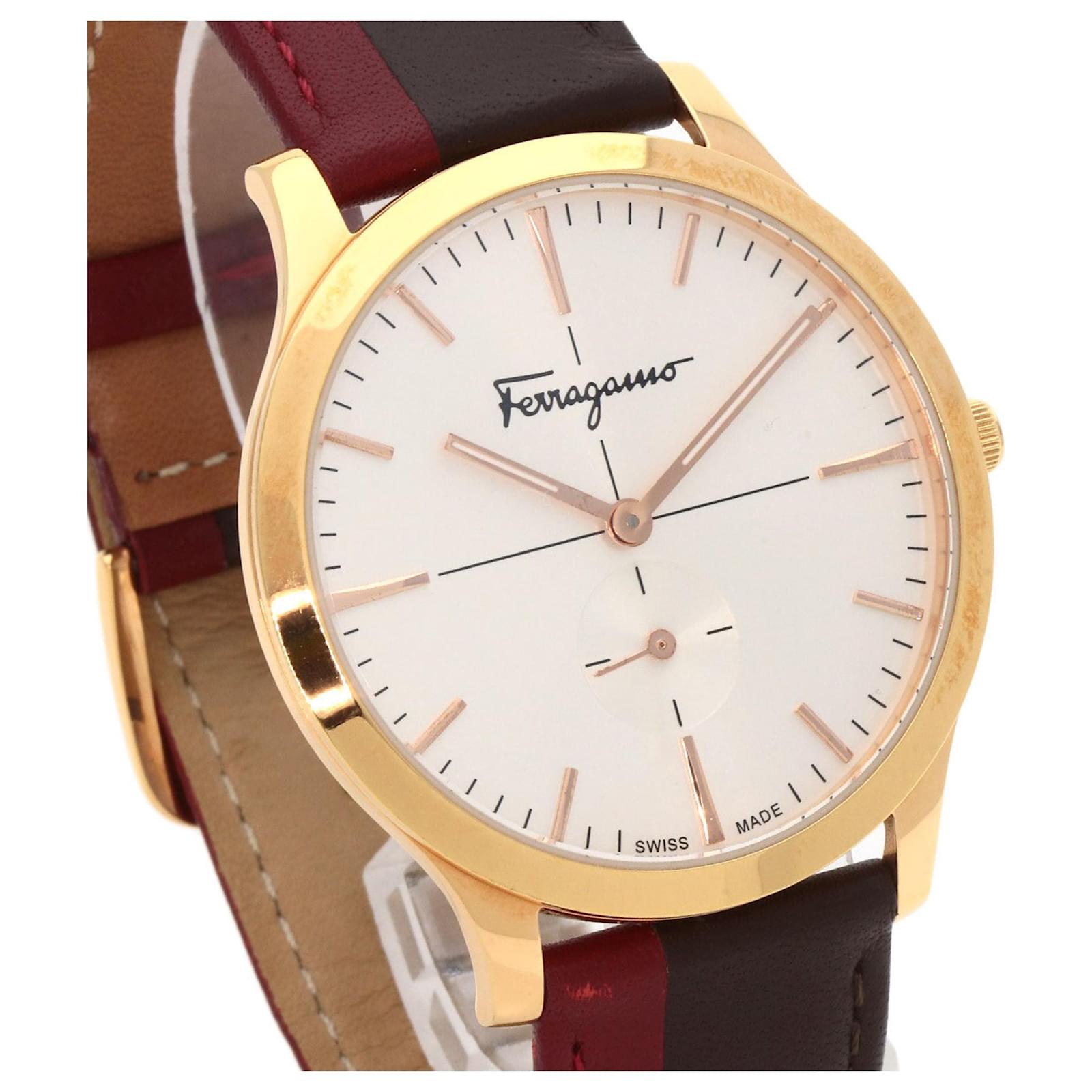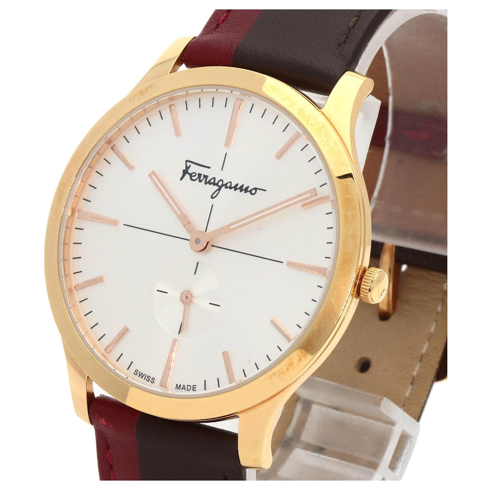 The Salvatore Ferragamo SFDE00618 Small Seconds Watch features a silver dial and is crafted with a pink gold plated case, complemented by a leather band. This wristwatch operates on a quartz movement and is designed to fit wrist sizes ranging from 15cm to 19cm (5.9” to 7.48”). The band width measures 20mm, while the case diameter is 40mm and thickness is 7.2mm. \n\nThis used watch is in good condition, classified as Rank B, with insignificant scratches on the case, bezel, crown, and case back. It shows traces of usage, but remains in acceptable condition for continued wear. The watch is water-resistant and comes with both an inner and outer box. Potential buyers are encouraged to review the provided images for a detailed view of the item’s condition and included accessories.