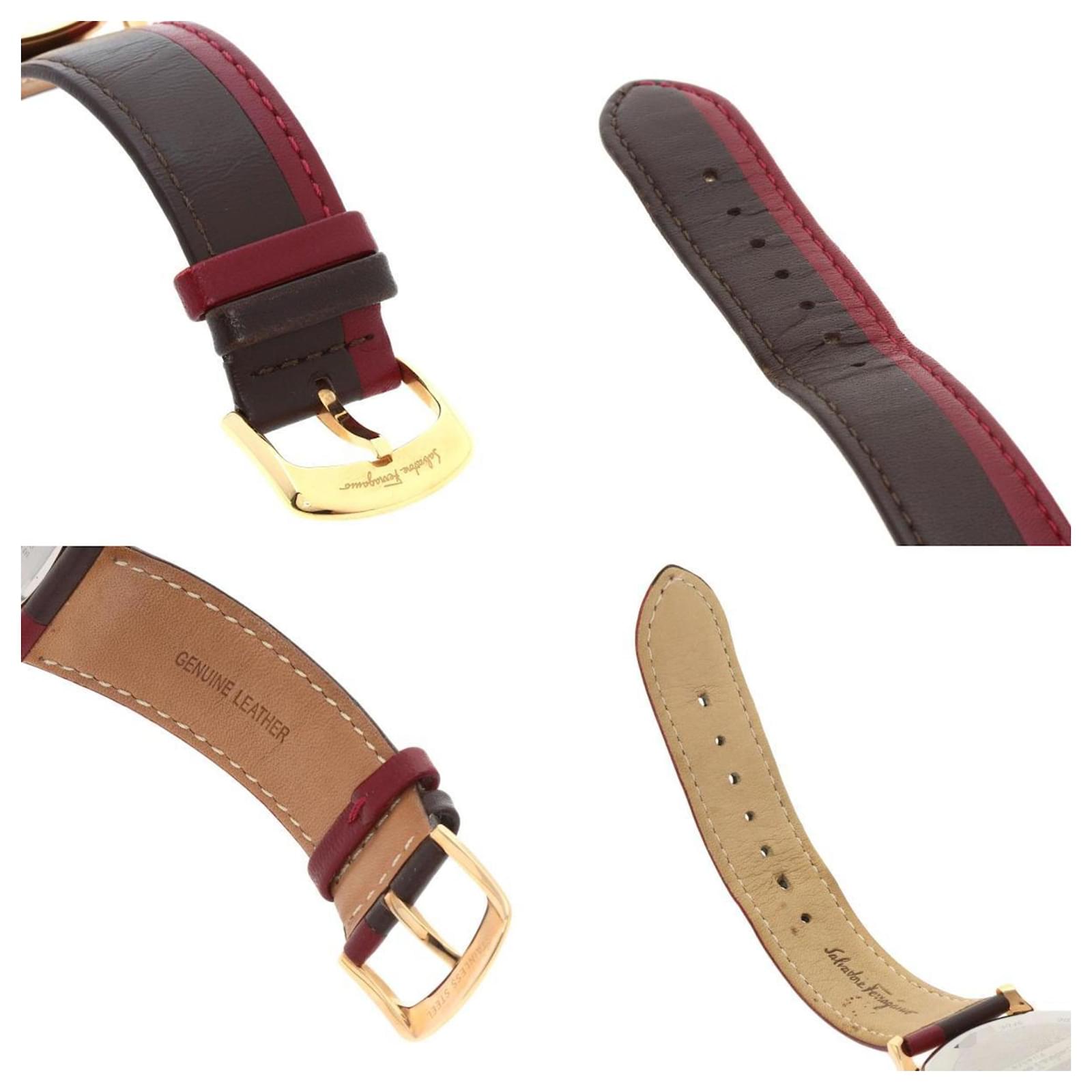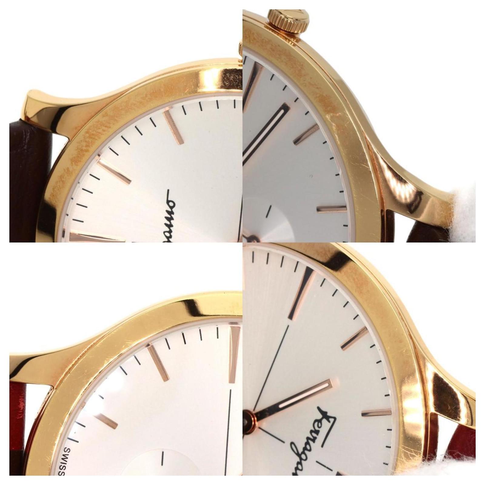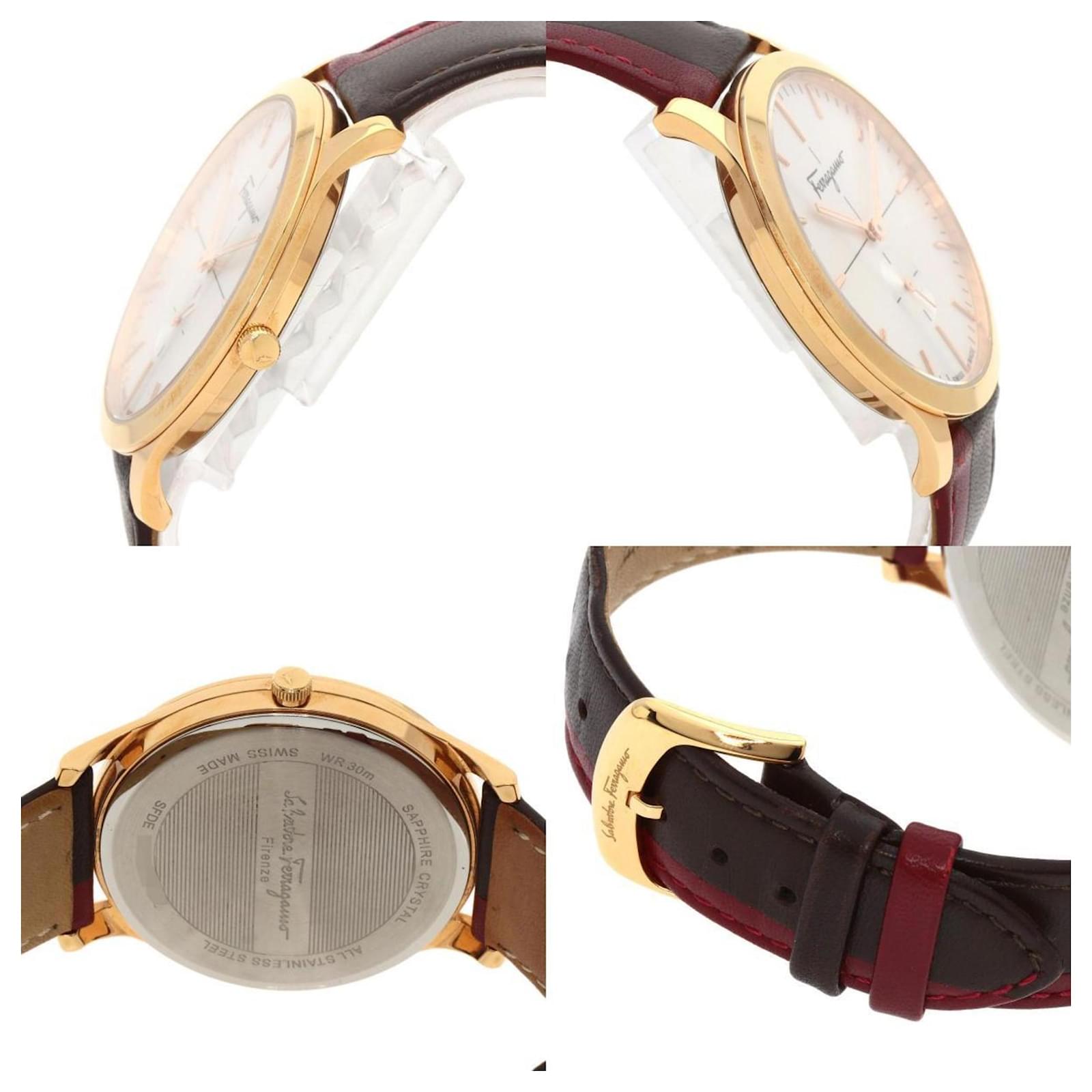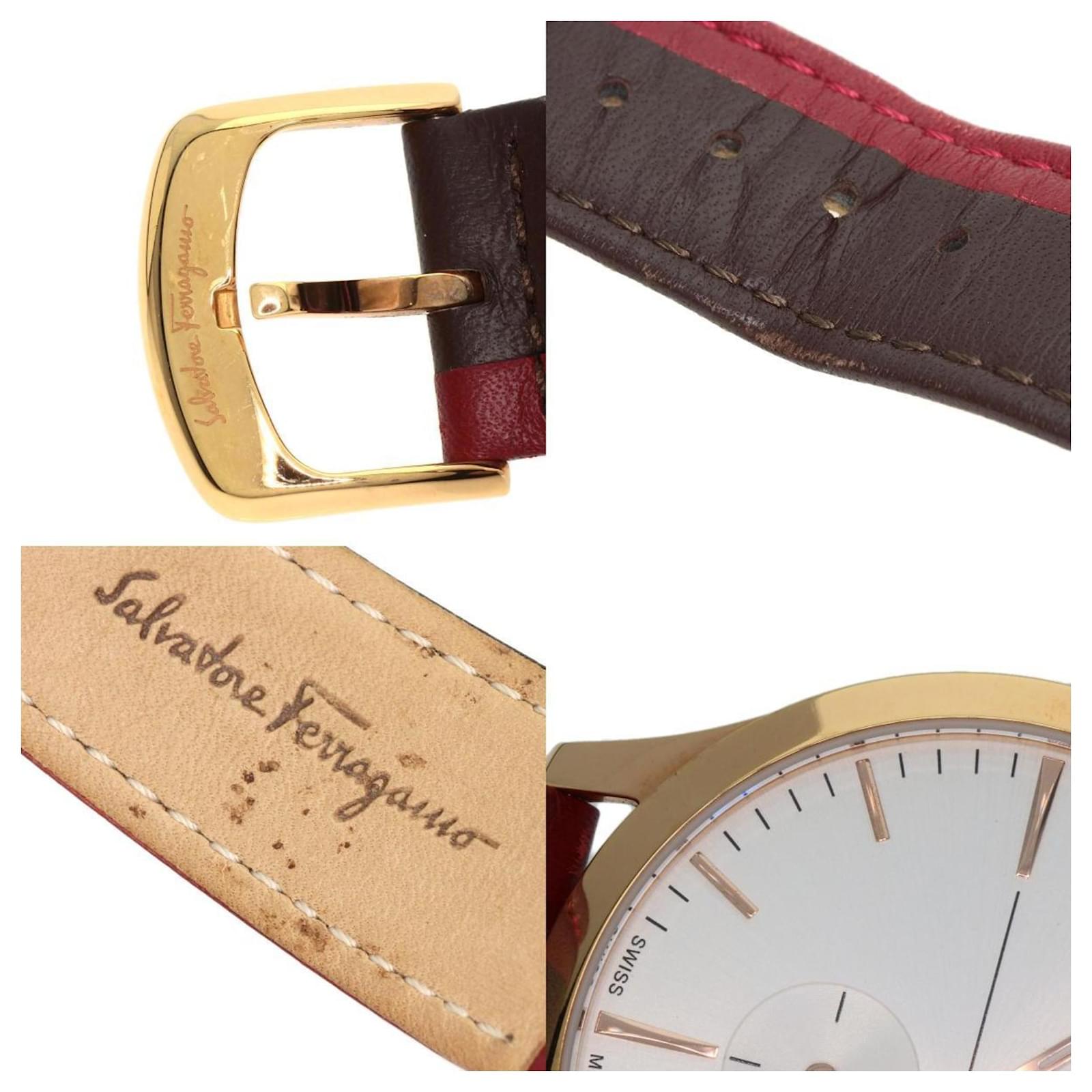 The Salvatore Ferragamo SFDE00618 Small Seconds Watch features a silver dial and is crafted with a pink gold plated case, complemented by a leather band. This wristwatch operates on a quartz movement and is designed to fit wrist sizes ranging from 15cm to 19cm (5.9” to 7.48”). The band width measures 20mm, while the case diameter is 40mm and thickness is 7.2mm. \n\nThis used watch is in good condition, classified as Rank B, with insignificant scratches on the case, bezel, crown, and case back. It shows traces of usage, but remains in acceptable condition for continued wear. The watch is water-resistant and comes with both an inner and outer box. Potential buyers are encouraged to review the provided images for a detailed view of the item’s condition and included accessories.