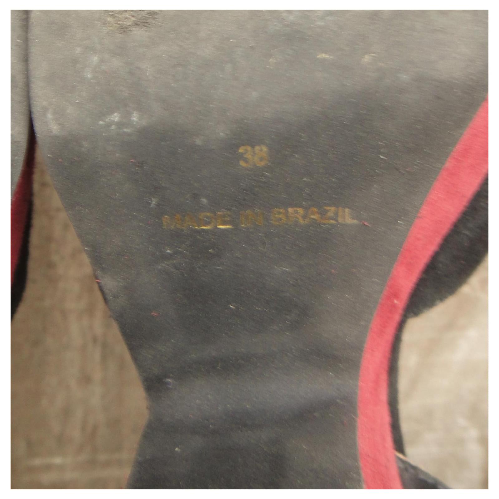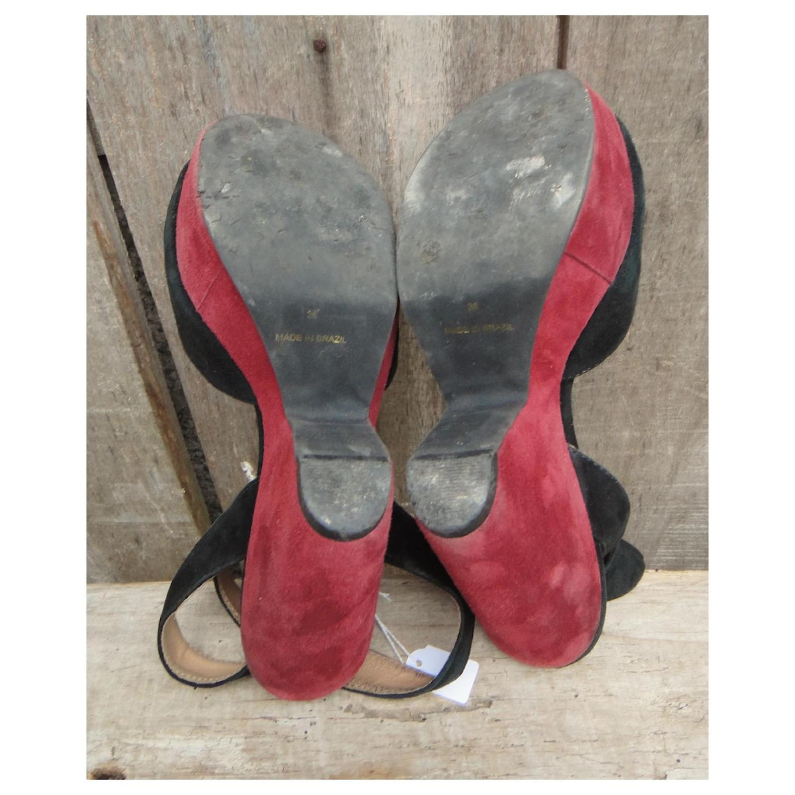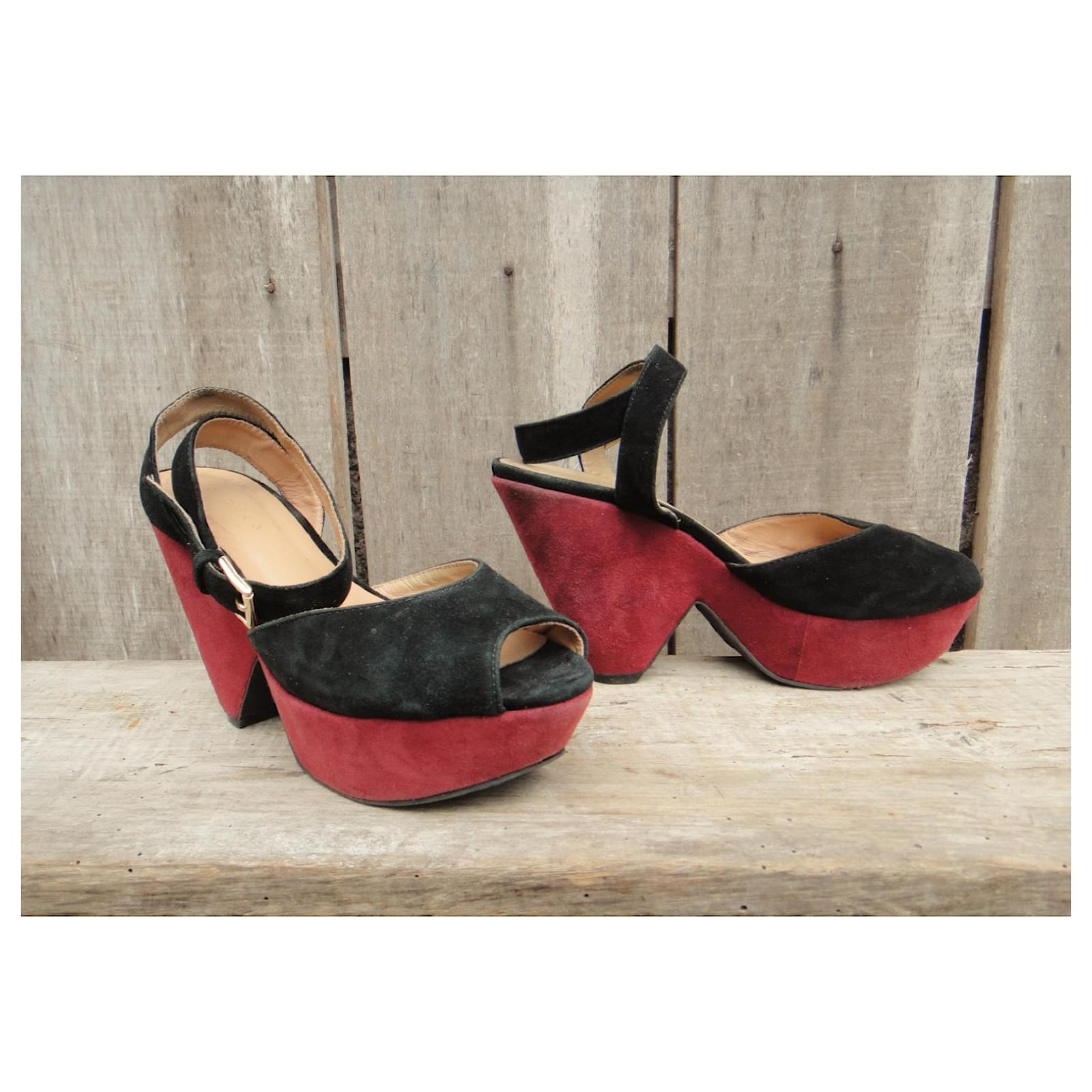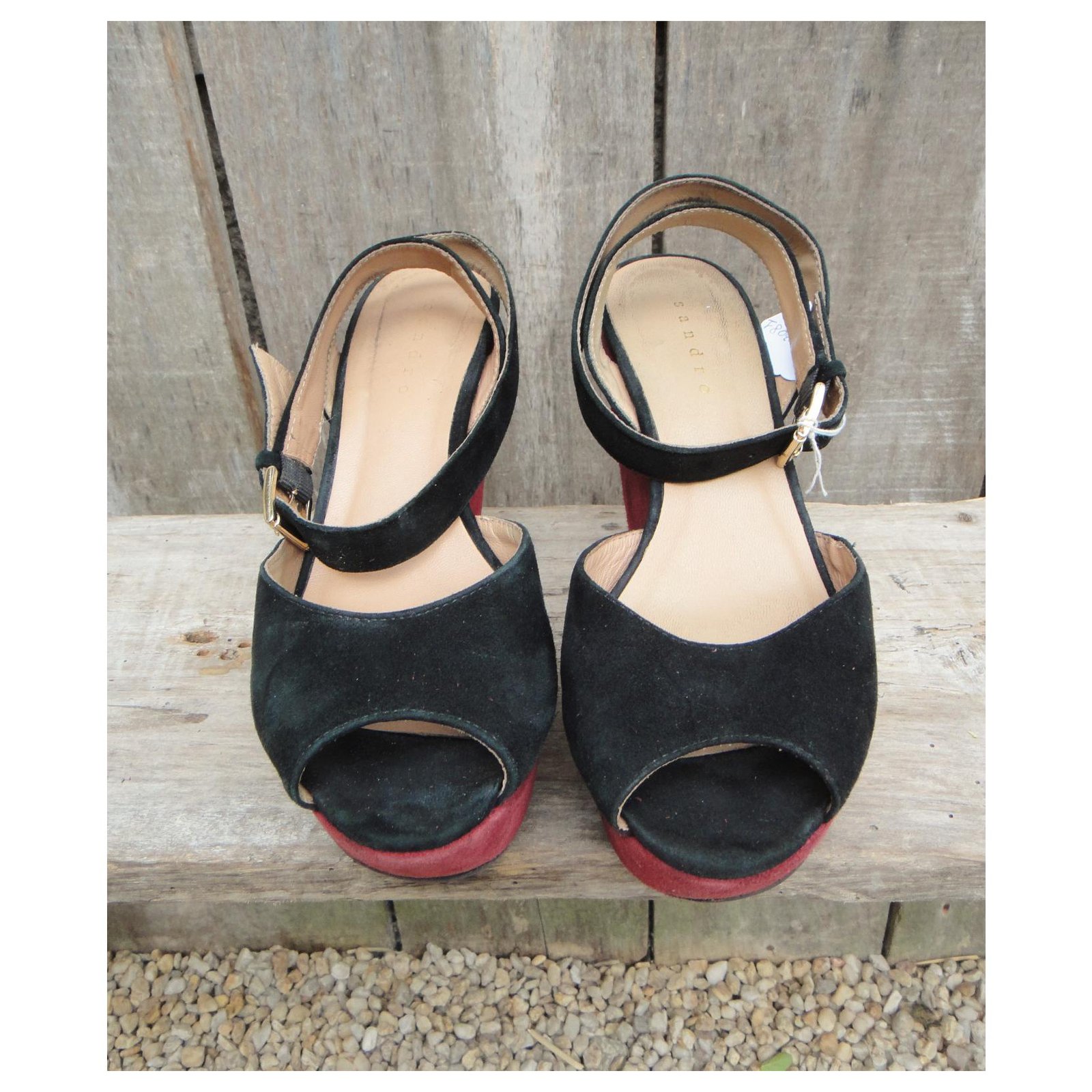 – Sandro sandals\r\n- shoe size 38\r\n- good condition: traces of use present, but light, No flaws\r\n- two-tone suede straps lined with leather, first leather, suede-trimmed platform and heels, Elastomer sole\r\n- heels of 10 cm, Plateau de 3,5 cm\r\n- impeccable graphic style, high-quality production: Sandro sandals the way we like them\r\n2106033