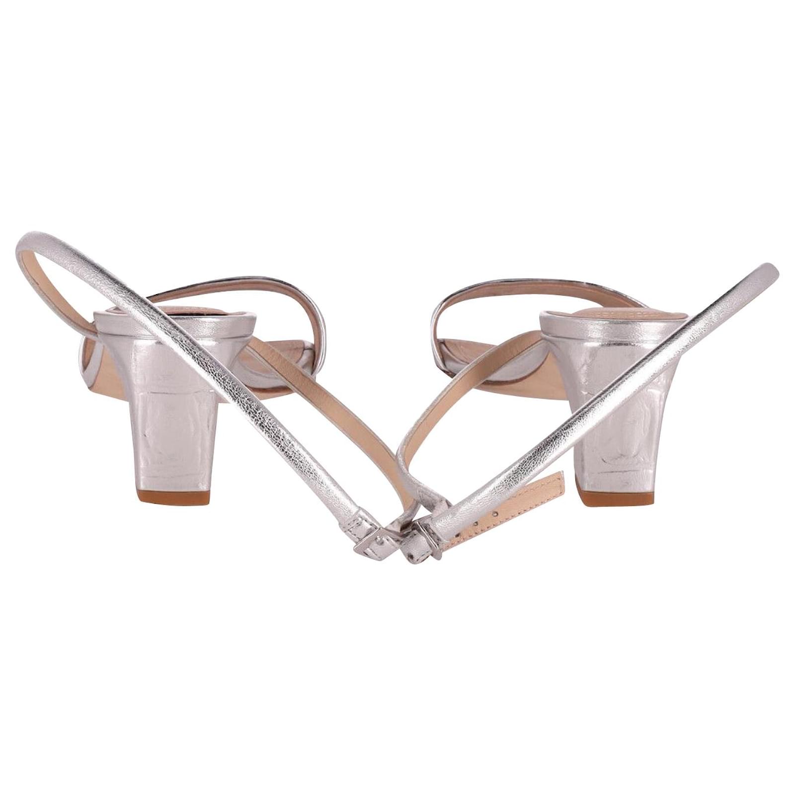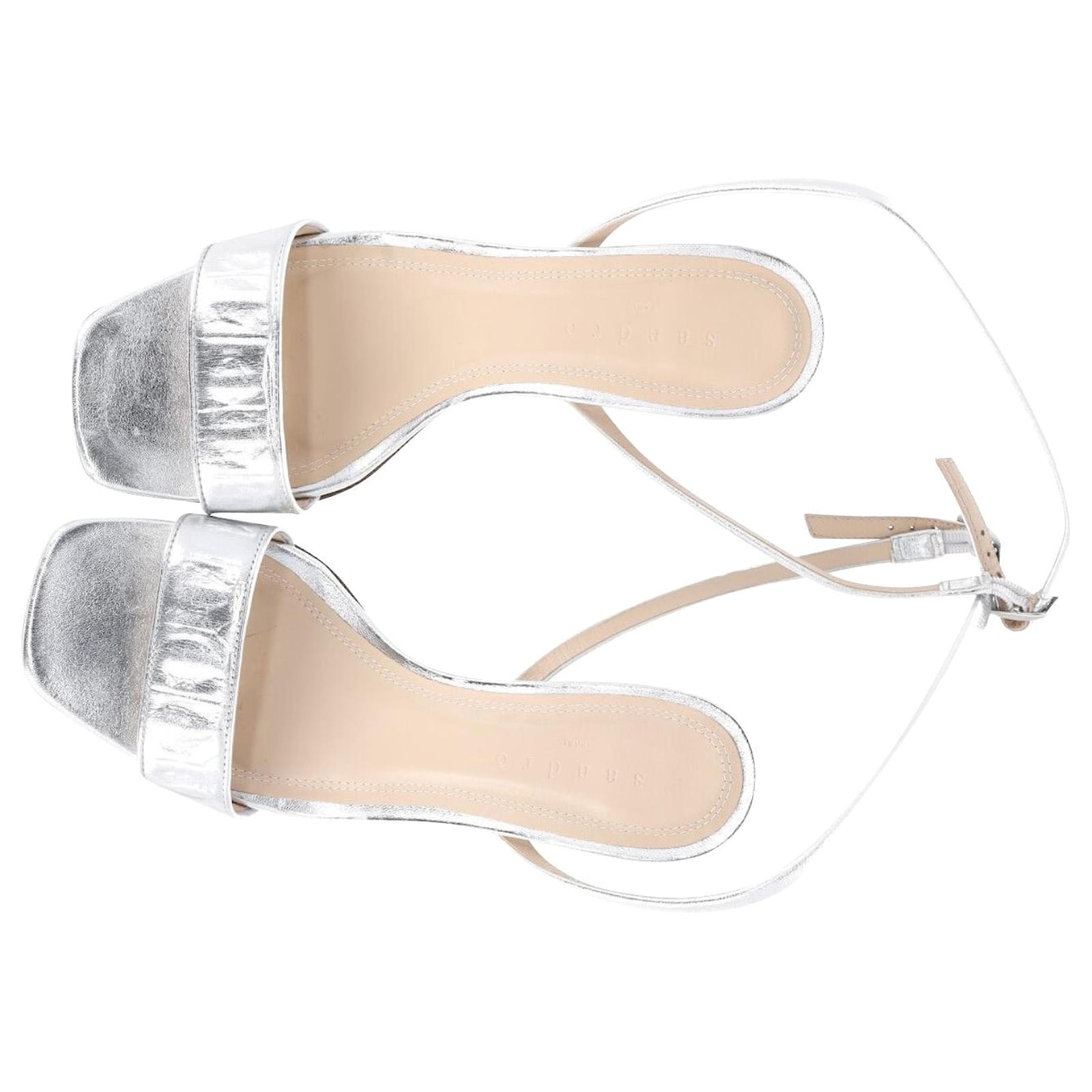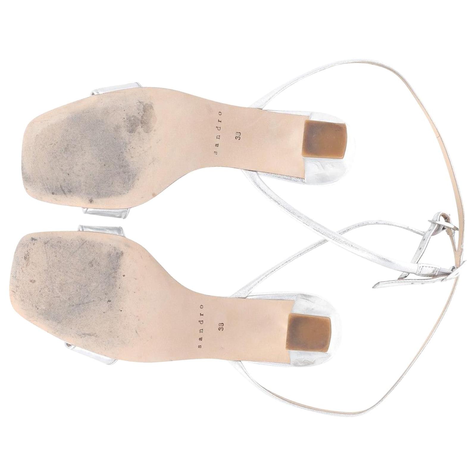 This gorgeous pair of silver sandals made of leather adds a classic touch to your look. These trendy sandals by Sandro Paris feature an open toe silhouette, single vamp straps, buckled ankle straps and mid block heels. The leather soles lend ultimate comfort. Wear these sandals and look chic wherever you go!\nSandro Paris Open Toe Strap Sandals in Silver Leather\ncondition: very good\nSign of wear: scuffmarks on soles and heels, dirt stain on insoles\nSKU: 183343 \nColor: Silver\nMaterial: leather\nSize: EU38/UK5/US7.5\n \n Product ID: 183343 \n