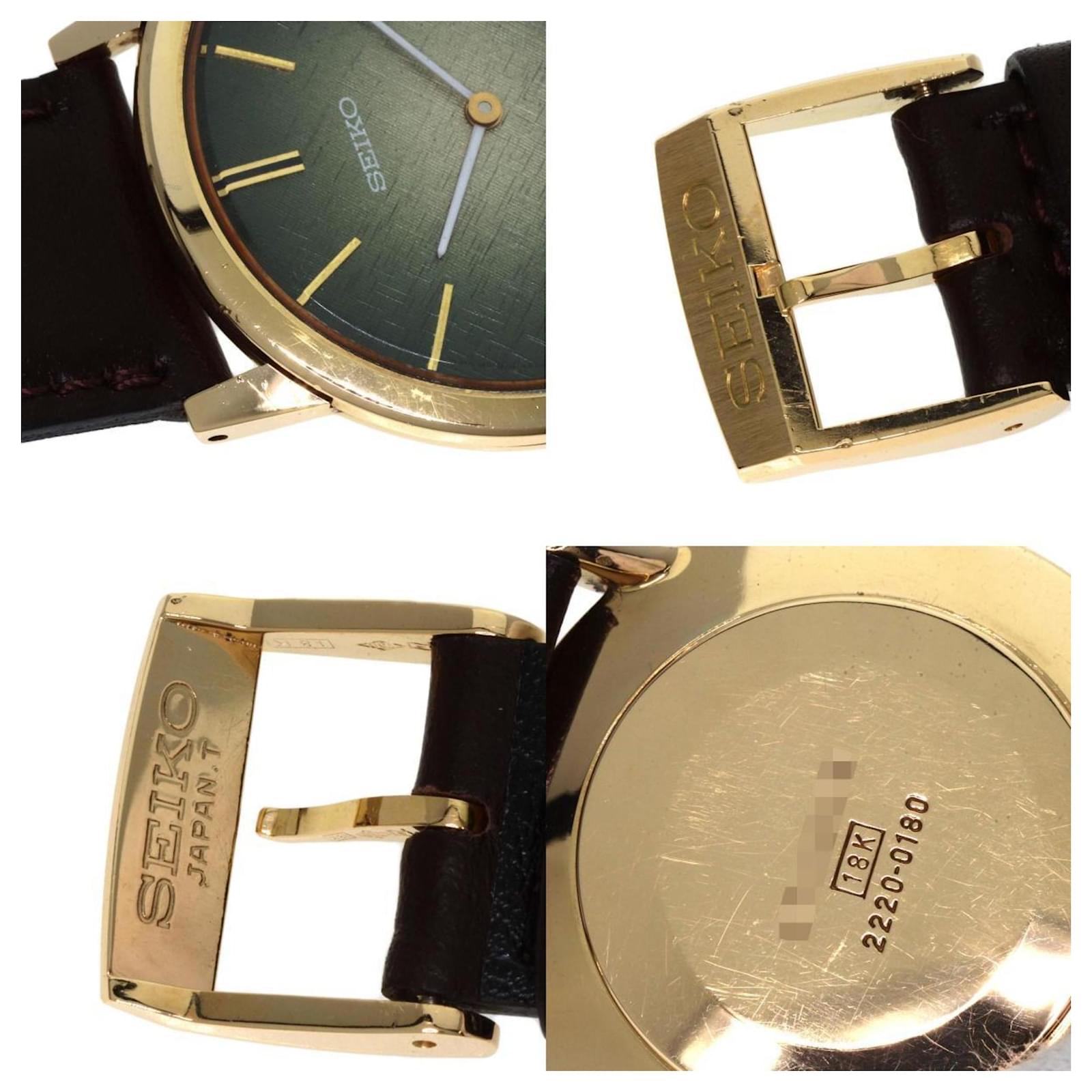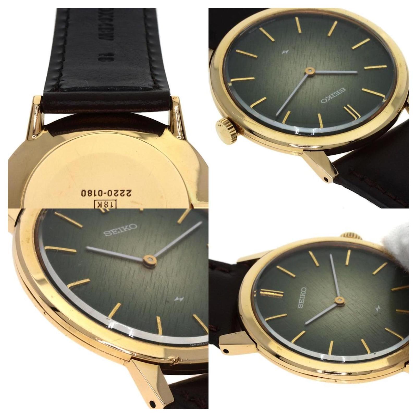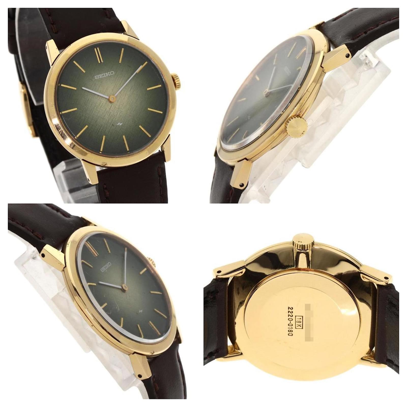 The Seiko 2220-0180 Chariot Watch features a green dial housed in an 18K yellow gold case, complemented by a leather band. This wristwatch operates on a manual winding mechanical movement and is designed to fit wrist sizes ranging from 14cm to 18cm (5.51” to 7.08”) with a case diameter of 33mm (1.3”). \n\nThis used timepiece is in very good condition, showing moderate scratches on the bezel and case, with slight scratches on the glass and case back. The dial remains largely unaffected, with insignificant signs of wear. It is important to review the provided images for a detailed view of the watch’s condition before purchasing. \n\nNo accessories are included with the watch.
