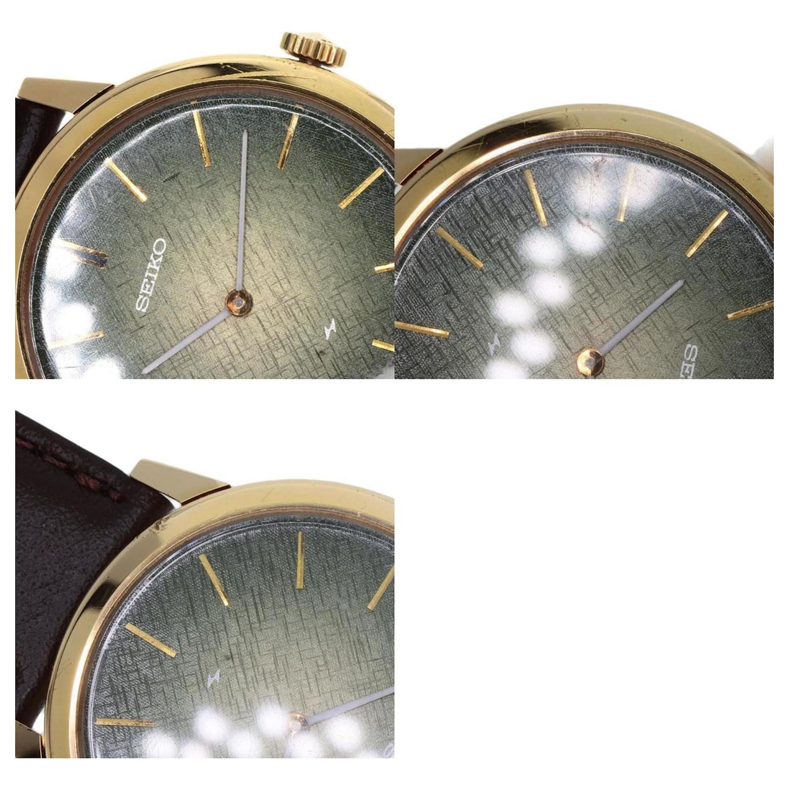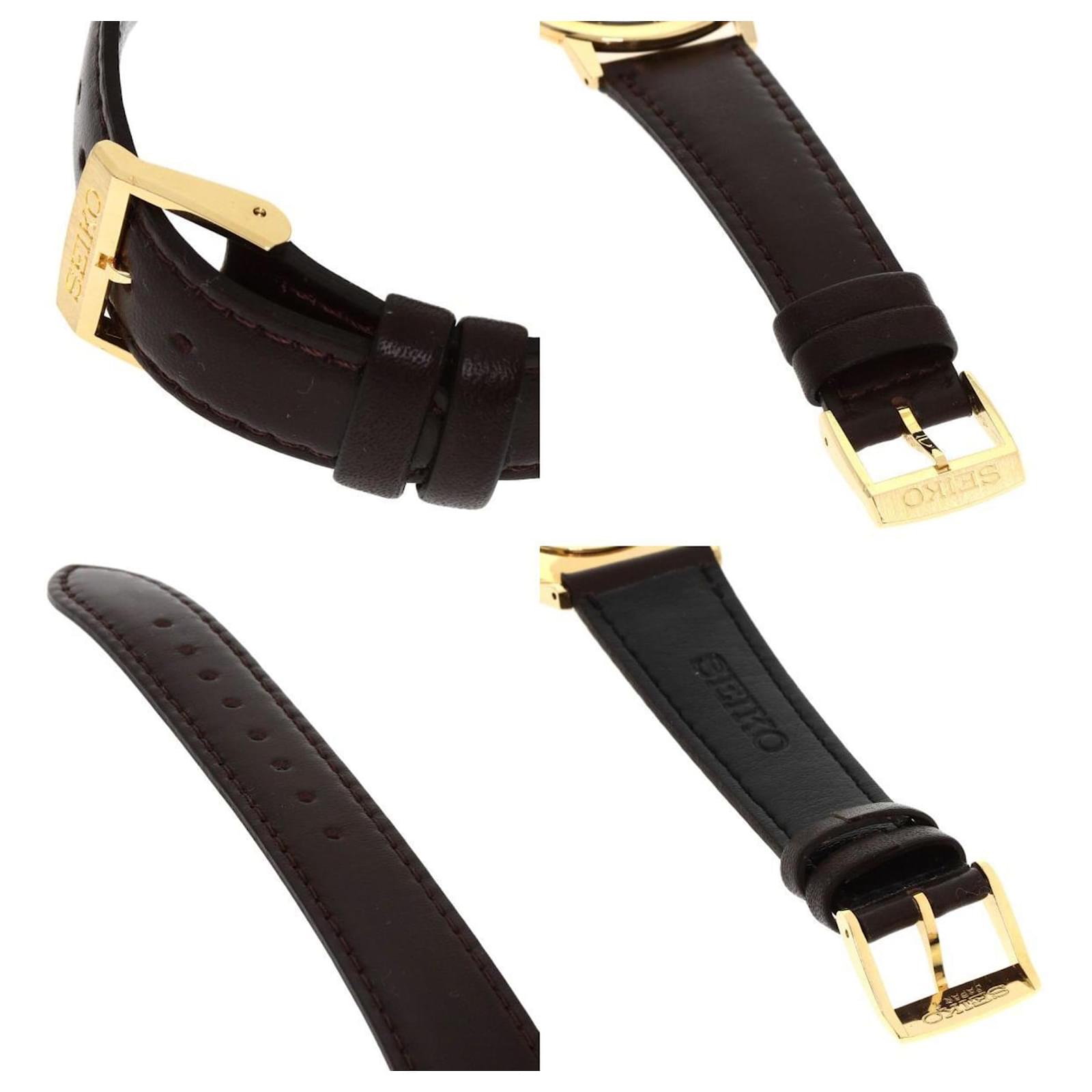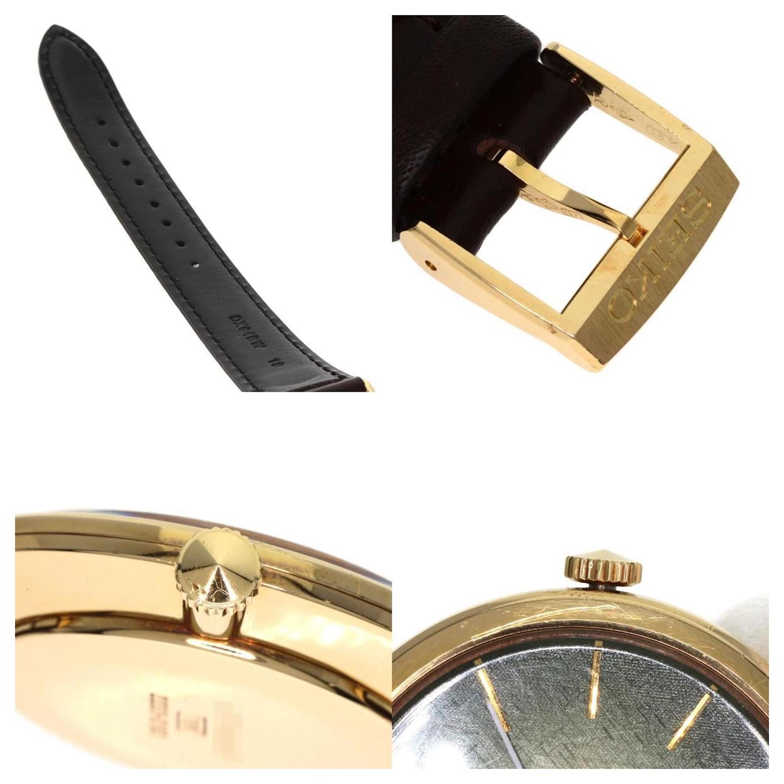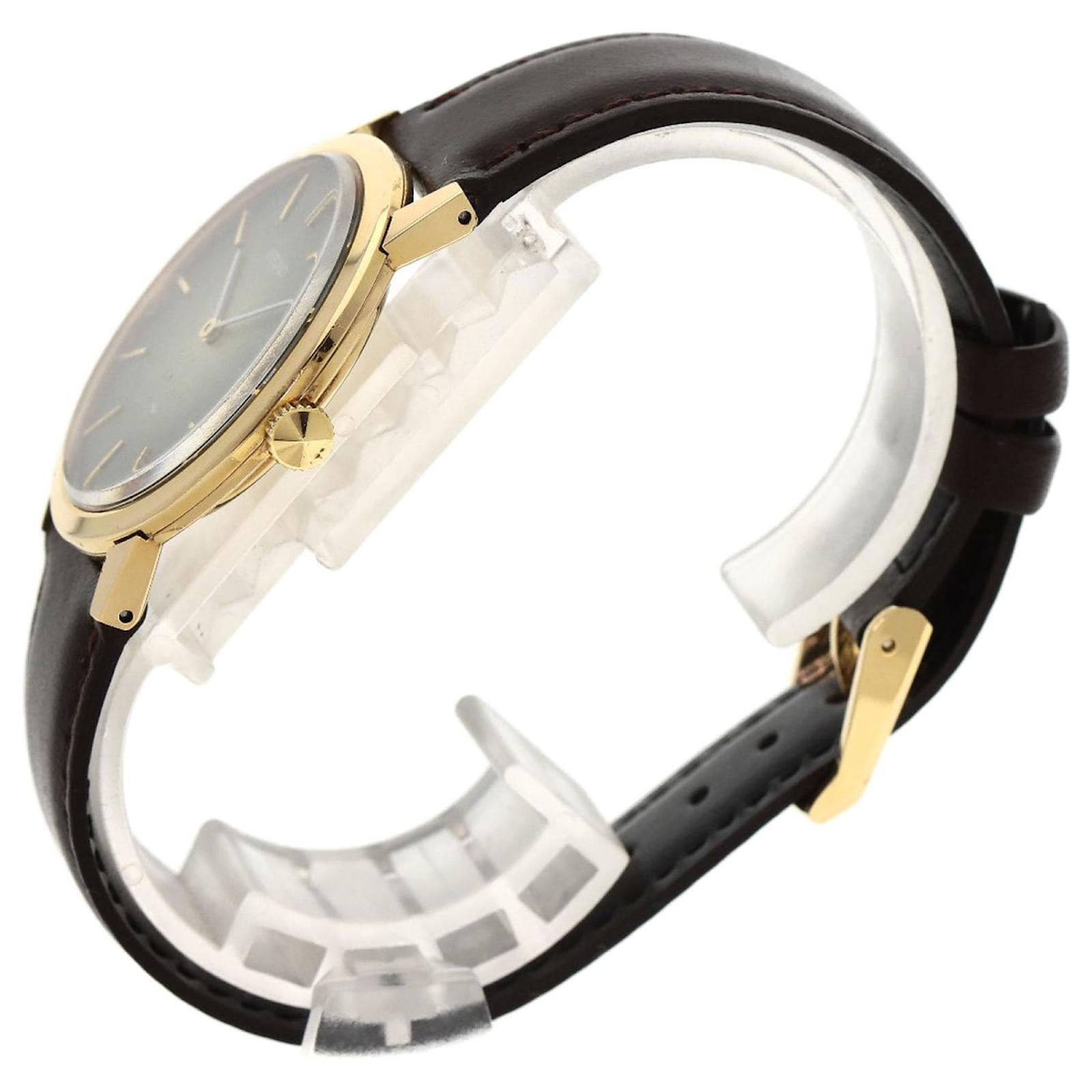 The Seiko 2220-0180 Chariot Watch features a green dial housed in an 18K yellow gold case, complemented by a leather band. This wristwatch operates on a manual winding mechanical movement and is designed to fit wrist sizes ranging from 14cm to 18cm (5.51” to 7.08”) with a case diameter of 33mm (1.3”). \n\nThis used timepiece is in very good condition, showing moderate scratches on the bezel and case, with slight scratches on the glass and case back. The dial remains largely unaffected, with insignificant signs of wear. It is important to review the provided images for a detailed view of the watch’s condition before purchasing. \n\nNo accessories are included with the watch.