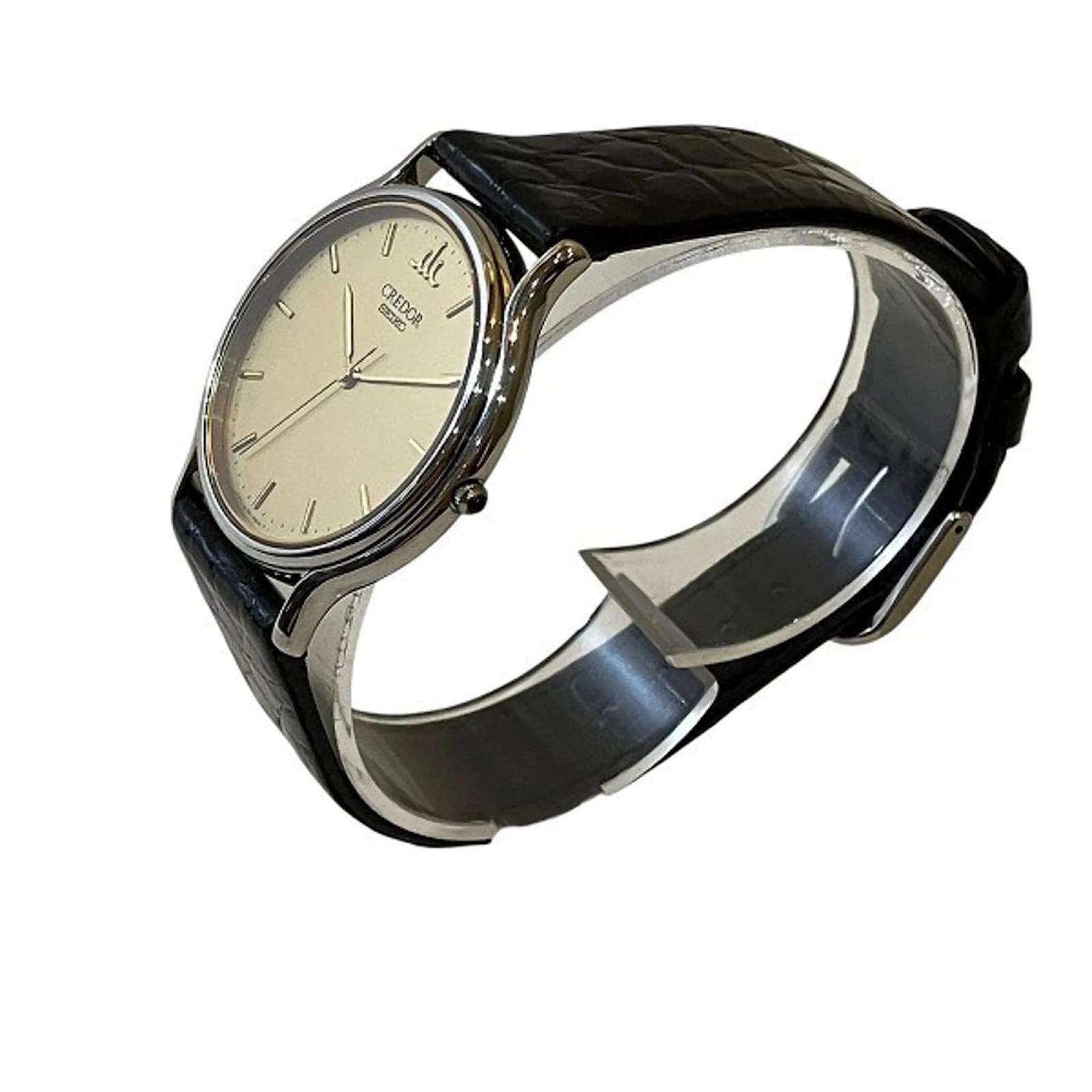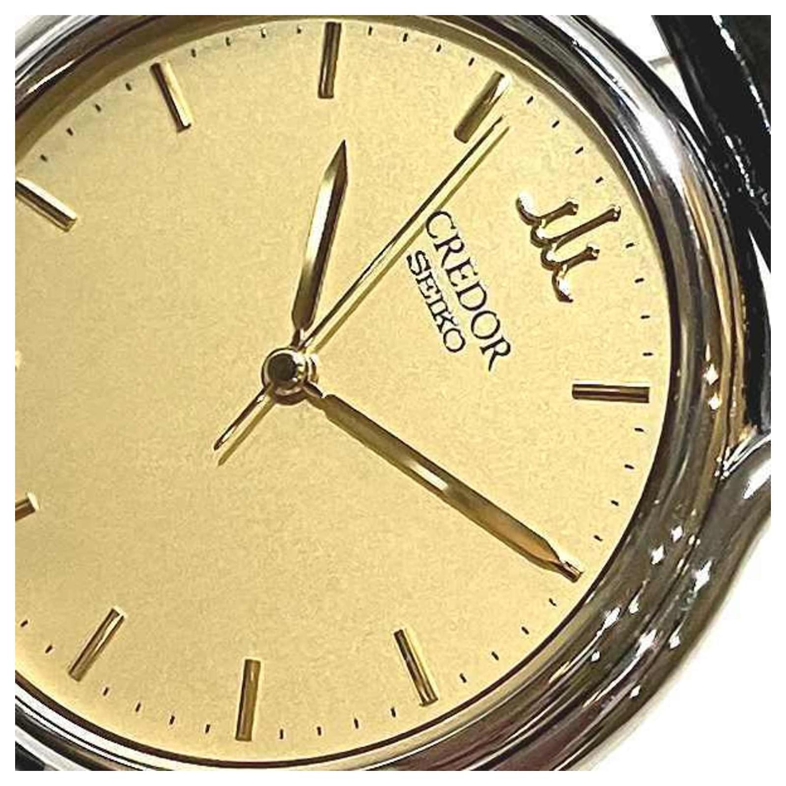 The Seiko Credor 8J81-6A30 is a men’s wristwatch featuring a gold dial and an analog display. The case is made of stainless steel, while the band is crafted from leather, providing a classic look. This watch operates on a quartz movement and is suitable for wrist sizes ranging from 14cm to 18cm (5.51” to 7.08”) with a case diameter of 31mm (1.22”). \n\nThis pre-owned timepiece is in very good condition, showing slight scratches on the bezel, case, and band, with insignificant wear on the dial and glass. It is classified as Rank A, indicating minimal traces of usage. Potential buyers are encouraged to review the provided images for a detailed view of the watch’s condition. No accessories are included with the purchase.