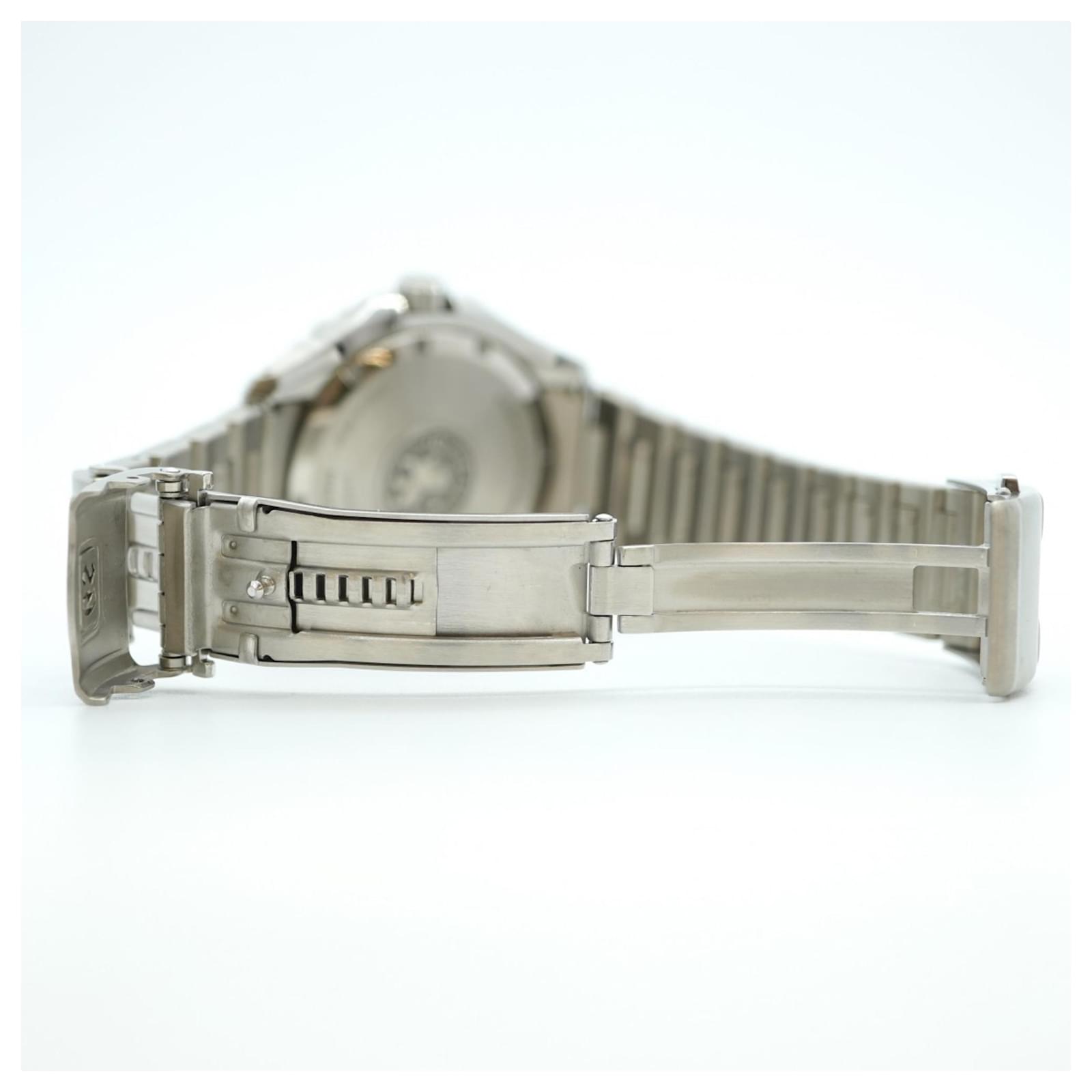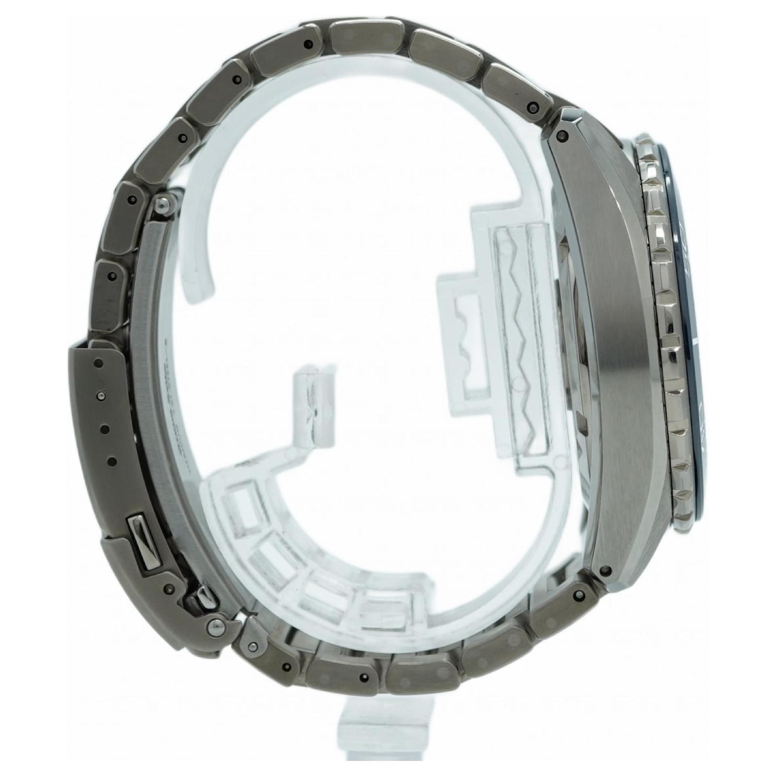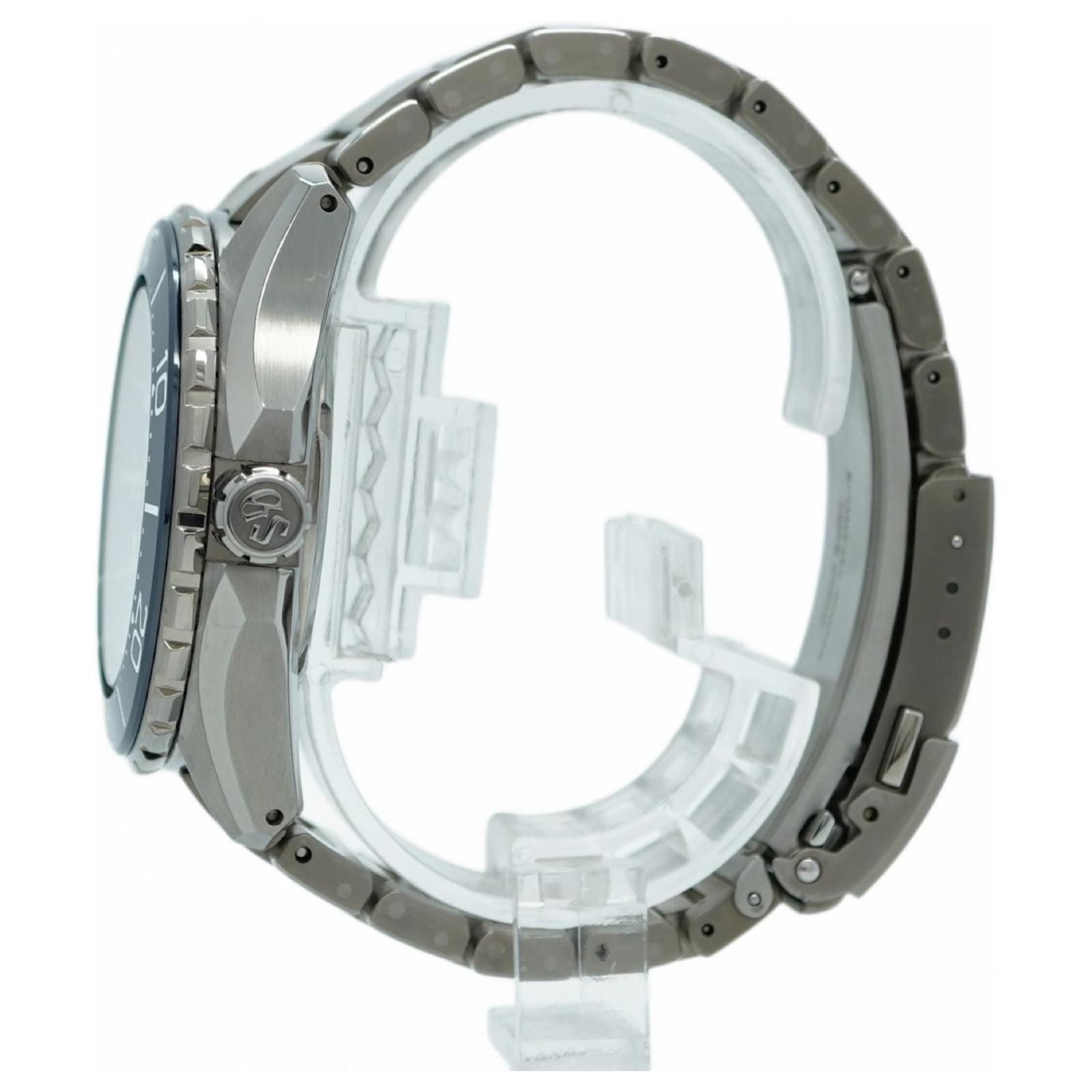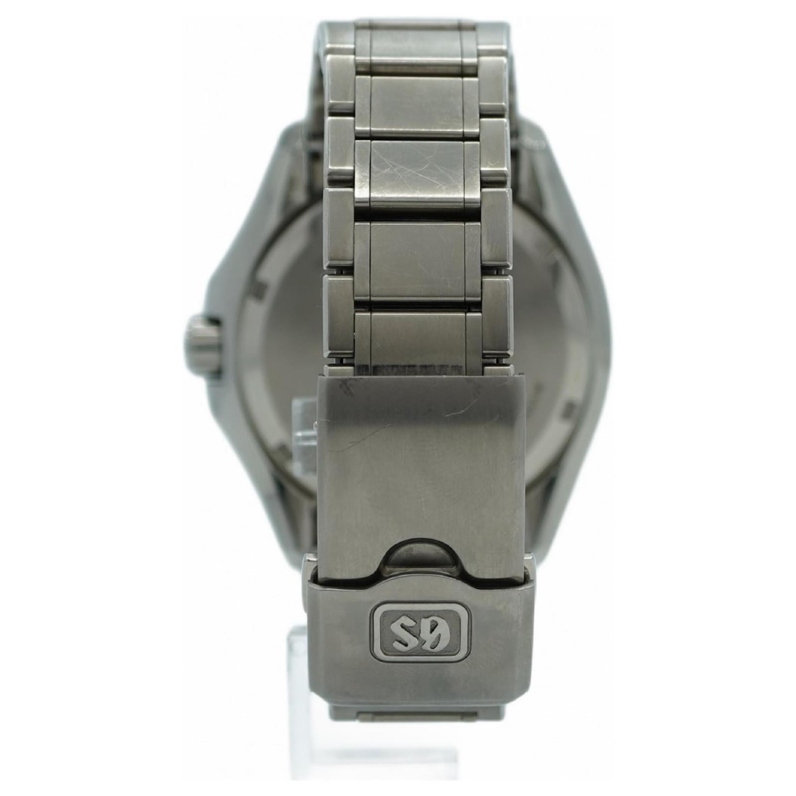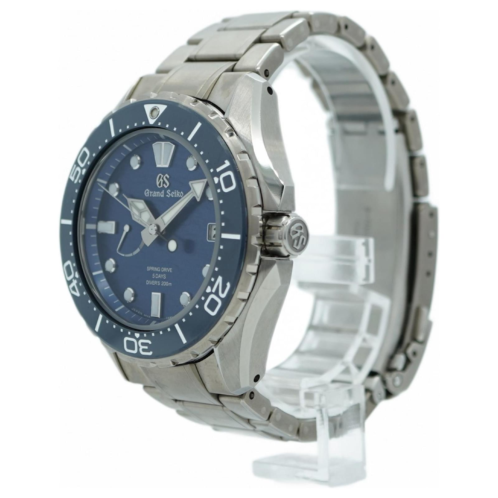 The Seiko Grand 9RA5-0AC0 is a men’s wristwatch featuring a blue dial and a titanium band, designed for durability and style. This self-winding automatic watch has a case diameter of 43.9mm and is suitable for a wrist size of 16.5cm (6.49 inches). \n\nThis pre-owned timepiece is in good condition, showing slight signs of wear including minor scratches on the bezel, case back, dial, glass, and crown. The watch comes with a guarantee card and both inner and outer boxes. Potential buyers are encouraged to review the images for a detailed view of the item’s condition.