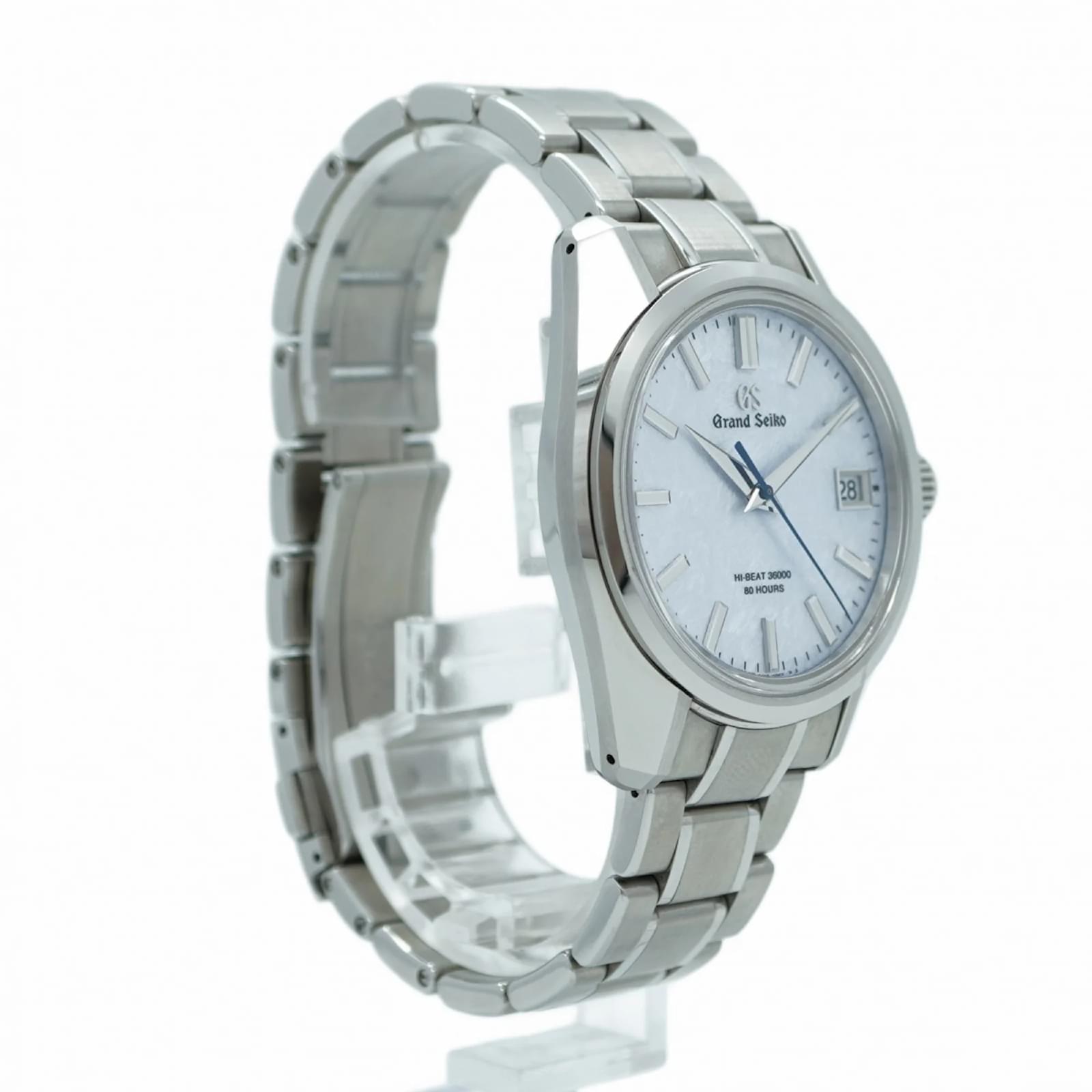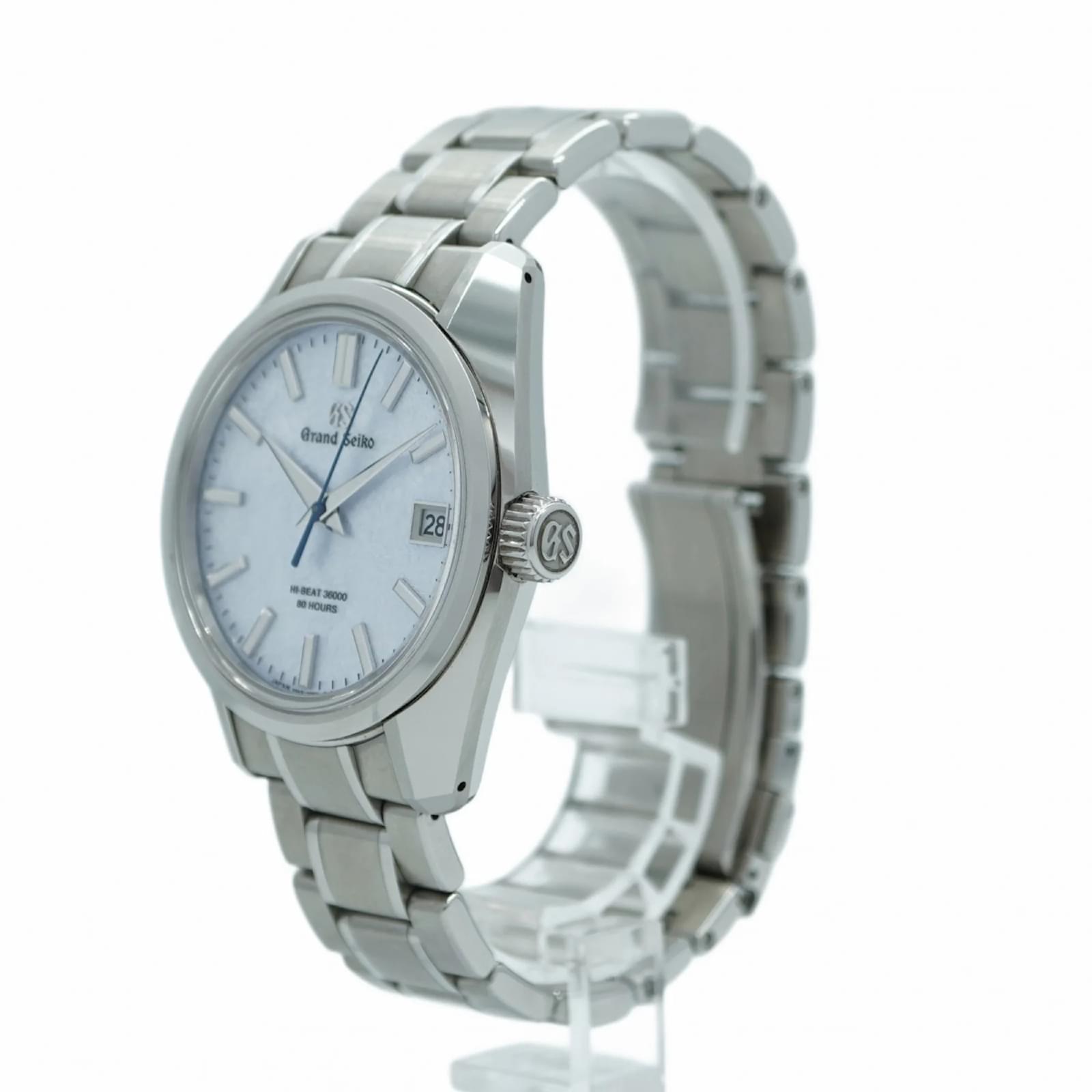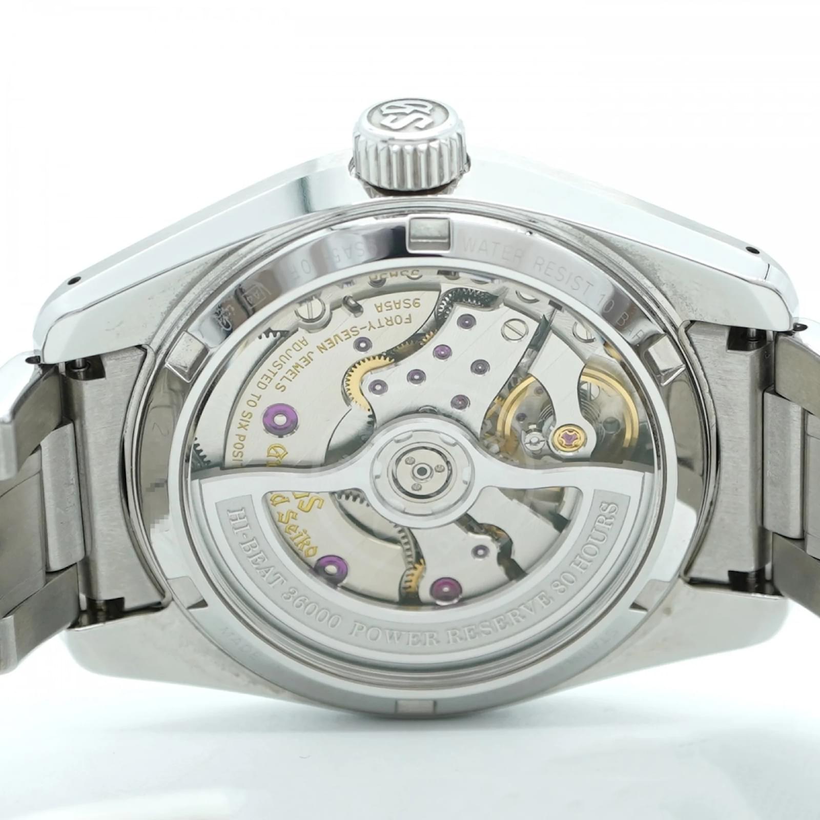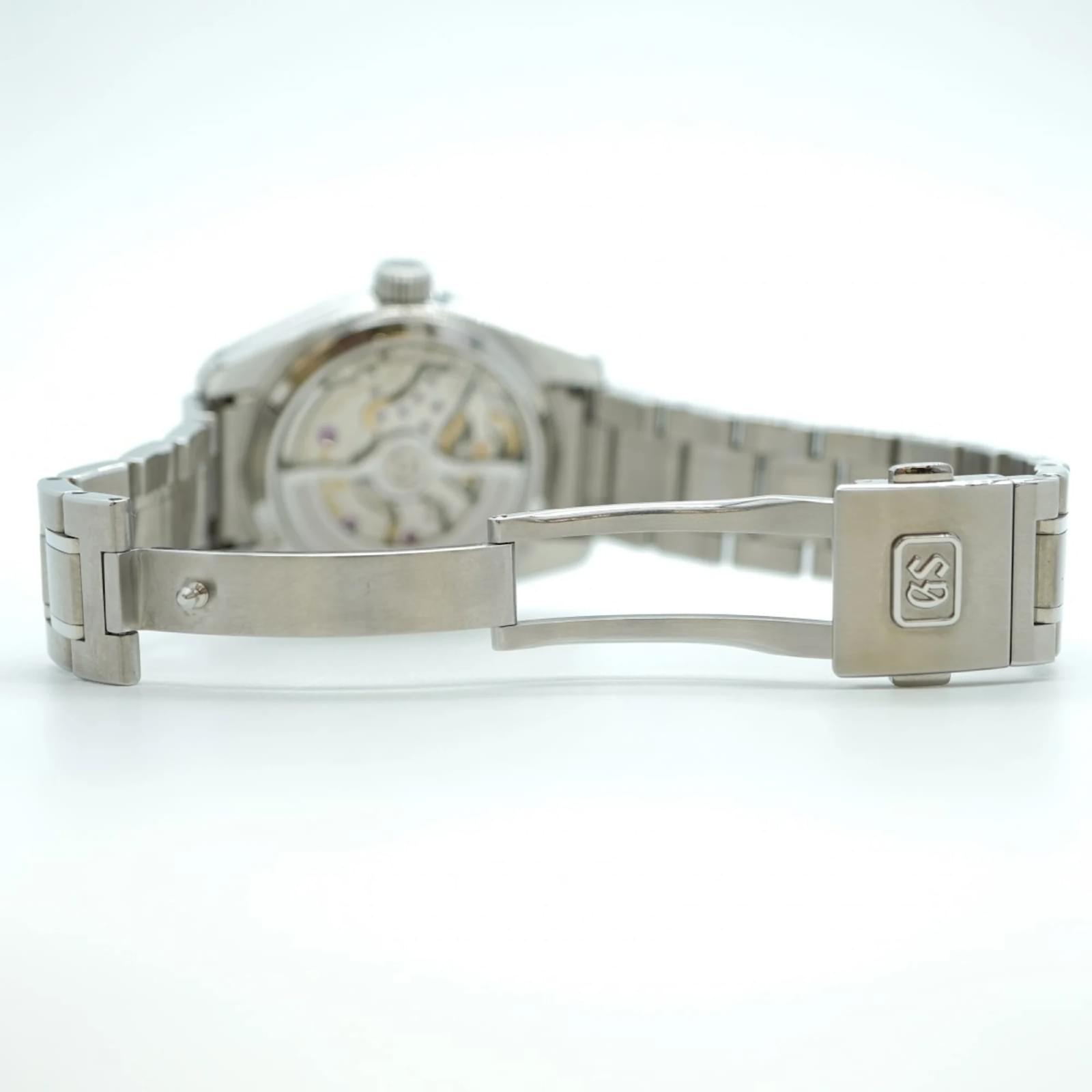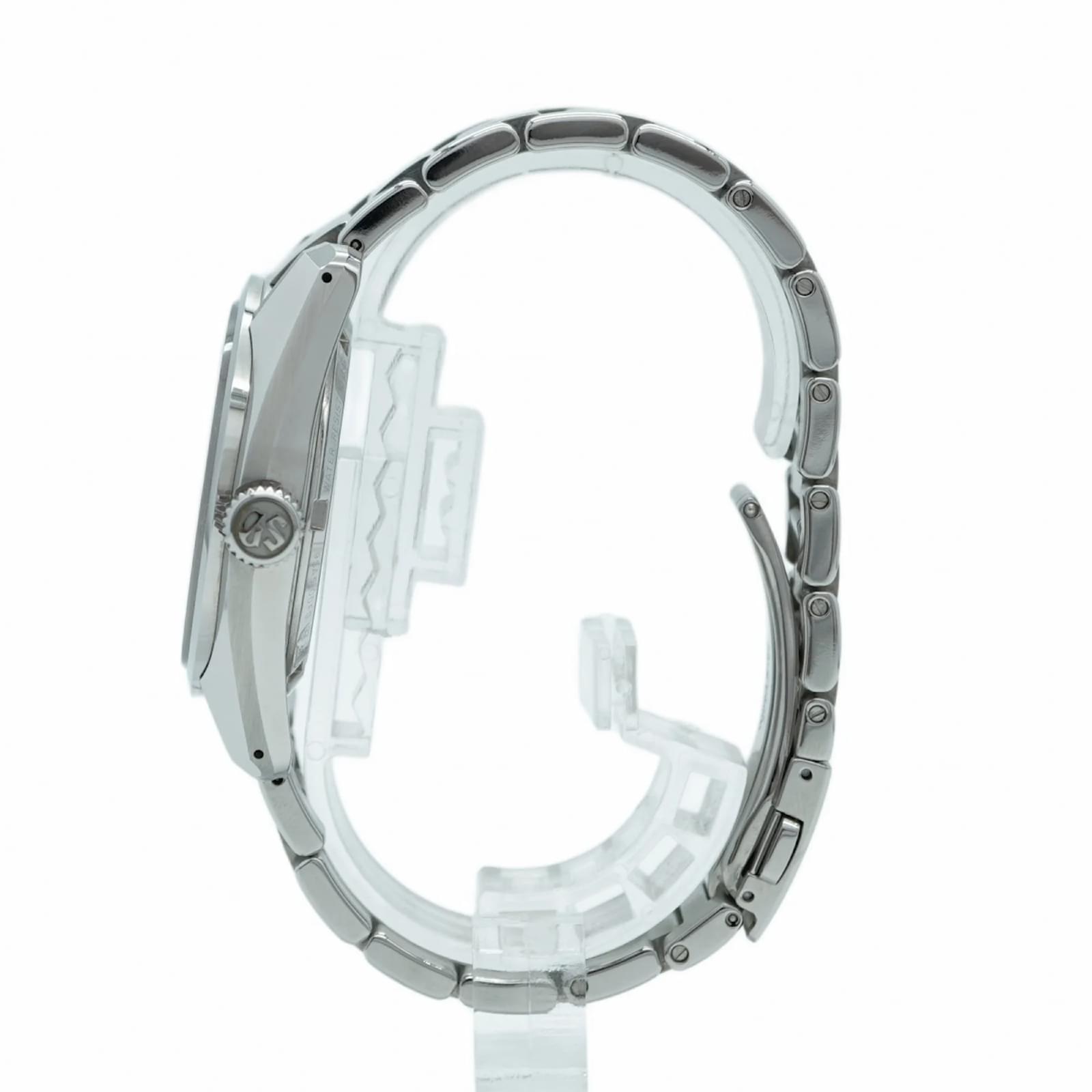 The Seiko Grand 9SA5-00F0 is a men’s wristwatch featuring a silver dial and a stainless steel band. This self-winding automatic timepiece has a case diameter of 40mm and is suitable for a wrist size of 19cm (7.48 inches). \n\nThis watch is in very good used condition, with insignificant scratches on the bezel, case back, dial, glass, and crown. It shows minimal signs of wear, classified as Rank A, indicating a few traces of usage. \n\nIncluded with the watch are a guarantee card, an inner box, and an outer box. Potential buyers are encouraged to review the images for a detailed view of the item’s condition and included accessories.