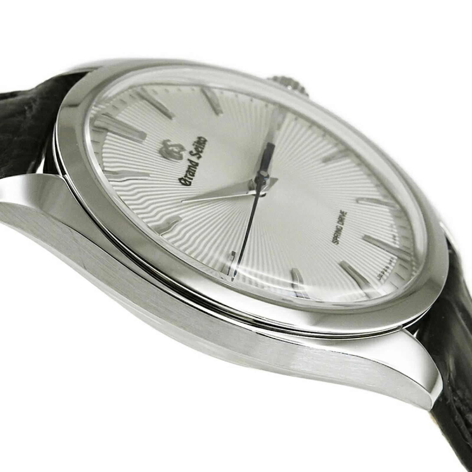The Seiko Grand Seiko Elegance Collection SBGY003 is a wristwatch that features a stainless steel case and a Spring Drive movement. With a case diameter of 38.5mm and a thickness of 10mm, it offers a balanced size for comfortable wear. The band width measures 19mm, making it suitable for various wrist sizes. This model is part of a limited edition celebrating the 20th anniversary of the Spring Drive. \n\nThe watch is water-resistant and comes in used condition, classified as Rank AB, indicating it has traces of usage, including some scratches and dirt, but remains in generally good condition. The band has been replaced, and the watch has undergone maintenance through an overhaul. \n\nIncluded with the watch are a booklet, certificate, and both inner and outer boxes. Potential buyers are encouraged to review the images for a clear understanding of the item’s condition and included accessories.