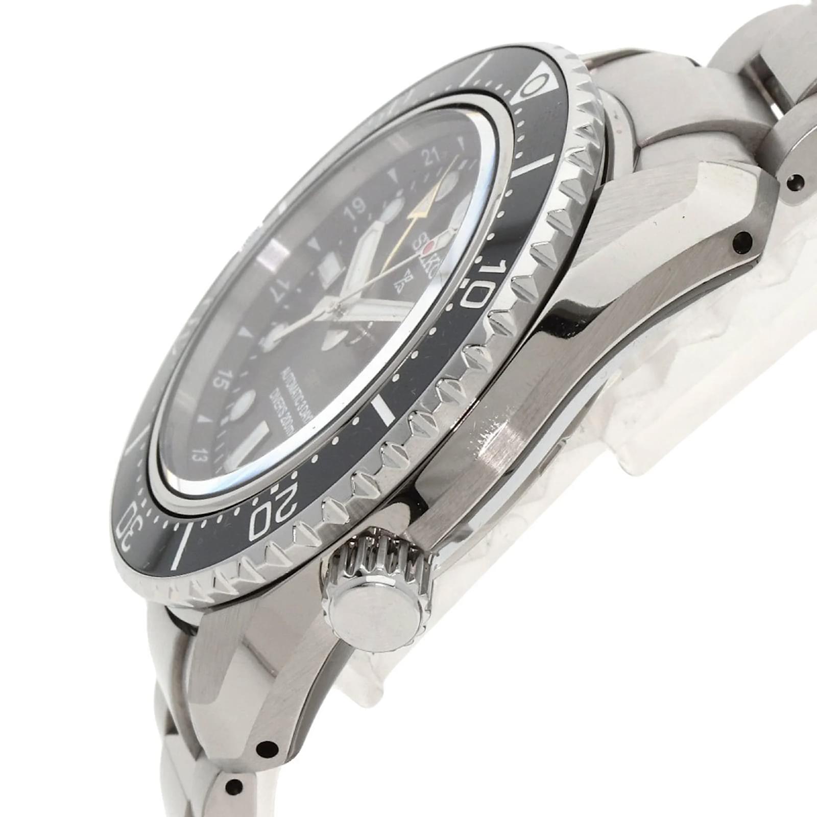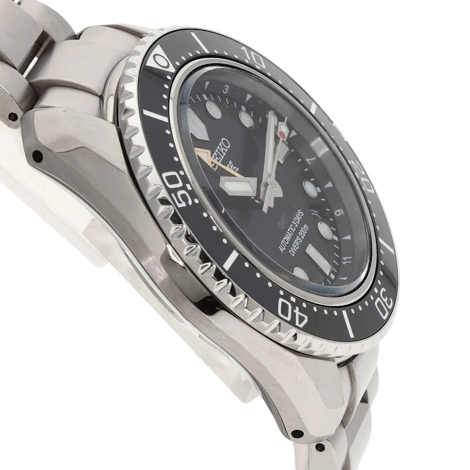The Seiko SBEJ011 6R54-00D0 Prospex Diver Watch is a stainless steel wristwatch designed for men. It features a black dial and is powered by a self-winding automatic movement. The watch has a case diameter of 42mm and is suitable for a wrist size of 19.5cm (7.67 inches). \n\nThis particular model is in good used condition, with moderate scratches on the case and bezel, while the case back shows slight wear. The dial and glass are free from scratches, and the hands are in good condition. The bracelet has slight scratches and is noted to be slightly loose, with minor scuffs and haze on the buckle and clasp. \n\nIncluded with the watch is the inner box, and potential buyers are encouraged to review the images for a detailed view of the item’s condition. The watch is branded by Seiko and is part of their Prospex line, known for its durability and functionality.