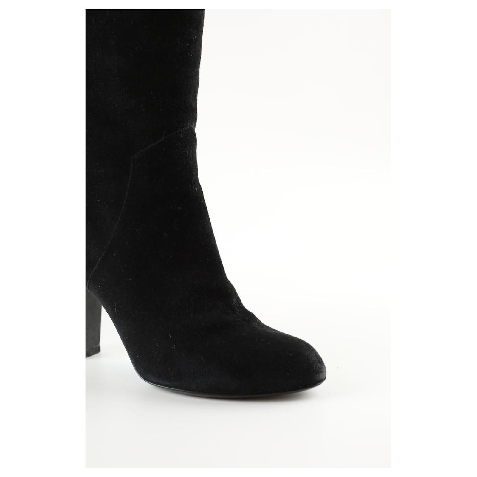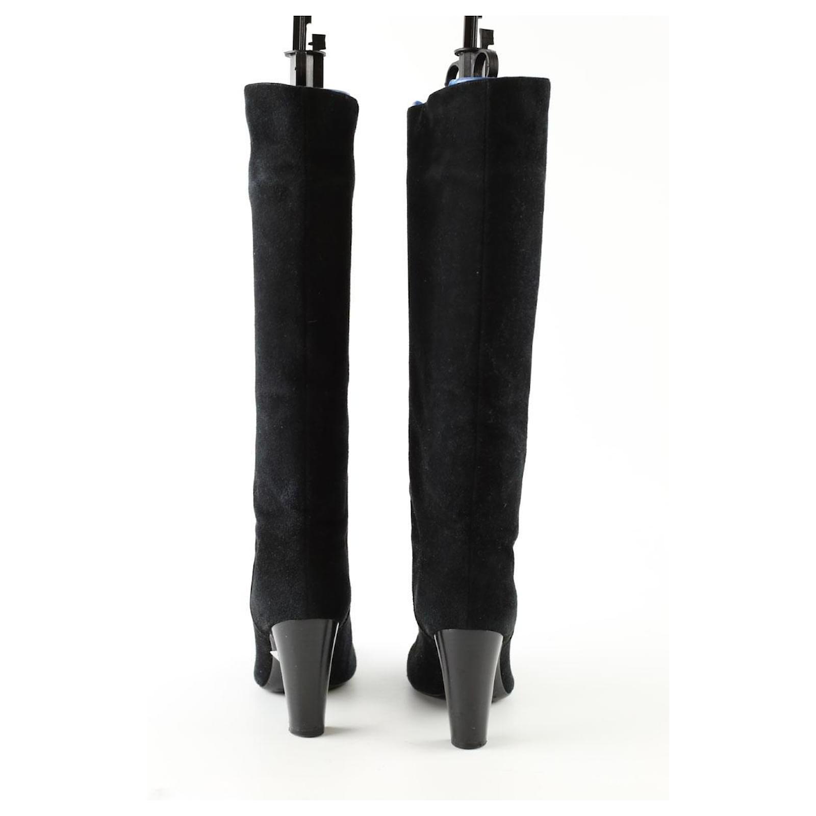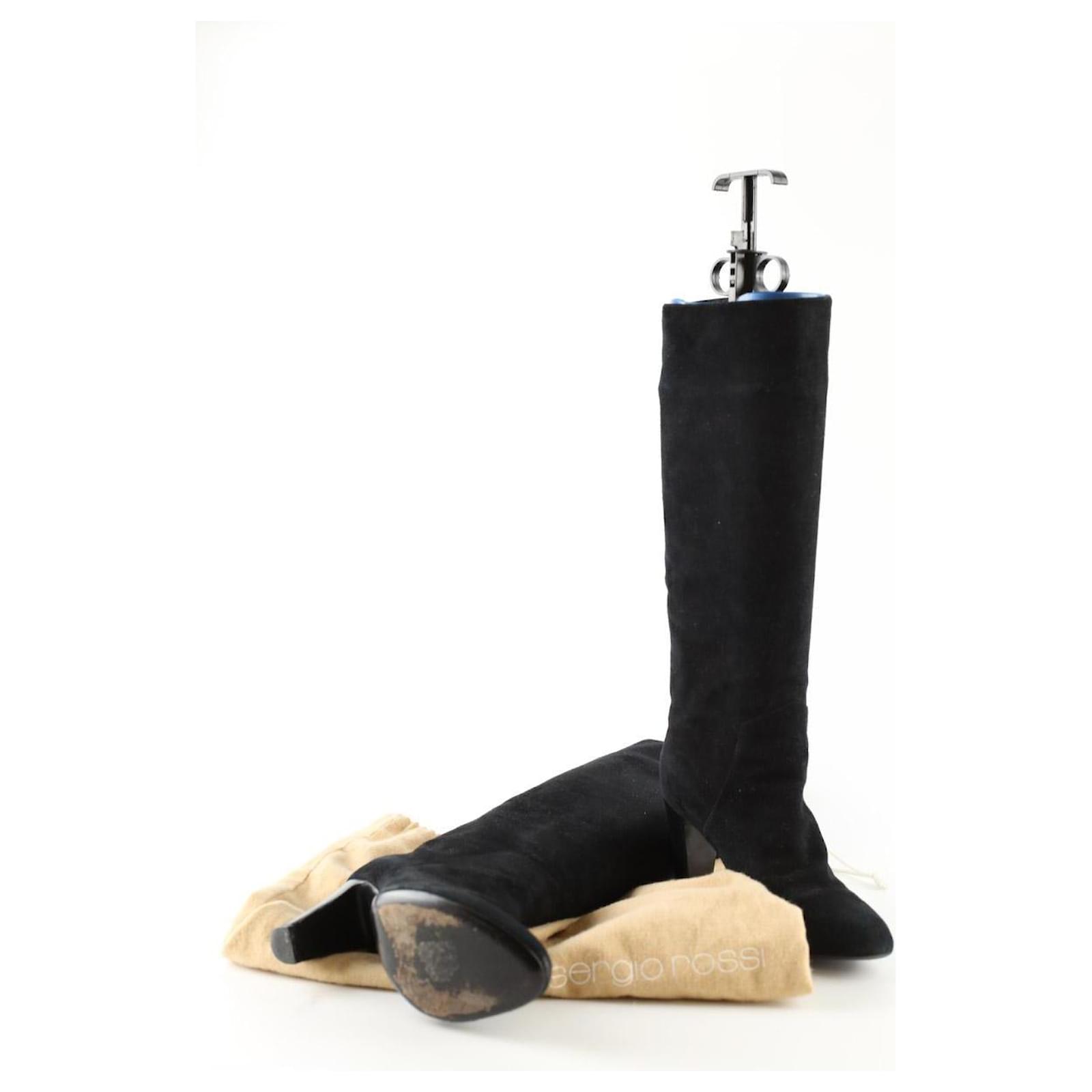 Second-hand Sergio Rossi black boots. Main material suede. Size 35.5. Heel height: 8cm. Shaft: 42cm. With dust bag. Women’s collection. Very good condition. Reference: 036830008.