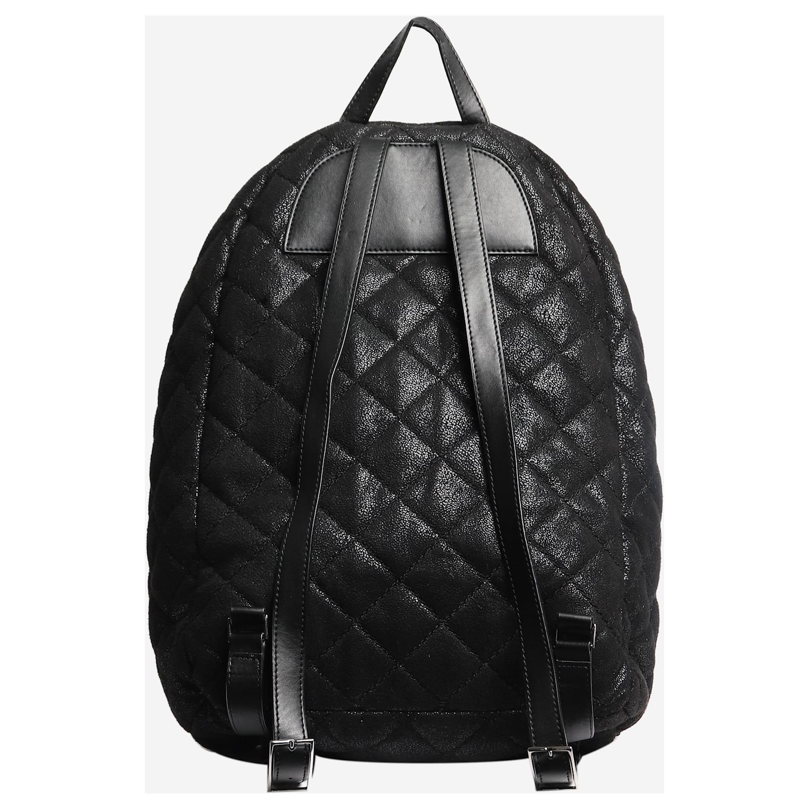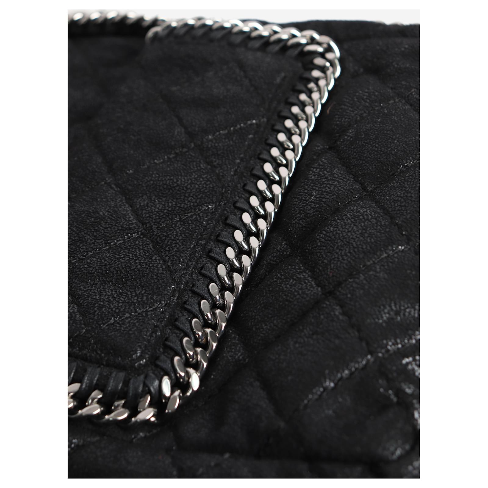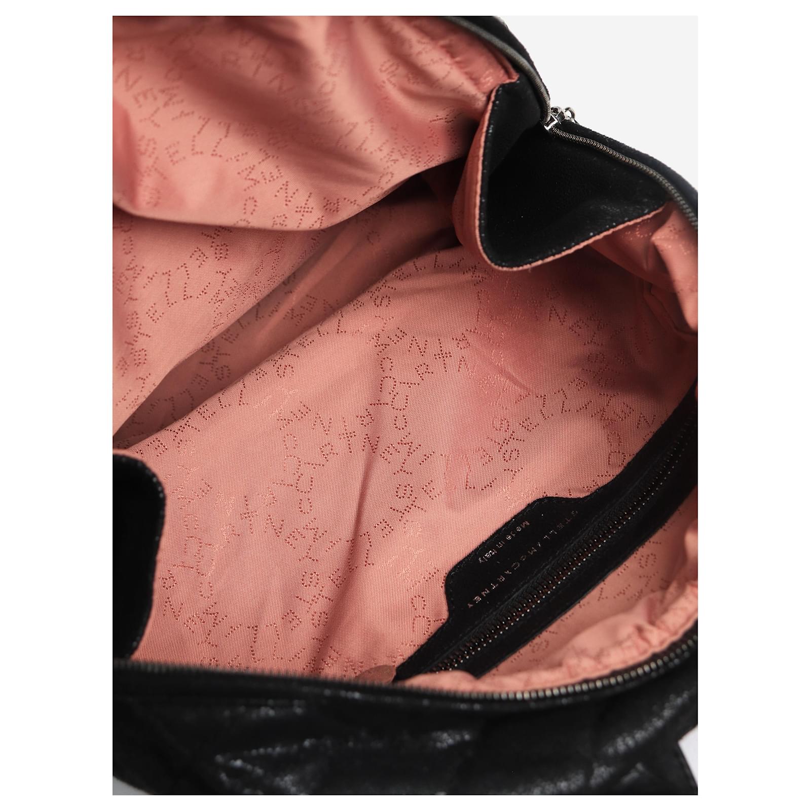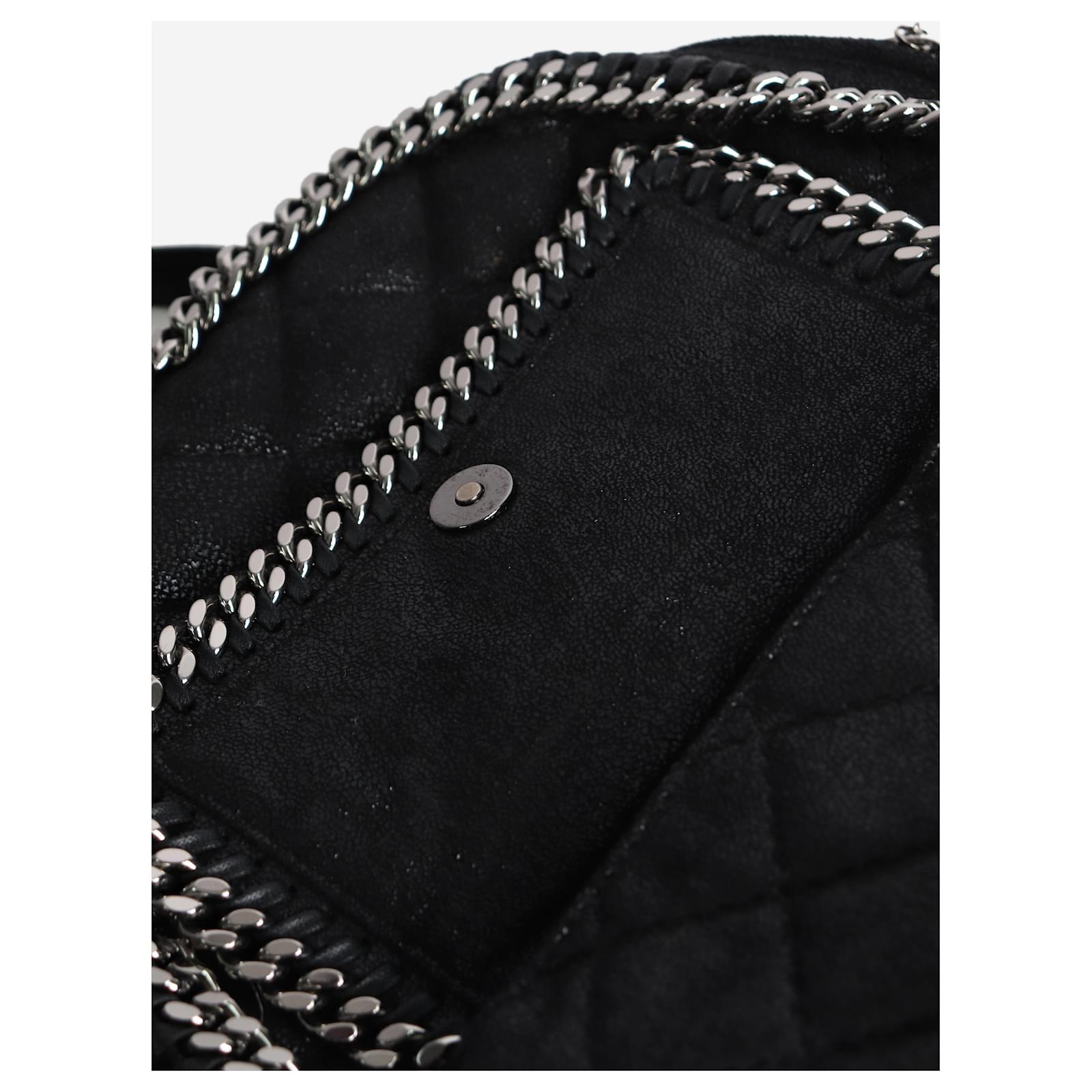 Stella McCartney black Falabella backpack with silver hardware and signature chain-strap trim. The bag has a main compartment with an interior zipped pocket. Outer flap pocket at the front. Adjustable straps and a top handle.\nCondition: This item is in very good pre-owned condition, showing no significant signs of wear.\nMeasurements: W 27 x D 11 x H 38 cm\nMaterial: Faux leather\n