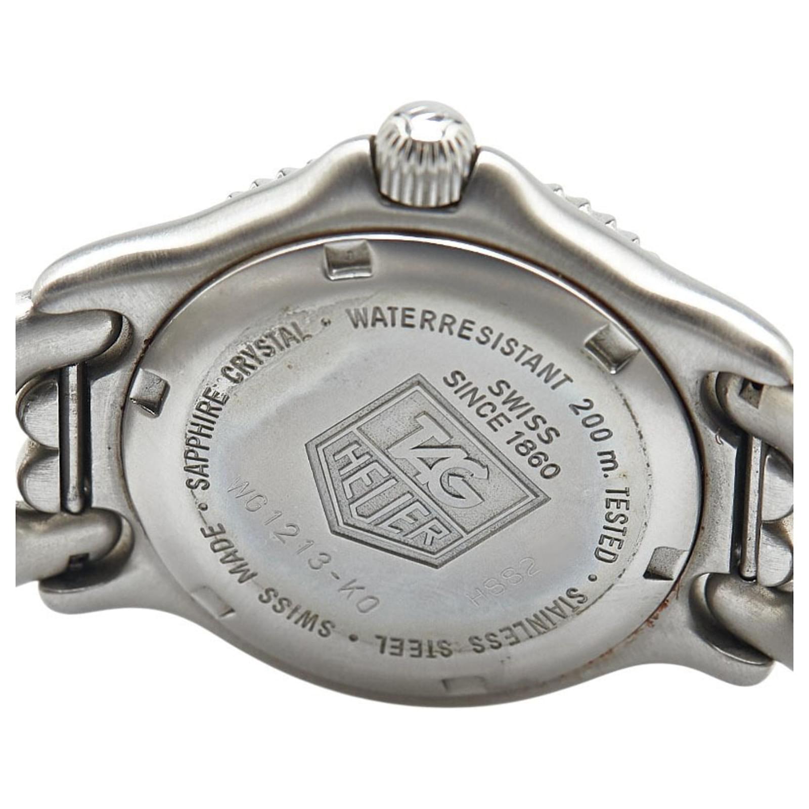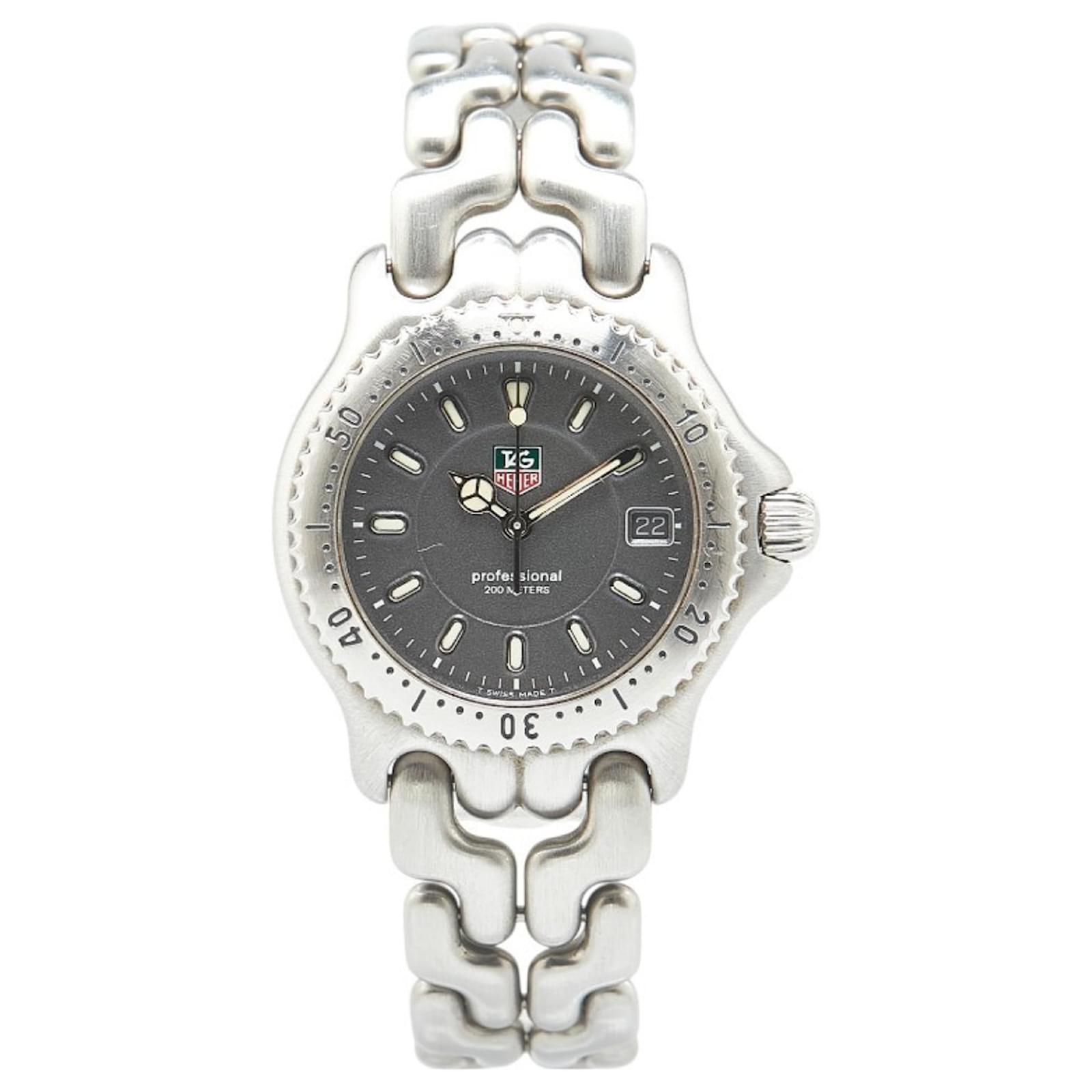 The TAG Heuer Cell Watch WG1213-K0 is a men’s wristwatch featuring a gray dial and a durable stainless steel case and band. It operates on a reliable quartz movement and is designed for water resistance up to 200 meters. This used watch is in good condition, with slight scratches on the bezel, case, and bracelet, and insignificant scratches on the glass and crown. The wrist size accommodates 17cm (6.69 inches). Please refer to the images for a detailed view of the watch’s condition and included accessories.