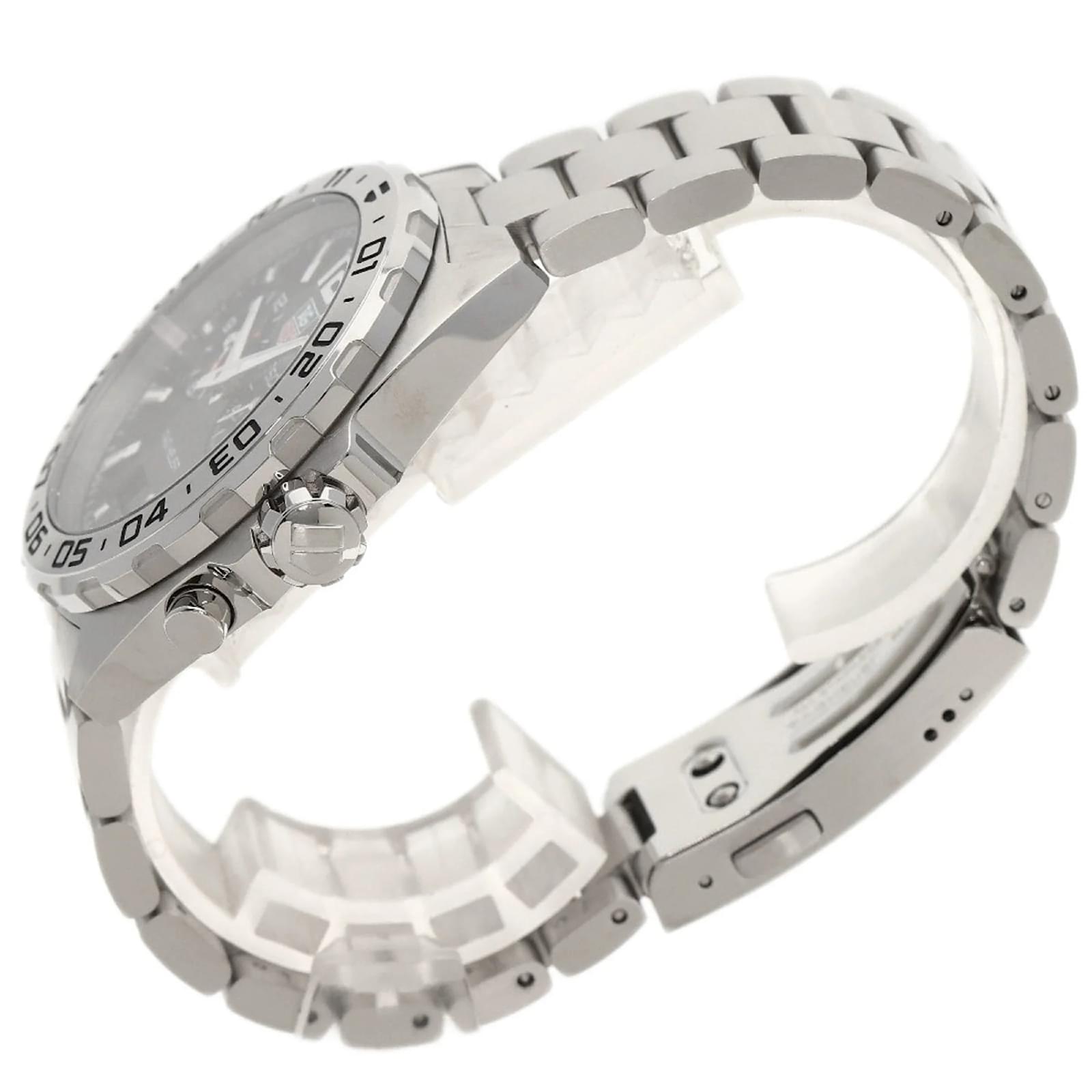 The TAG Heuer WAZ111A Formula 1 Alarm Watch is a stylish wristwatch designed for men, featuring a black dial and a durable stainless steel case and band. This timepiece is powered by a reliable quartz movement and has a case diameter of 41mm, suitable for a wrist size of 18.5cm (7.28 inches). \n\nThis watch is in very good used condition, with slight scratches on the bezel, case, and buckle, while the dial and glass remain free of scratches. It comes with a certificate and both inner and outer boxes. Potential buyers are encouraged to review the images for a detailed view of the watch’s condition and included accessories.