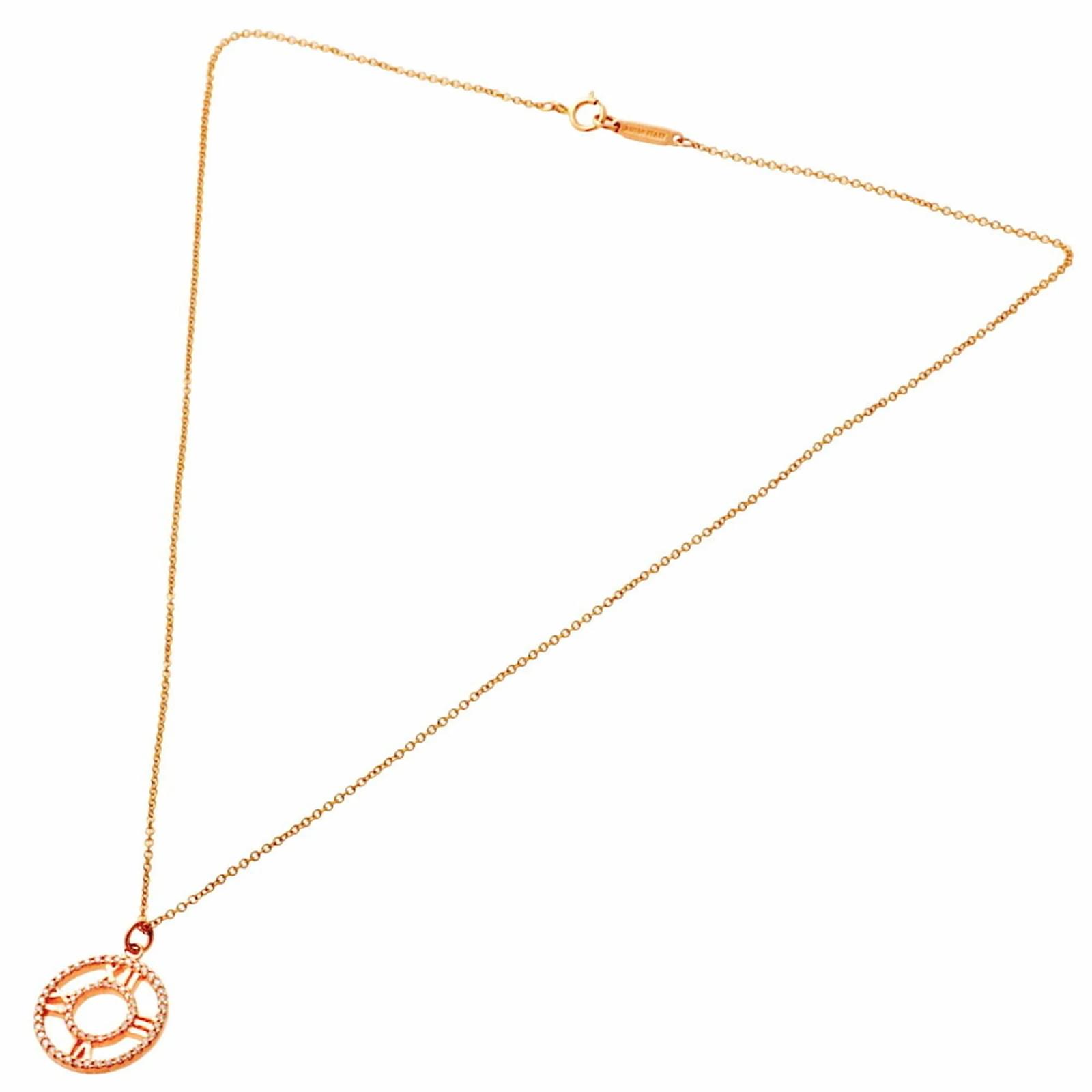 This Tiffany & Co. Atlas Circle Necklace is crafted from 18K pink gold, featuring a pendant that measures 15mm x 15mm. The necklace has a neck circumference of 41 cm. Originating from Italy, this piece weighs 3.4 grams and showcases a rose medallion design. \n\nThe necklace is in used condition, rated as \”like new\” with insignificant traces of use, scratches, and dirt. It has been polished for maintenance. Please refer to the images for a detailed view of the item’s condition and any included accessories, though none are provided with this piece.